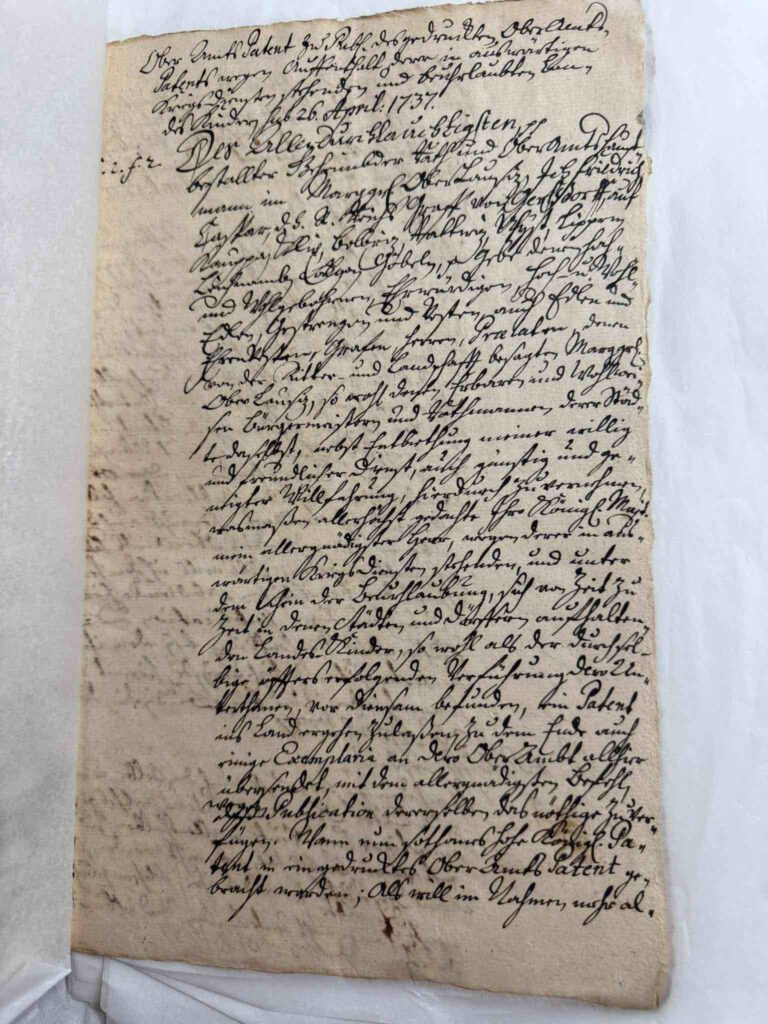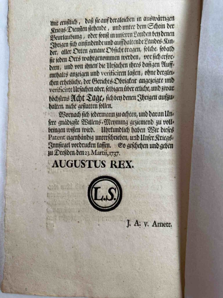 Jest to oryginalny dokument spisany na wysokiej jakości papierze czerpanym – patent królewski z 1737 roku, wydany w imieniu Augusta III, króla Polski i elektora Saksonii. Dokument reguluje kwestie nielegalnego werbunku ludności do obcych armii, który w pierwszej połowie XVIII wieku stanowił istotny problem społeczny, wojskowy i administracyjny.