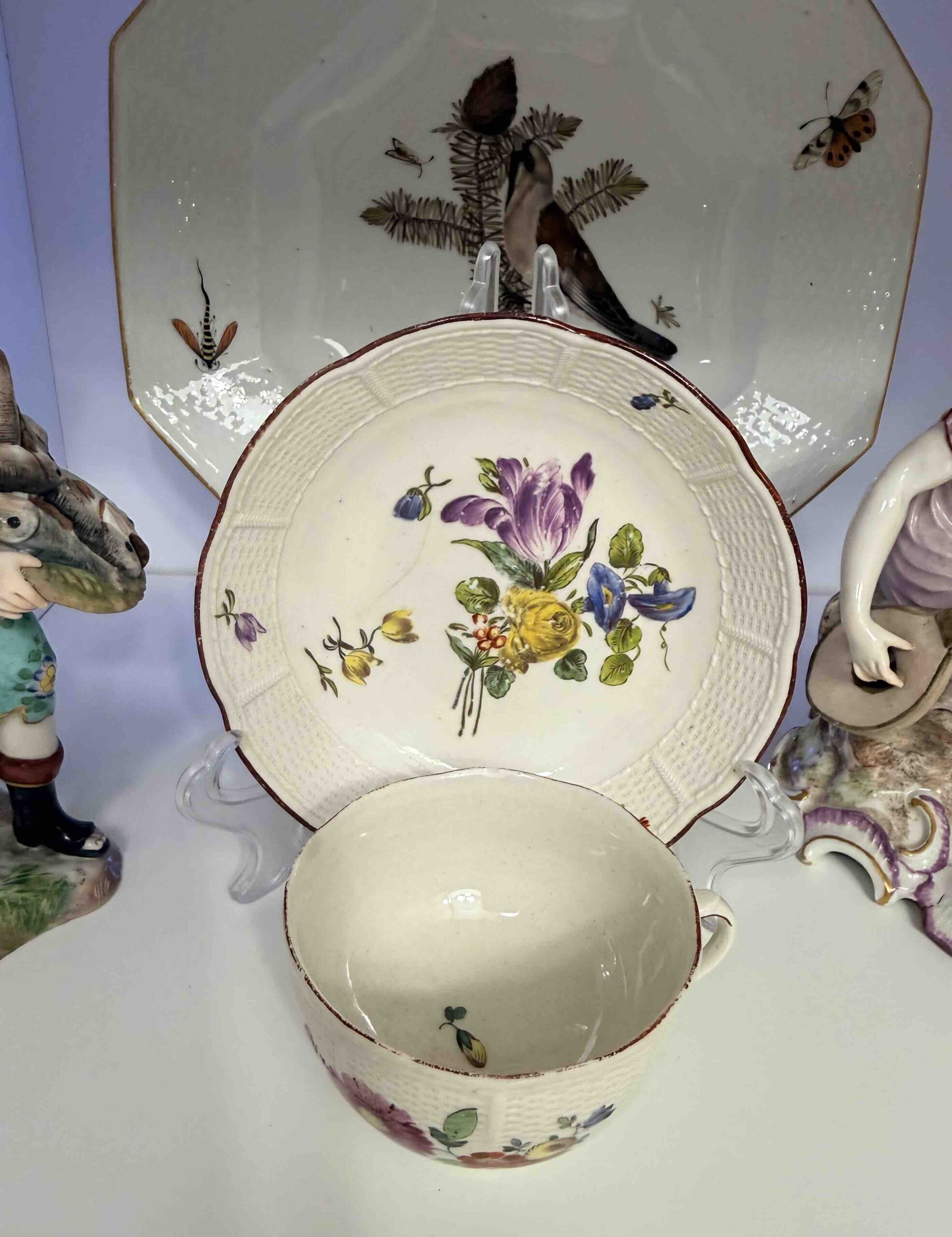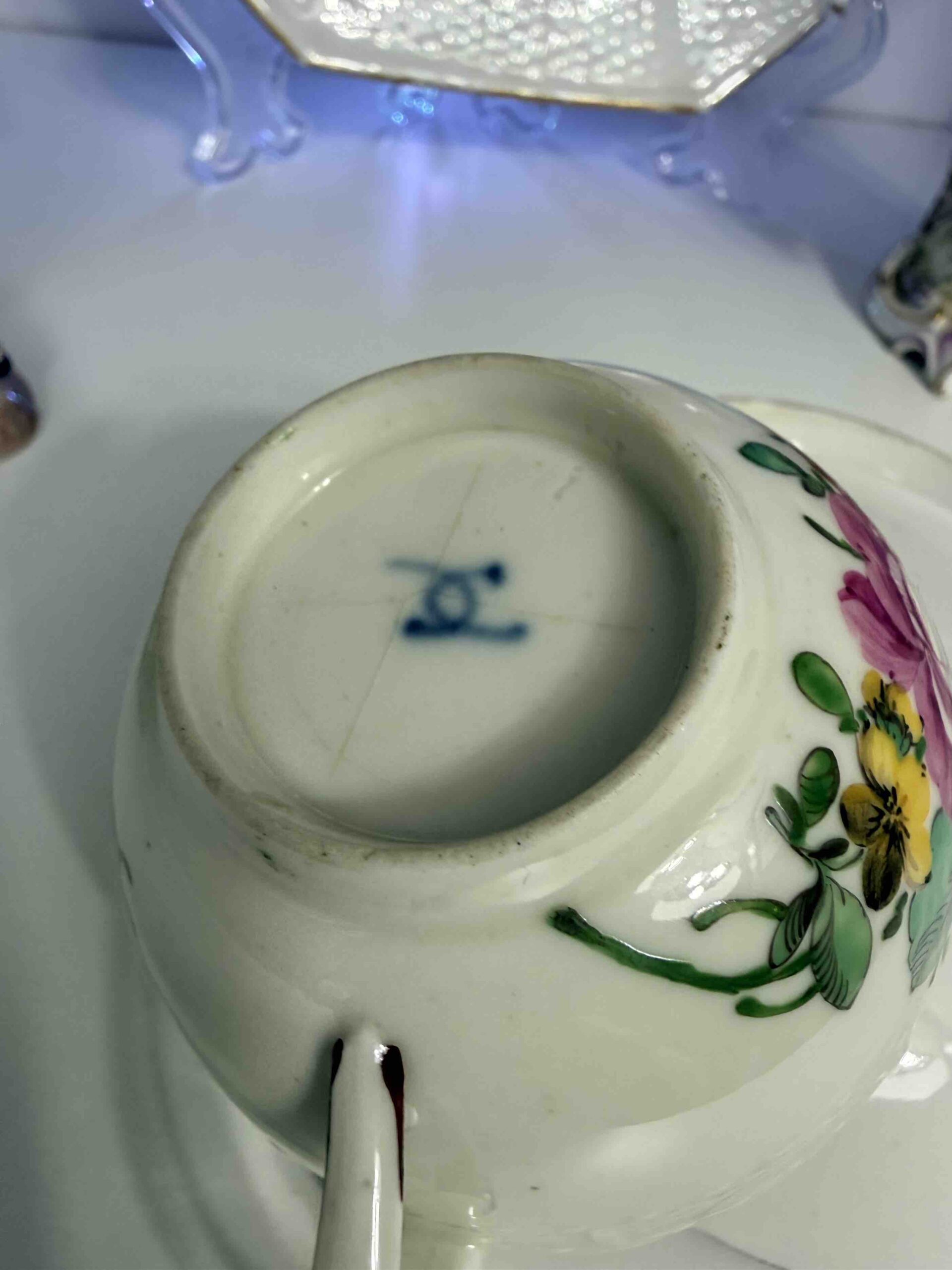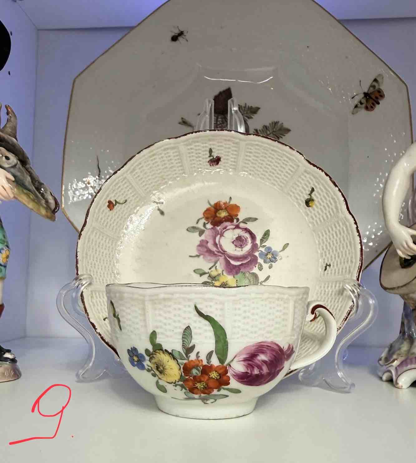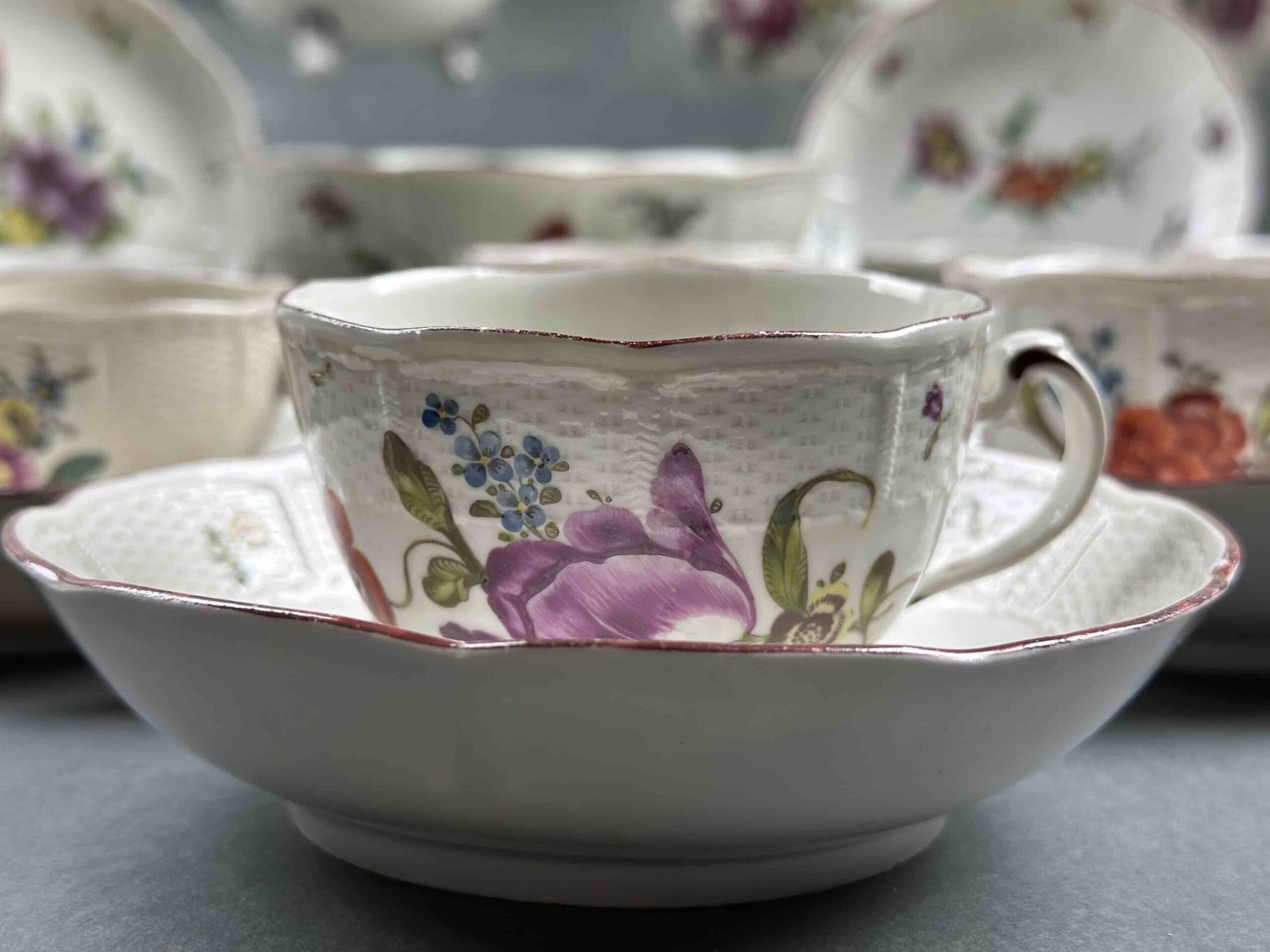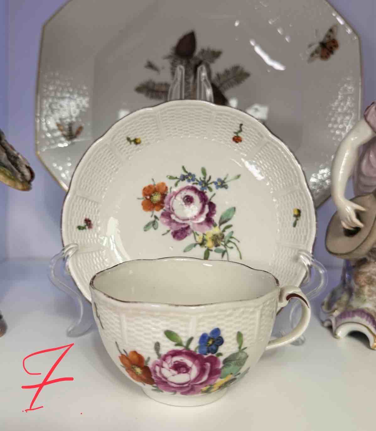 Spodeczki i filiżanki czasem gubią symetrię formy, posiadają drobne skazy i szary odcień porcelany. Szarawa masa porcelanowa z drobnymi skazami szkliwa, zgaszona tonacja barw, brak symetrii charakterystyczne są dla wyrobów Ludwigsburg z XVIII w. choć nie są regułą. Na uwagę zasługuje prezentowany przykład kompletu filiżanki i spodka wykonanych w podobnym przedziale czasowym, na którym wyraźnie dostrzec można różnicę odcieniu porcelany.