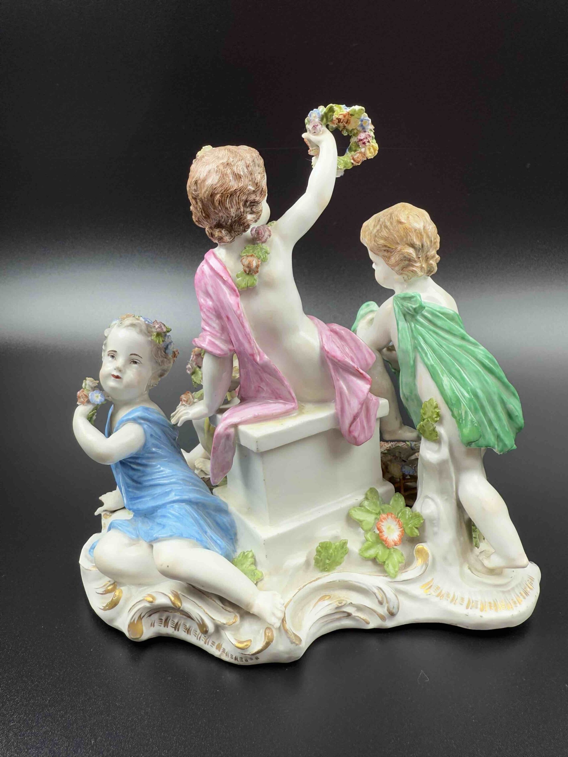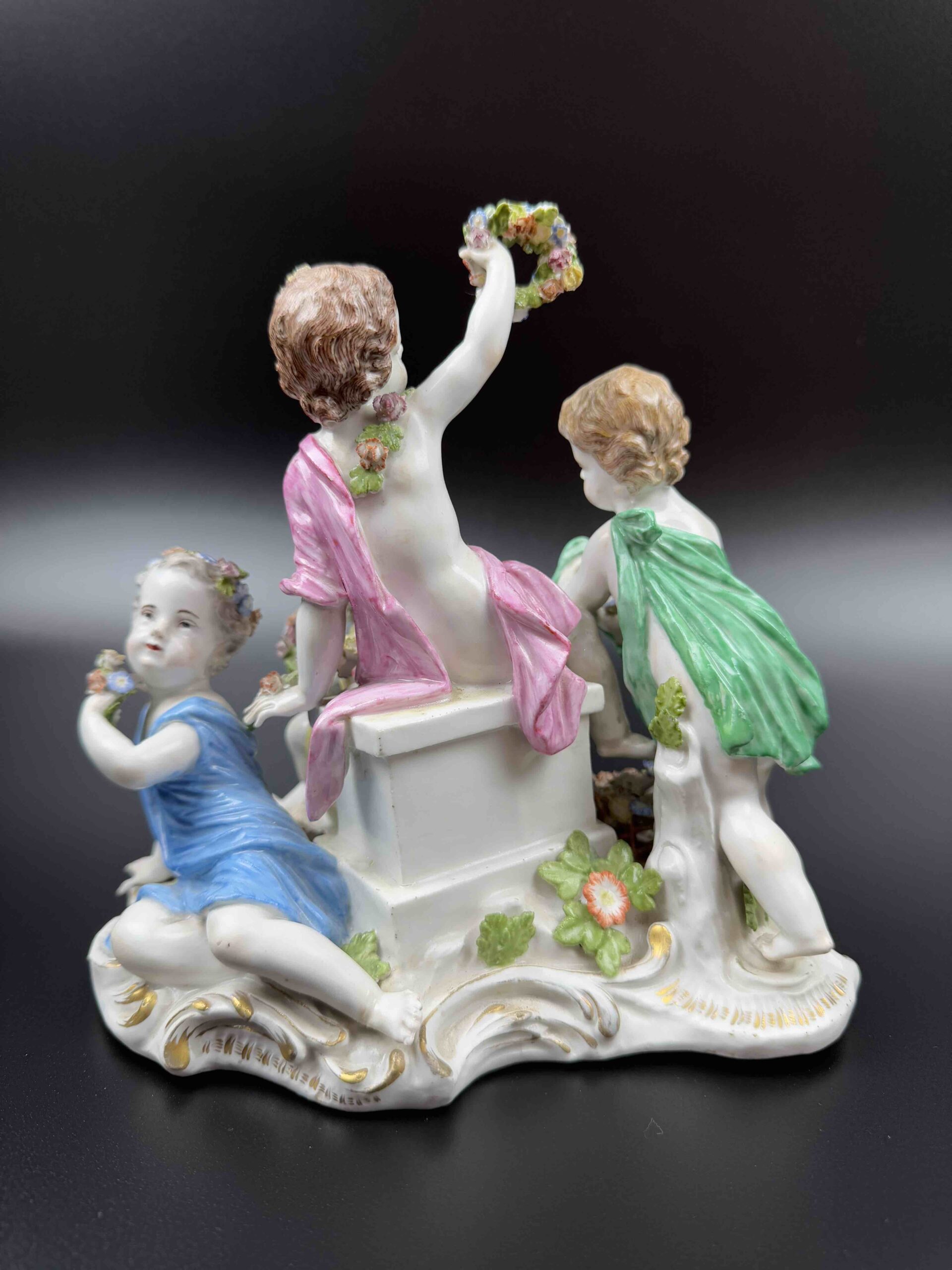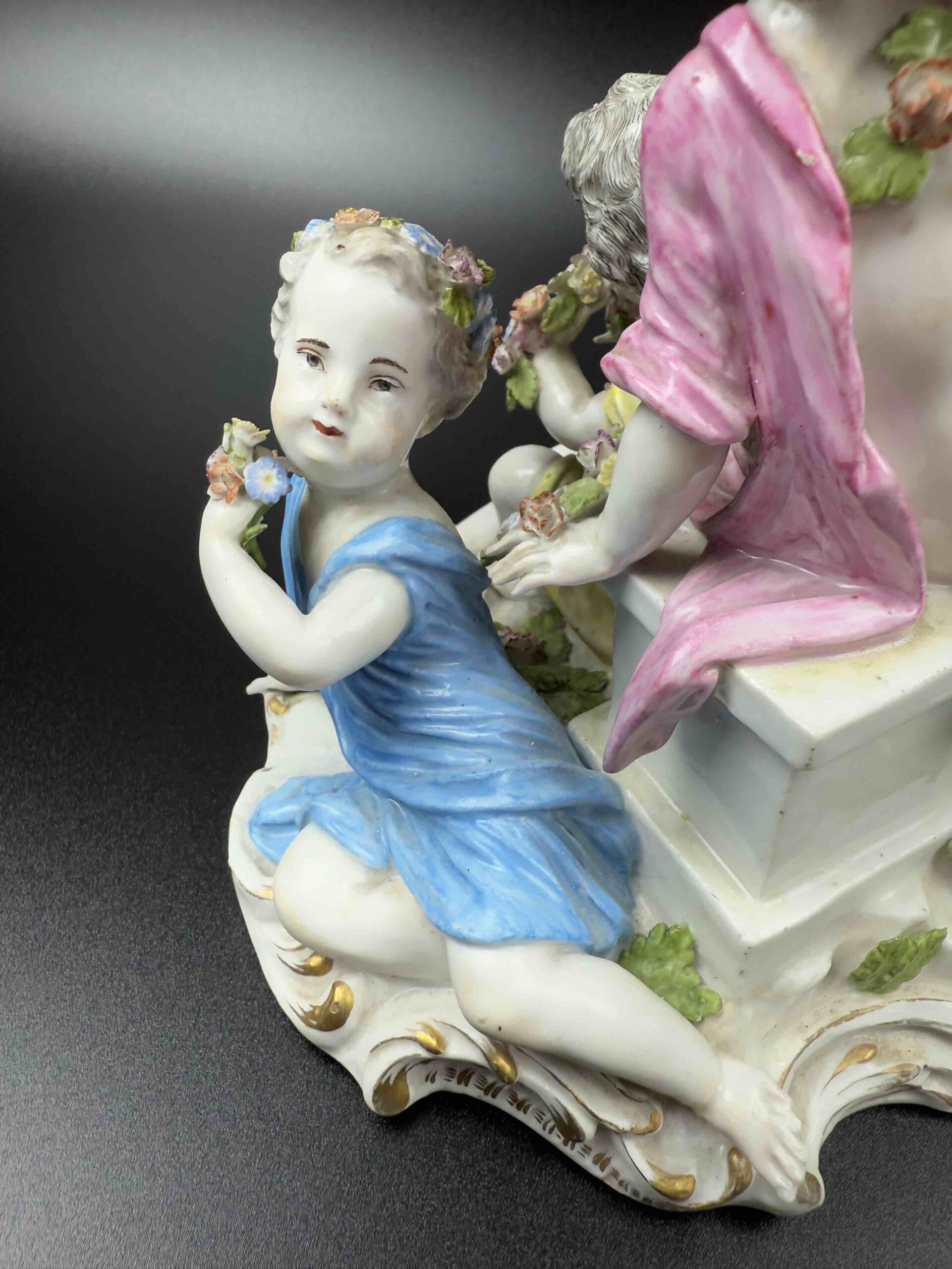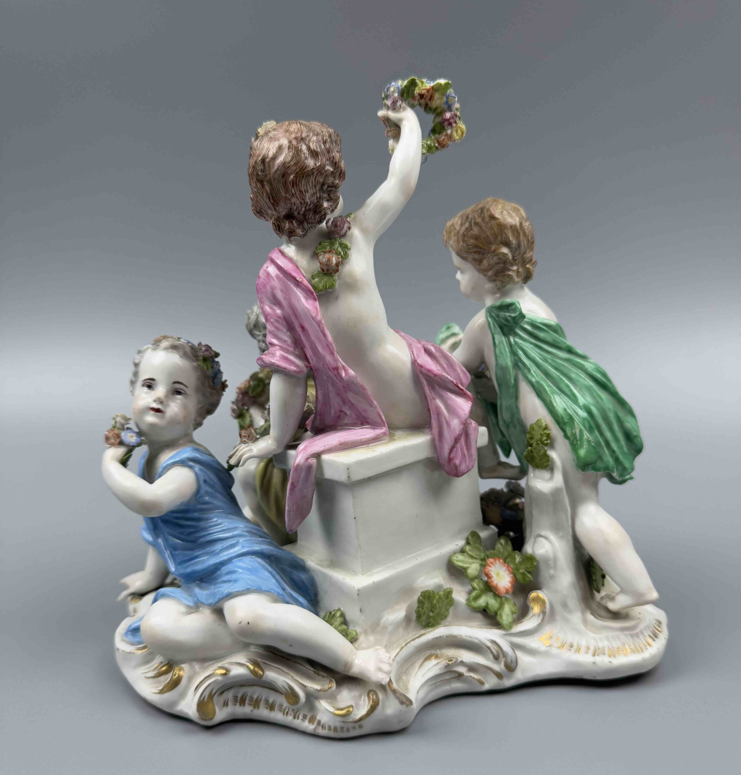 model 2502 z serii „Cztery pory roku”. Na cokole w centralnej części znajduje się putto trzymający kwiaty w uniesionej prawej ręce. Po bokach trzy kolejne putta z kwiatami i koszem kwiatów lub girlandą. Malatura polichromowana ze złotym szafarzem. Projekt Joachima Kaendlera 1757 r.