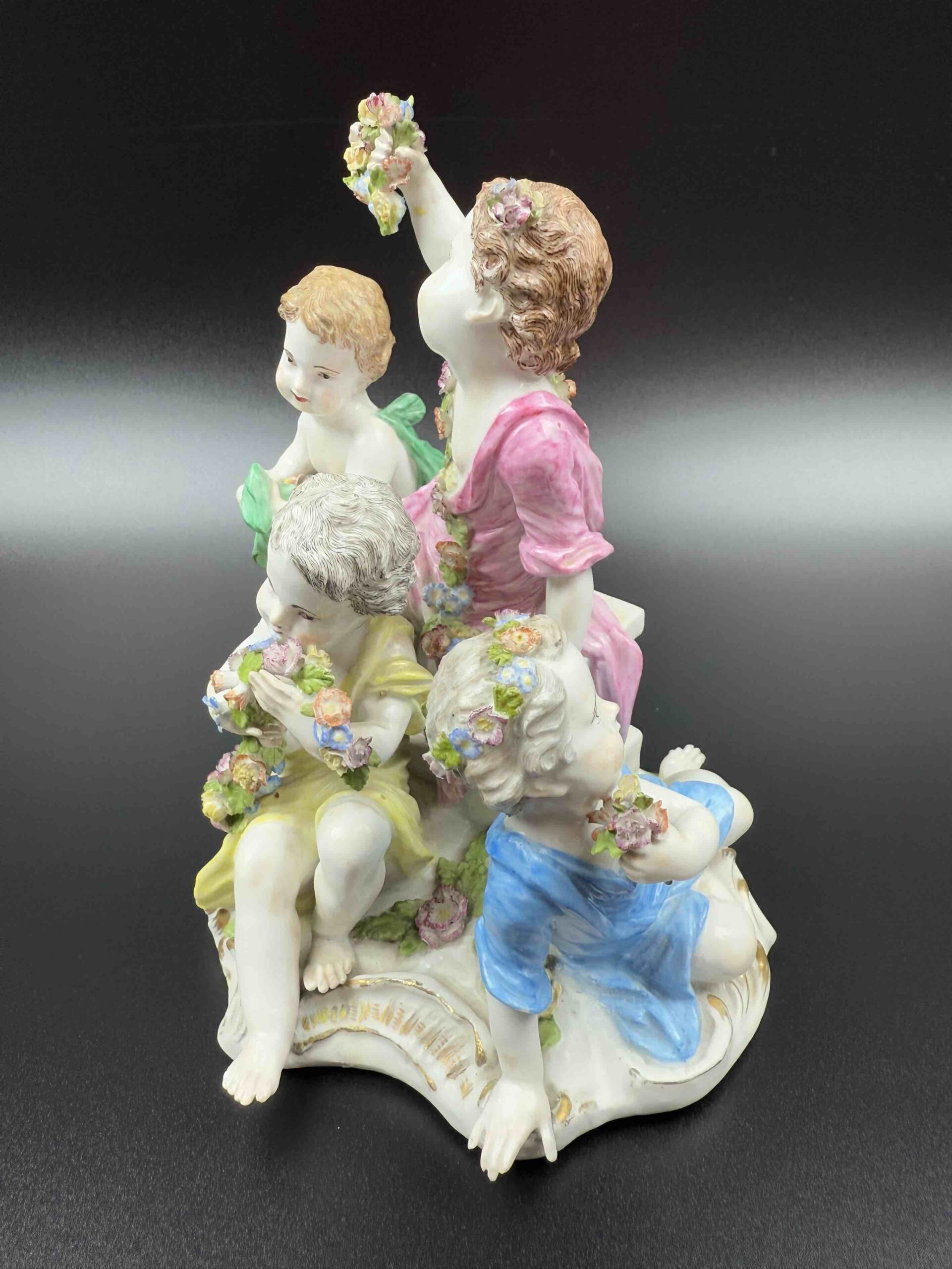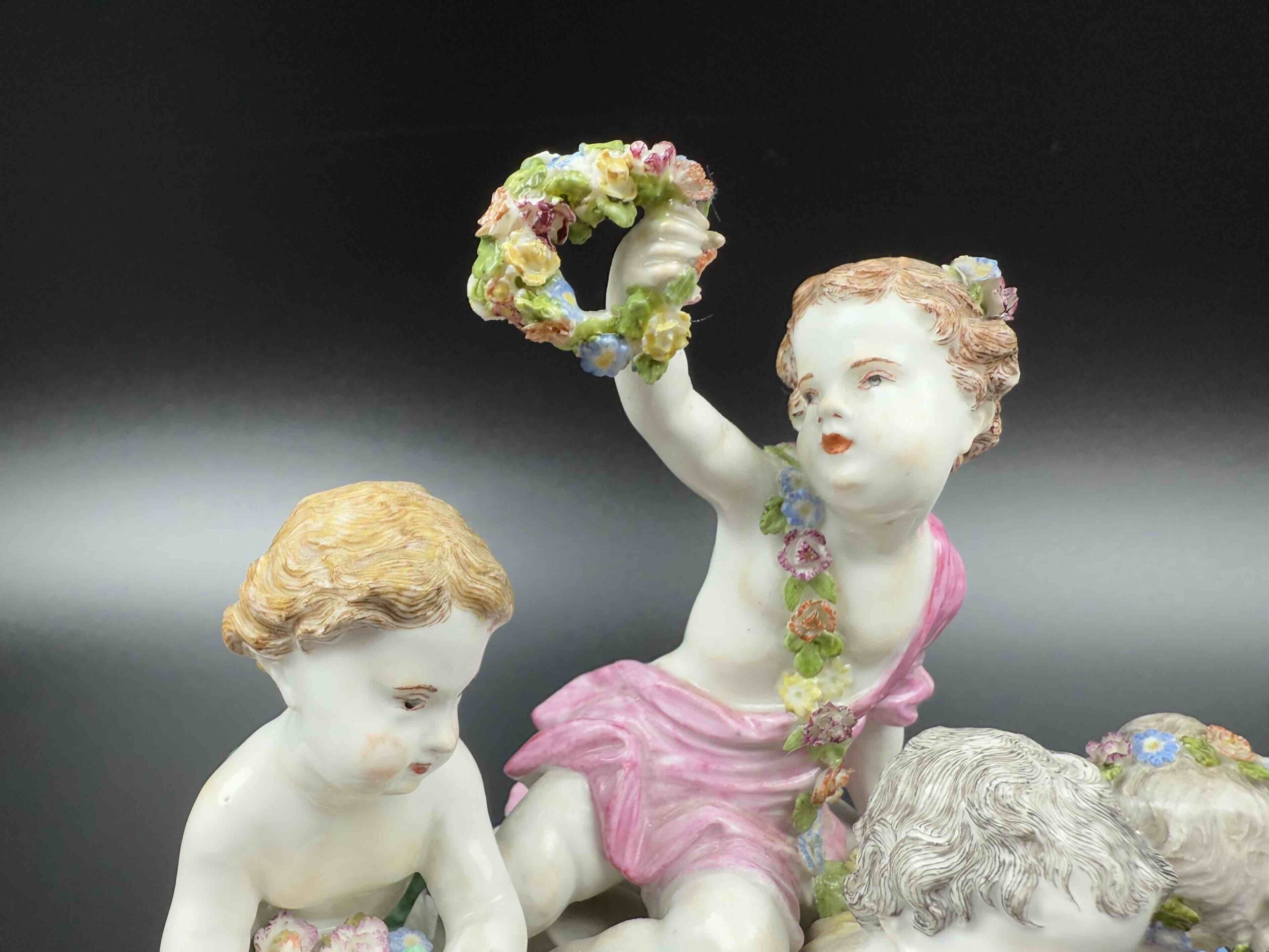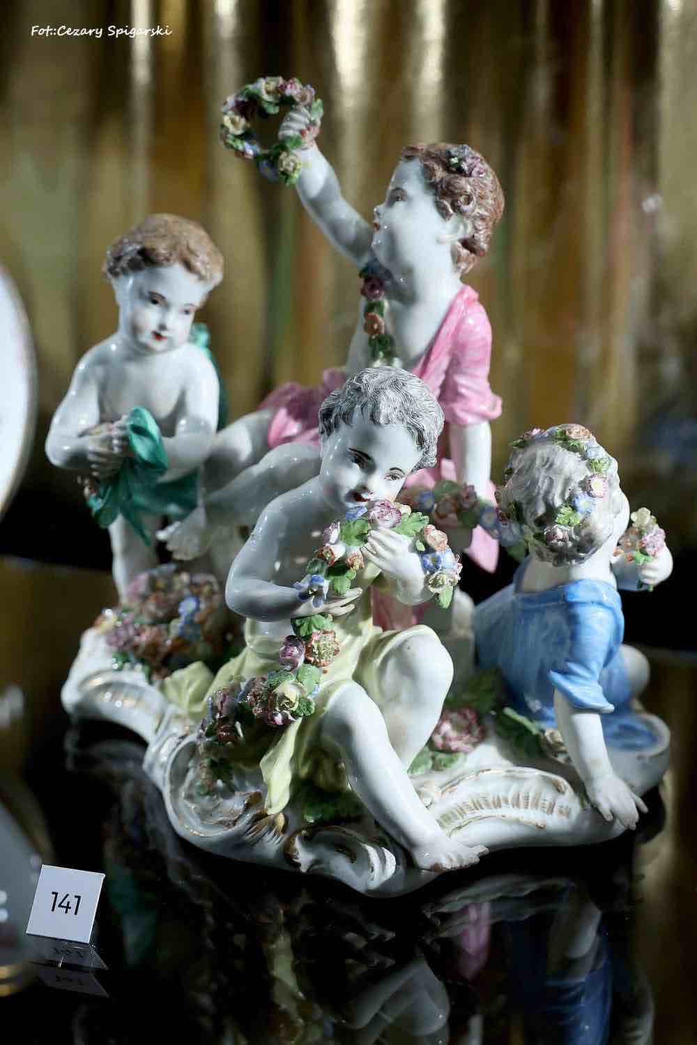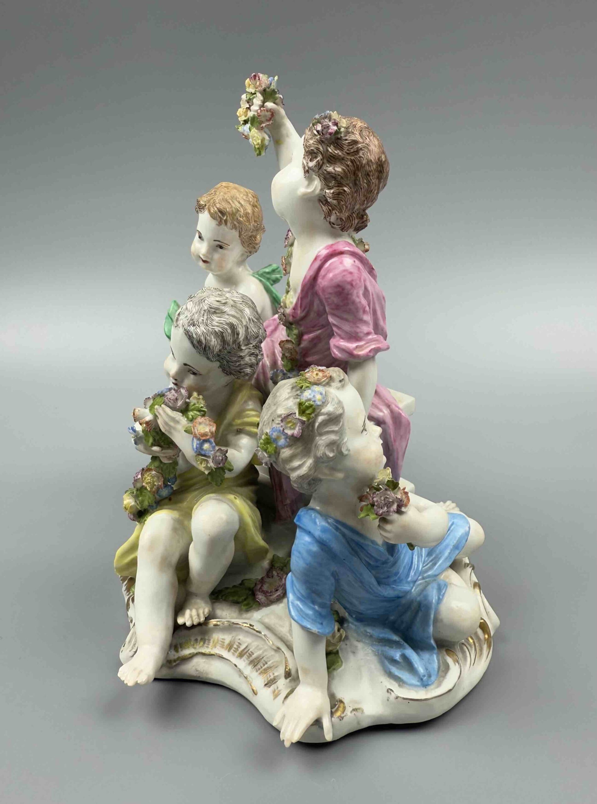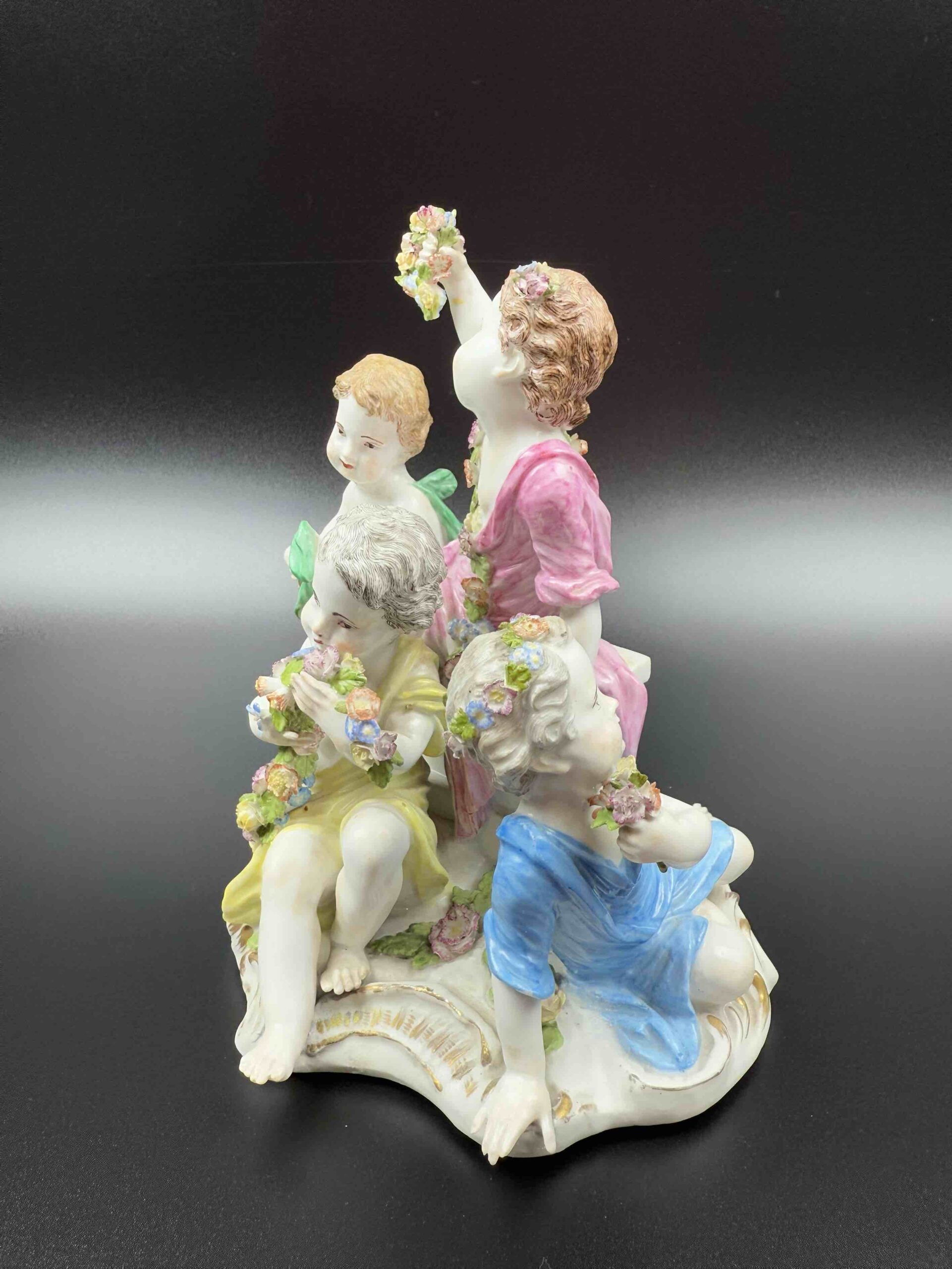 model 2502 z serii „Cztery pory roku”. Na cokole w centralnej części znajduje się putto trzymający kwiaty w uniesionej prawej ręce. Po bokach trzy kolejne putta z kwiatami i koszem kwiatów lub girlandą. Malatura polichromowana ze złotym szafarzem. Projekt Joachima Kaendlera 1757 r.