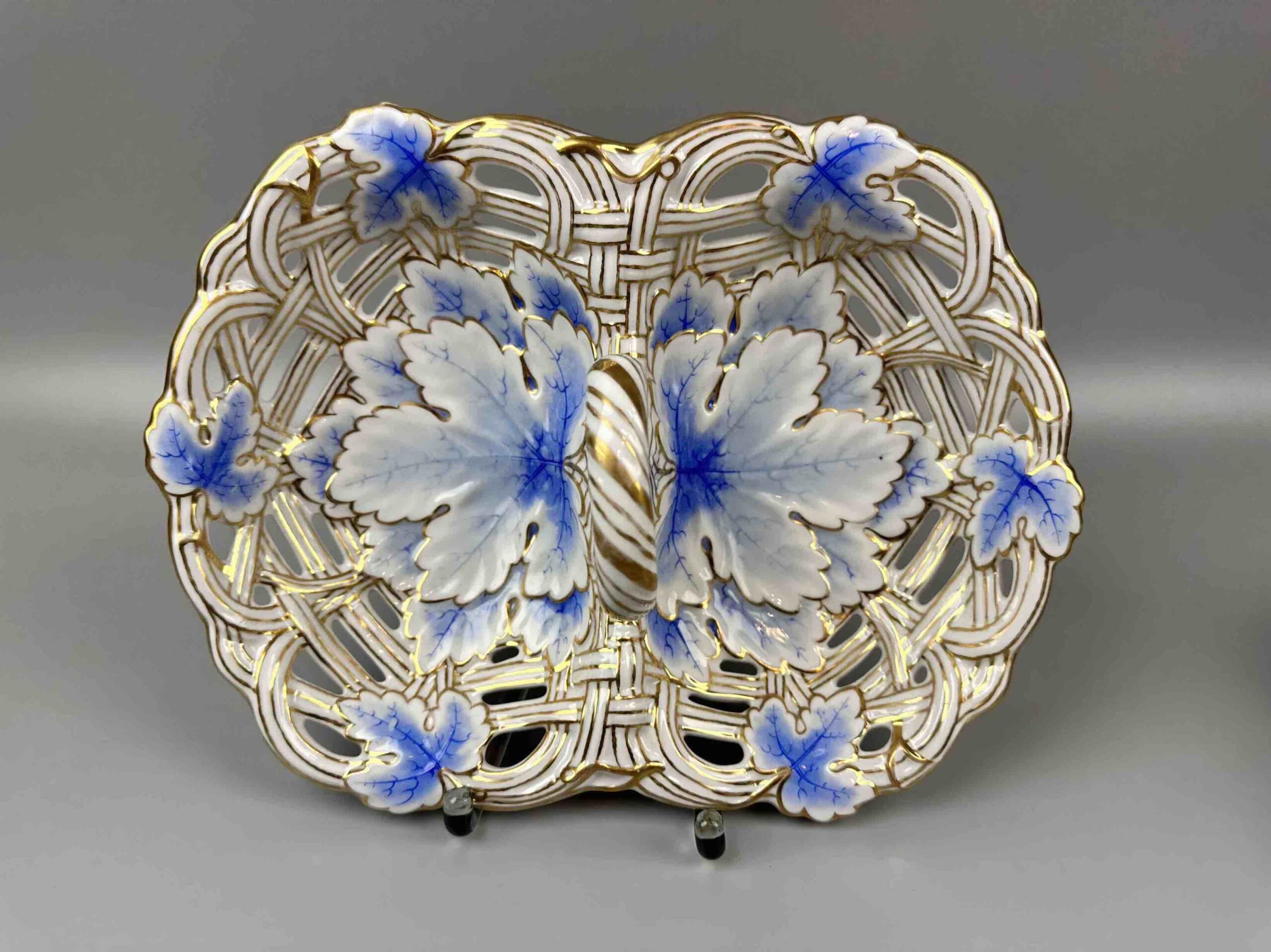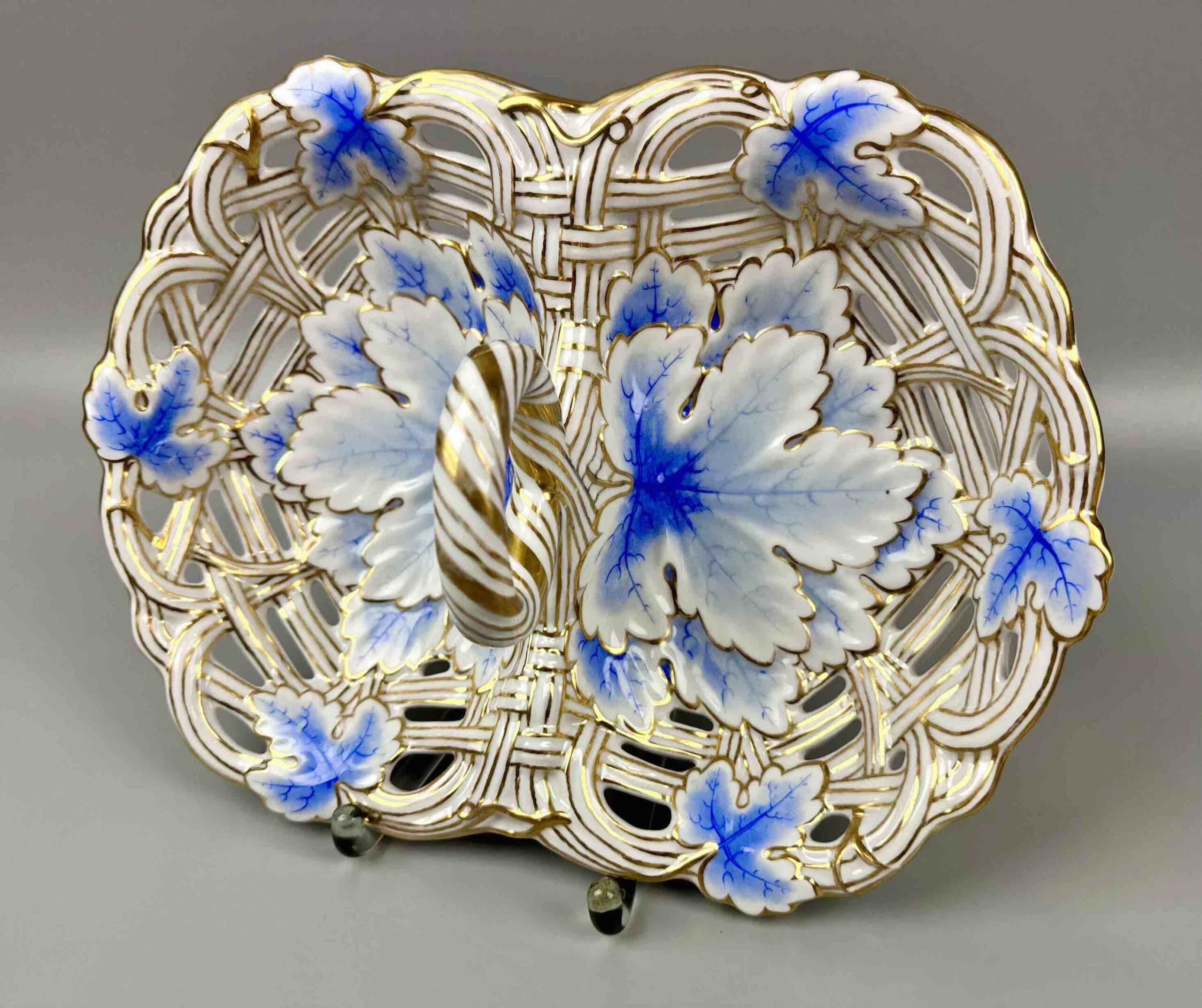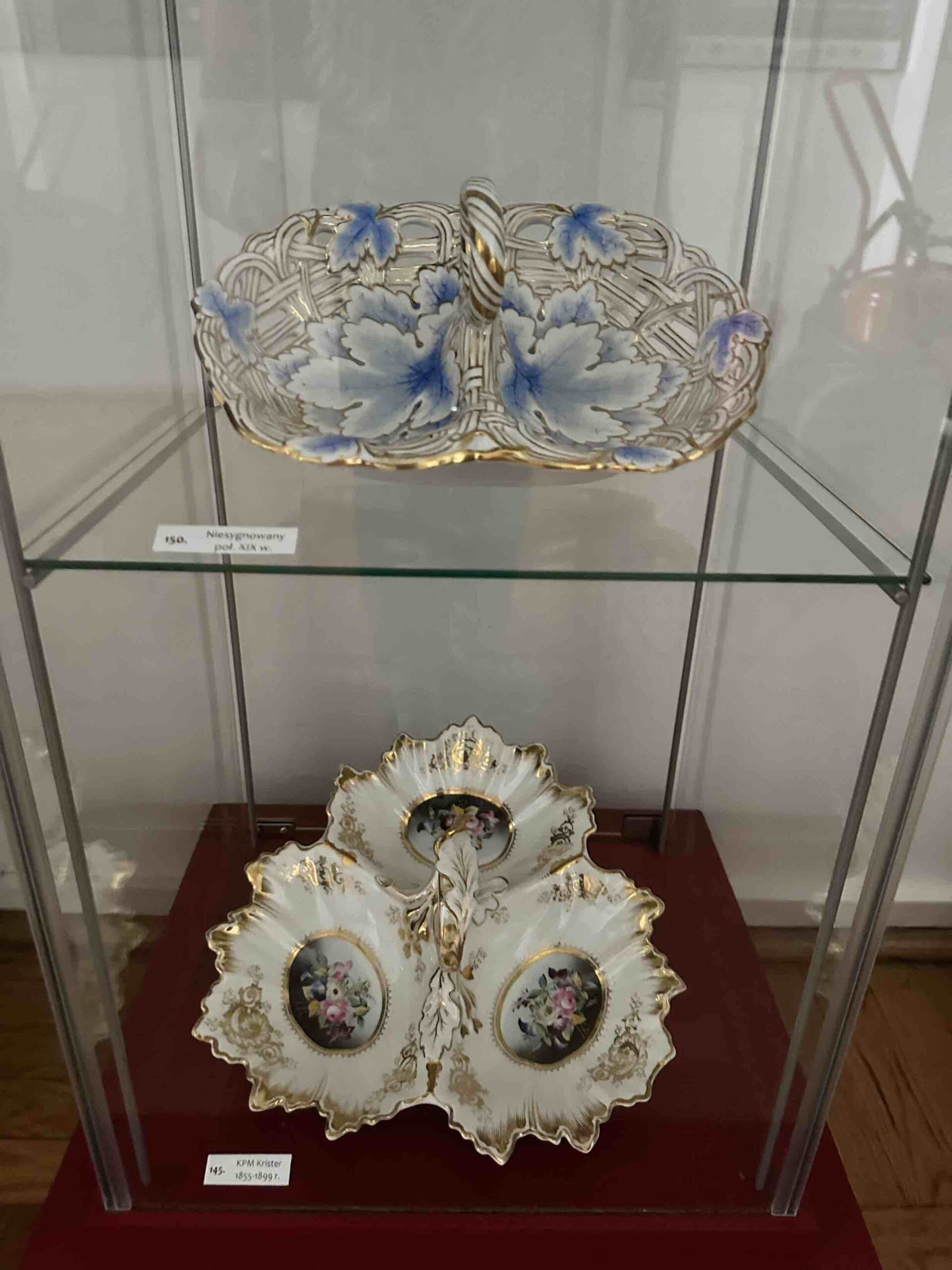 Tego typu wyroby były popularne jako elementy serwisów deserowych lub dekoracyjne patery na słodycze i owoce. Ażurowa konstrukcja i złocenia są charakterystyczne dla porcelany europejskiej z drugiej połowy XIX wieku .
