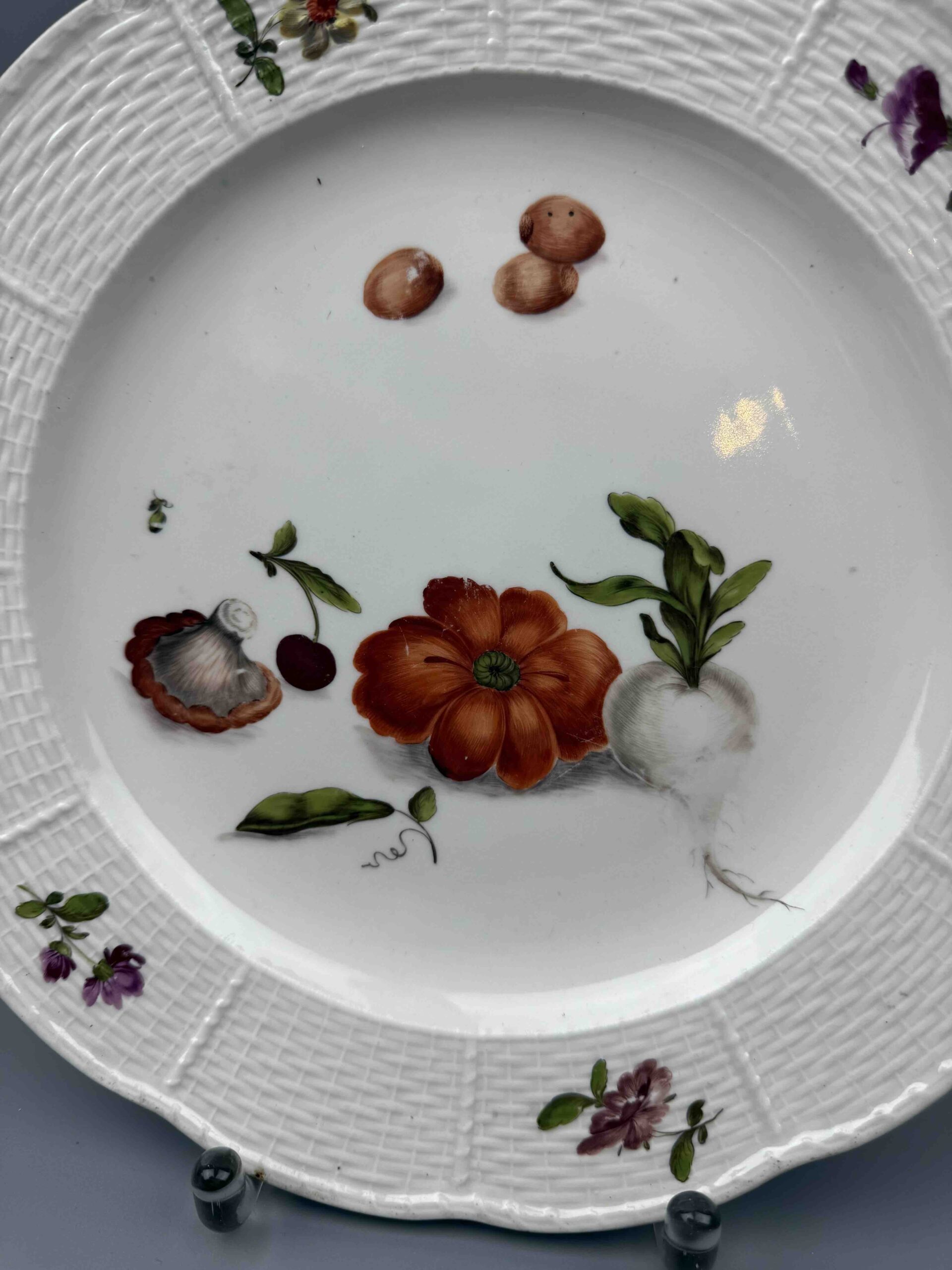 Talerz płytki okrągły o 12-łukowej krawędzi kołnierza dekorowanego plecionką reliefową Alt Ozier. Lustro talerza zdobione na całej powierzchni malowanymi wielobarwnie motywami warzyw (strączek groszku, rzepa), owocami (orzechy, owoc wiśni) oraz grzybkiem. Malarz kierował się podobnie, jak malarze miśnieńscy, próbą wydobycia z obrazu efektu trójwymiarowego poprzez cienie, jakie rzucają umieszczone w lustrze warzywa i kwiaty. W Miśni pierwszy raz kwiaty z rzuconym cieniem , który nadawał trójwymiarowości, pojawiły się na serwisie Klemensa Augusta, później pojawiły się w jednym z najpiękniejszych serwisów biskupa wrocławskiego Adama Stanisława Gotzendorfa-Grabowskiego.