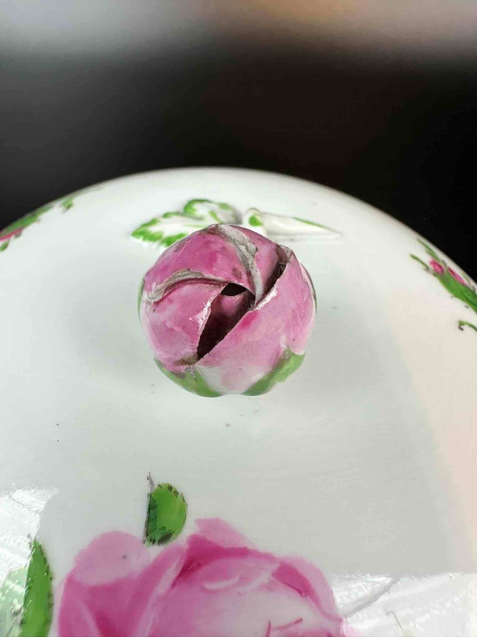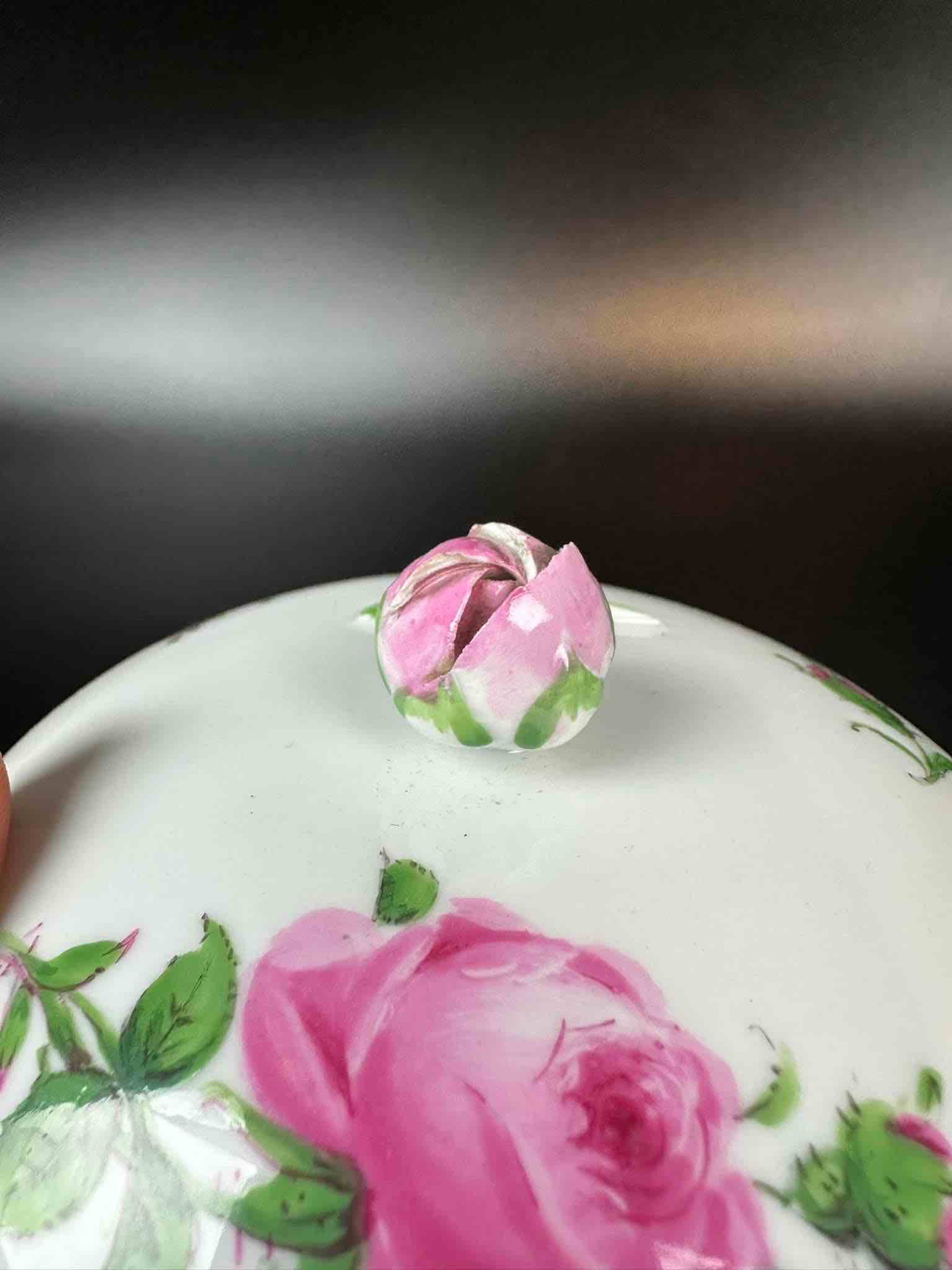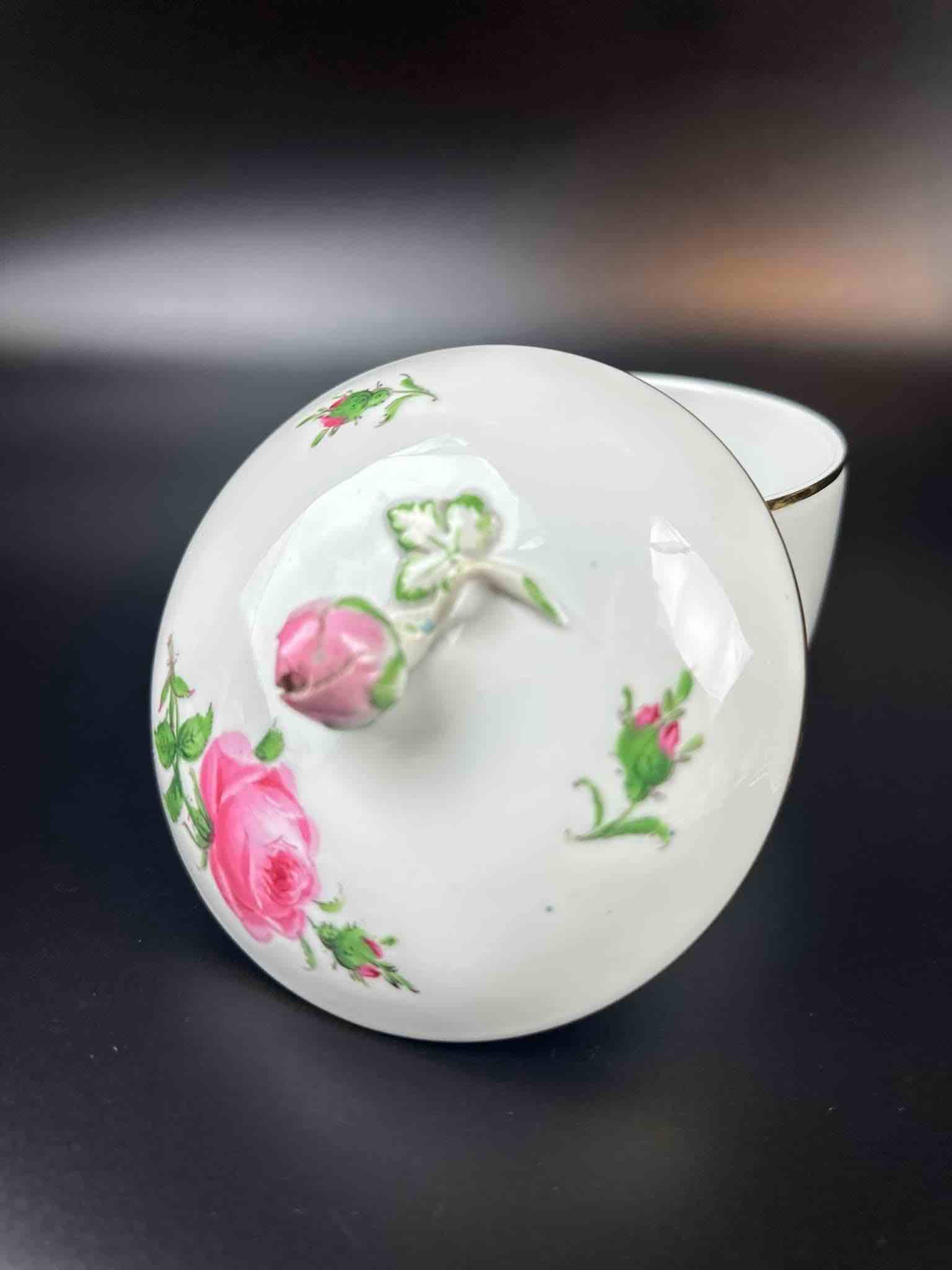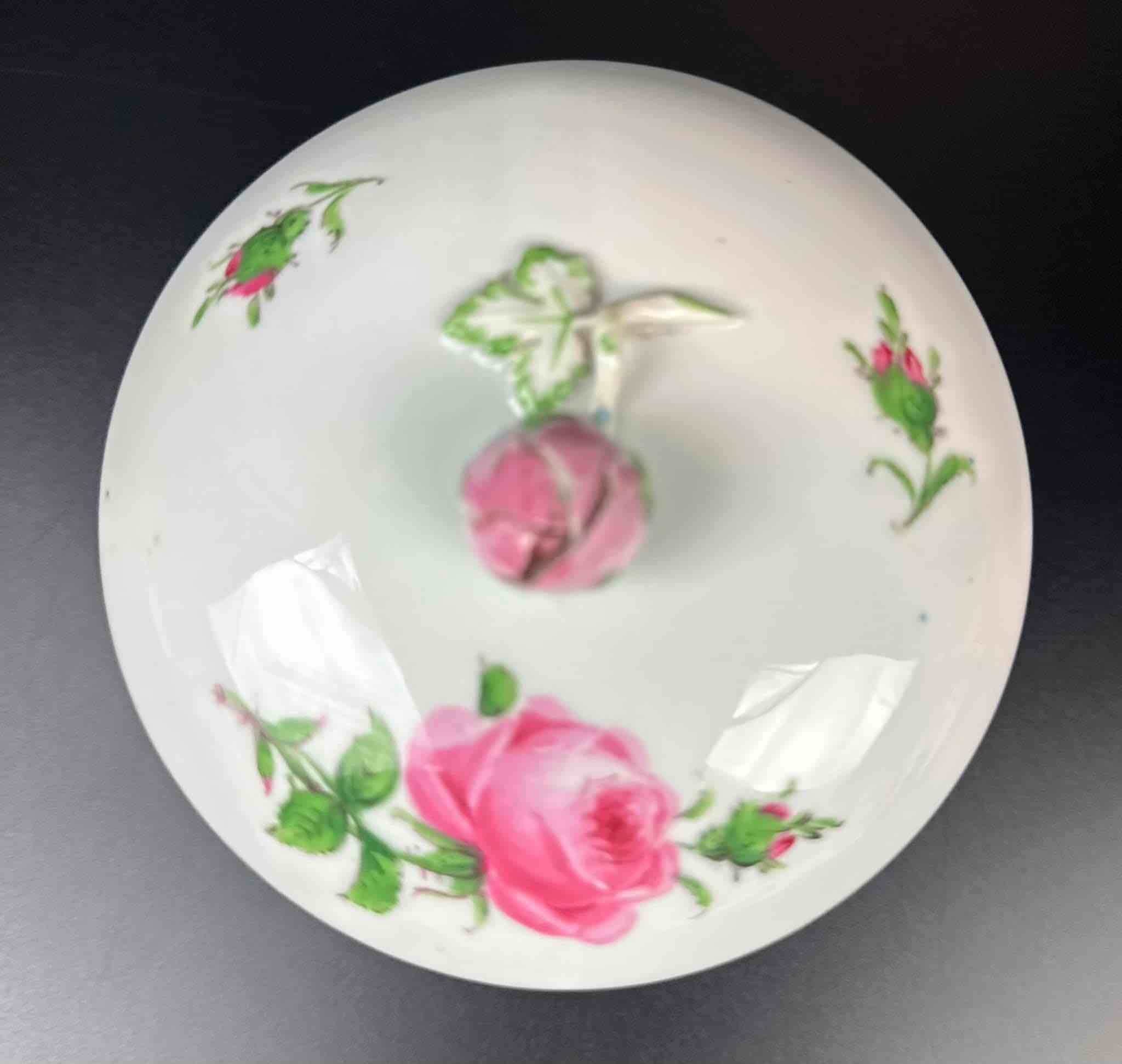 Motyw róży, charakterystyczny dla marki. Porcelana masywna, malatura zachowana bardzo dobrze. Dekielek zakończony pączkiem róży, maleńkie ubytki na końcówkach płatków pączka, drobiazg lecz wyczuwalny w dotyku.