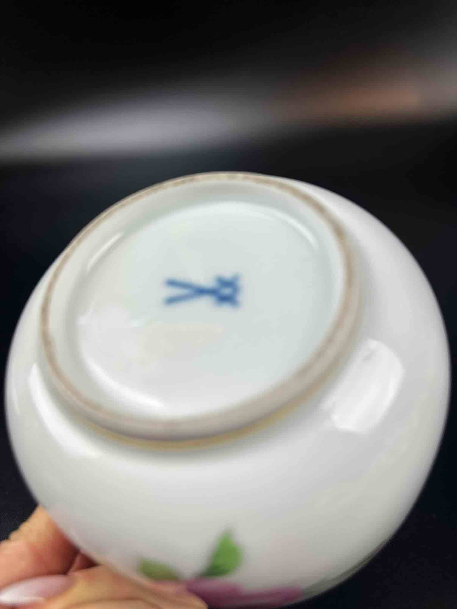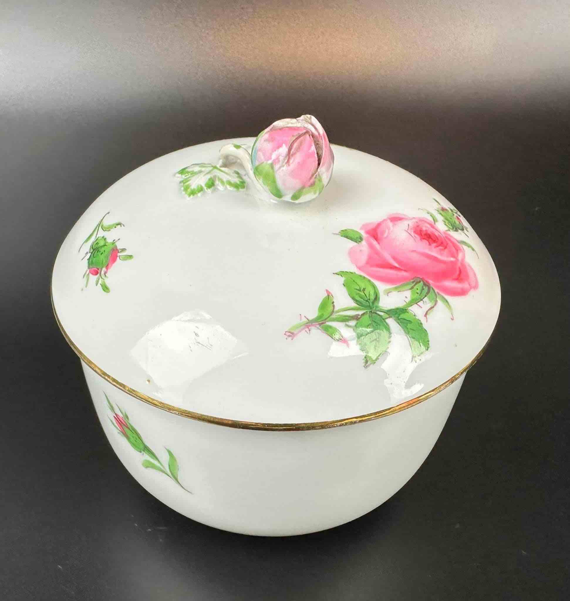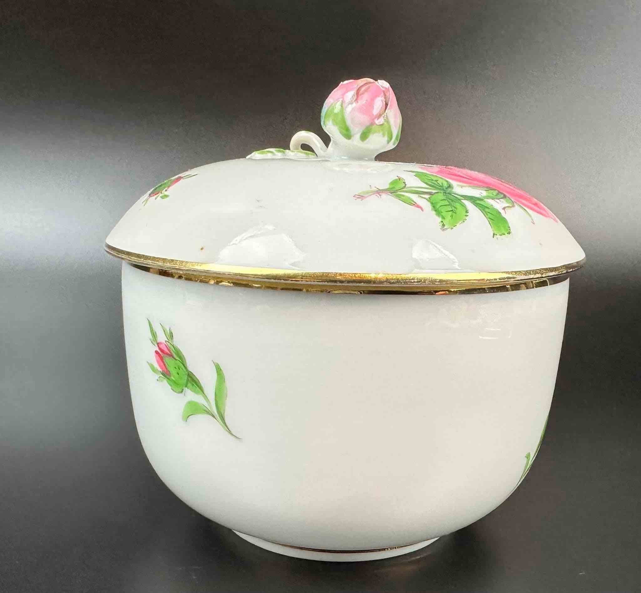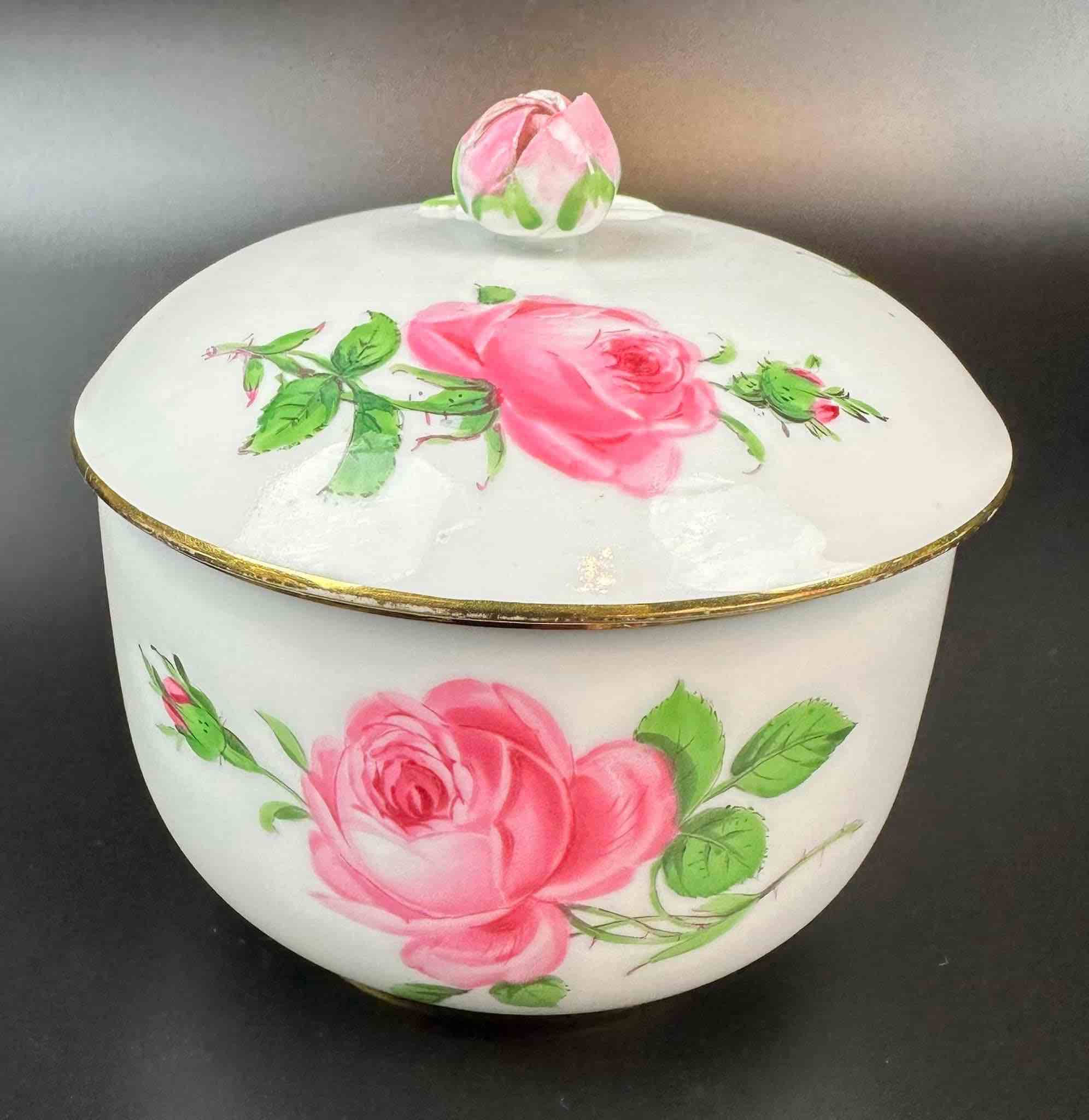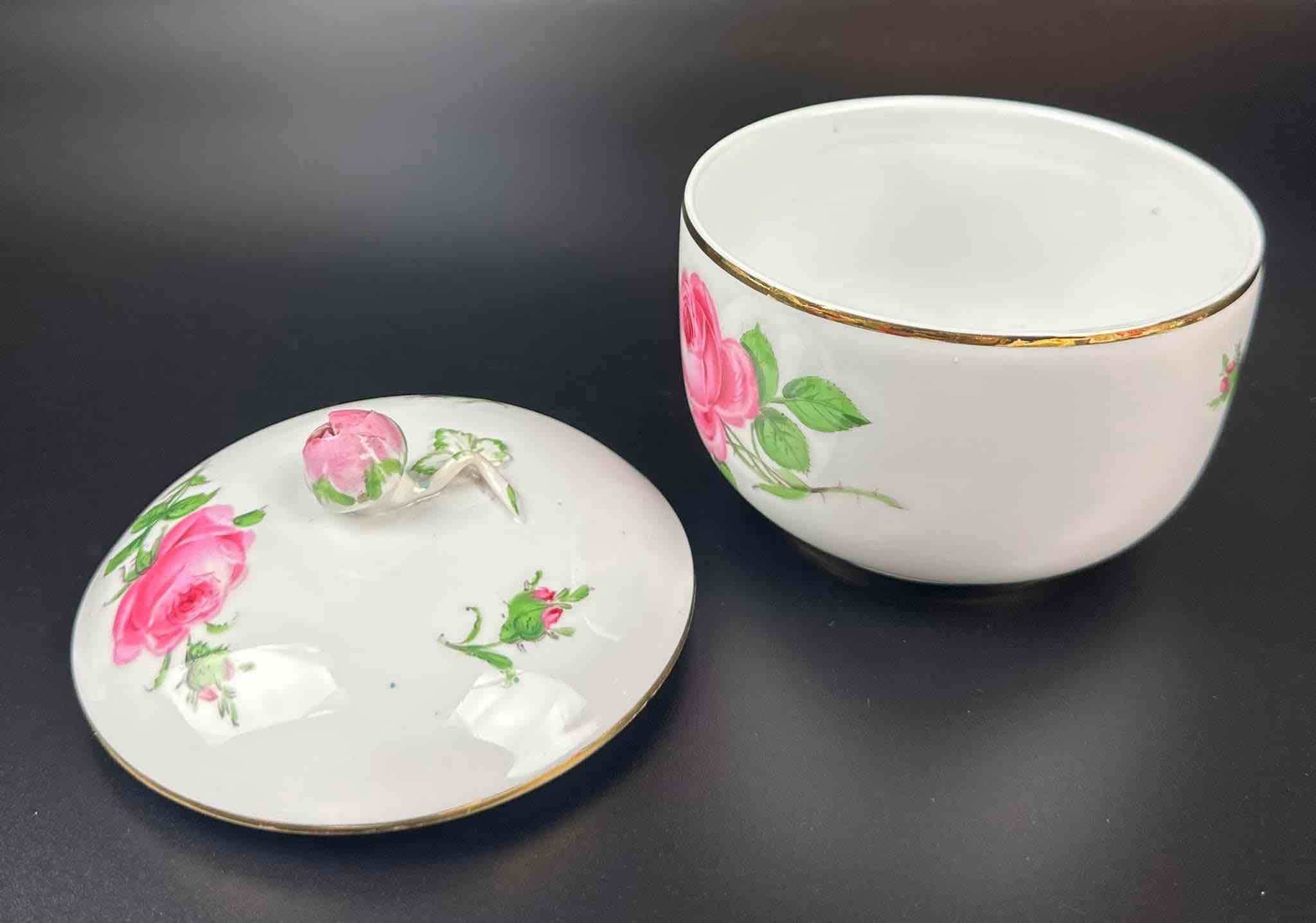 Motyw róży, charakterystyczny dla marki. Porcelana masywna, malatura zachowana bardzo dobrze. Dekielek zakończony pączkiem róży, maleńkie ubytki na końcówkach płatków pączka, drobiazg lecz wyczuwalny w dotyku.