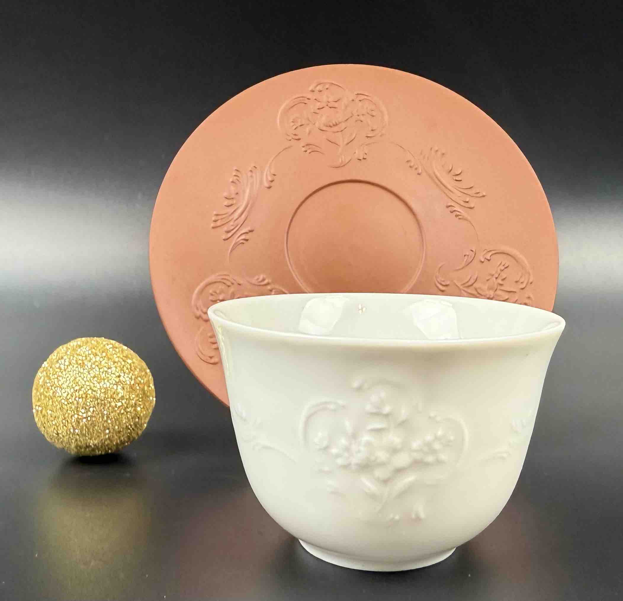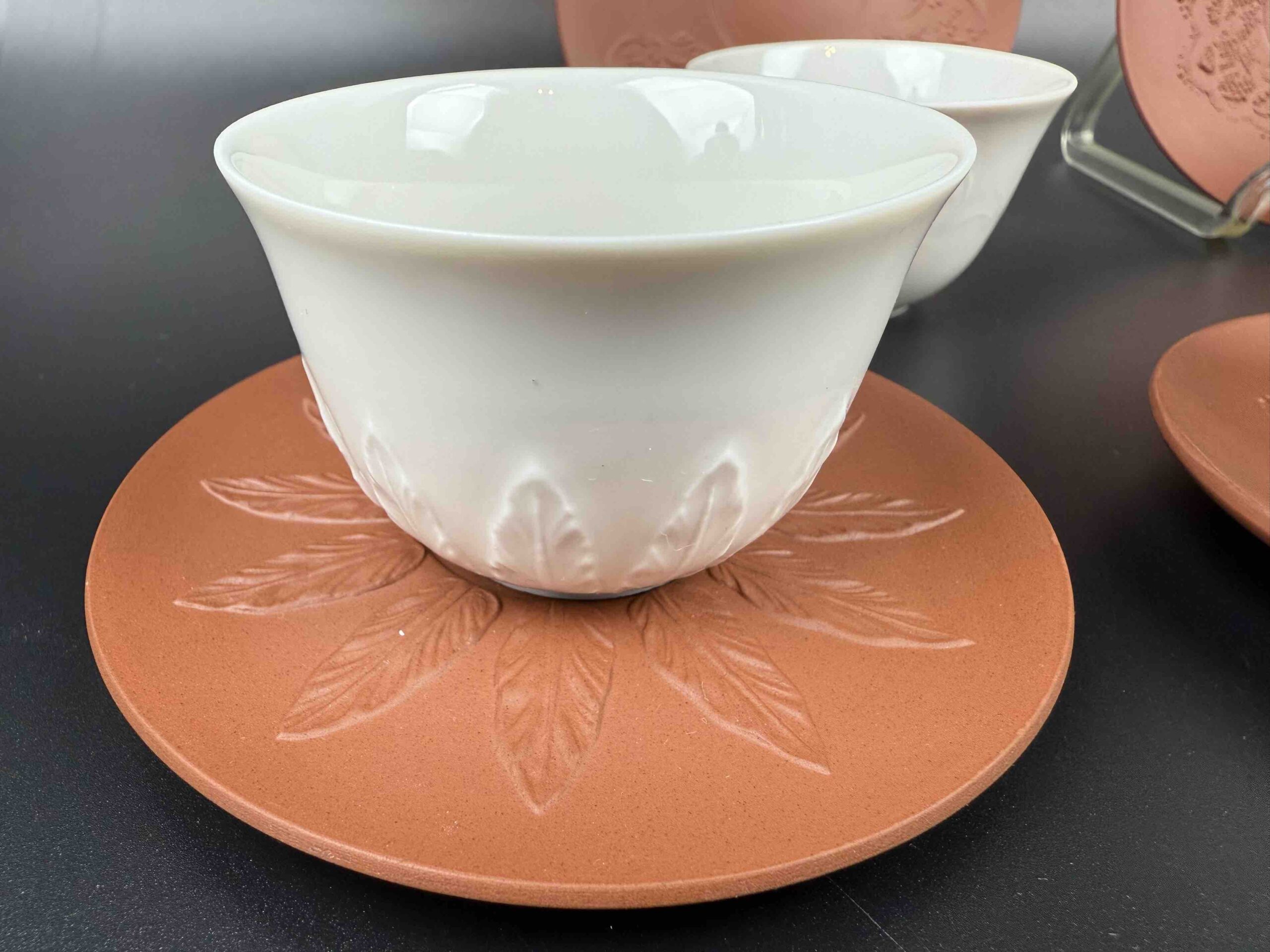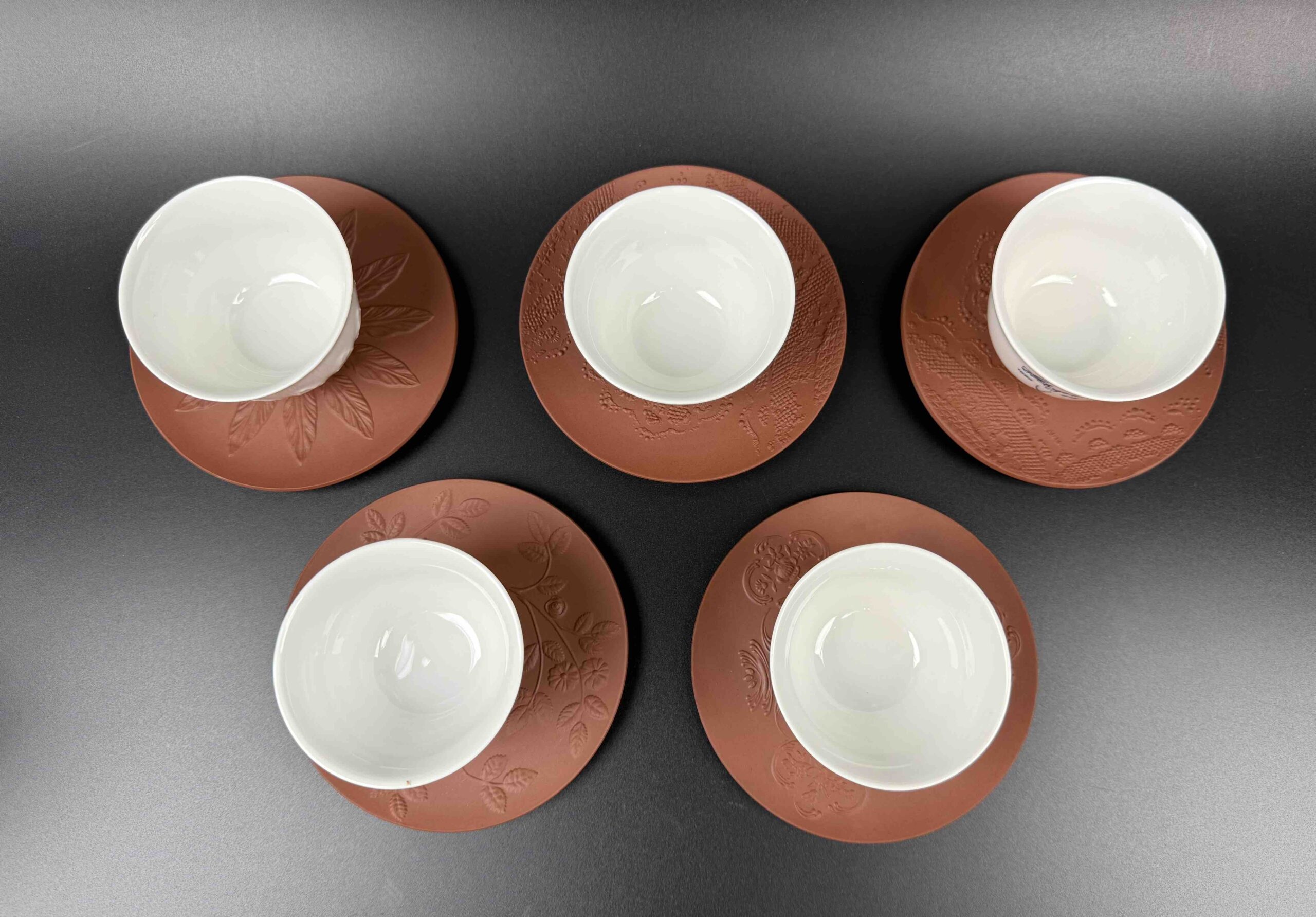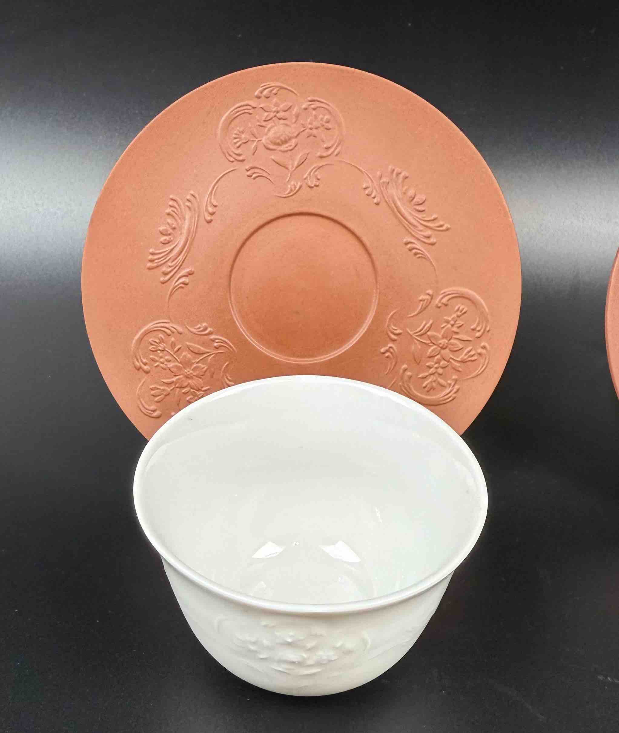 Porcelanowy zestaw filiżanek Meissen, składający się z białych szkliwionych czarek o reliefowym motywie liści oraz spodków w formie bisquitu o terrakotowej barwie (nawiązującego do pierwszej böttgerowskiej kamionki),