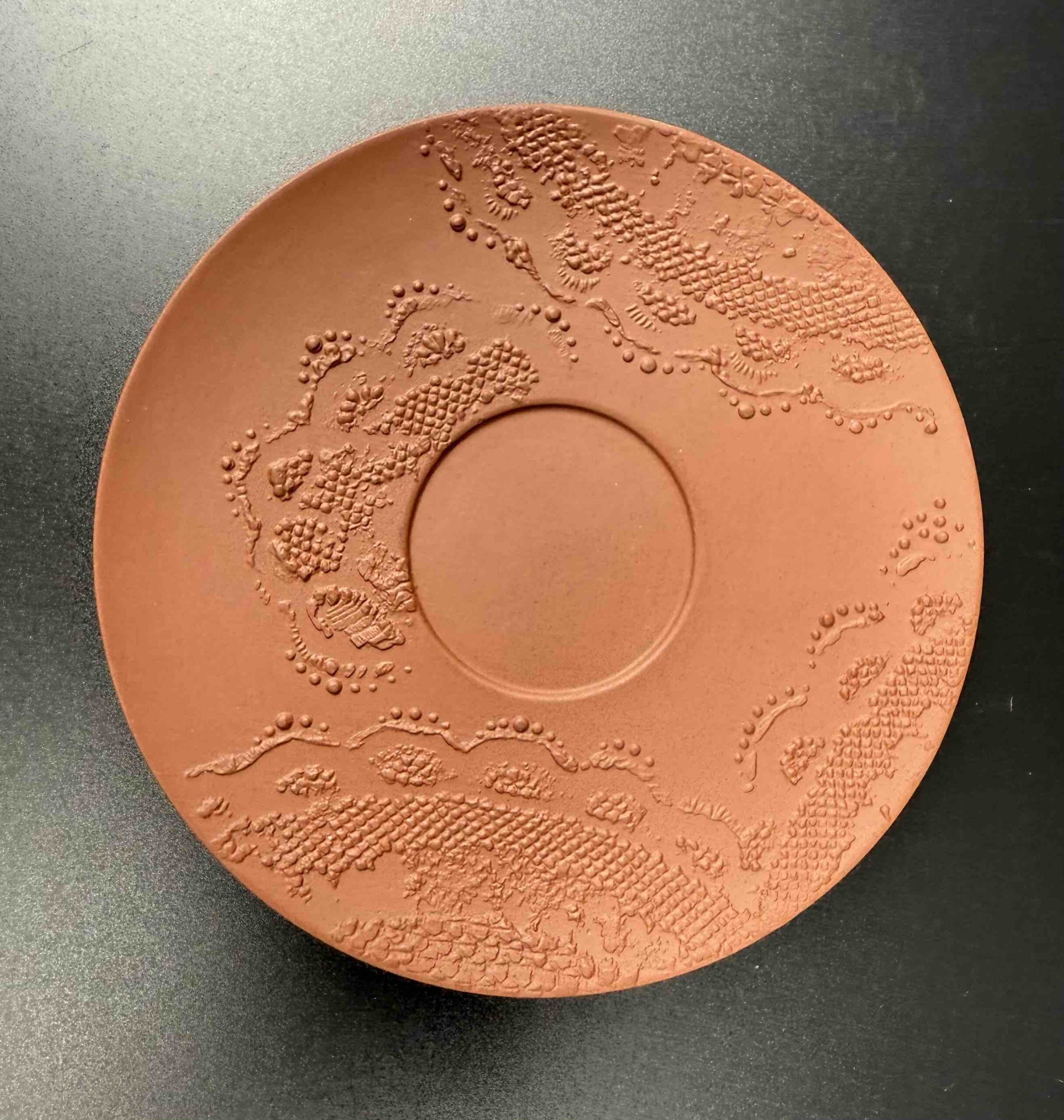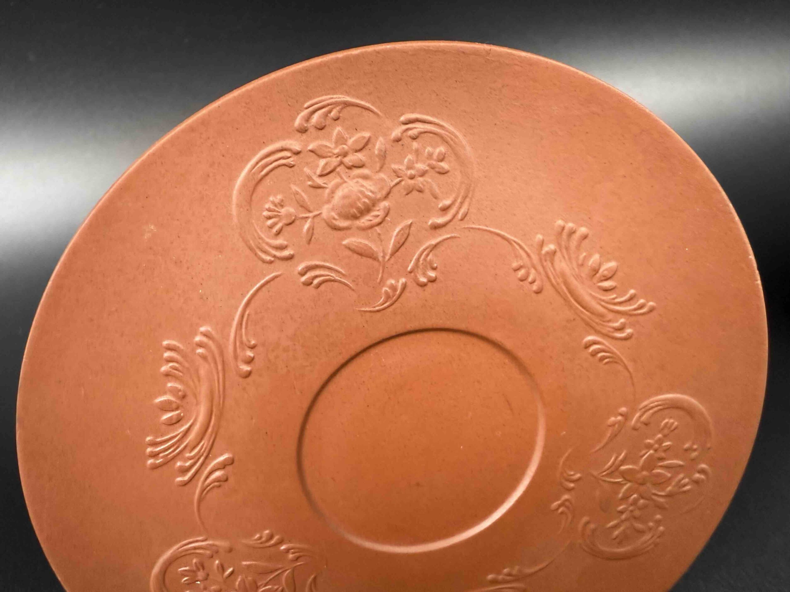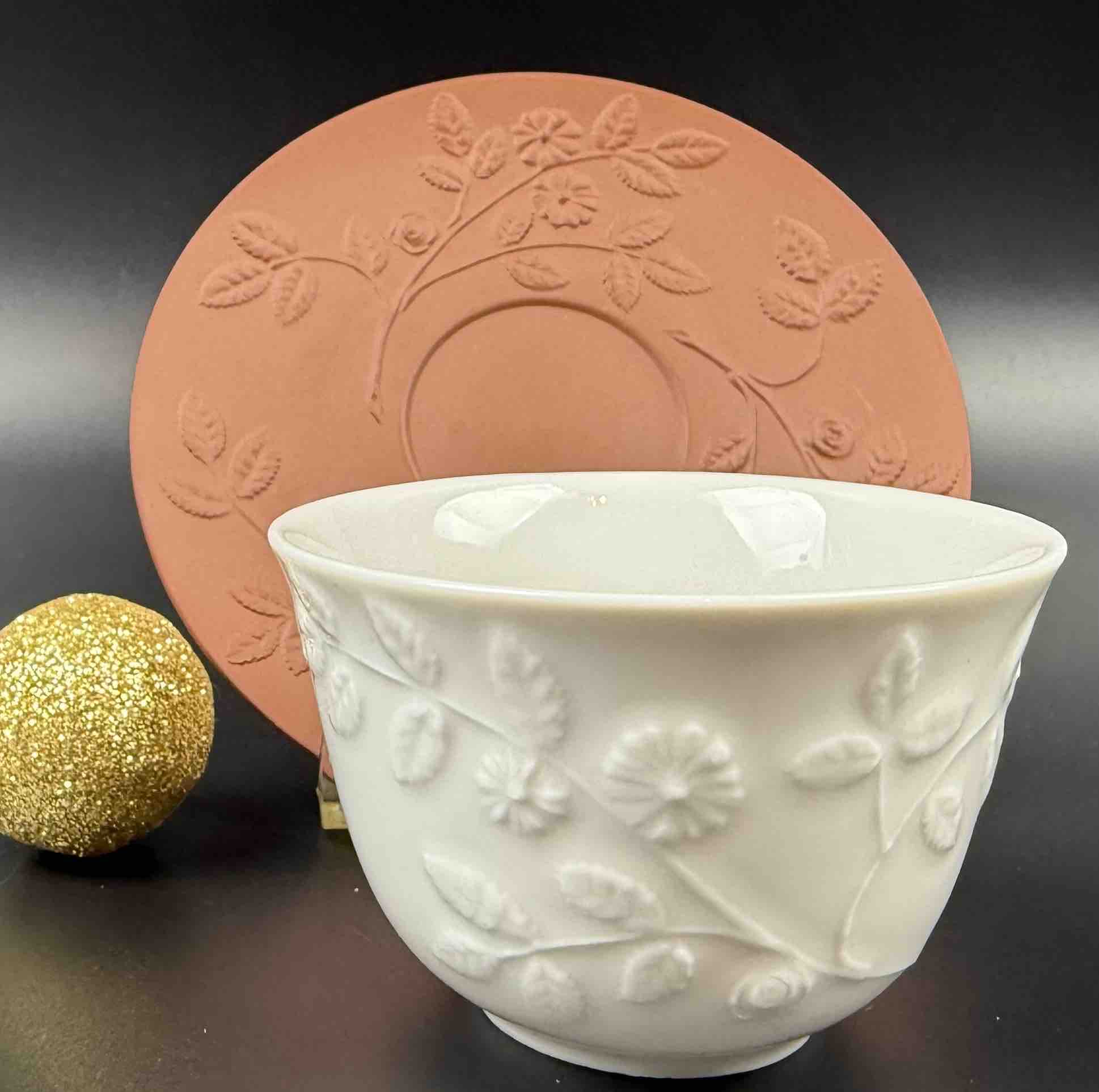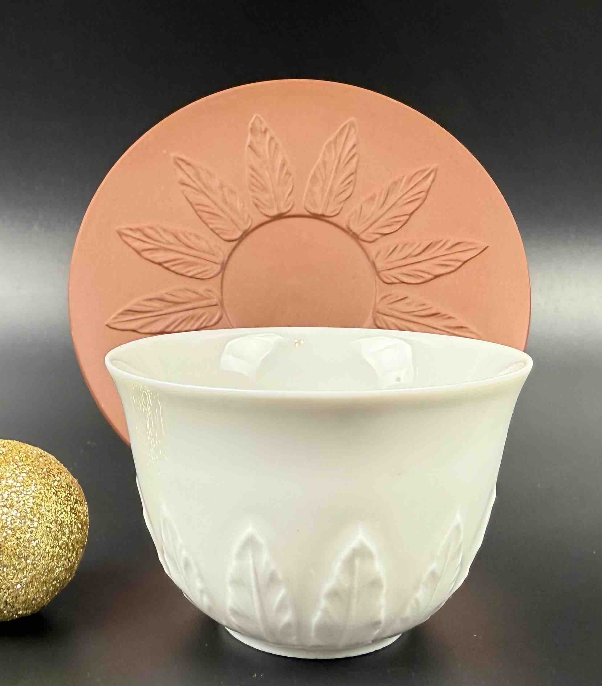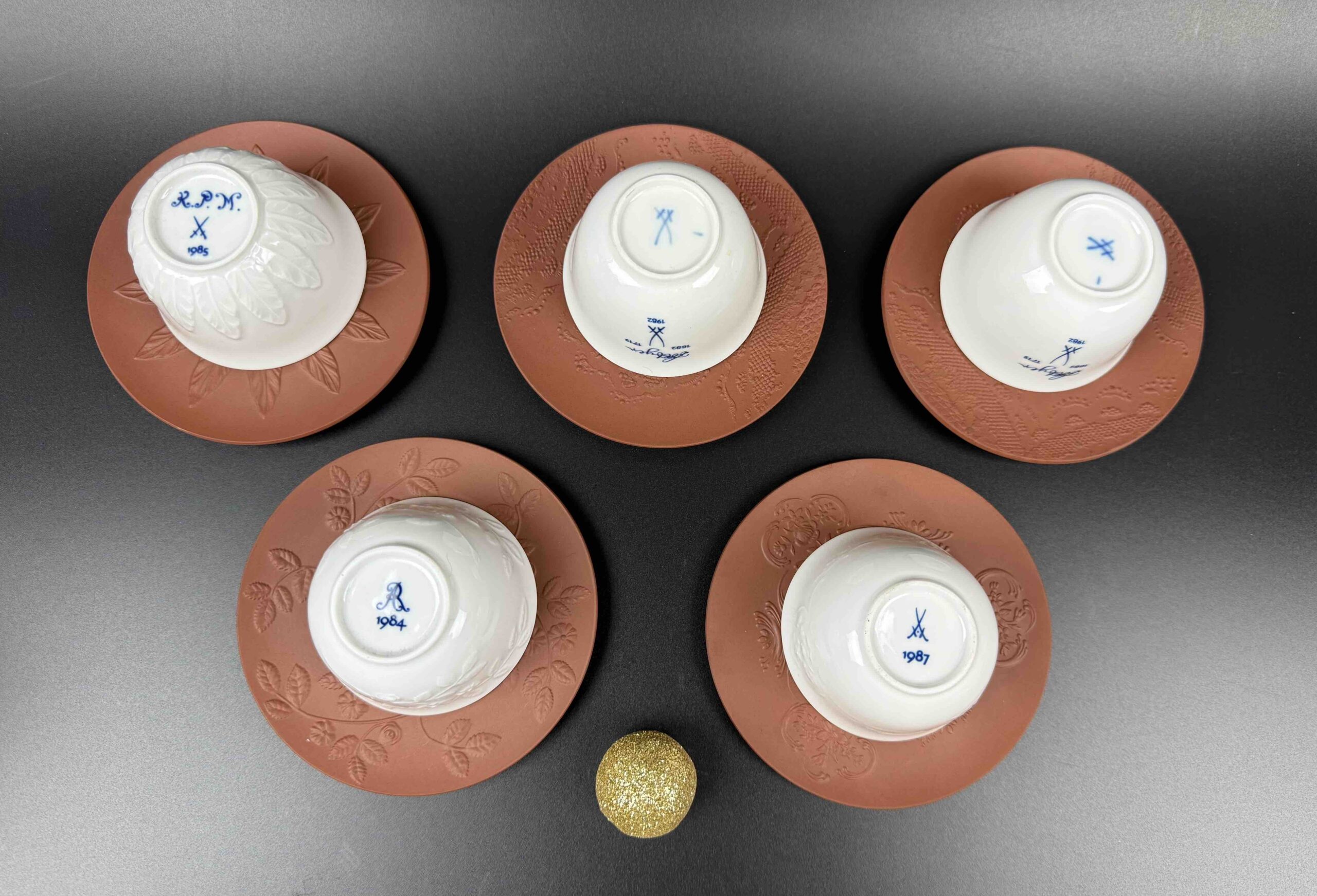 Porcelanowy zestaw filiżanek Meissen, składający się z białych szkliwionych czarek o reliefowym motywie liści oraz spodków w formie bisquitu o terrakotowej barwie (nawiązującego do pierwszej böttgerowskiej kamionki),