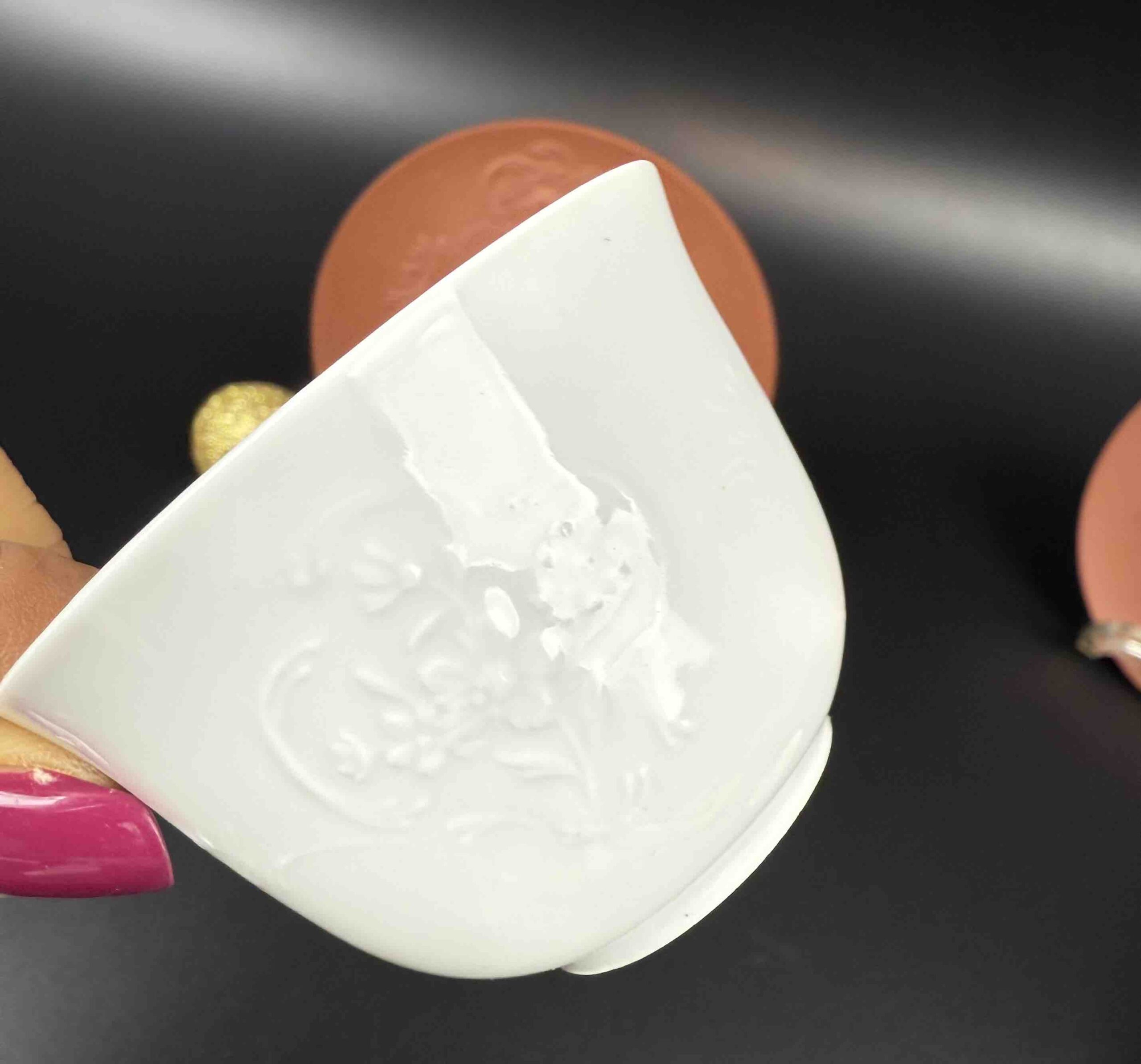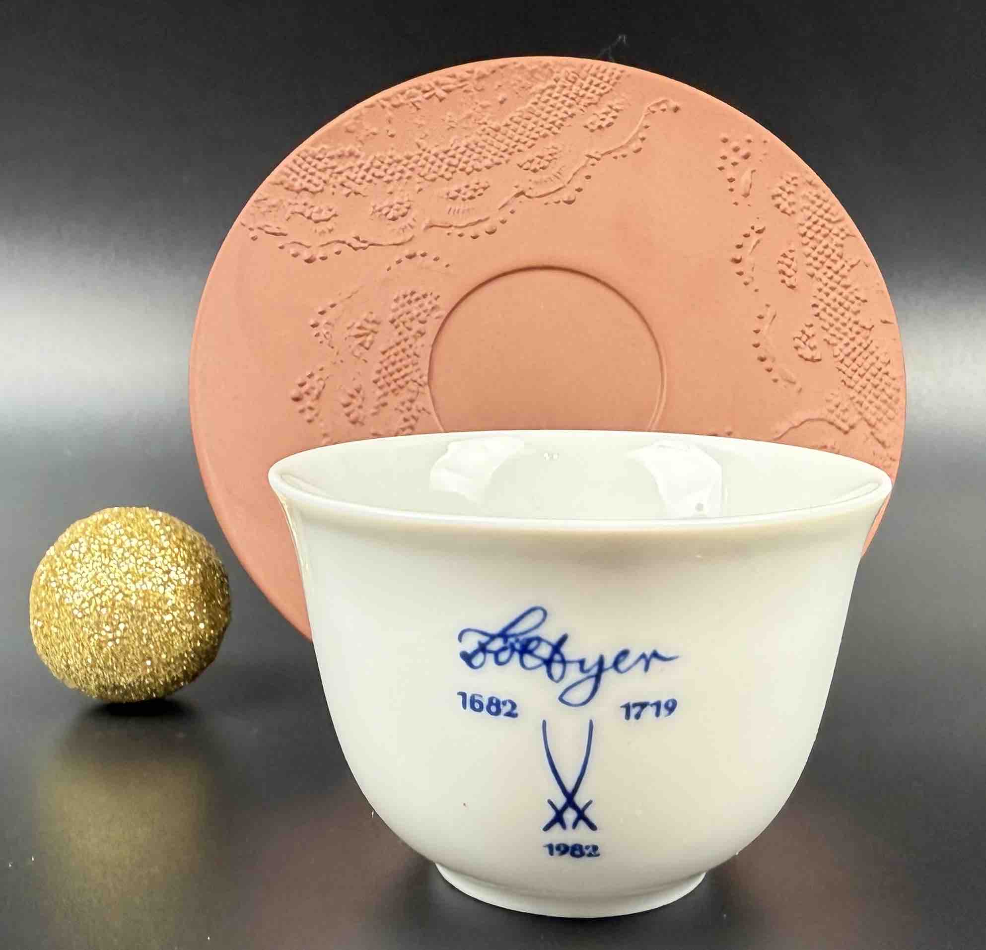 1 . czarka upamiętniająca historię powstania porcelany w Europie z oznaczeniem dat narodzin i śmierci wynalazcy porcelany europejskiej – Friedricha Böttgera – oznaczenia znajdują się również na spodeczku 1682-1719 r. Patrząc na tą czarkę, już na zawsze zapamiętamy tę daty.