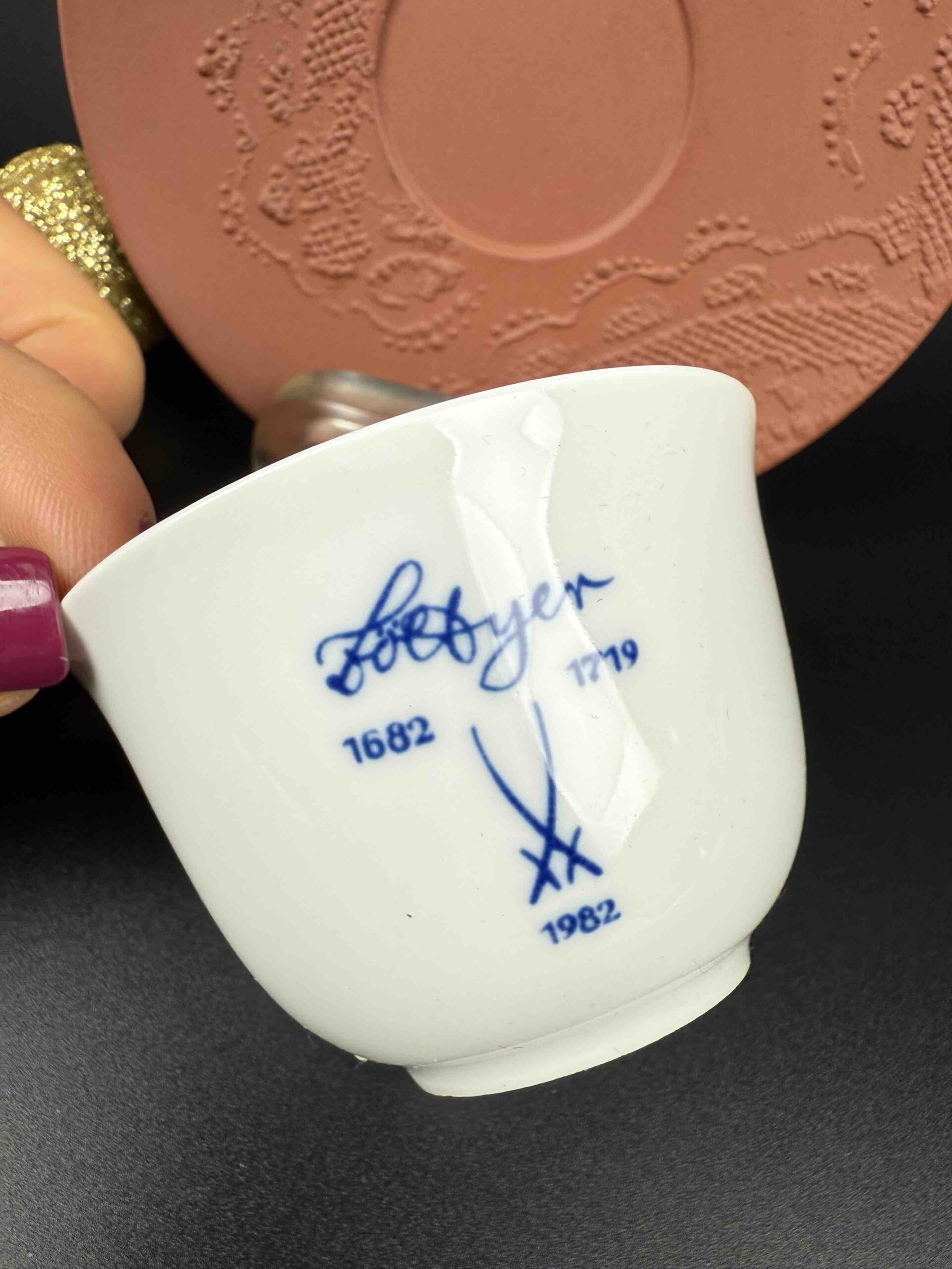 2. czarka upamiętniająca naniesienie pierwszej miśnieńskiej sygnatury mieczy – 1723 r., wyprodukowana w 1984 r.
