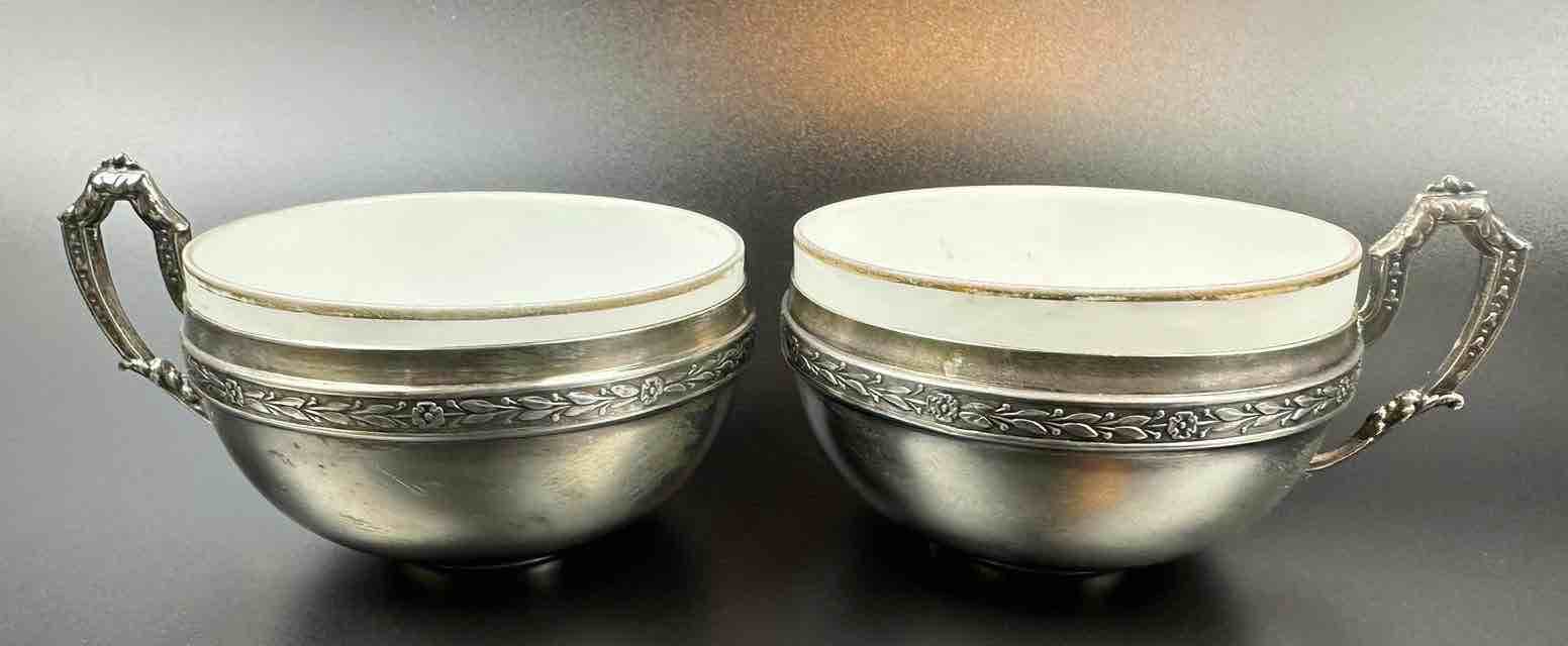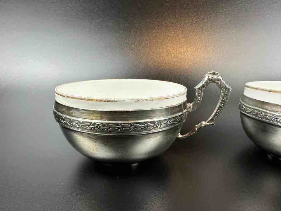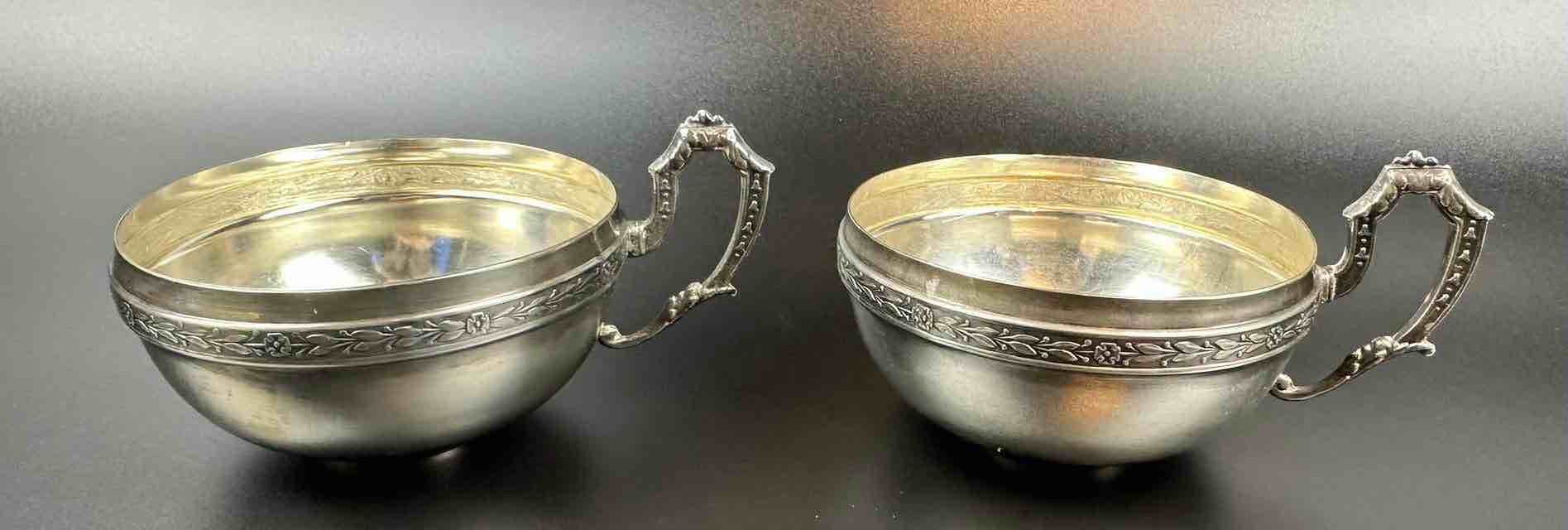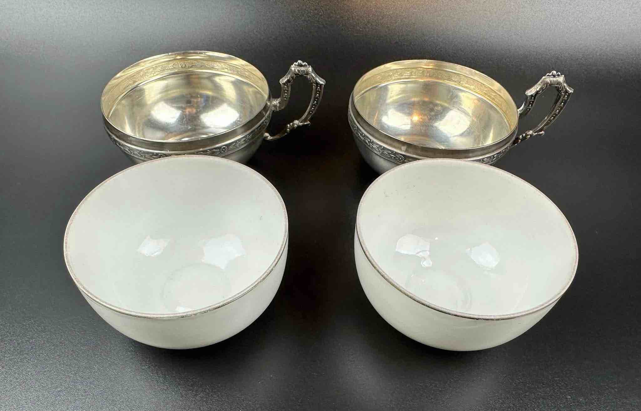 Oferuję parę eleganckich srebrnych naczyń z dekoracyjnymi uchwytami, przeznaczonych do umieszczania dopasowanych porcelanowych czarek (wkładów). Obiekty stanowią komplet.
