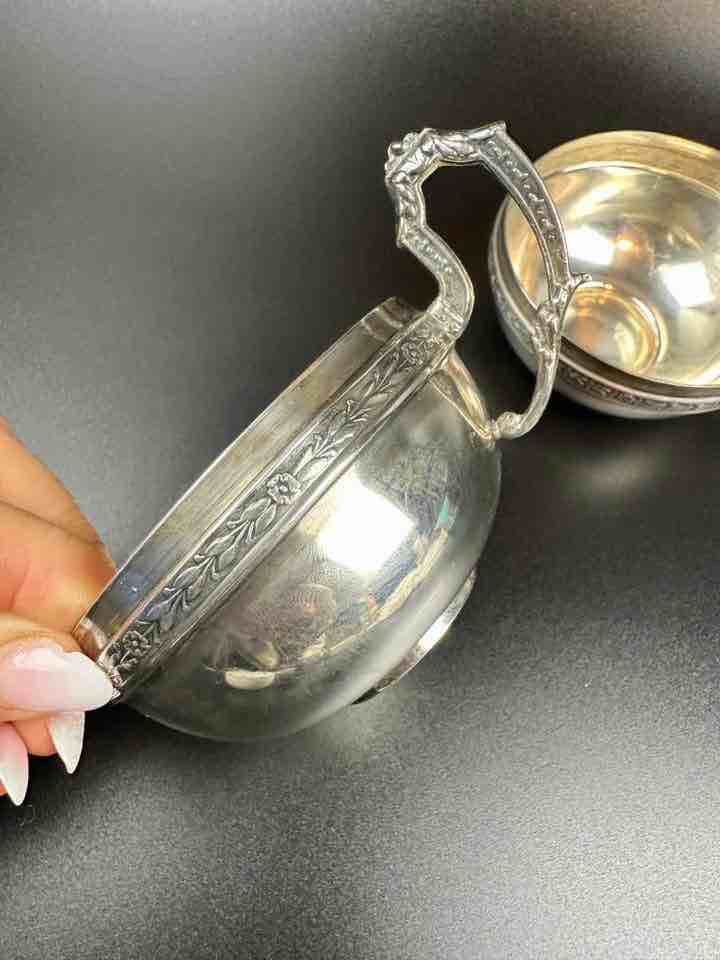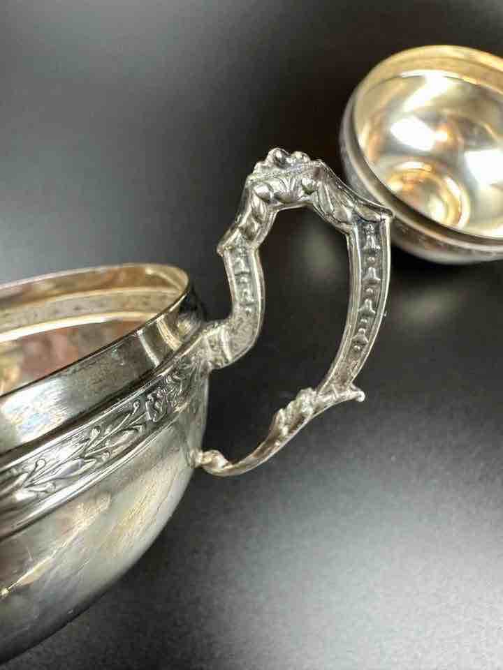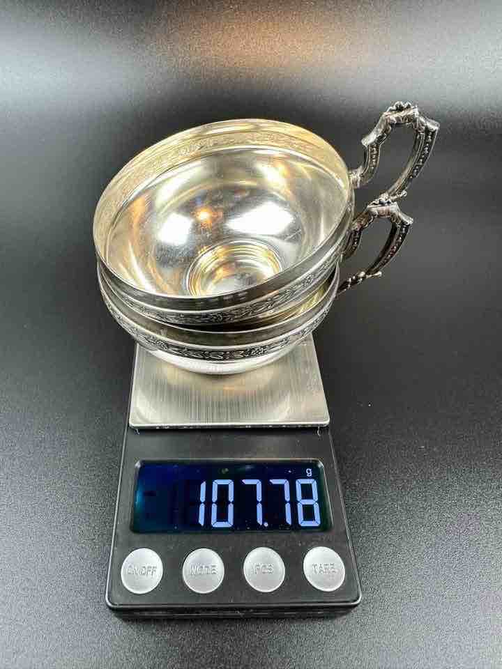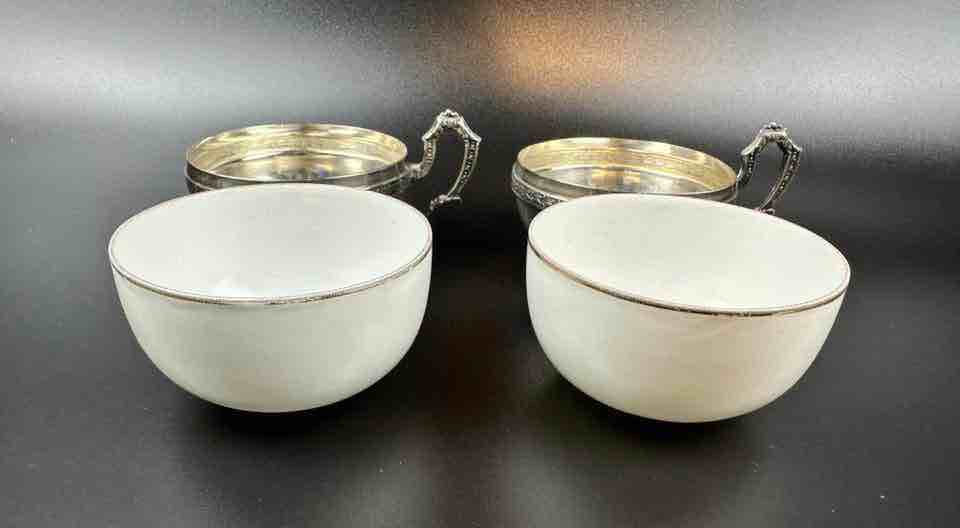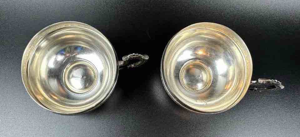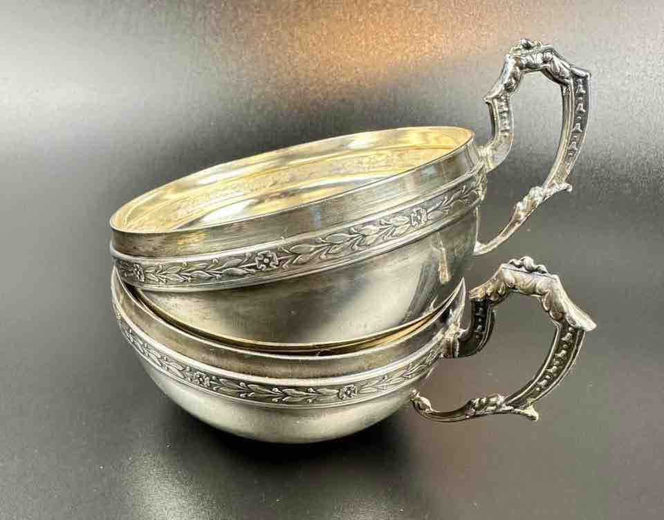 Oferuję parę eleganckich srebrnych naczyń z dekoracyjnymi uchwytami, przeznaczonych do umieszczania dopasowanych porcelanowych czarek (wkładów). Obiekty stanowią komplet.