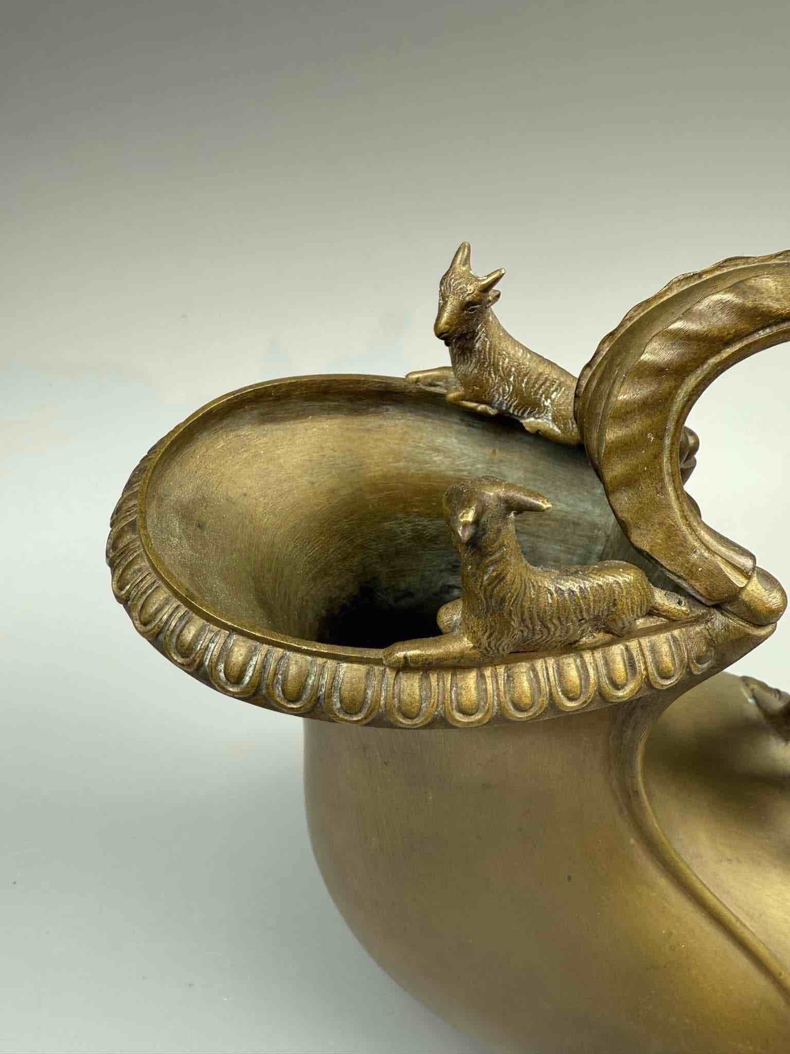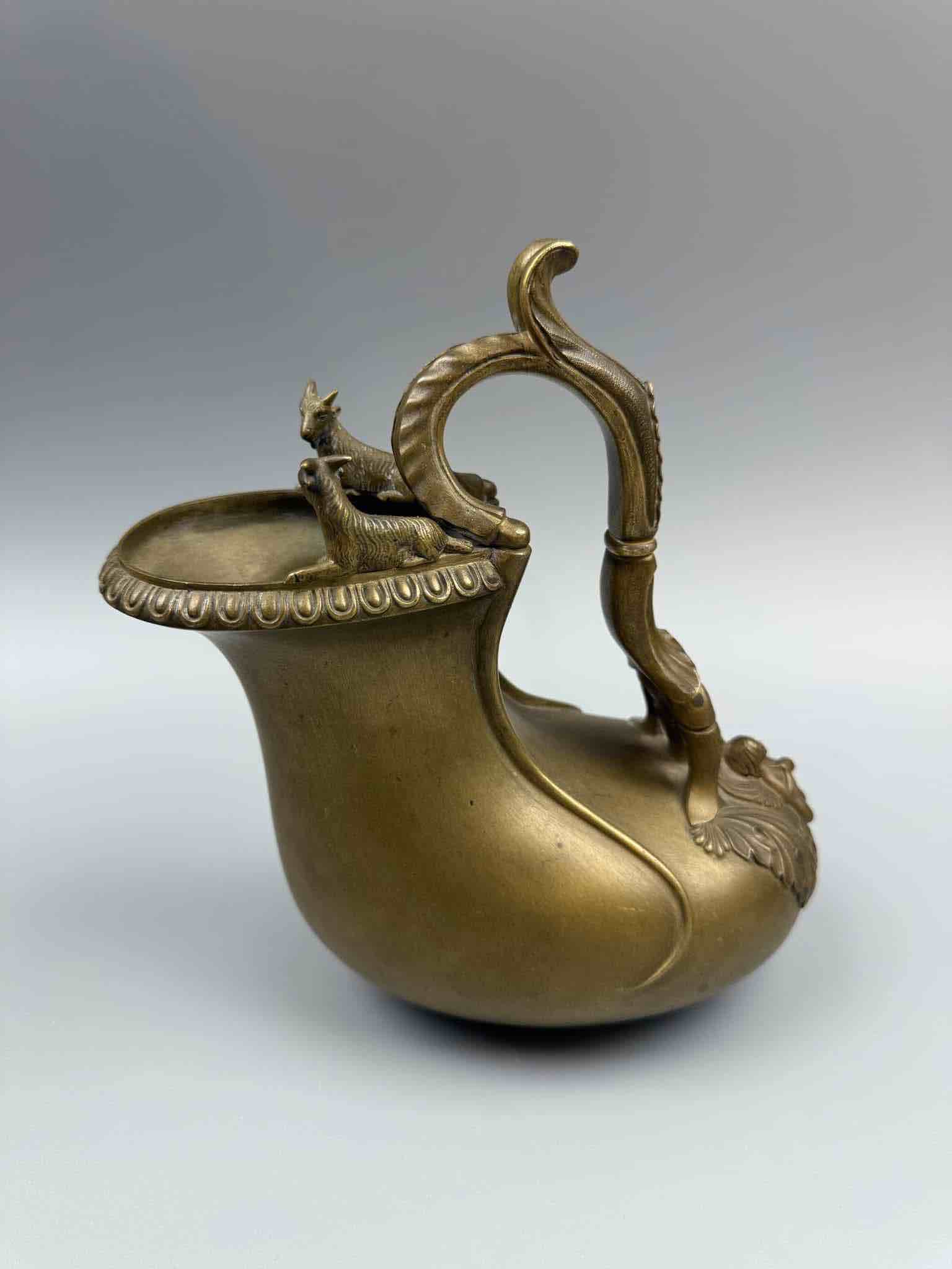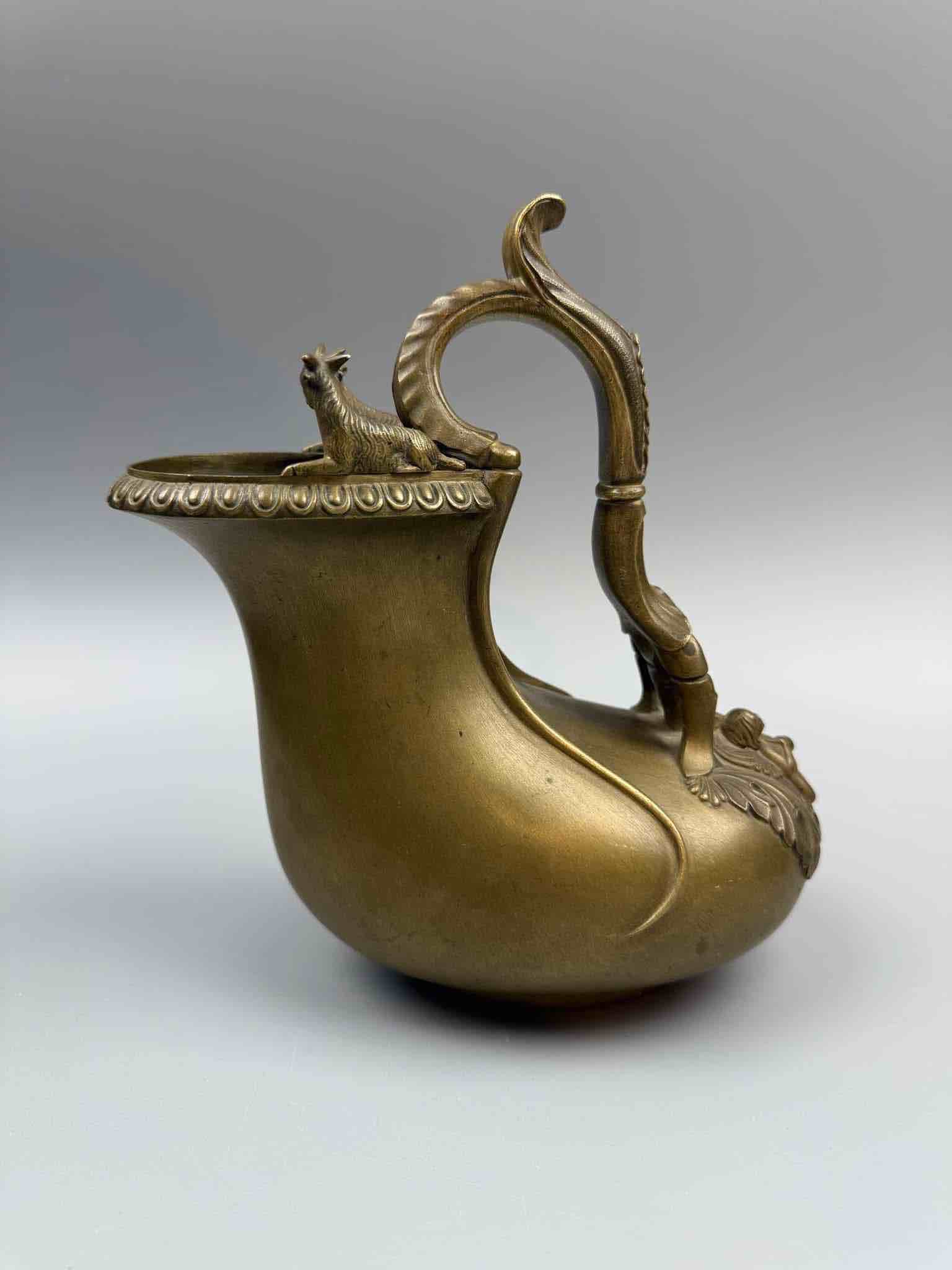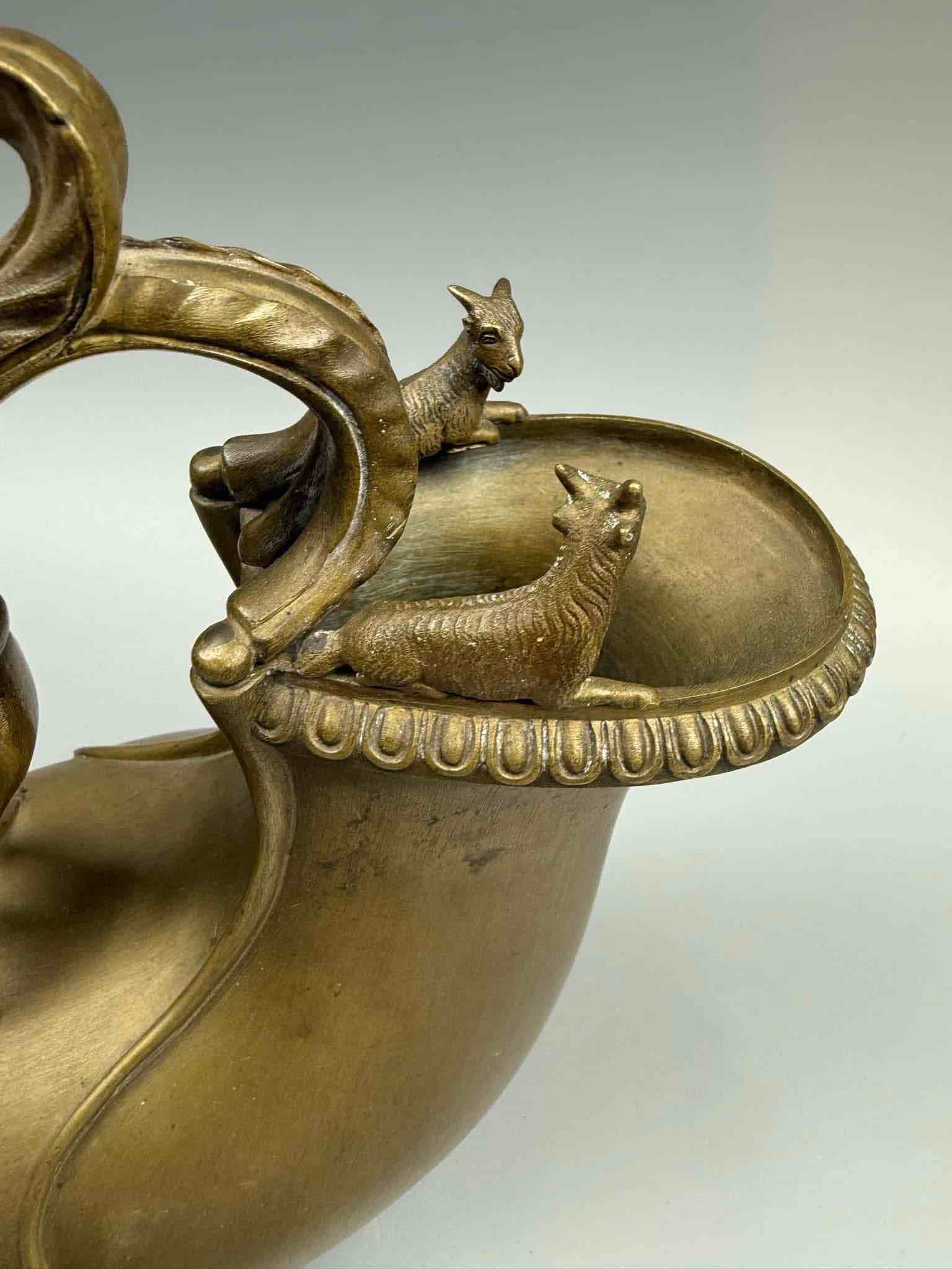 Askos było rzymskim naczyniem do nalewania wina lub mleka. Ta wersja ma falistą rękojeść zdobioną liśćmi, zakończoną skrzydlatym putto stojącym na muszli przegrzebka, a brzeg ozdobiony uchwytem zwieńczony jest dwoma kozłami.Najprawdopodobniej pochodzi z wloskiej odlewni. Chiurazzi i Fils.