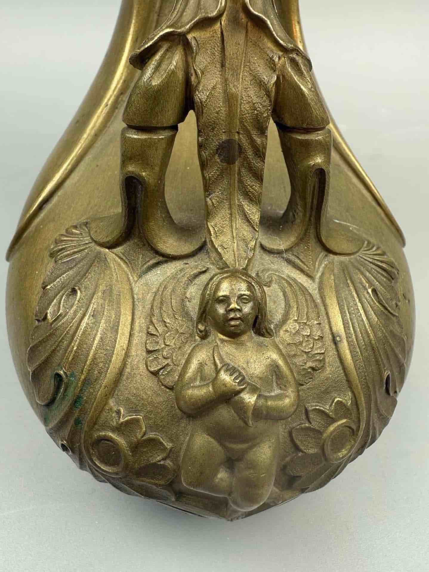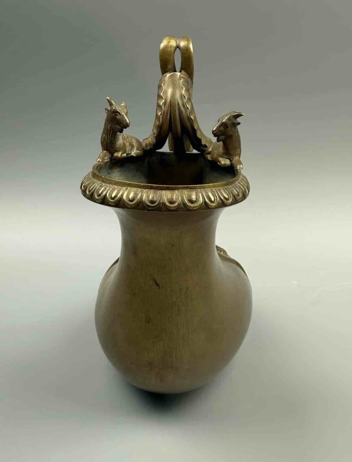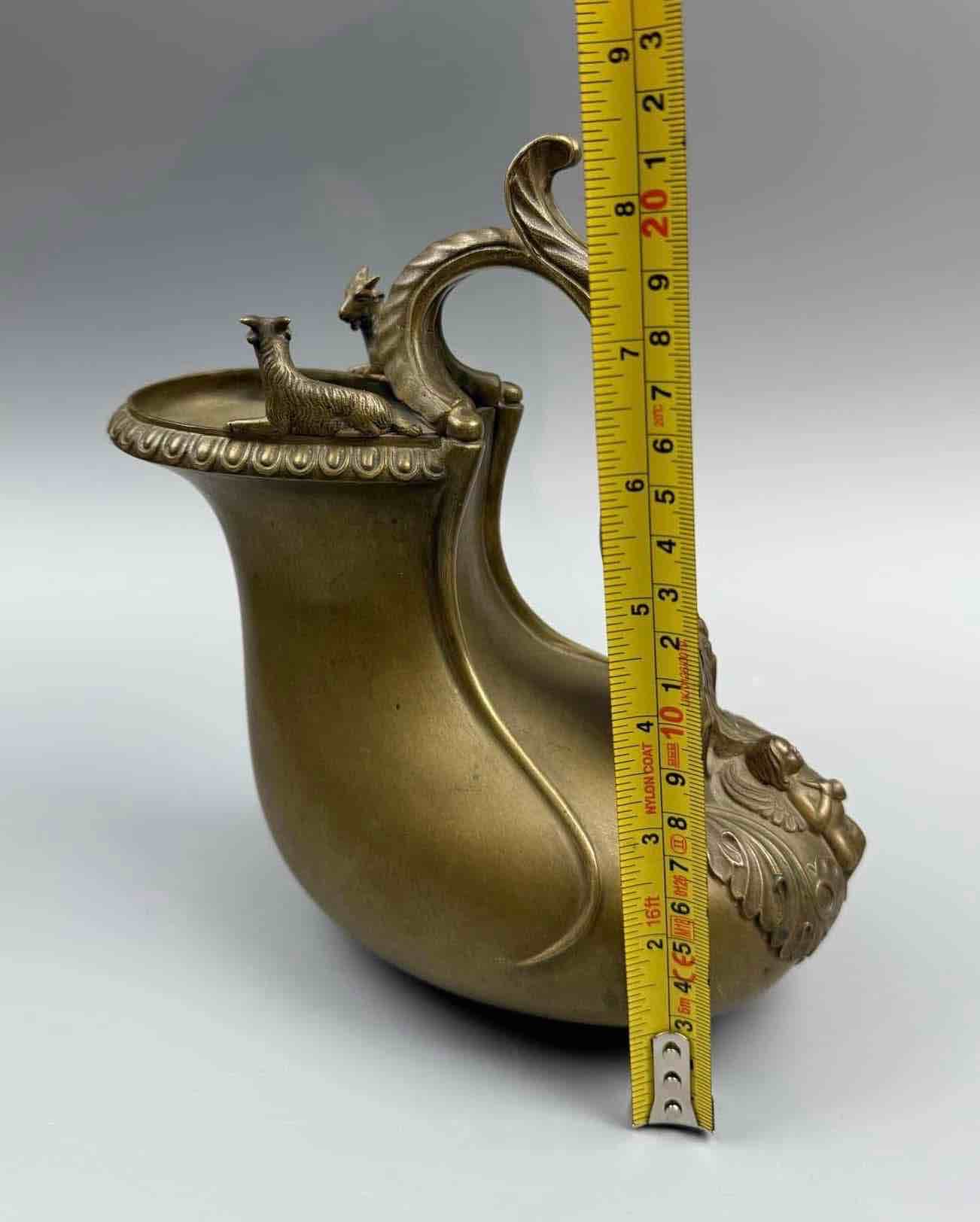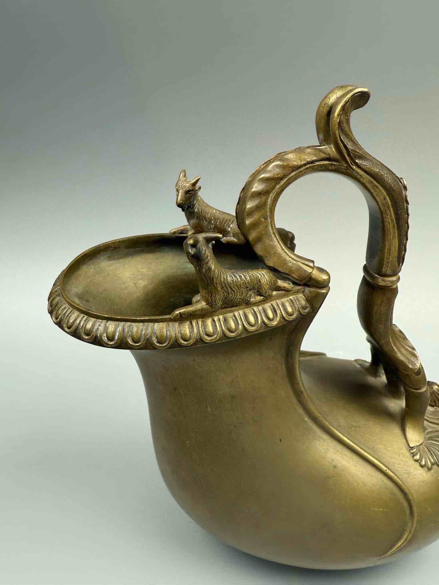 Askos było rzymskim naczyniem do nalewania wina lub mleka. Ta wersja ma falistą rękojeść zdobioną liśćmi, zakończoną skrzydlatym putto stojącym na muszli przegrzebka, a brzeg ozdobiony uchwytem zwieńczony jest dwoma kozłami.Najprawdopodobniej pochodzi z wloskiej odlewni. Chiurazzi i Fils.