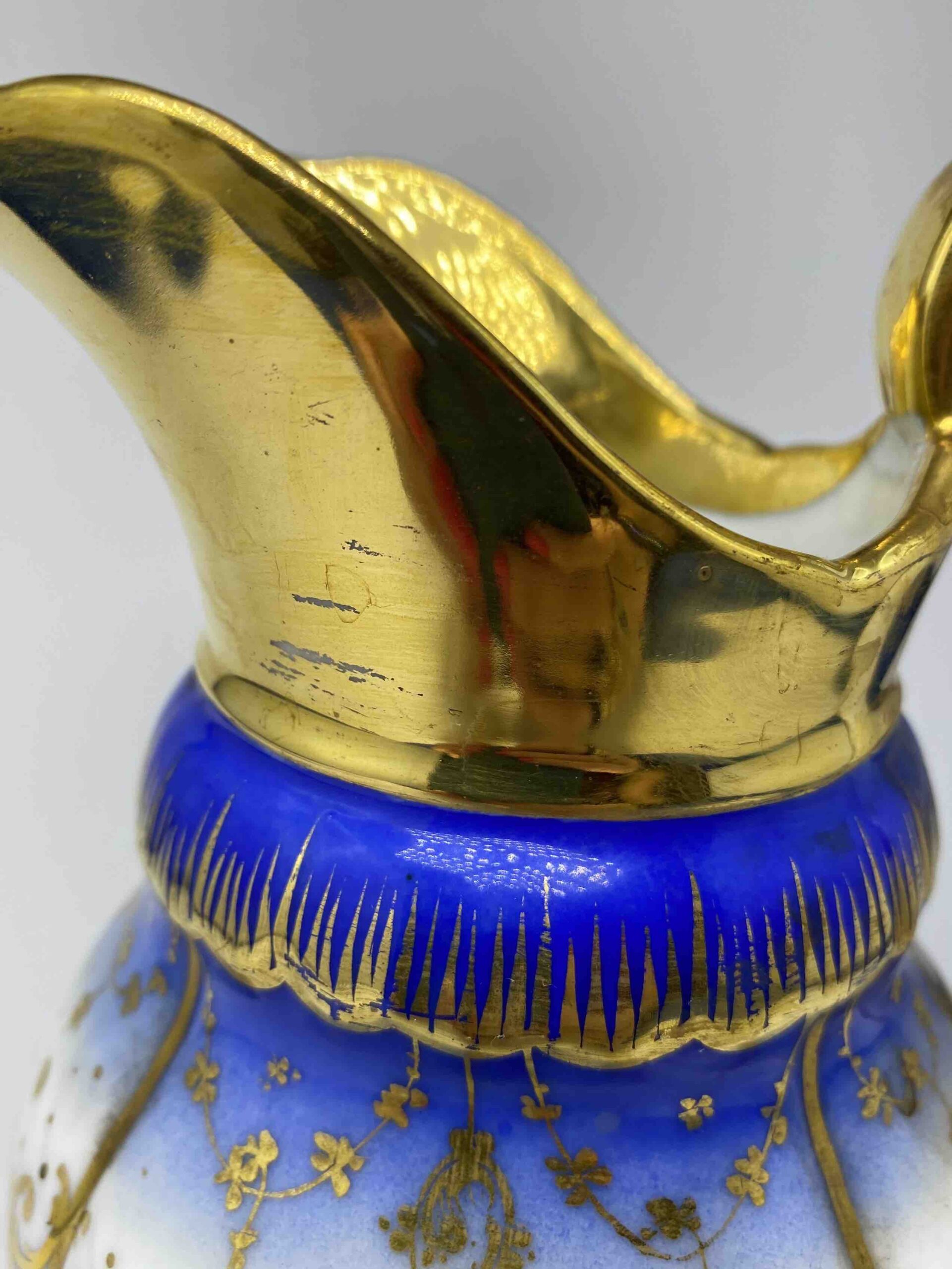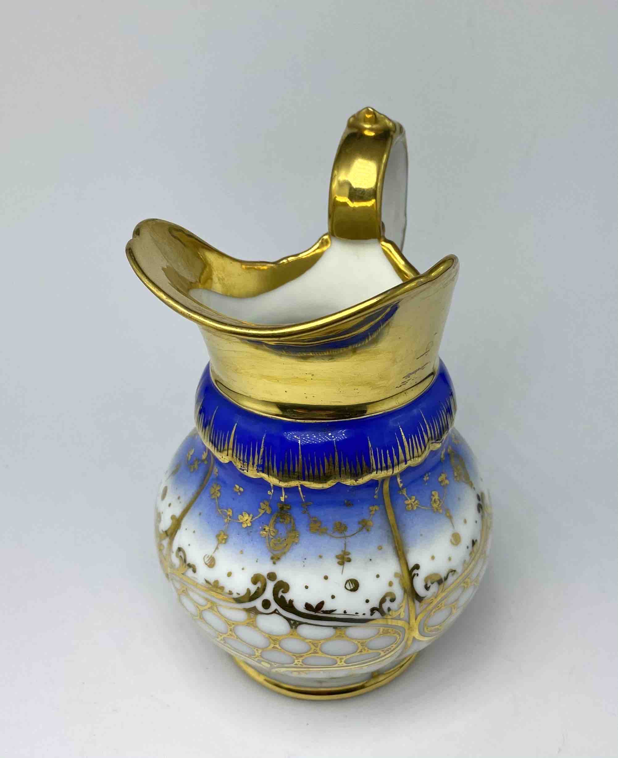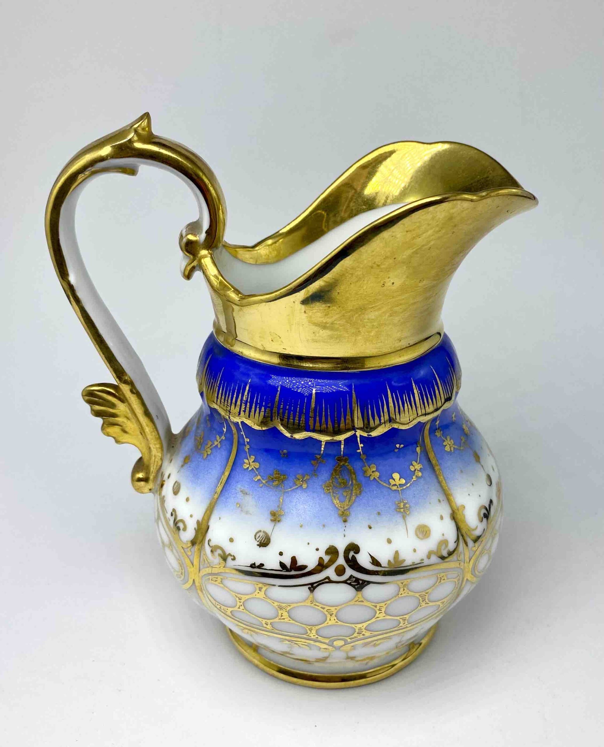 Dominującym elementem dekoracji jest cobalt royal – nasycony odcień błękitu, popularny w najznamienitszych francuskich manufakturach XIX stulecia (m.in. Sèvres, Limoges). Kobaltowy pas stopniowo przechodzi w biel porcelany, a całość została opracowana ręcznymi złoceniami o motywach kwietnych, ornamentalnych i roślinnych. Tło ozdobiono również regularnym układem złotych punktów i girland, co nadaje zestawowi wyrafinowanego, prawie jubilerskiego charakteru.