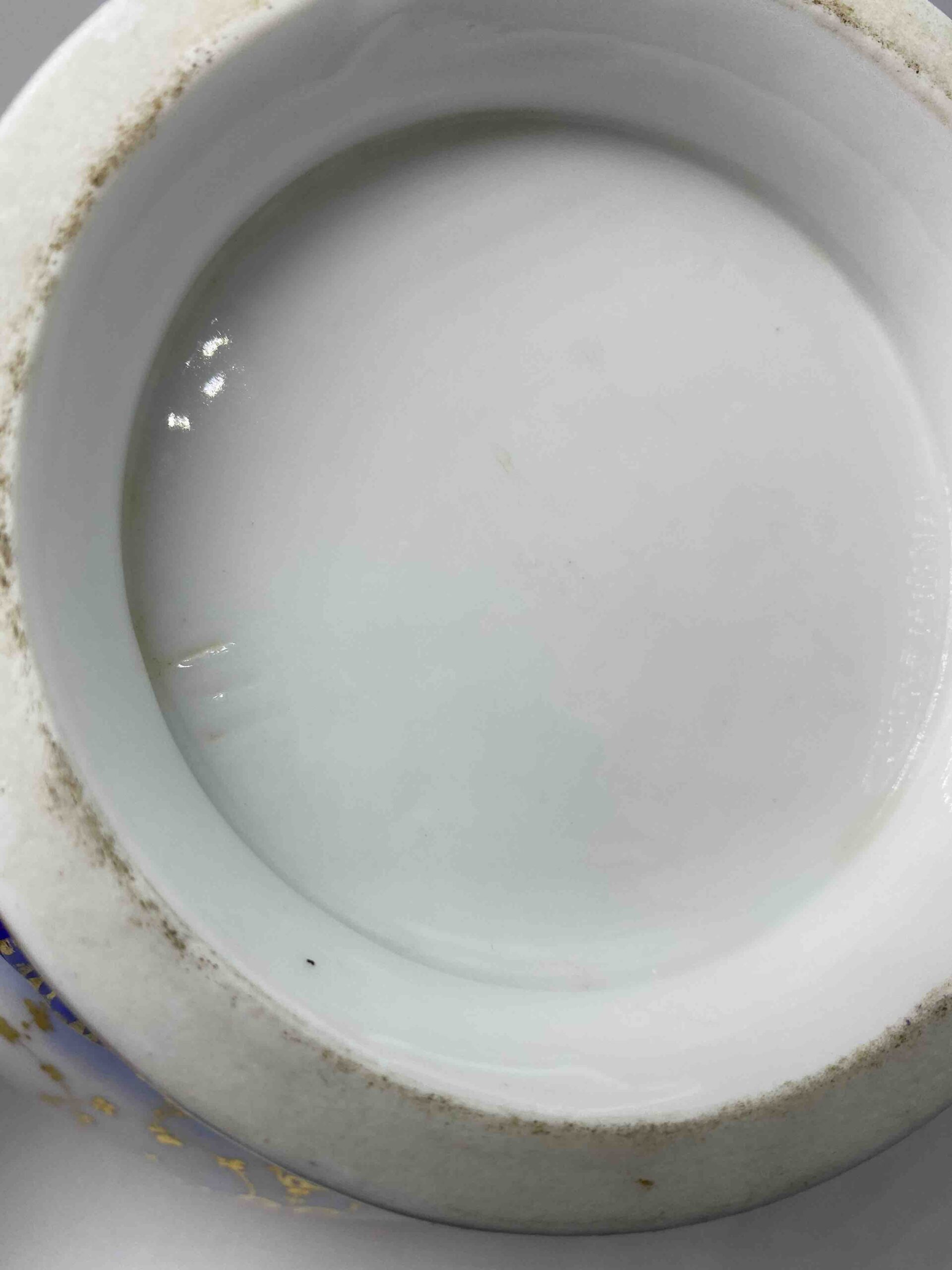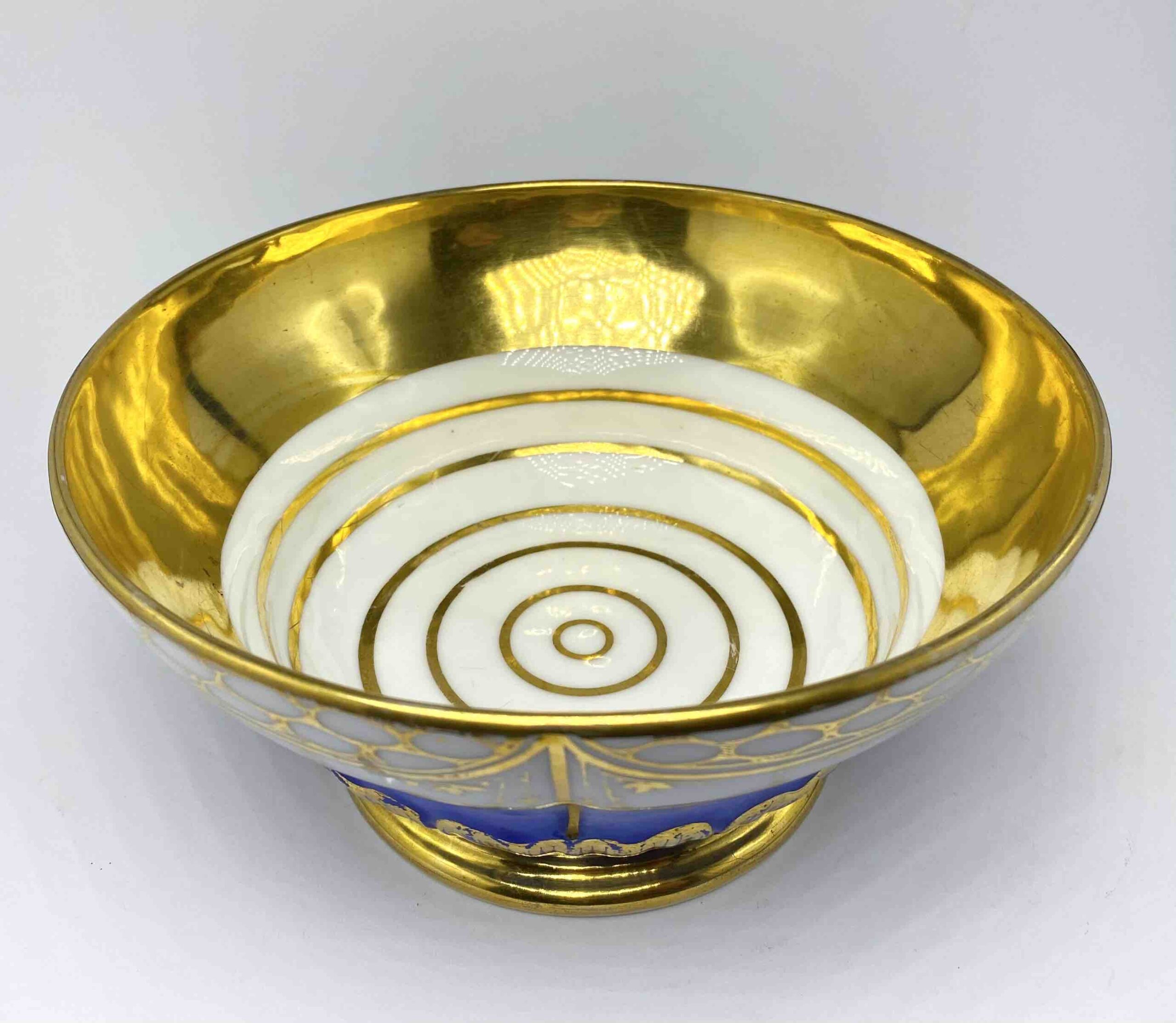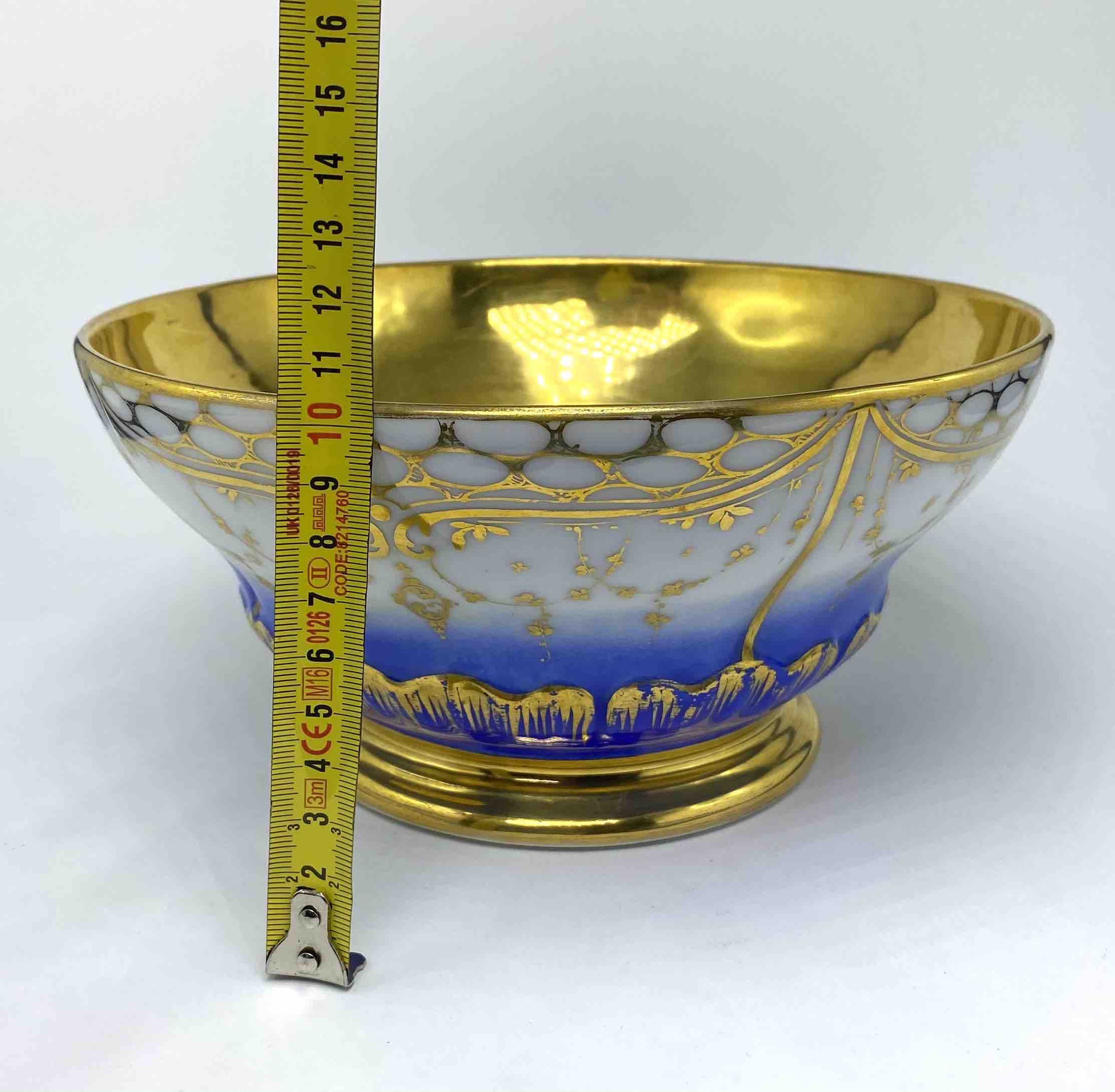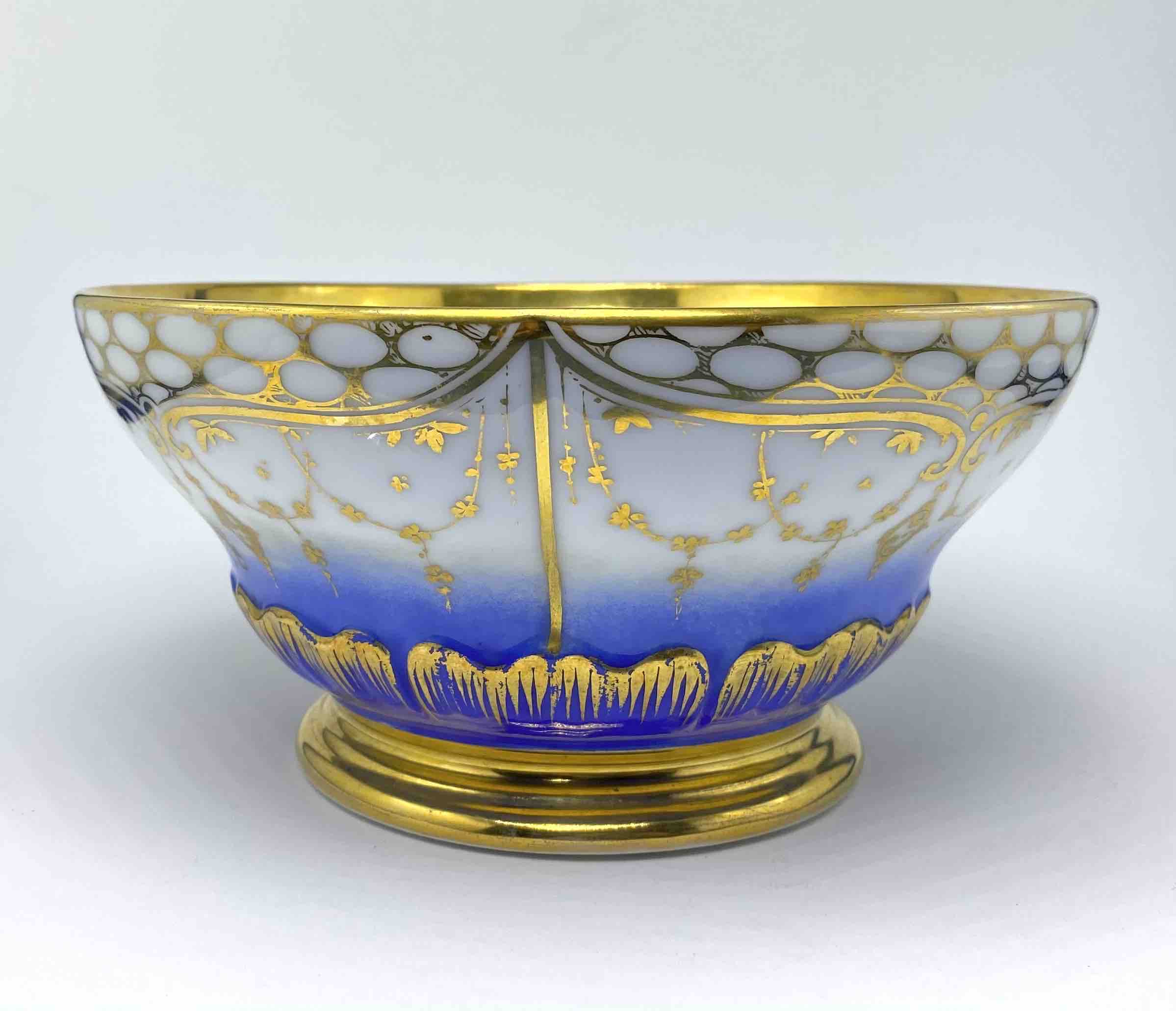 Dominującym elementem dekoracji jest cobalt royal – nasycony odcień błękitu, popularny w najznamienitszych francuskich manufakturach XIX stulecia (m.in. Sèvres, Limoges). Kobaltowy pas stopniowo przechodzi w biel porcelany, a całość została opracowana ręcznymi złoceniami o motywach kwietnych, ornamentalnych i roślinnych. Tło ozdobiono również regularnym układem złotych punktów i girland, co nadaje zestawowi wyrafinowanego, prawie jubilerskiego charakteru.