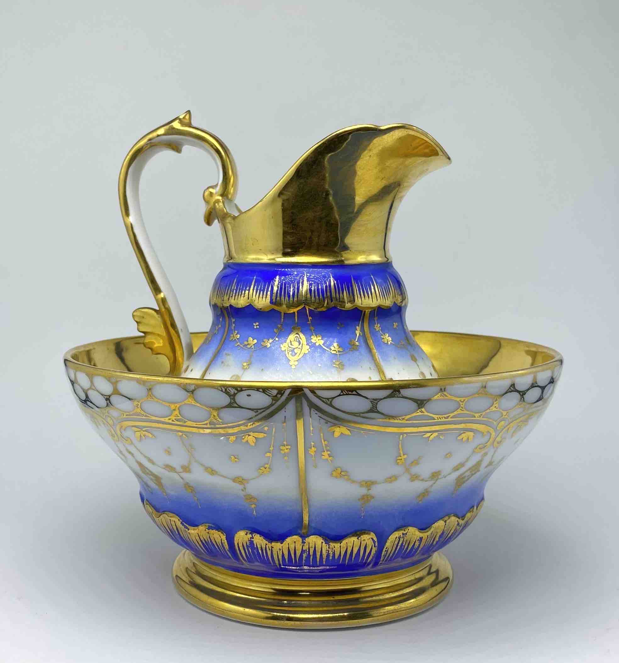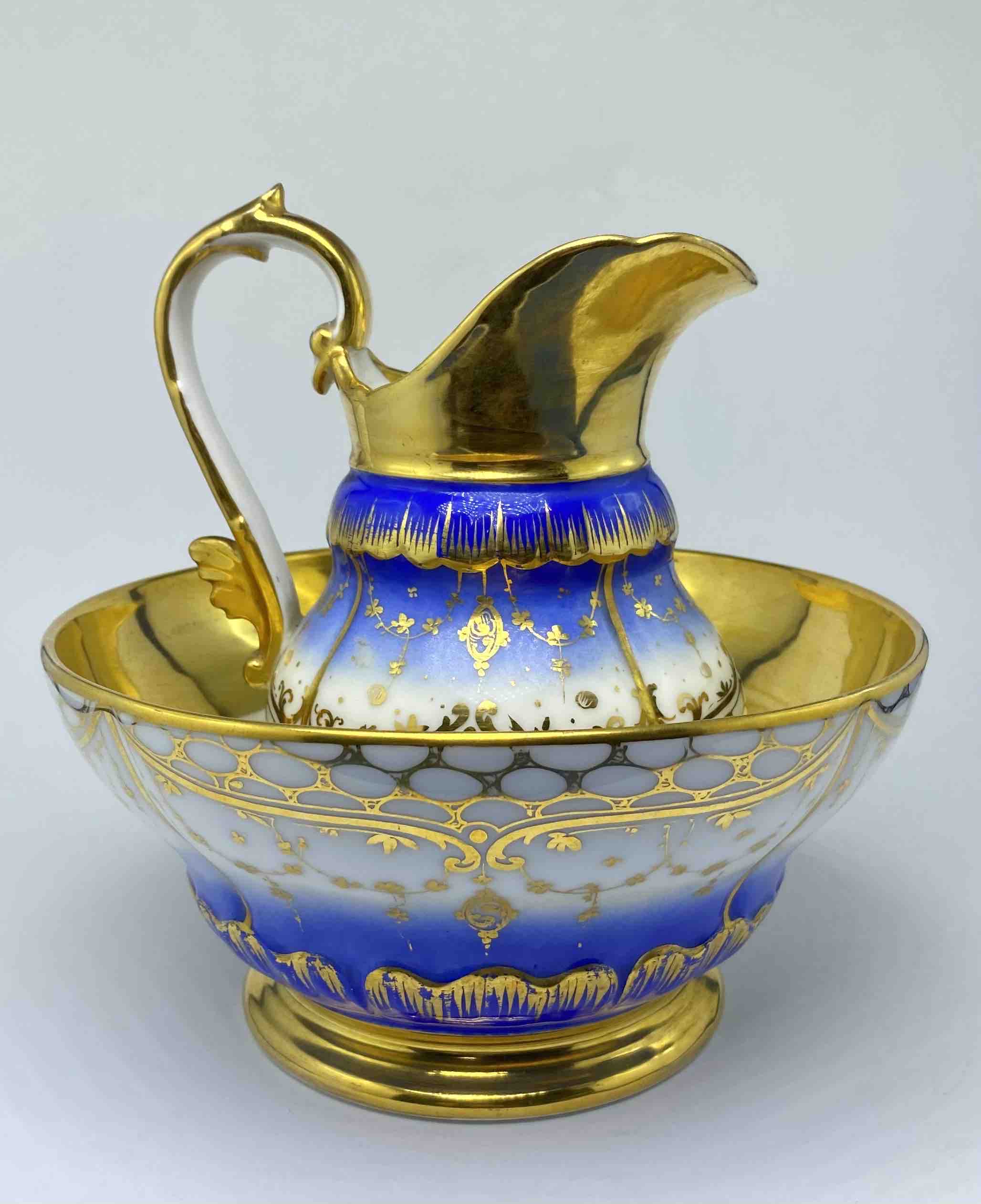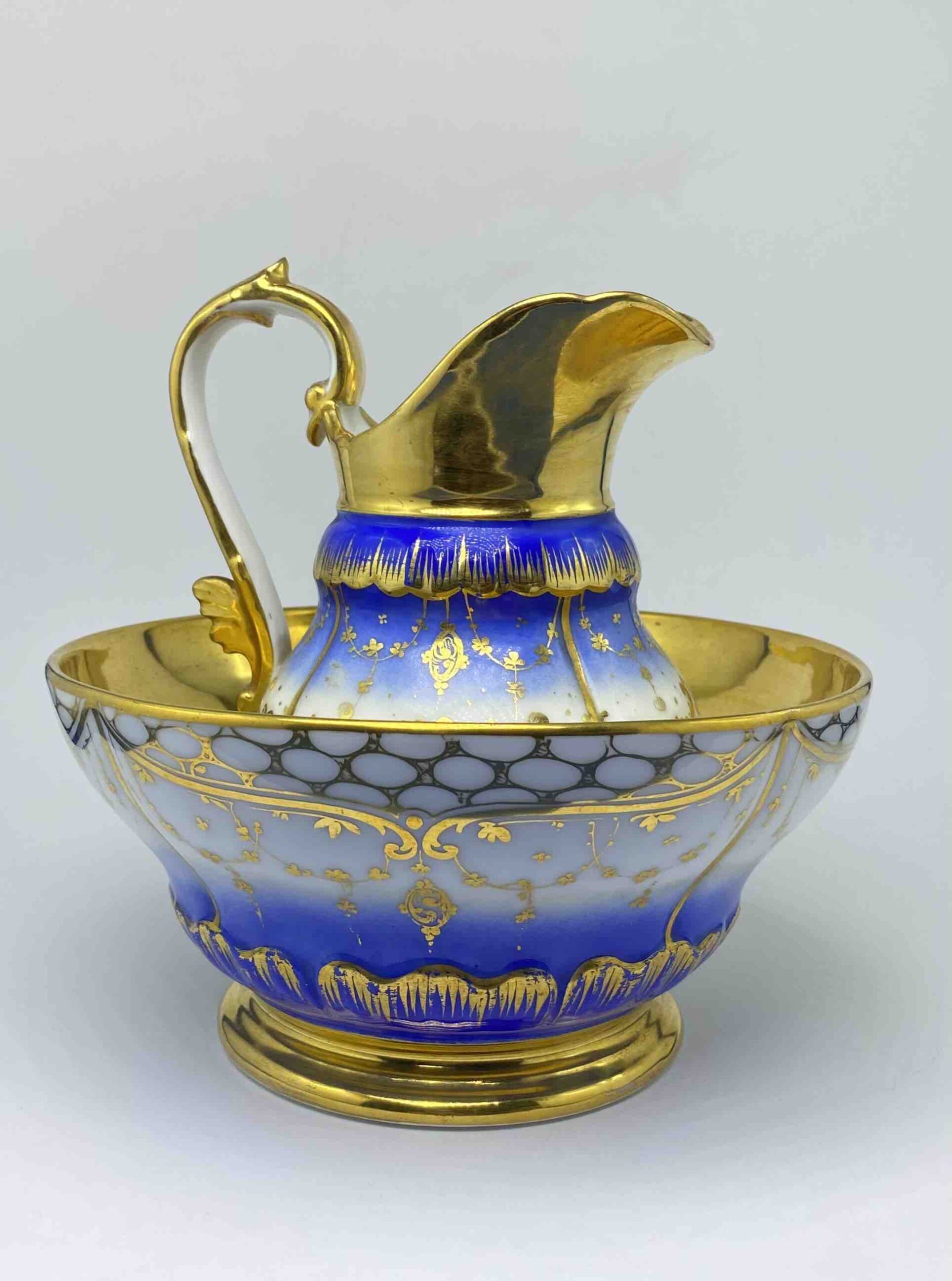 Wyjątkowo dekoracyjny komplet, składający się z dzbana oraz dopasowanej misy, stanowi doskonały przykład luksusowej porcelany francuskiej z XIX wieku. Zestaw wykonany z wysokogatunkowej, cienkościennej porcelany, bogato dekorowanej barwą kobaltu i złoceniami, reprezentuje estetykę francuskiego neorokoka, łącząc elegancję formy z mistrzowskim opracowaniem detalu.