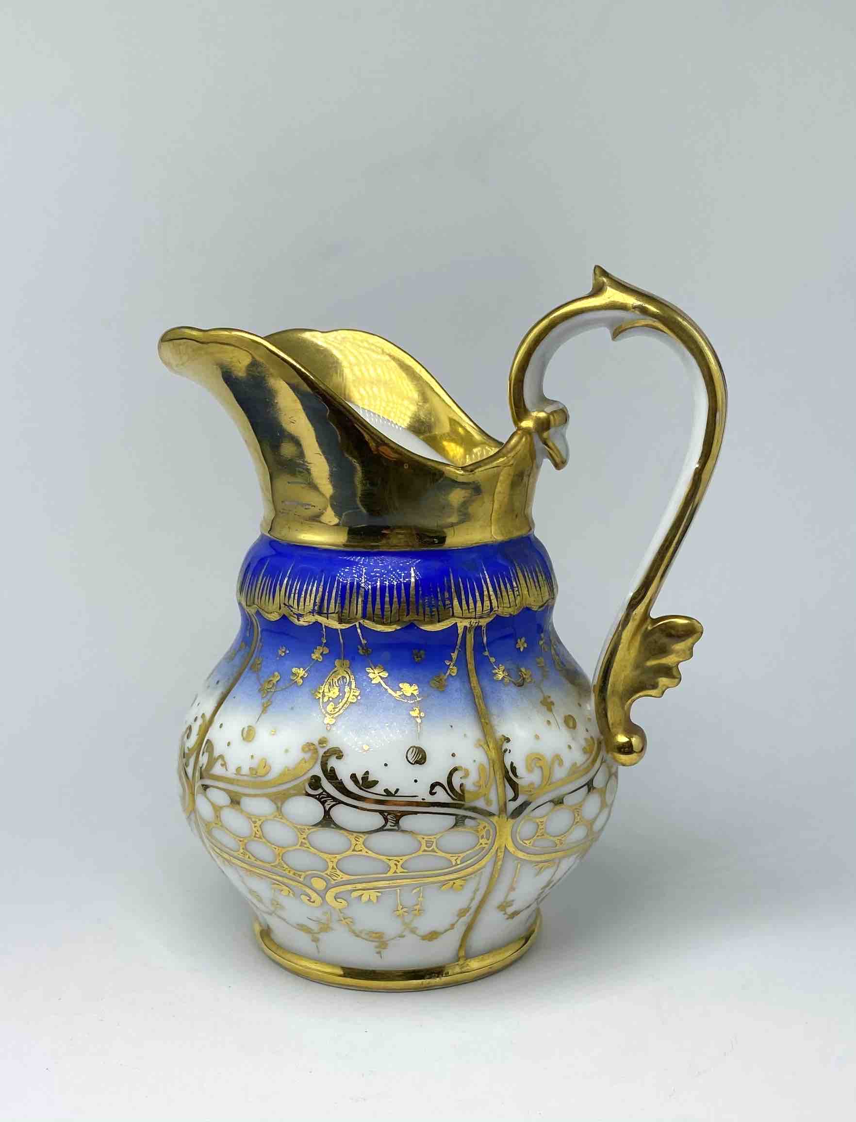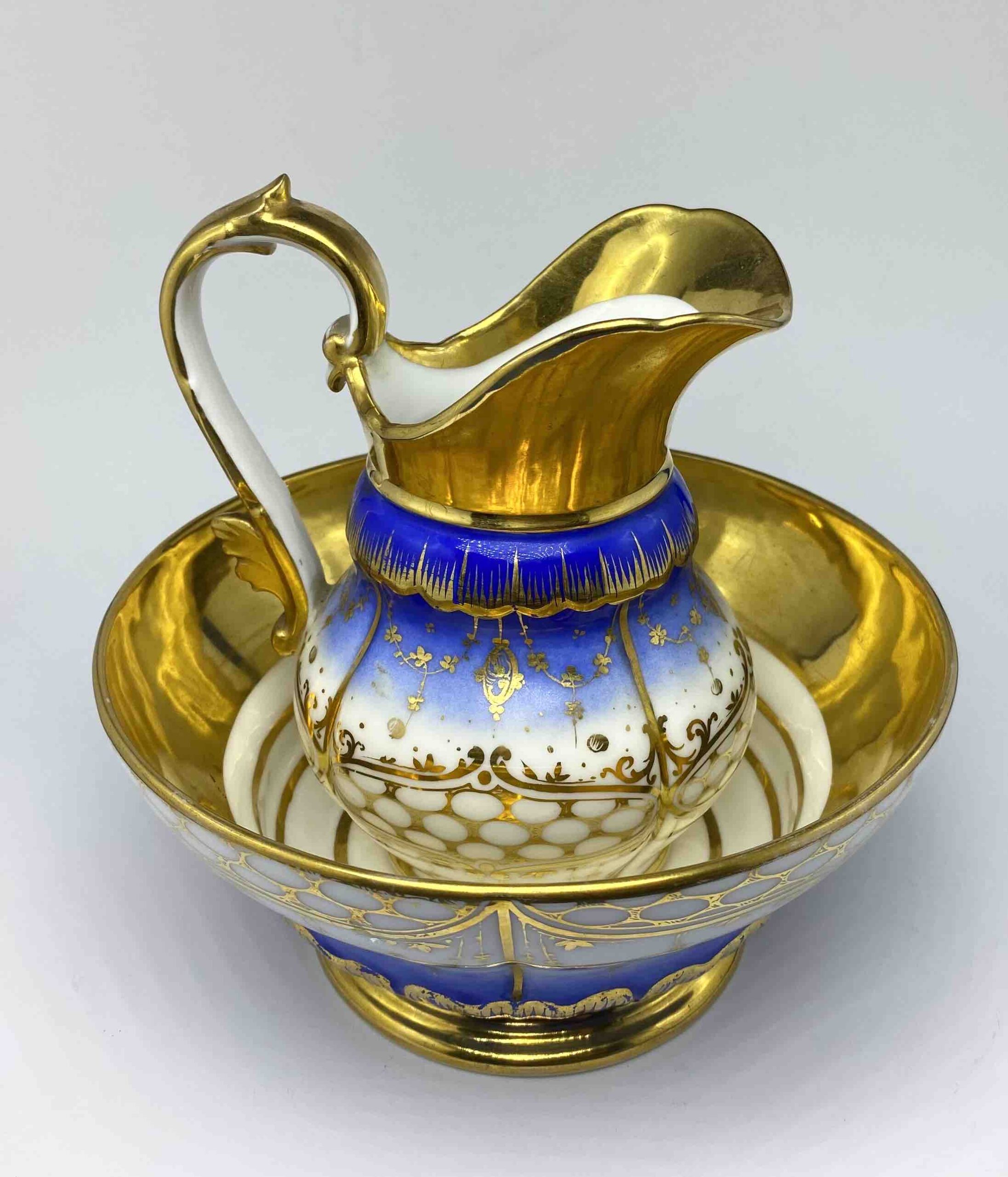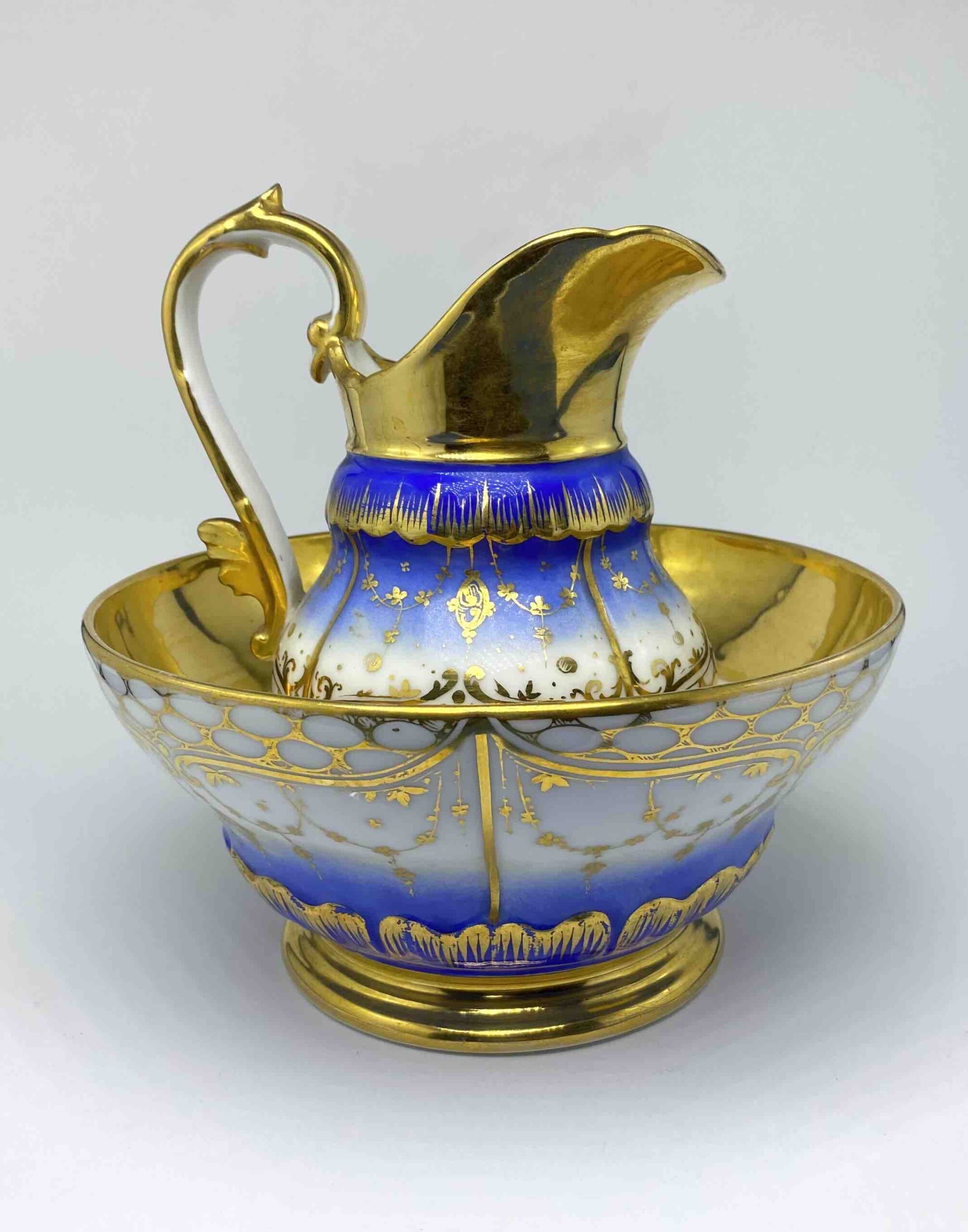 Wyjątkowo dekoracyjny komplet, składający się z dzbana oraz dopasowanej misy, stanowi doskonały przykład luksusowej porcelany francuskiej z XIX wieku. Zestaw wykonany z wysokogatunkowej, cienkościennej porcelany, bogato dekorowanej barwą kobaltu i złoceniami, reprezentuje estetykę francuskiego neorokoka, łącząc elegancję formy z mistrzowskim opracowaniem detalu.