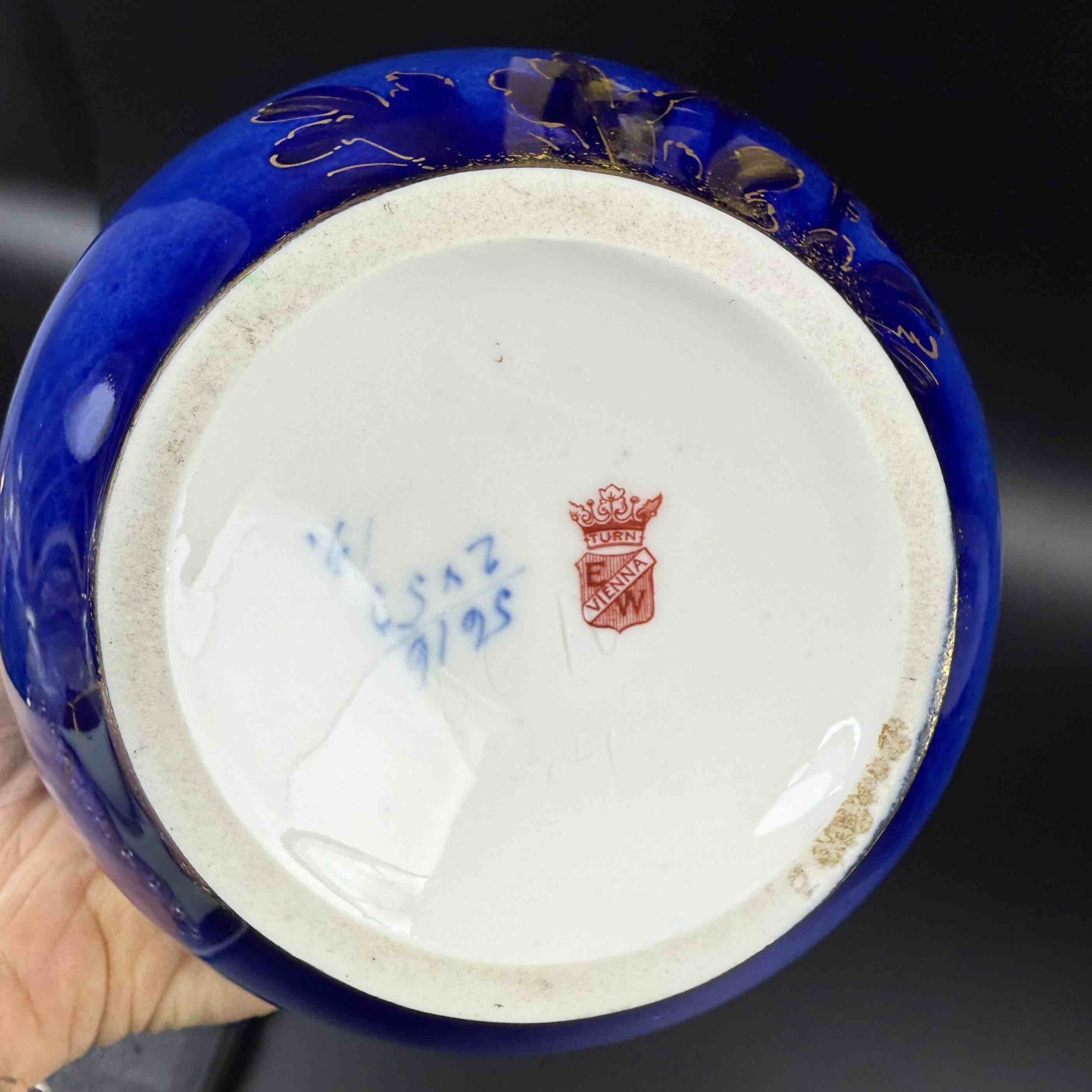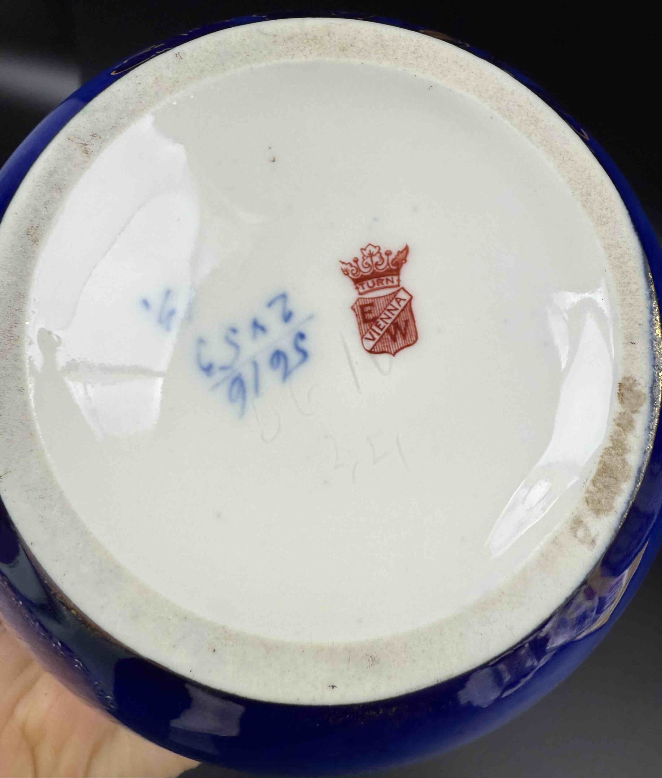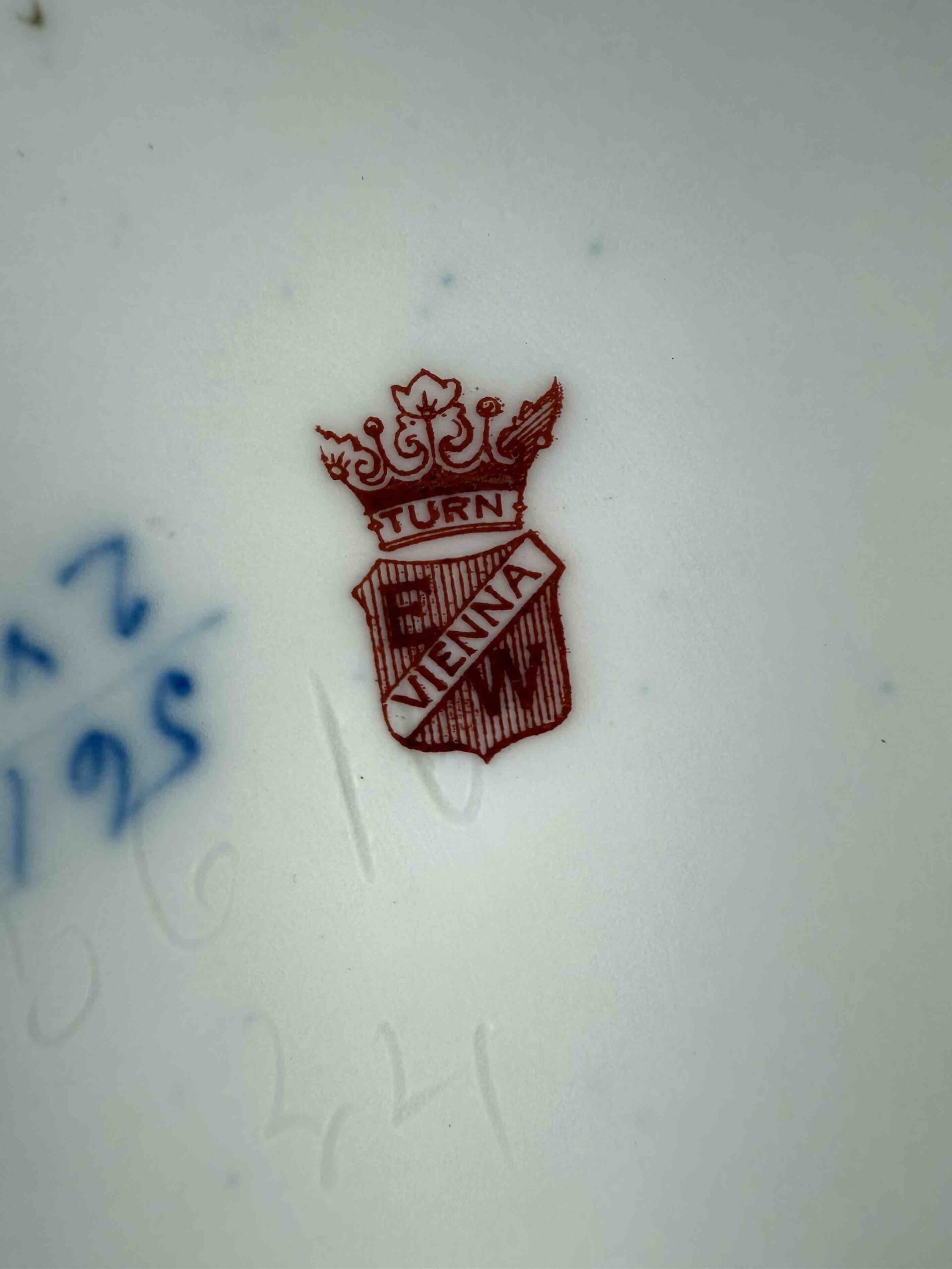 Na spodzie naczynia widnieje znak używany przez Turn-Teplitz / Royal Vienna-style manufaktury z Czech (okolice Teplic), wyrabiającej porcelit i porcelanę dekoracyjną inspirowaną wiedeńską szkołą.