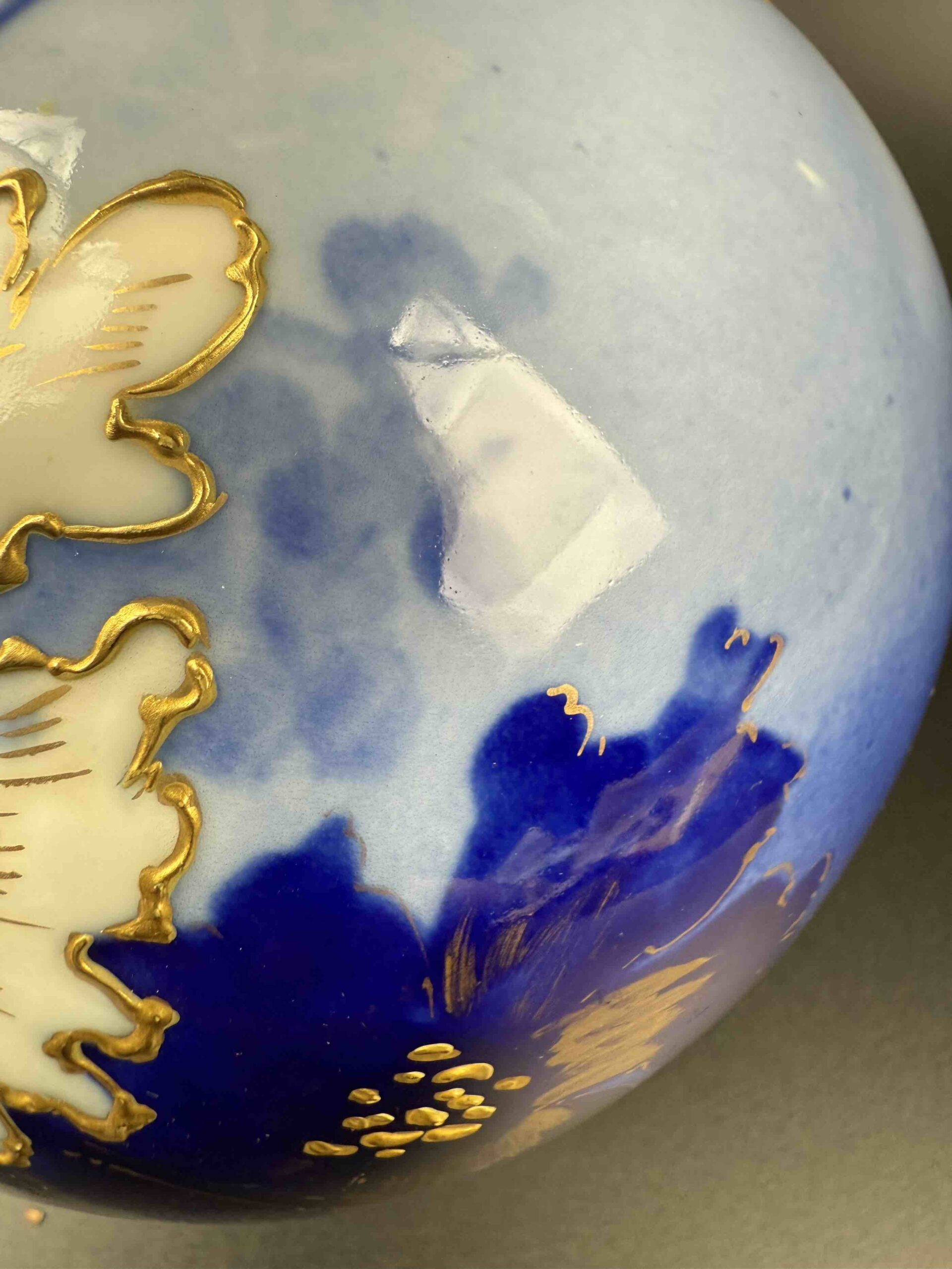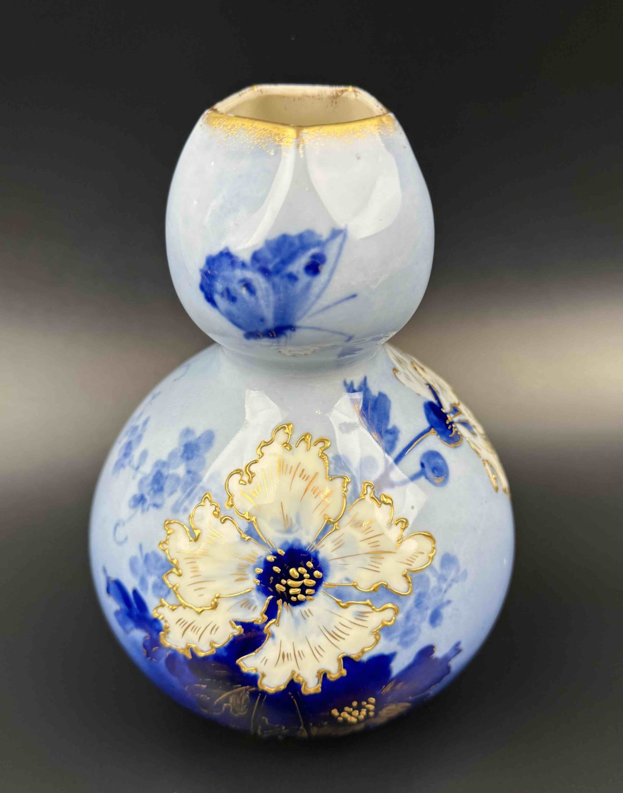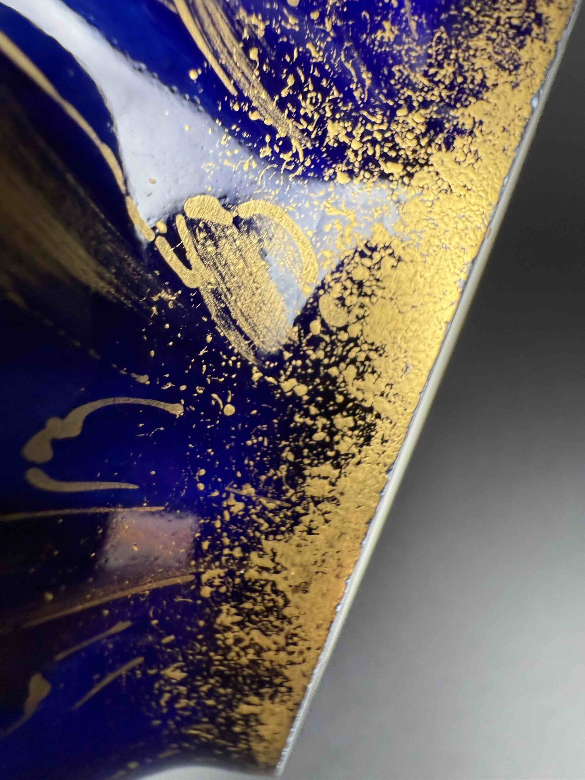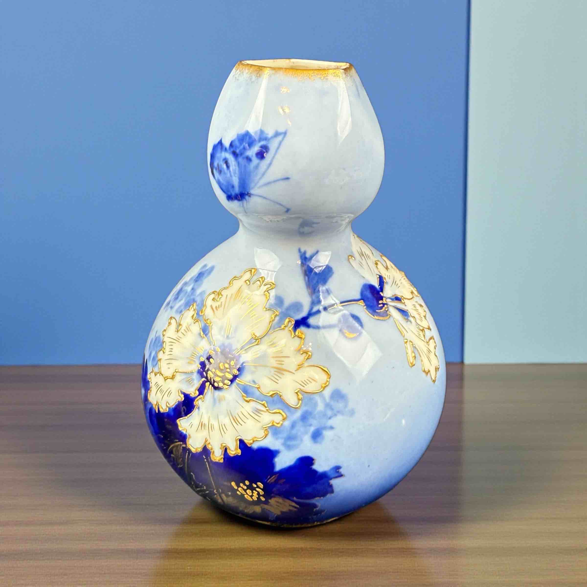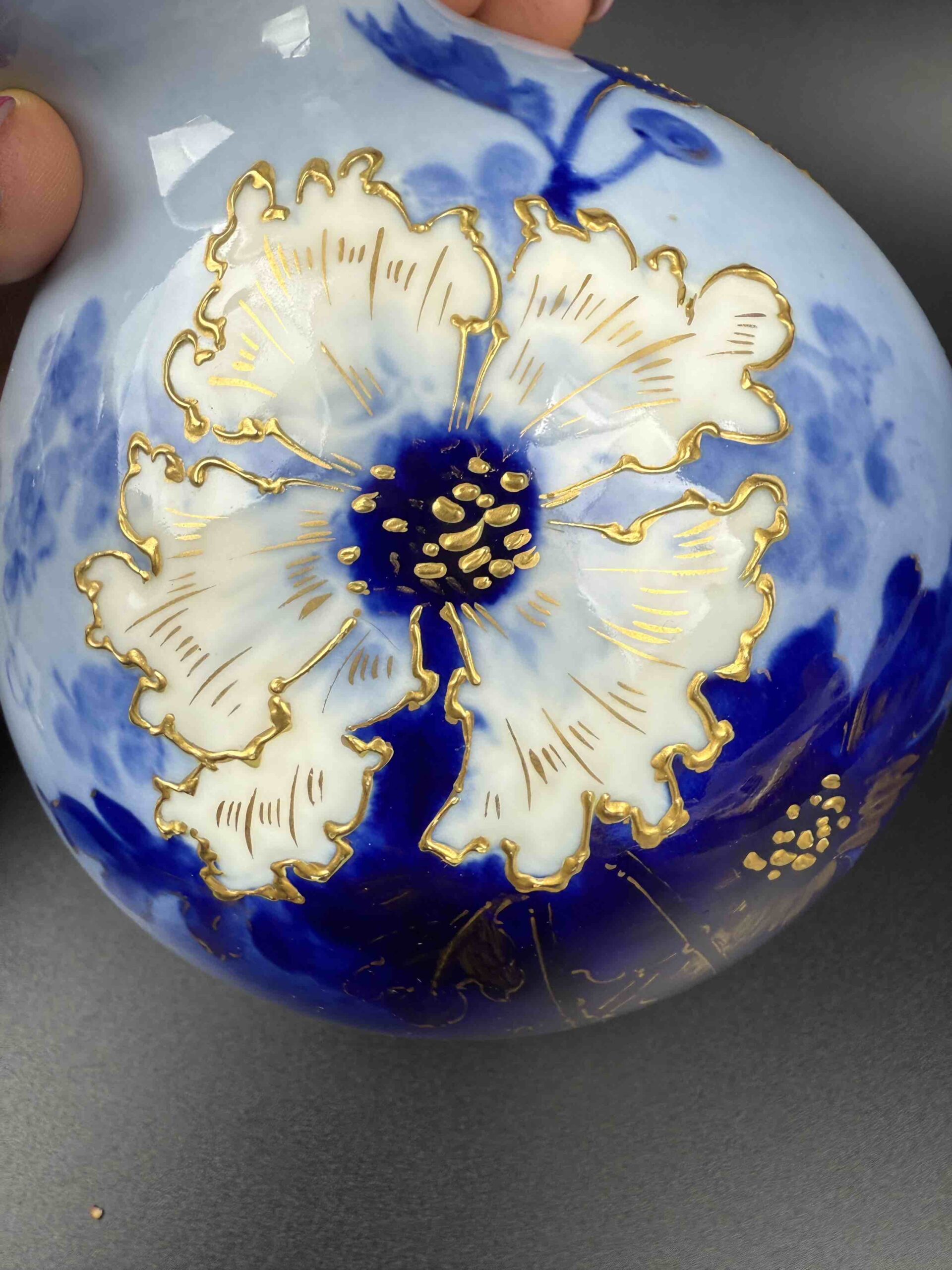 Wazon dekorowany jest w kobalcie i bieli z dodatkiem złota. Z