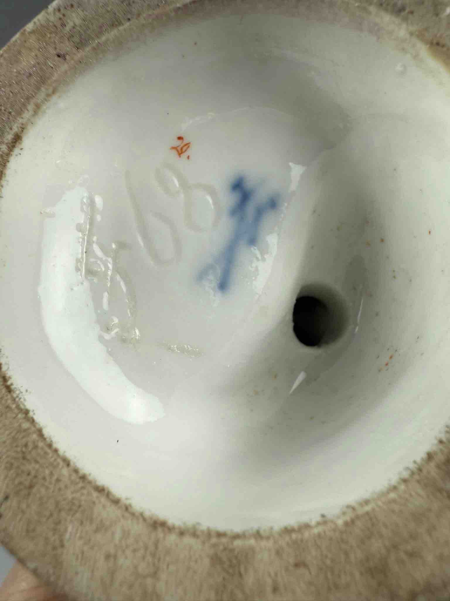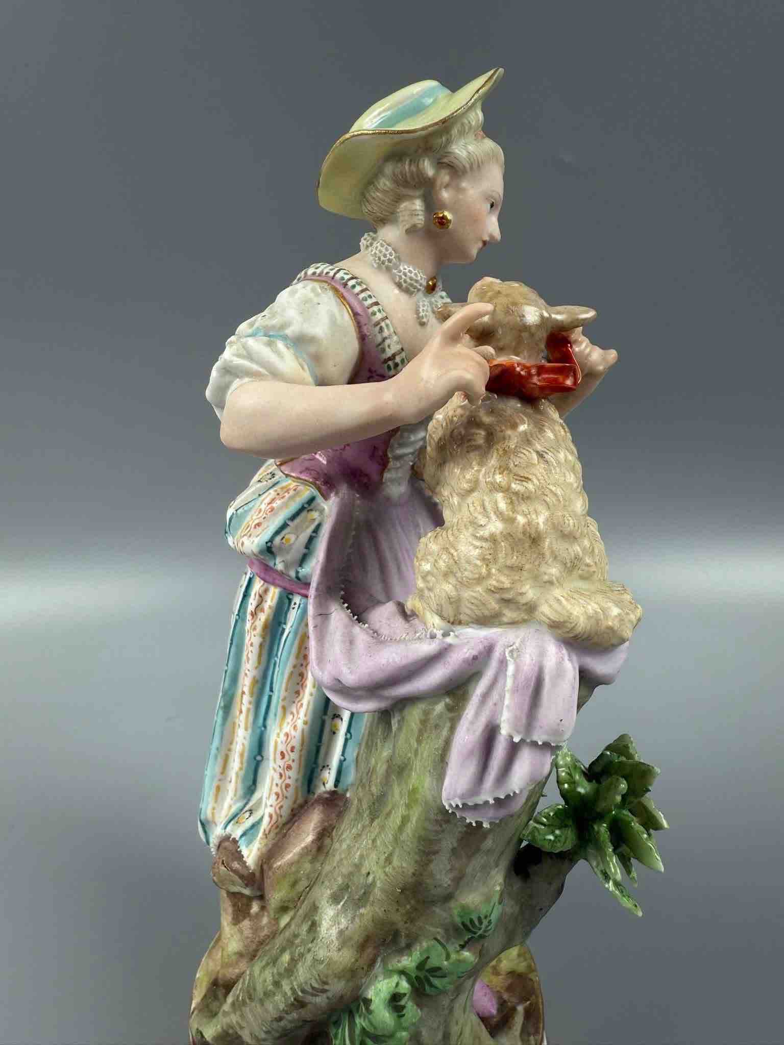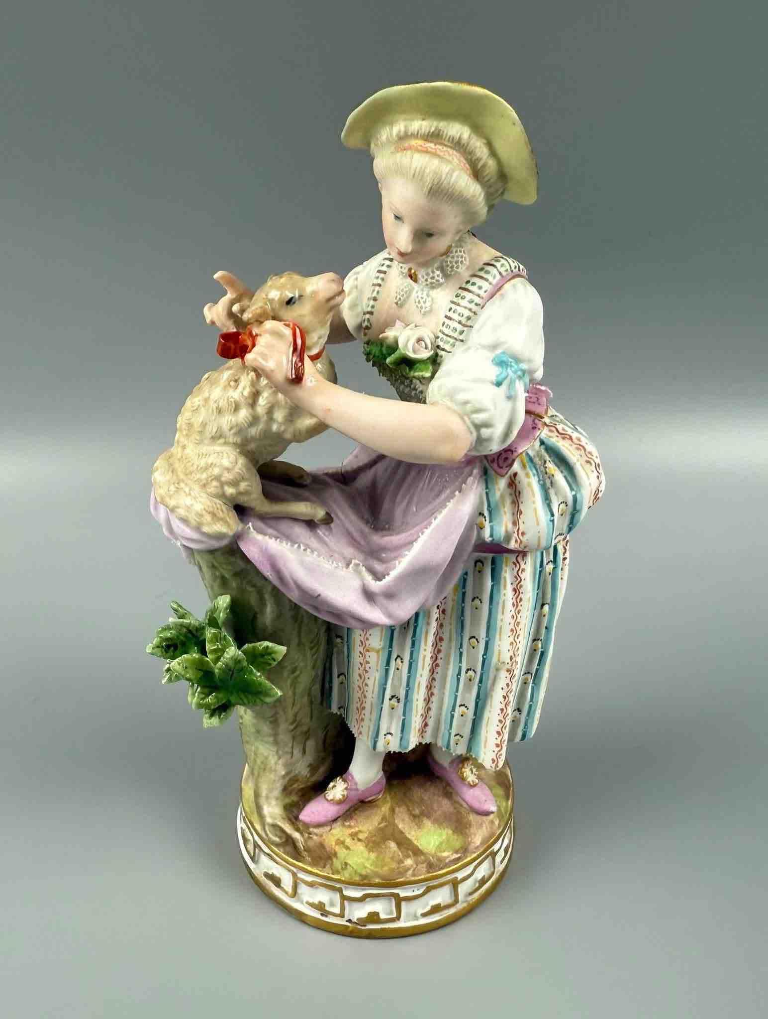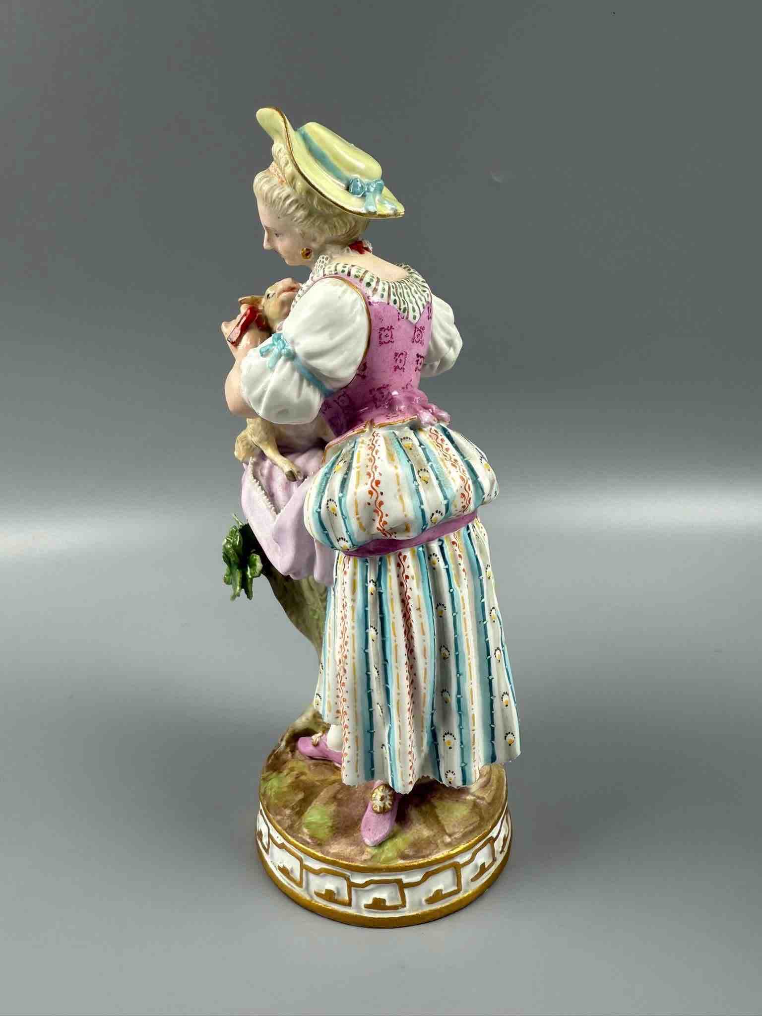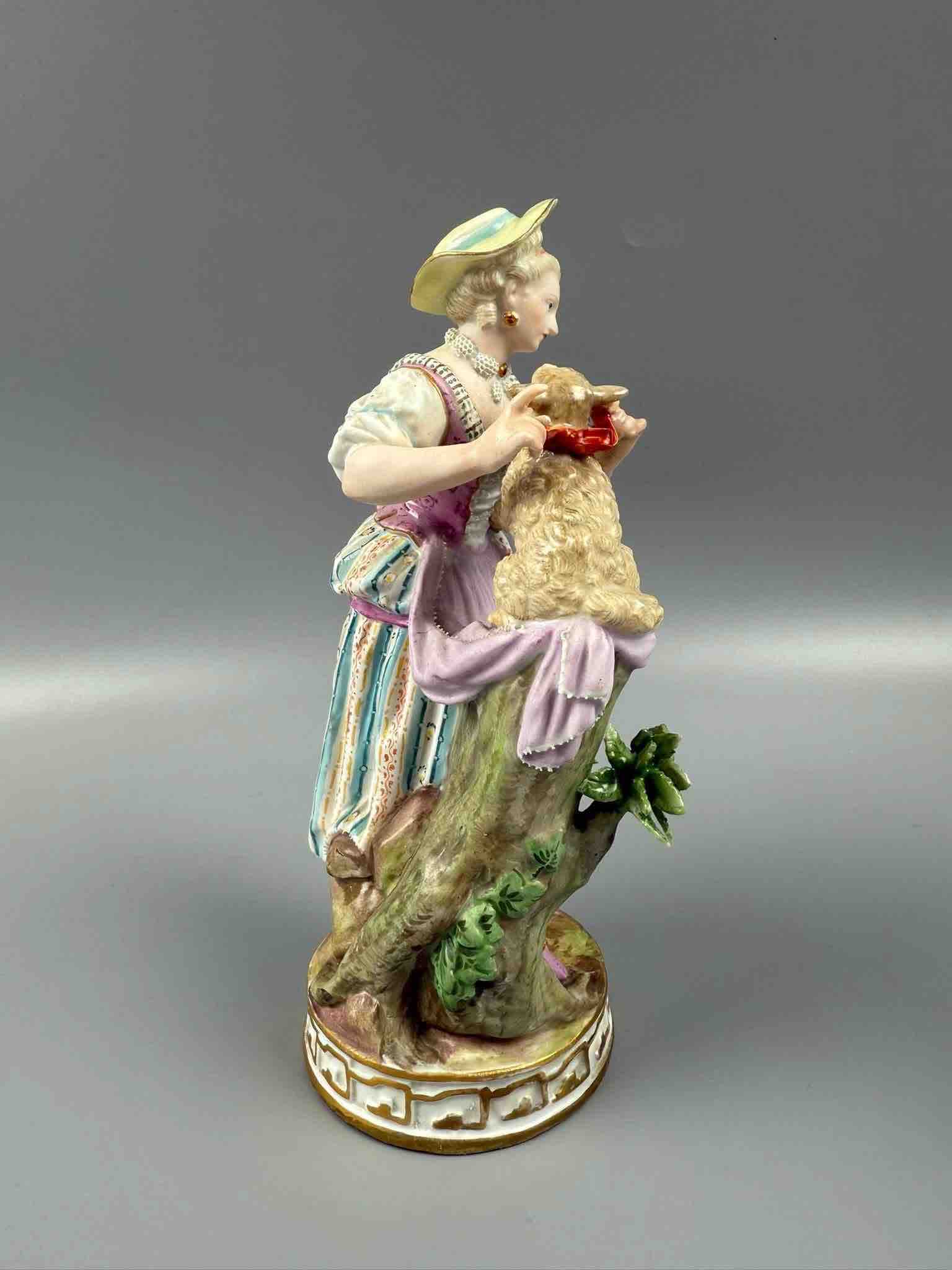 Pasterka w kapeluszu, z barankiem i koronkową lamówką, polichromowana, dekoracyjnie złocona, podstawa okrągła z reliefową lamówką meandrową.