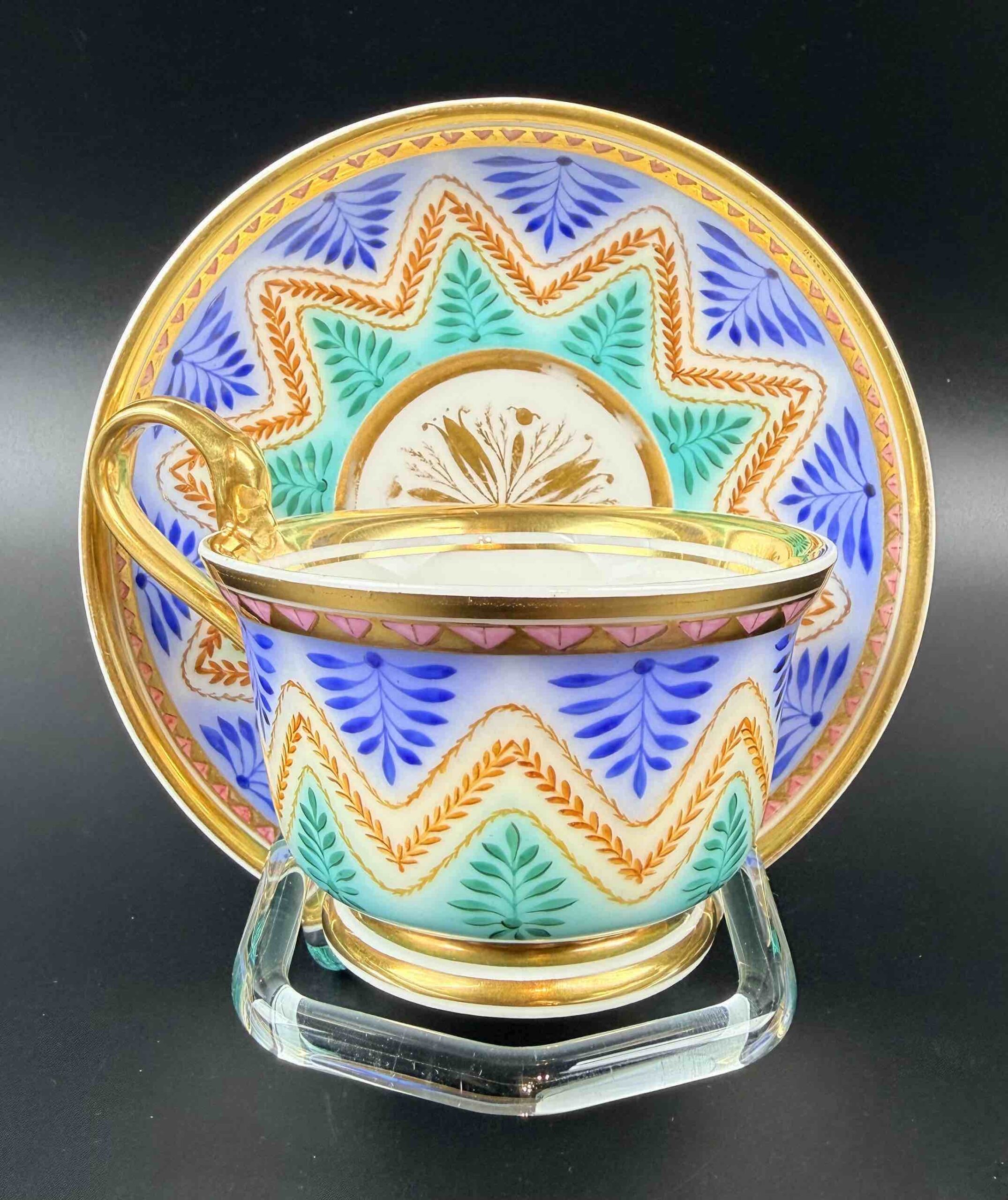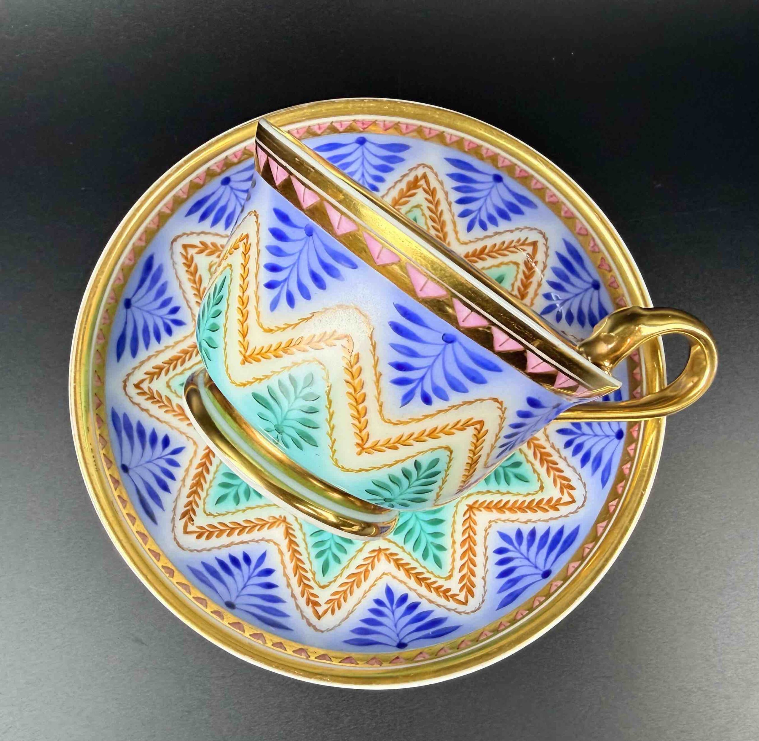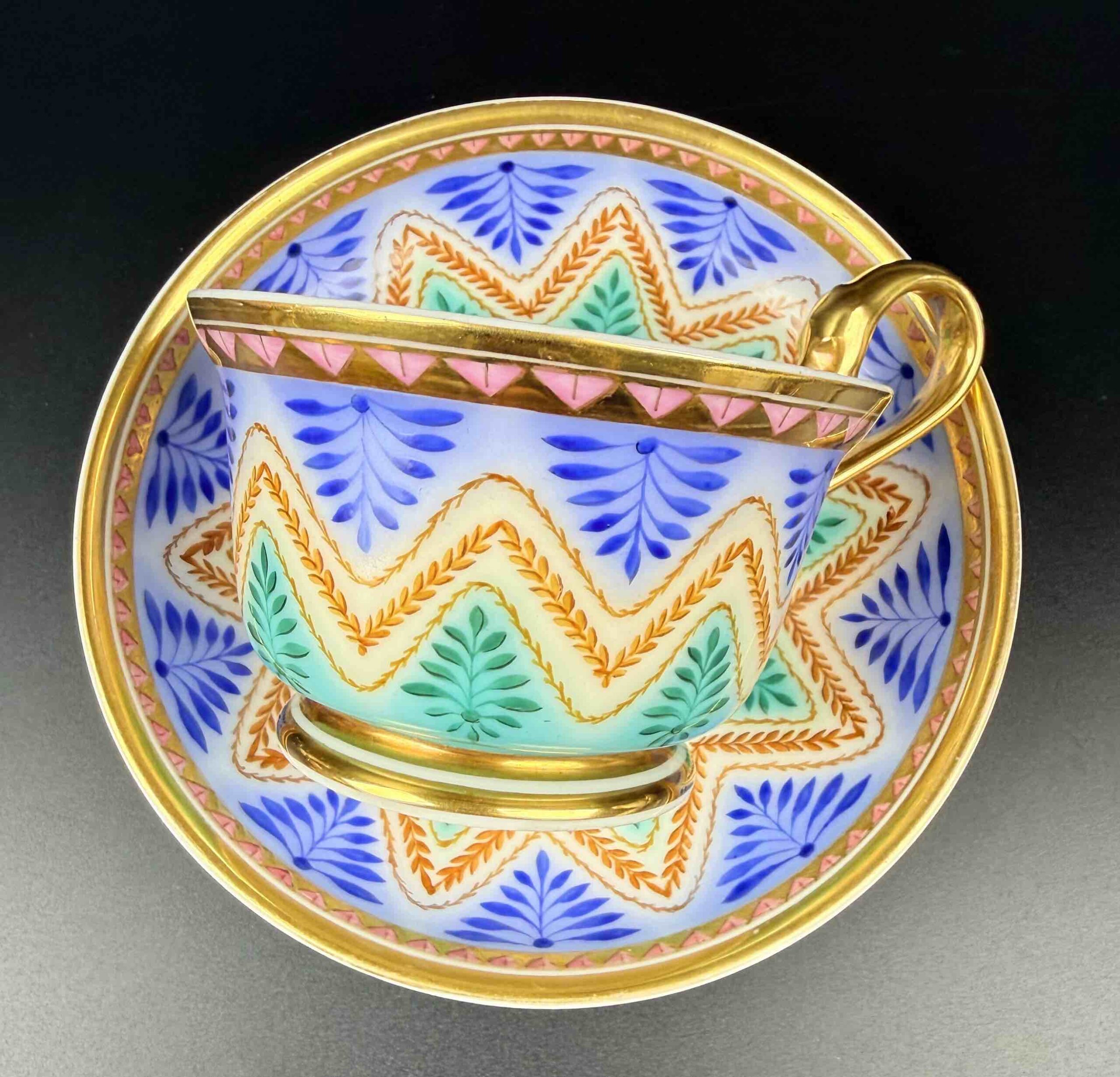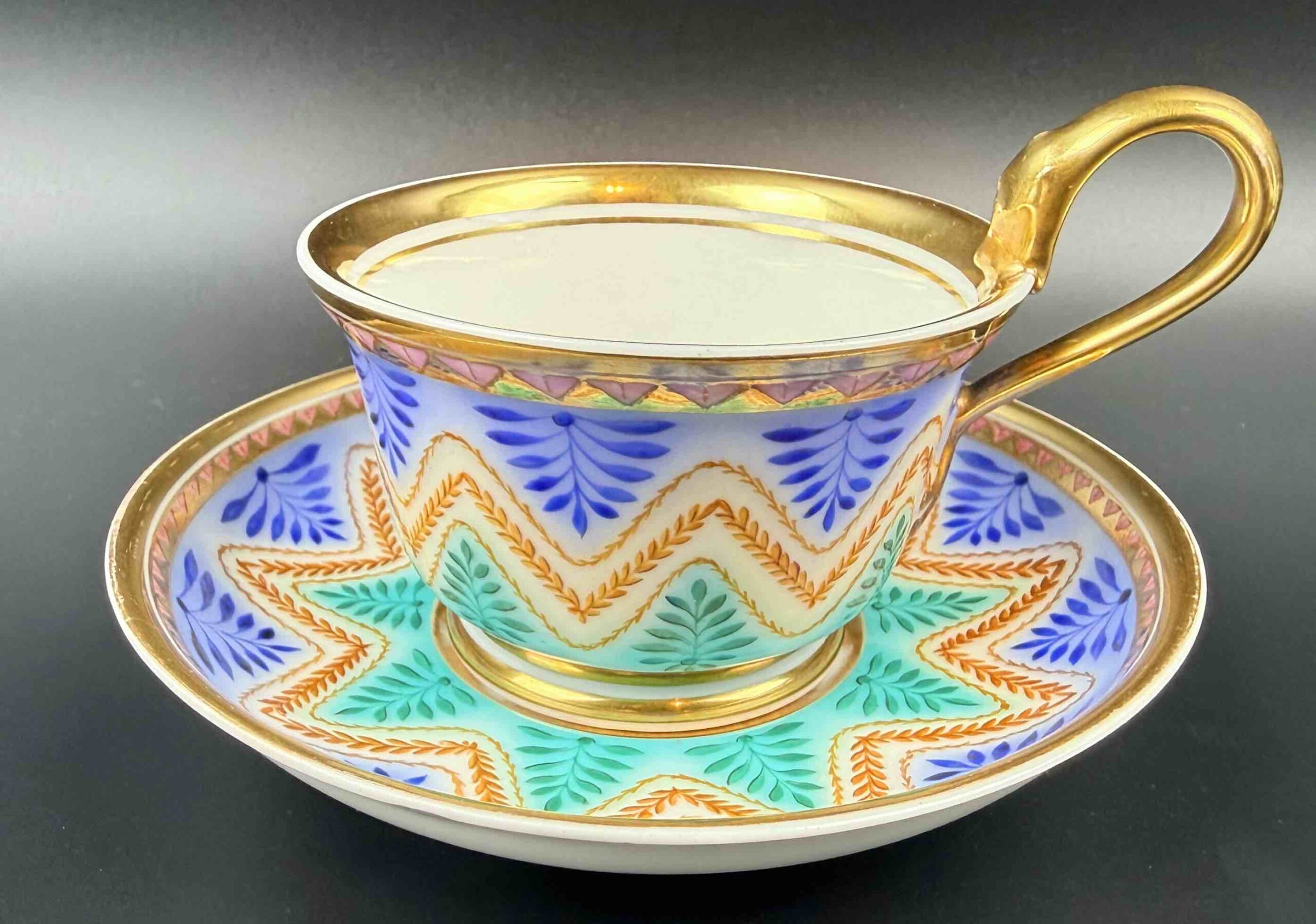 Subtelna porcelana zdobiona klasycznym ornamentem: rytmiczny, geometryczno-roślinny układ w odcieniach kobaltu, zieleni i pomarańczu, uzupełniony złoceniami. Całość tworzy charakterystyczną dla epoki kompozycję o dużej dekoracyjności, ale zachowanej elegancji.