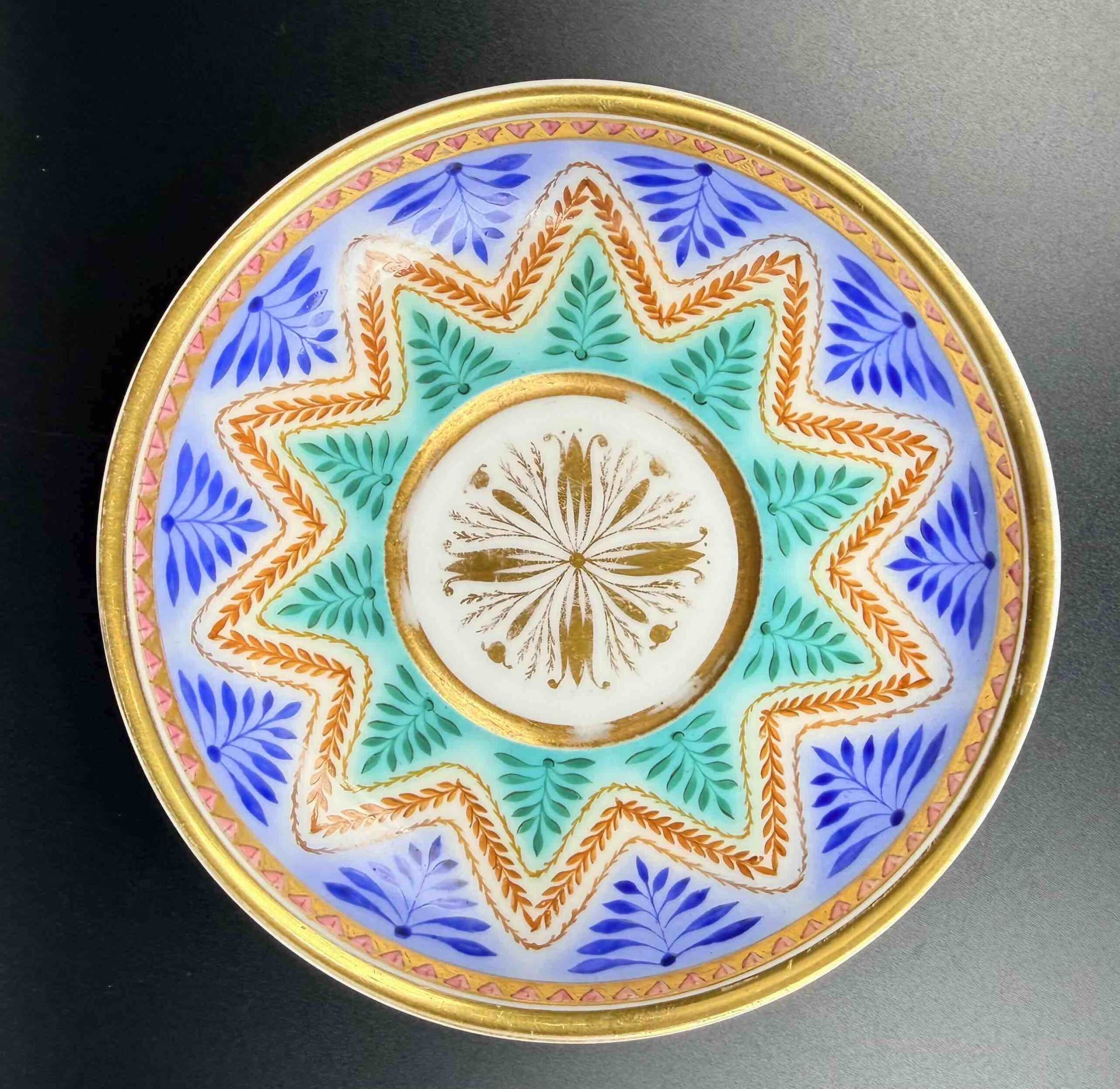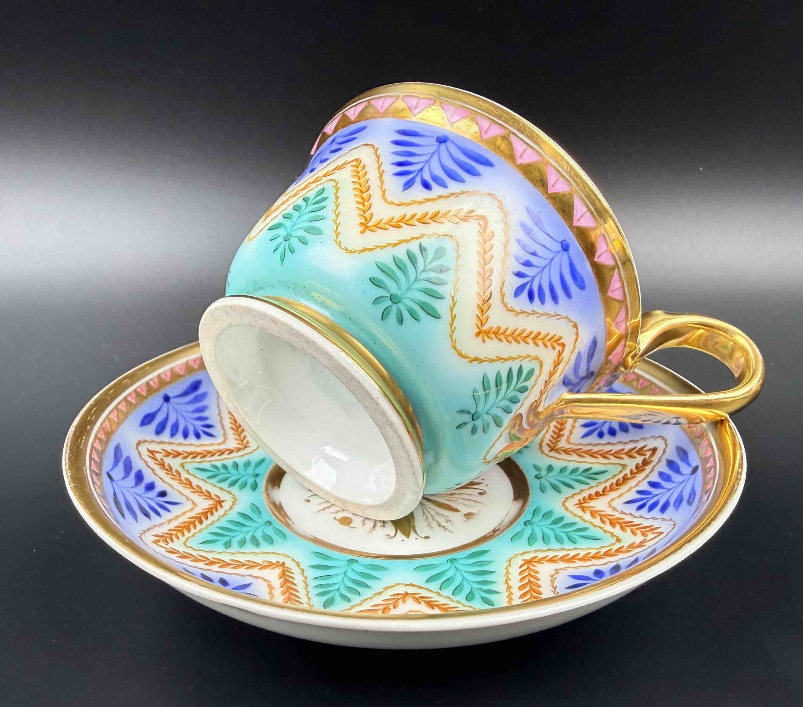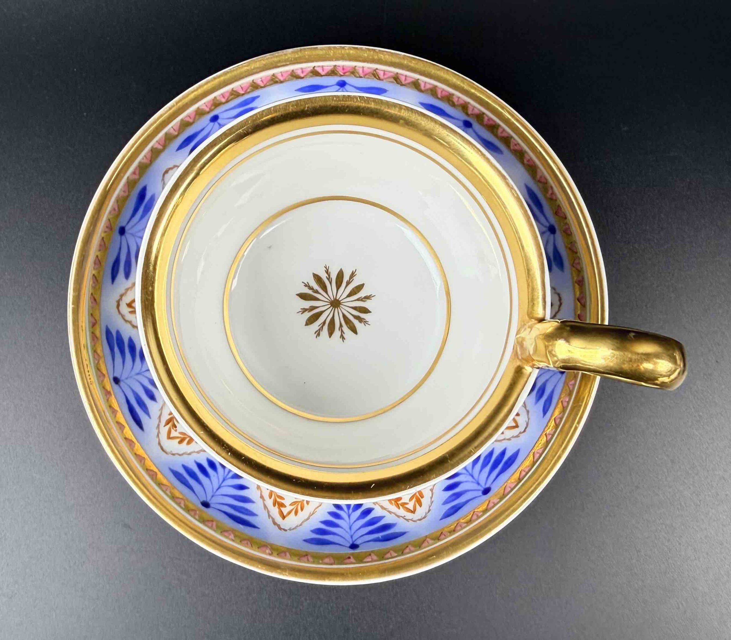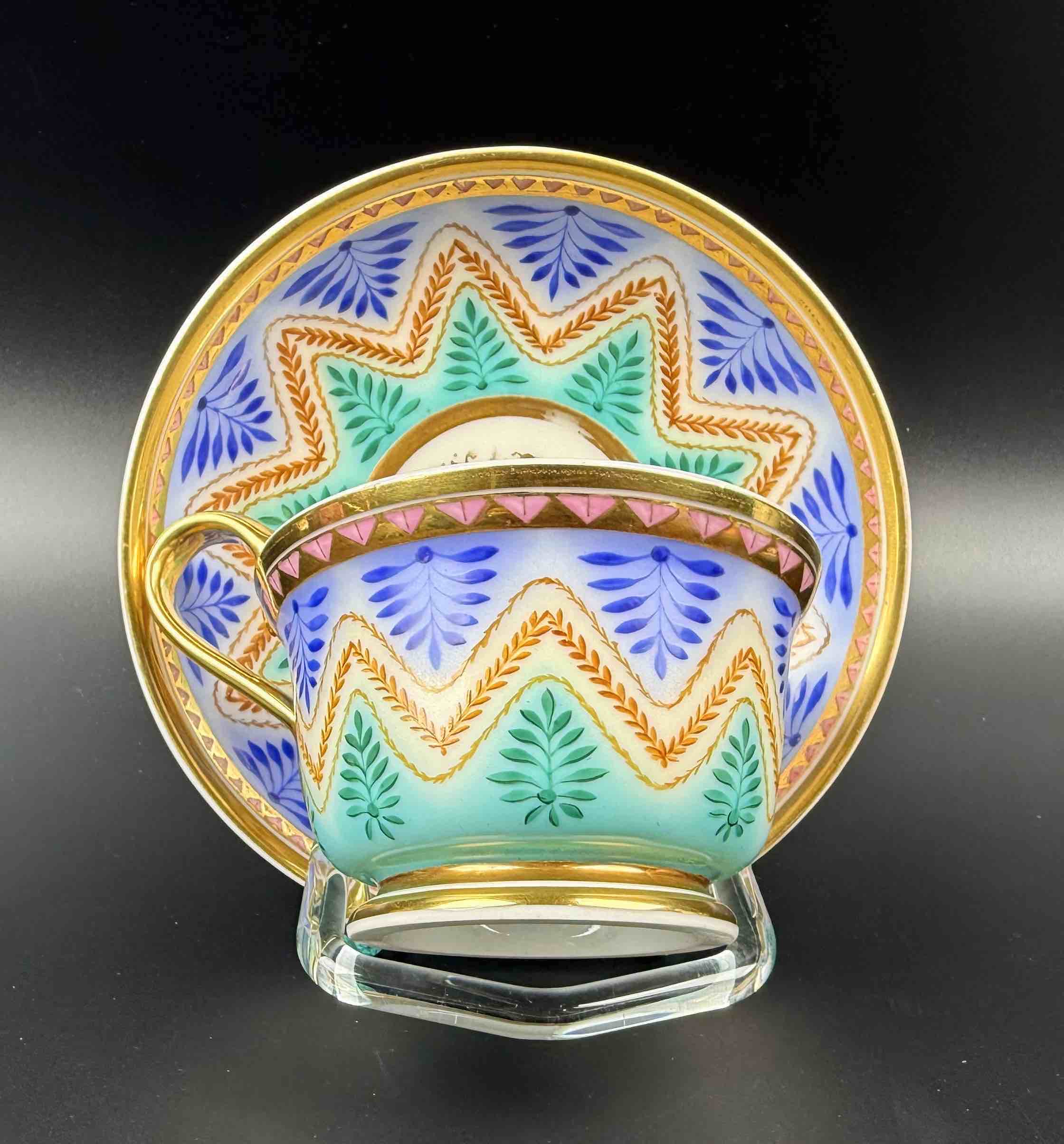 Subtelna porcelana zdobiona klasycznym ornamentem: rytmiczny, geometryczno-roślinny układ w odcieniach kobaltu, zieleni i pomarańczu, uzupełniony złoceniami. Całość tworzy charakterystyczną dla epoki kompozycję o dużej dekoracyjności, ale zachowanej elegancji.
