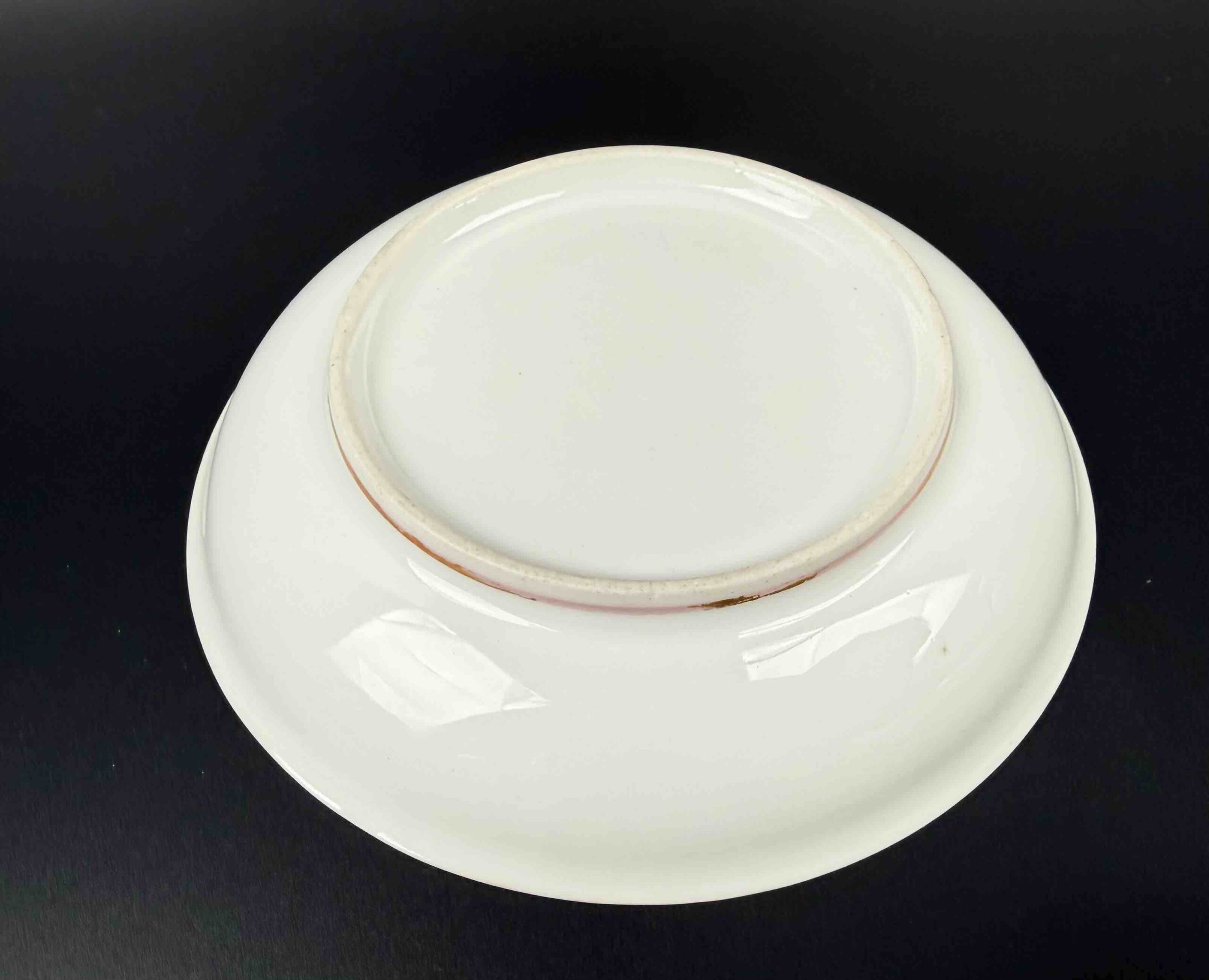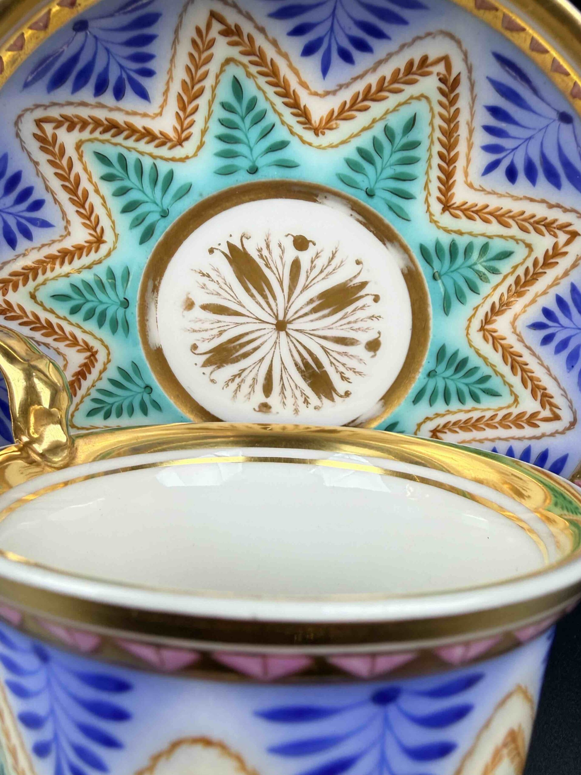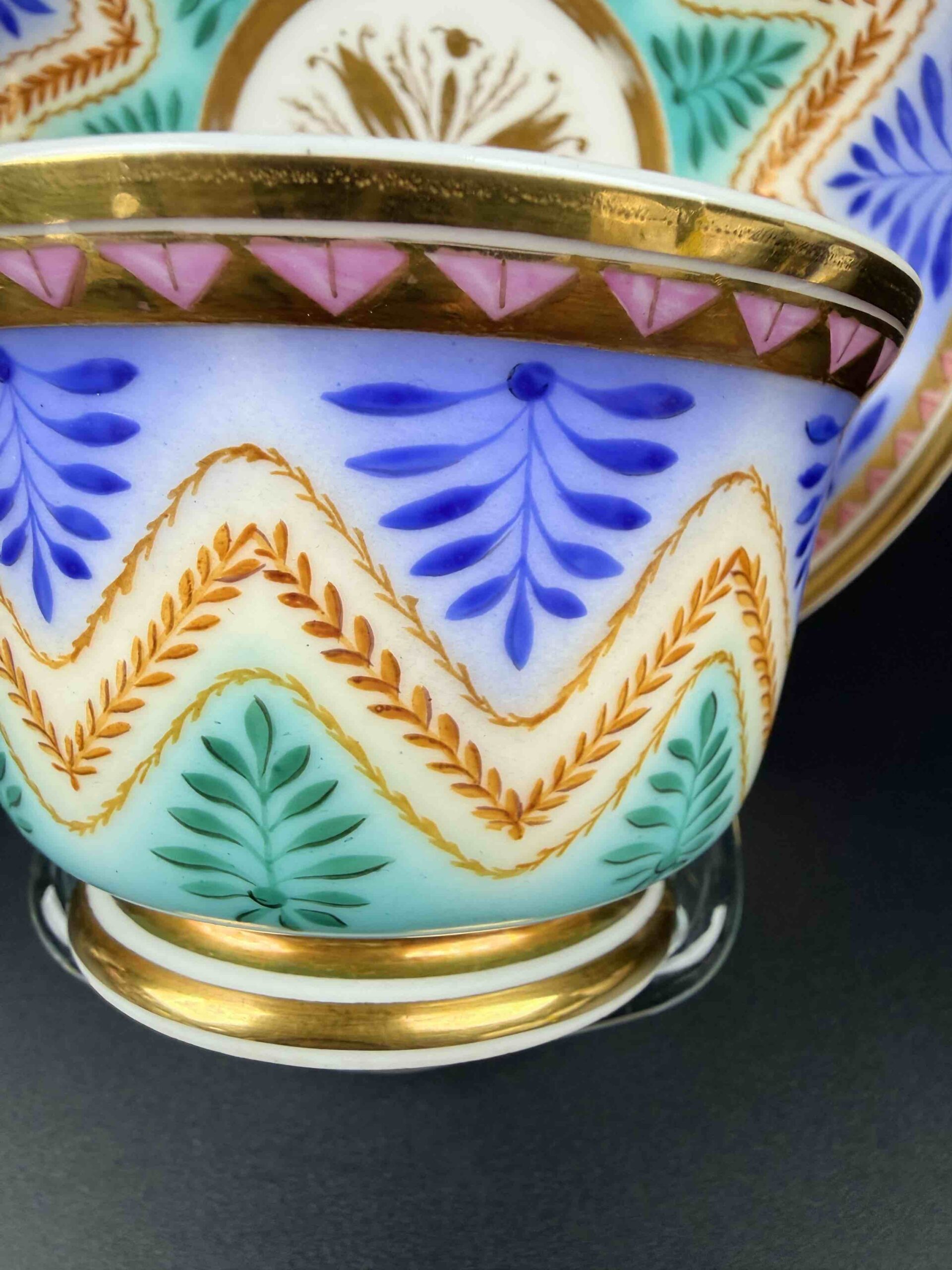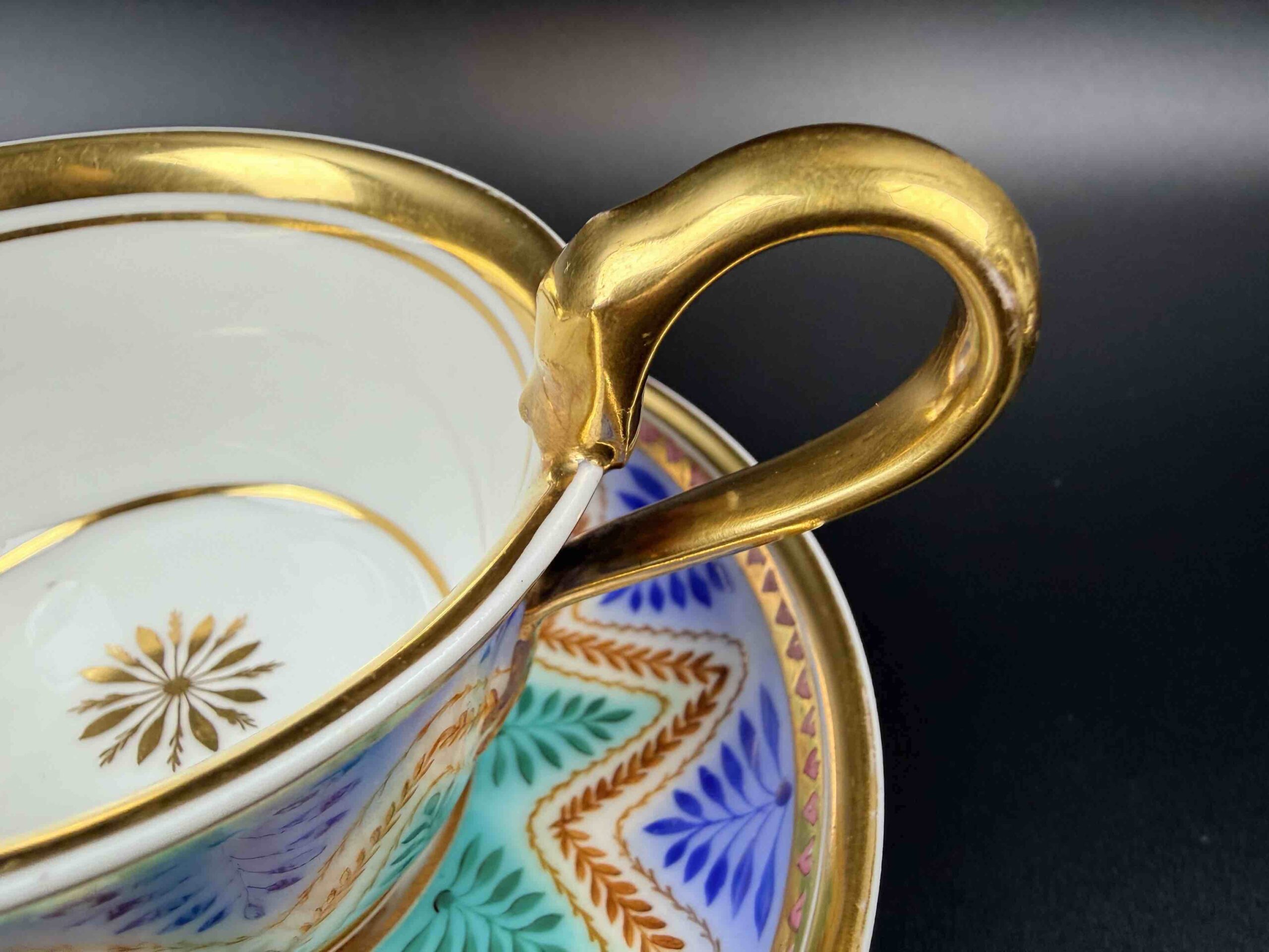 Subtelna porcelana zdobiona klasycznym ornamentem: rytmiczny, geometryczno-roślinny układ w odcieniach kobaltu, zieleni i pomarańczu, uzupełniony złoceniami. Całość tworzy charakterystyczną dla epoki kompozycję o dużej dekoracyjności, ale zachowanej elegancji.