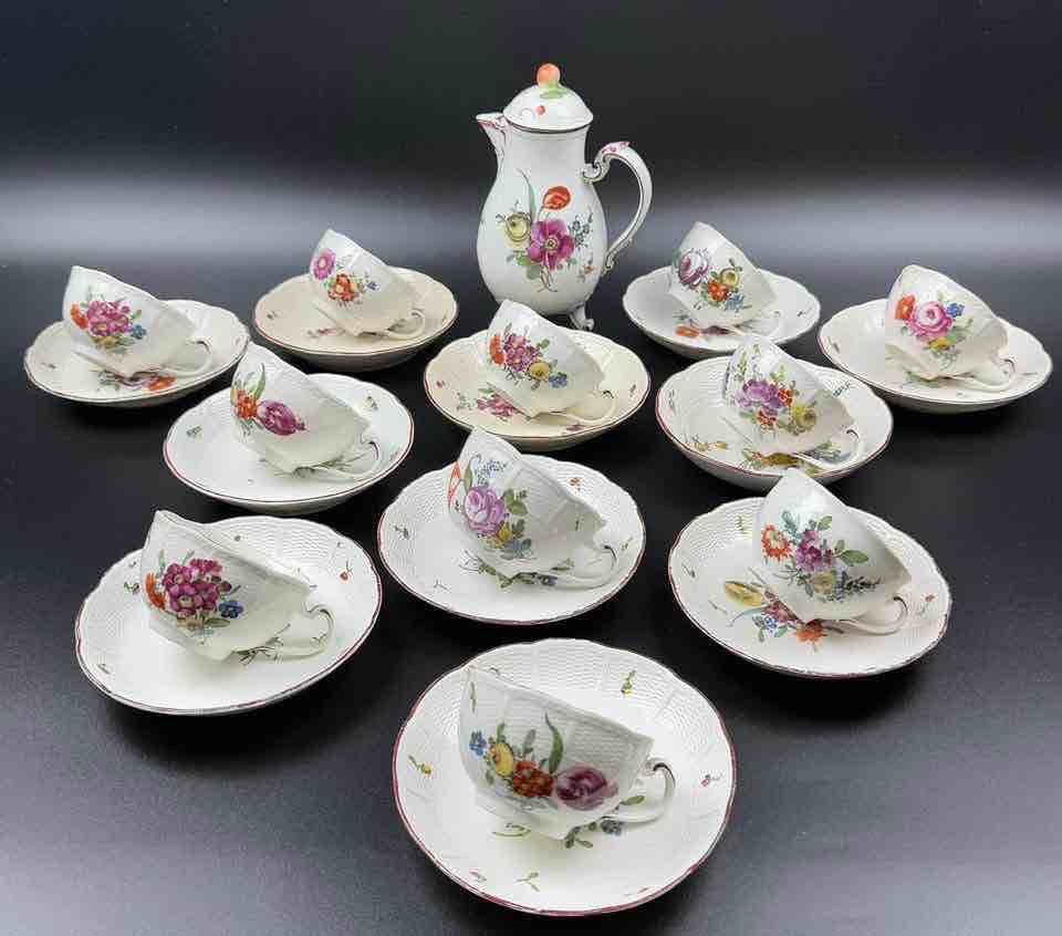 Porcelana przyozdobiona reliefem plecionki koszykowej „Alt Ozier”, ranty naczyń ozdobiono bordową farbą. Malatura wielobarwna naszkliwna, motywy niesymetrycznych bukietów kwiatów ciętych oraz drobne gałązki pojedynczych kwiatów. Dzbanek na trzech nóżkach bez reliefu o gładkich ściankach. Dekielek dzbanka posiada plastyczny uchwyt w kształcie owocu i gałązki z liśćmi.