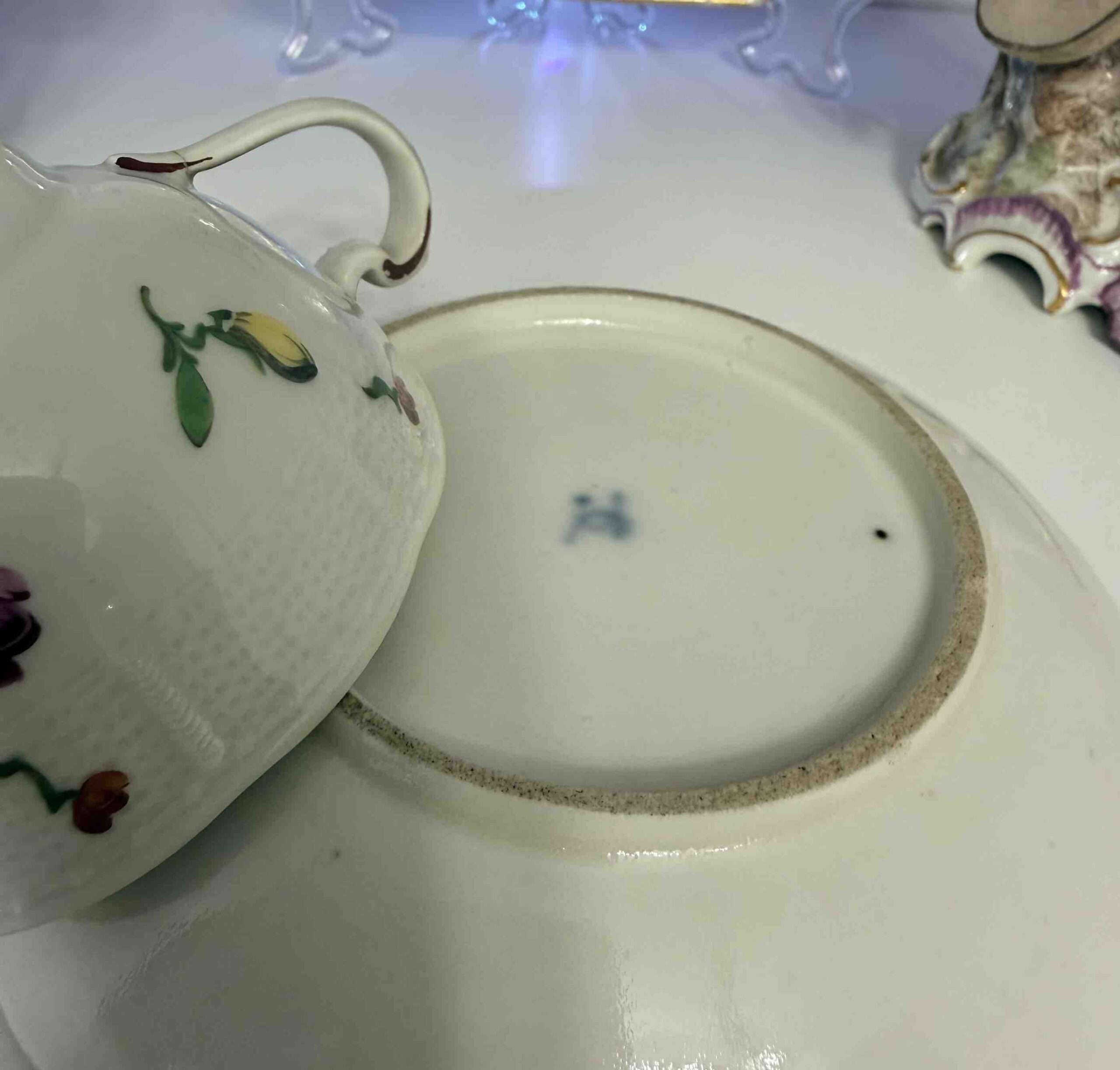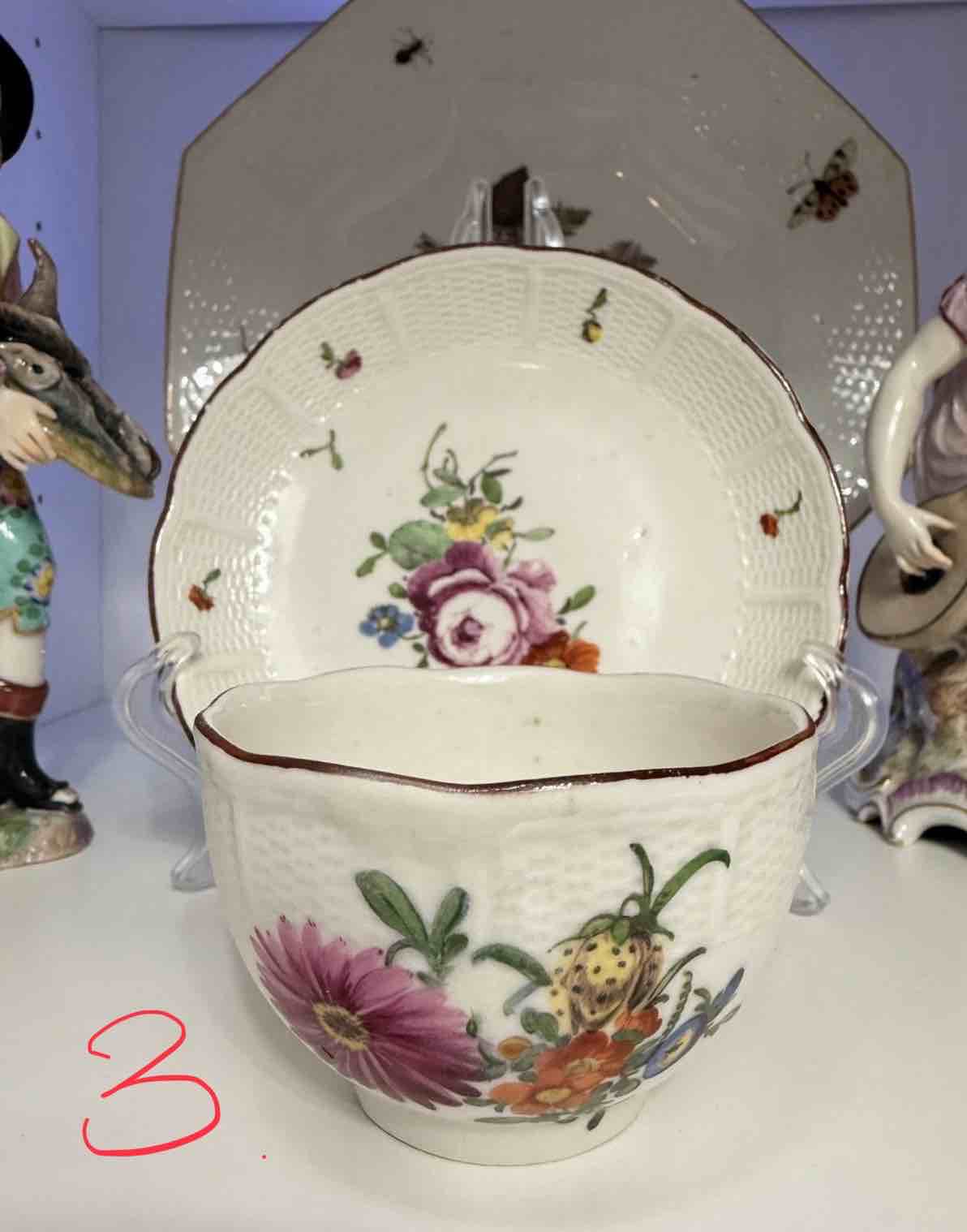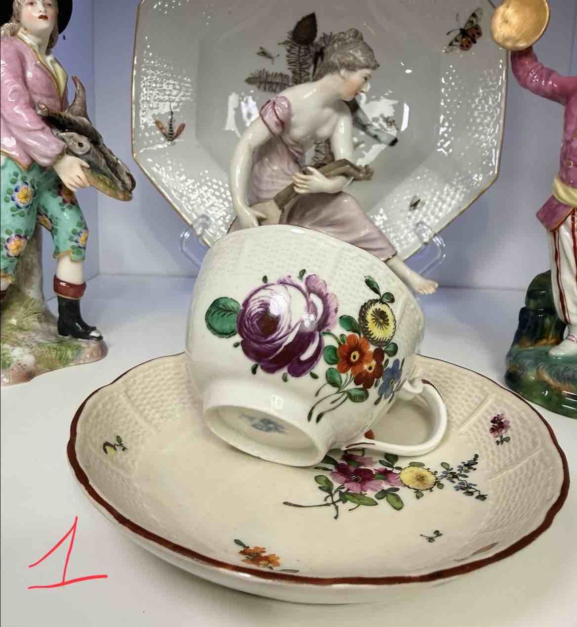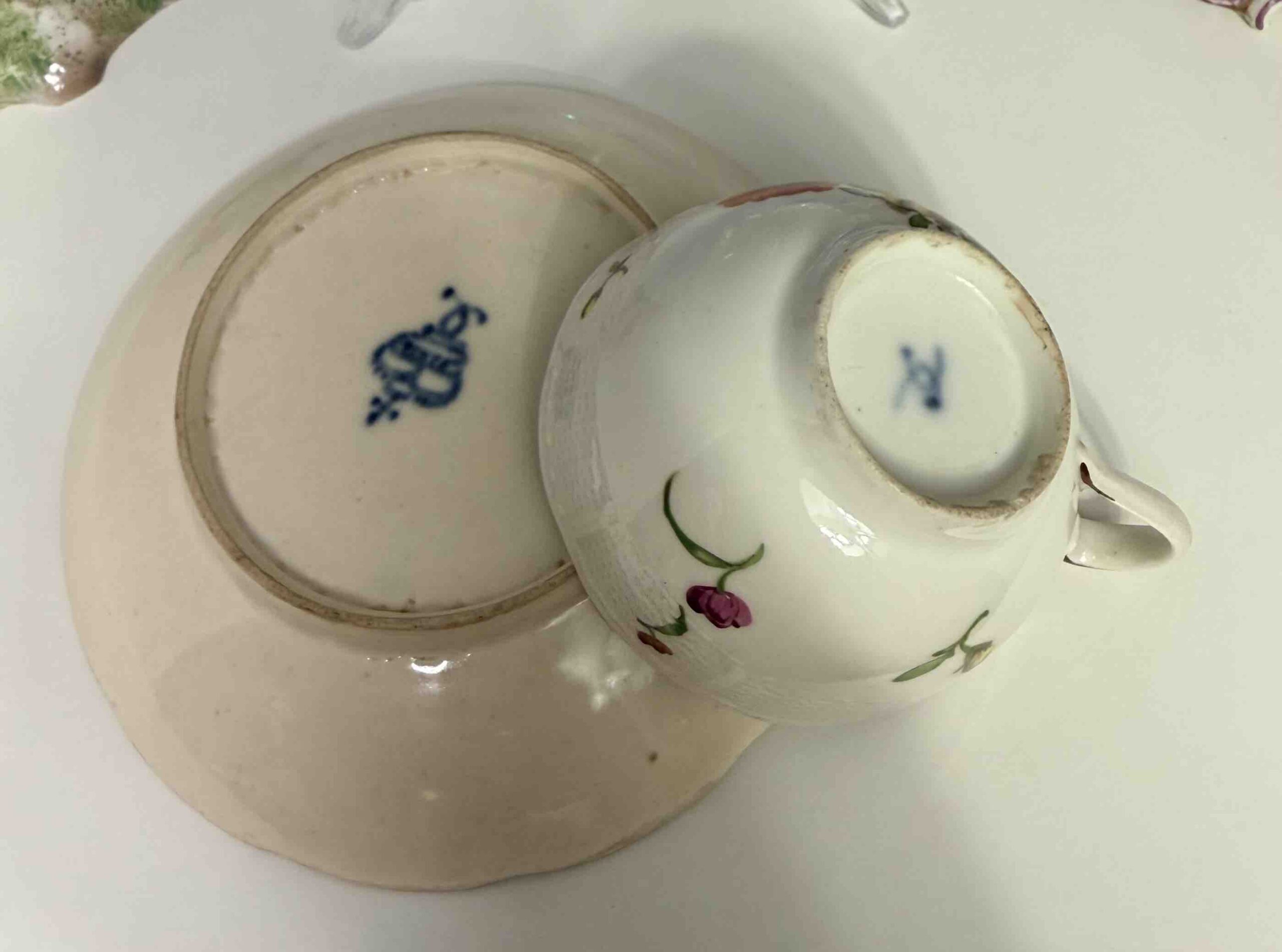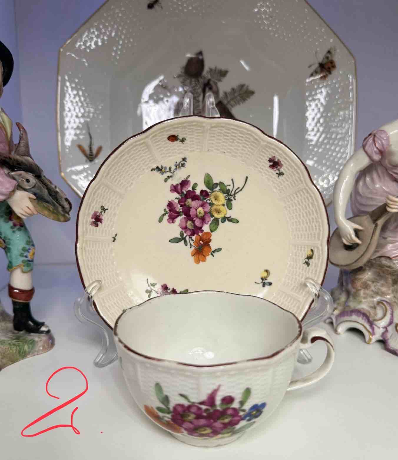 Spodeczki i filiżanki czasem gubią symetrię formy, posiadają drobne skazy i szary odcień porcelany. Szarawa masa porcelanowa z drobnymi skazami szkliwa, zgaszona tonacja barw, brak symetrii charakterystyczne są dla wyrobów Ludwigsburg z XVIII w. choć nie są regułą. Na uwagę zasługuje prezentowany przykład kompletu filiżanki i spodka wykonanych w podobnym przedziale czasowym, na którym wyraźnie dostrzec można różnicę odcieniu porcelany.