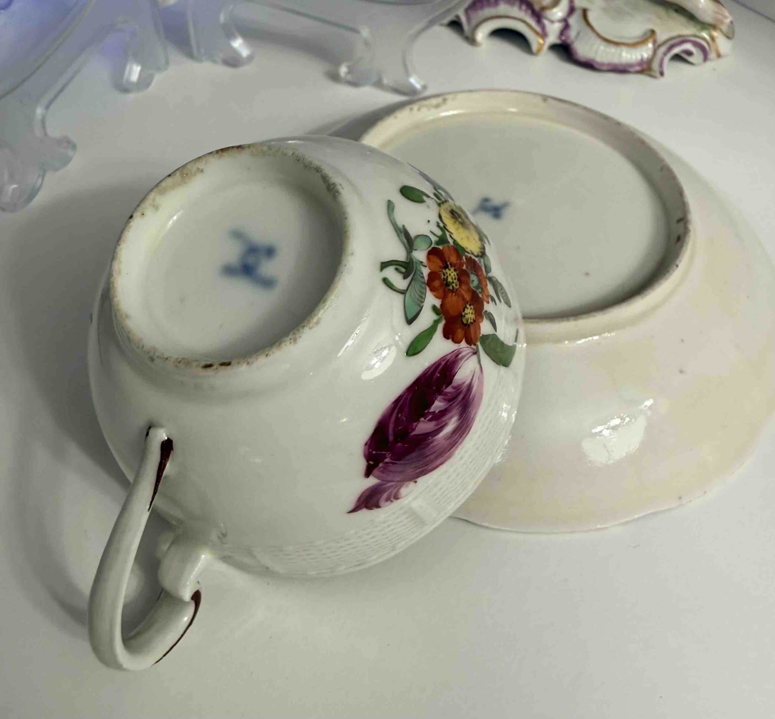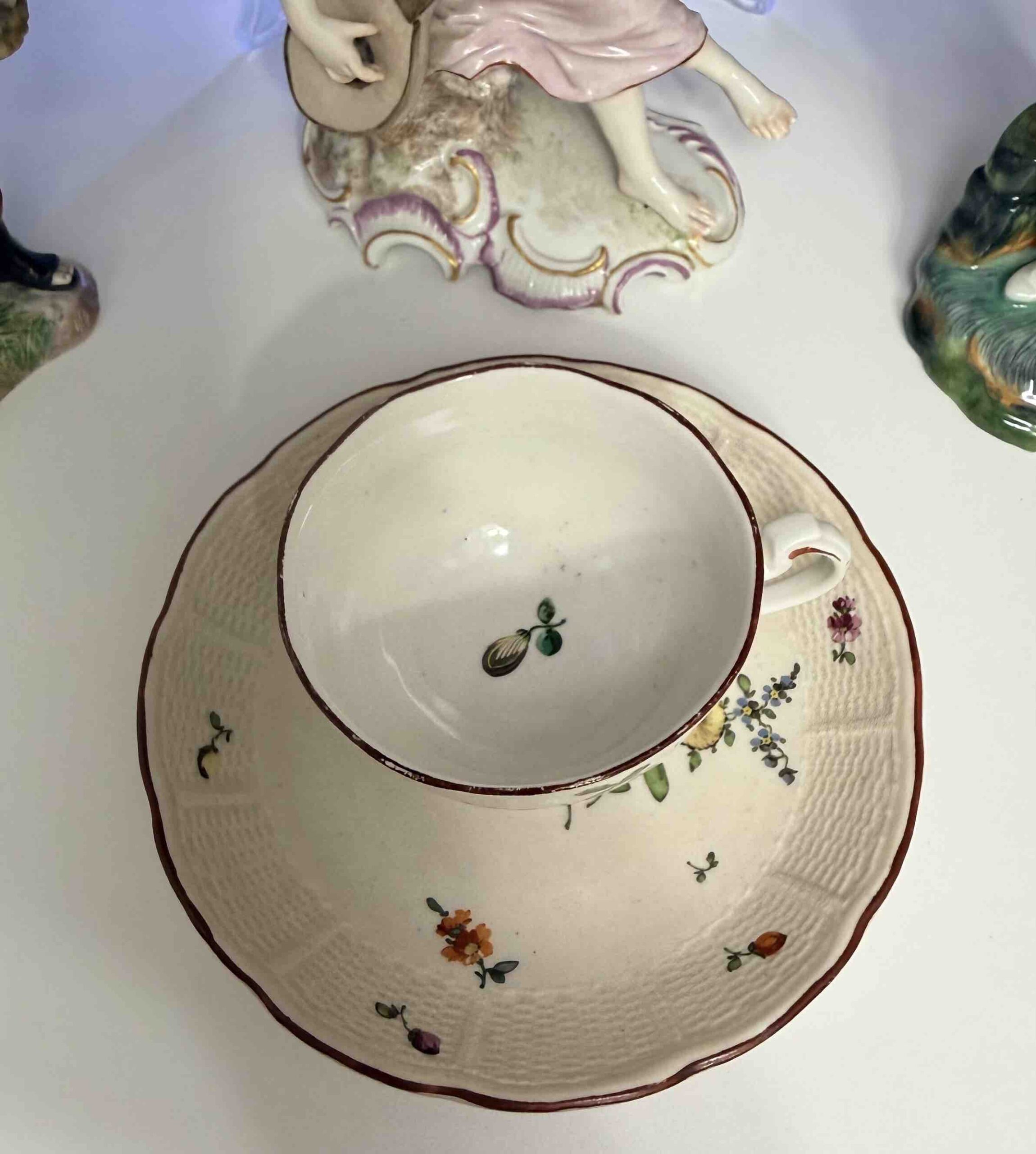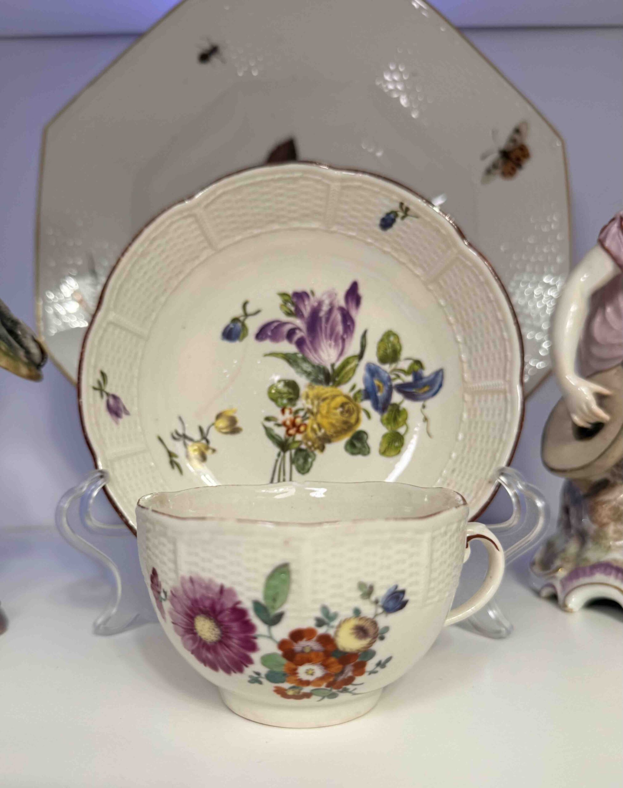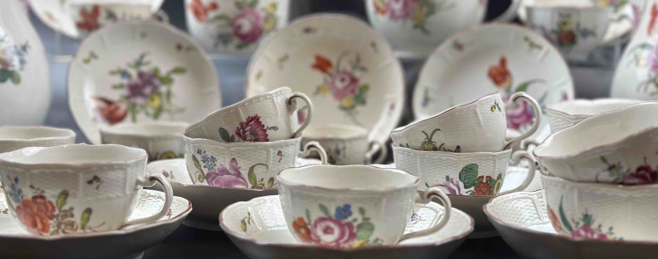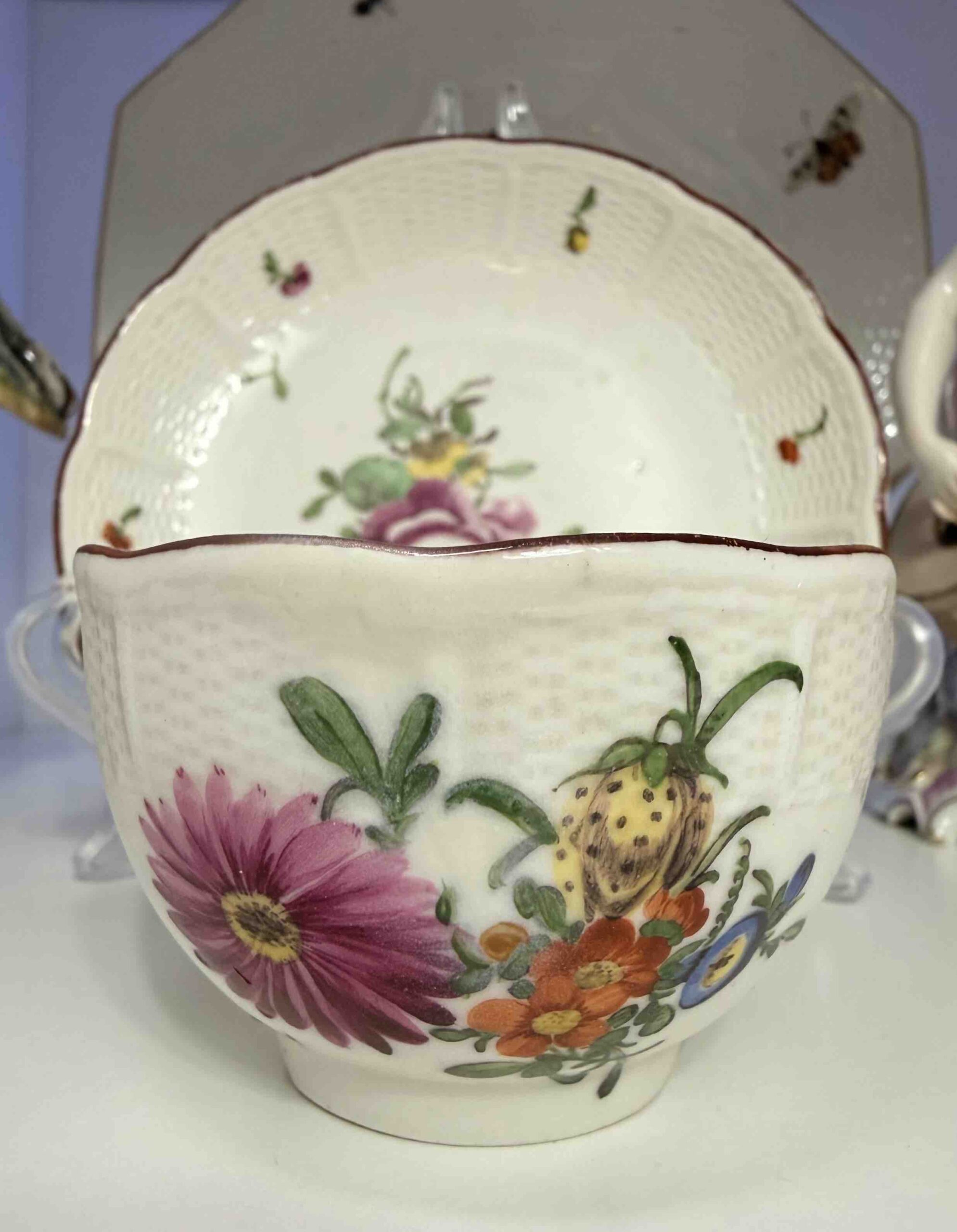 Spodeczki i filiżanki czasem gubią symetrię formy, posiadają drobne skazy i szary odcień porcelany. Szarawa masa porcelanowa z drobnymi skazami szkliwa, zgaszona tonacja barw, brak symetrii charakterystyczne są dla wyrobów Ludwigsburg z XVIII w. choć nie są regułą. Na uwagę zasługuje prezentowany przykład kompletu filiżanki i spodka wykonanych w podobnym przedziale czasowym, na którym wyraźnie dostrzec można różnicę odcieniu porcelany.