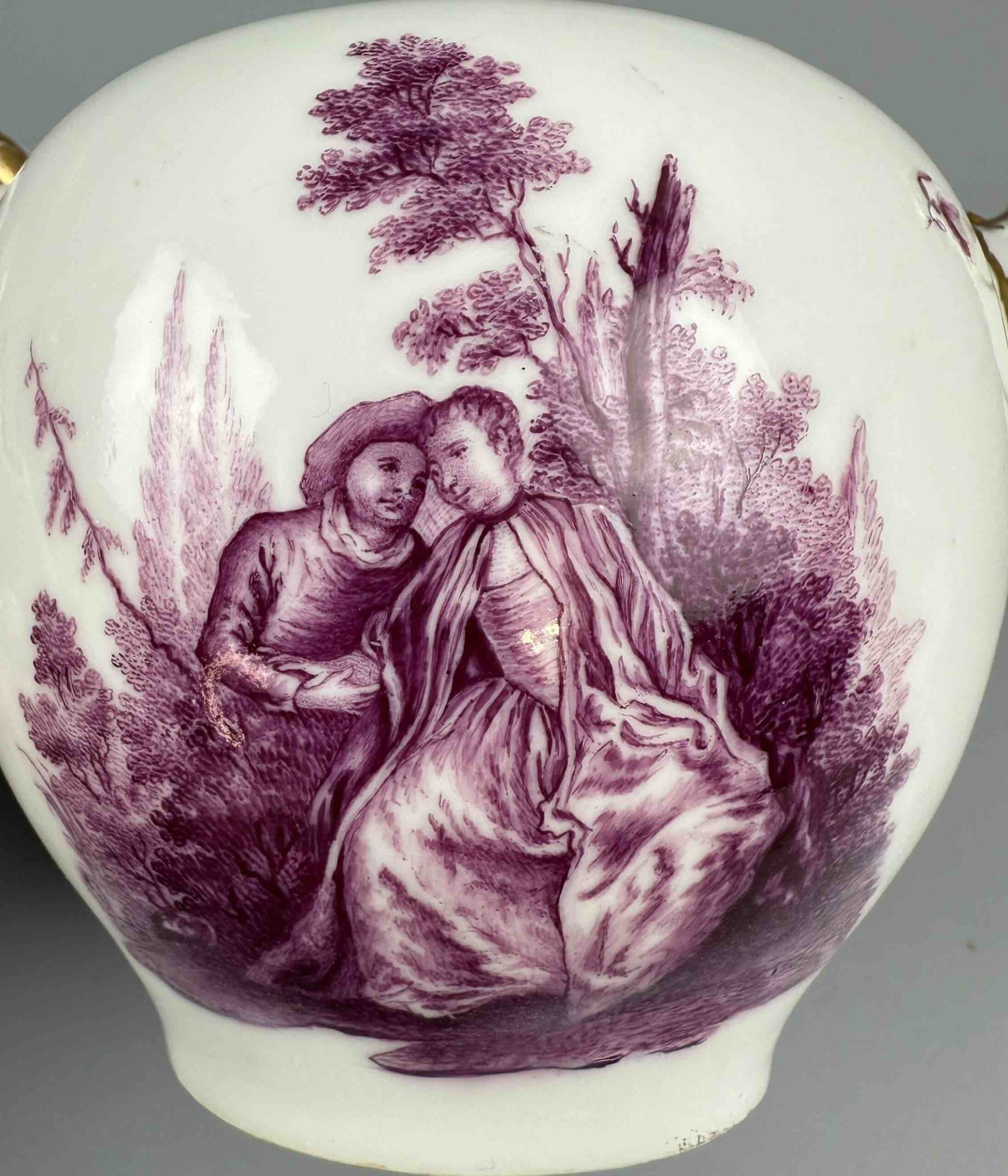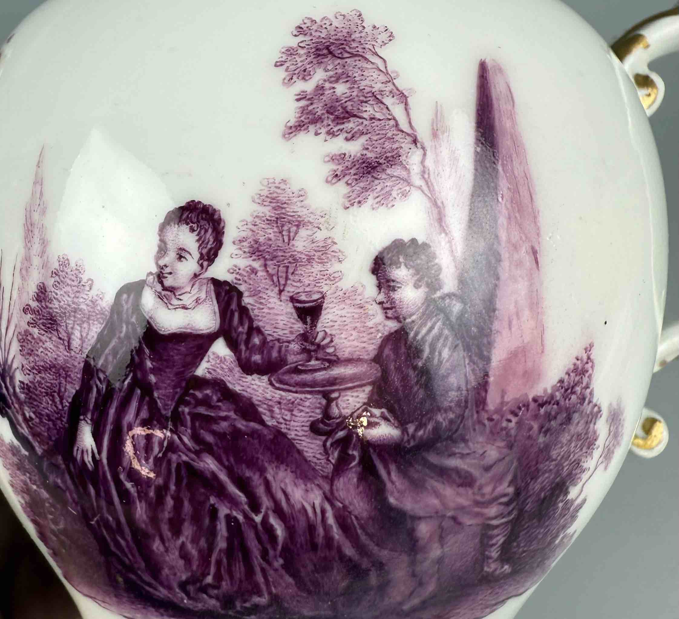Dwie scenki Watteau po przeciwległych strona brzuśca. Ujmujące detale postaci i otaczającej scenerii oraz poboczne lekkie jak puch ptasi kwiaty, kępki trawy, załamania sukni, idealne proporcje postaci, mimika twarzy, zatrzymują oglądającego ten przedmiot w miejscu. Na jednej ze scen odpoczywająca w ogrodzie dama raczy się kieliszkiem wina, podawanego przez sługę. W drugiej scenie natomiast para zakochanych jest nad wyraz poruszona tą zatrzymaną chwilą.