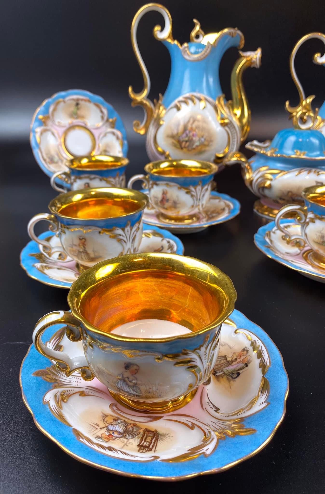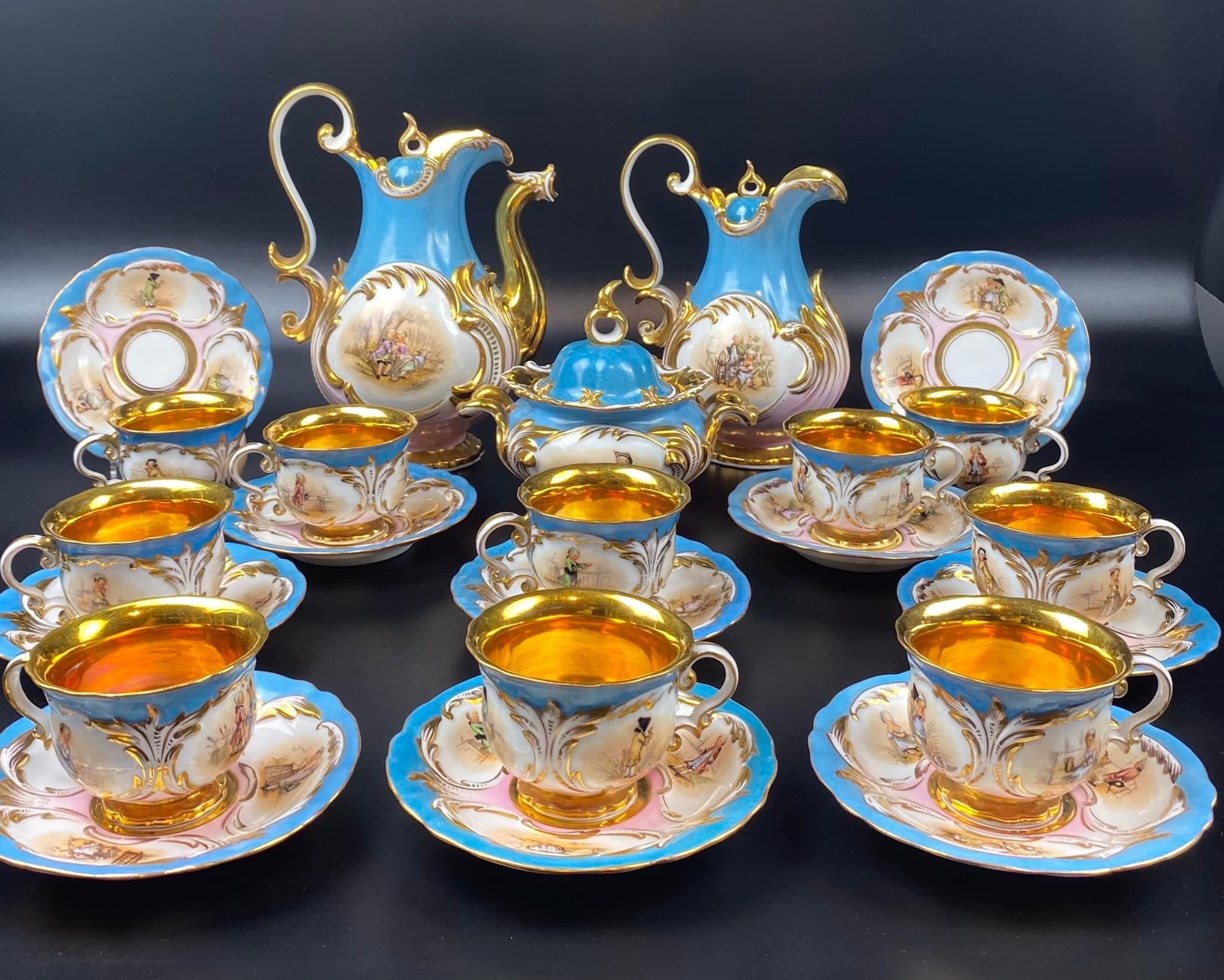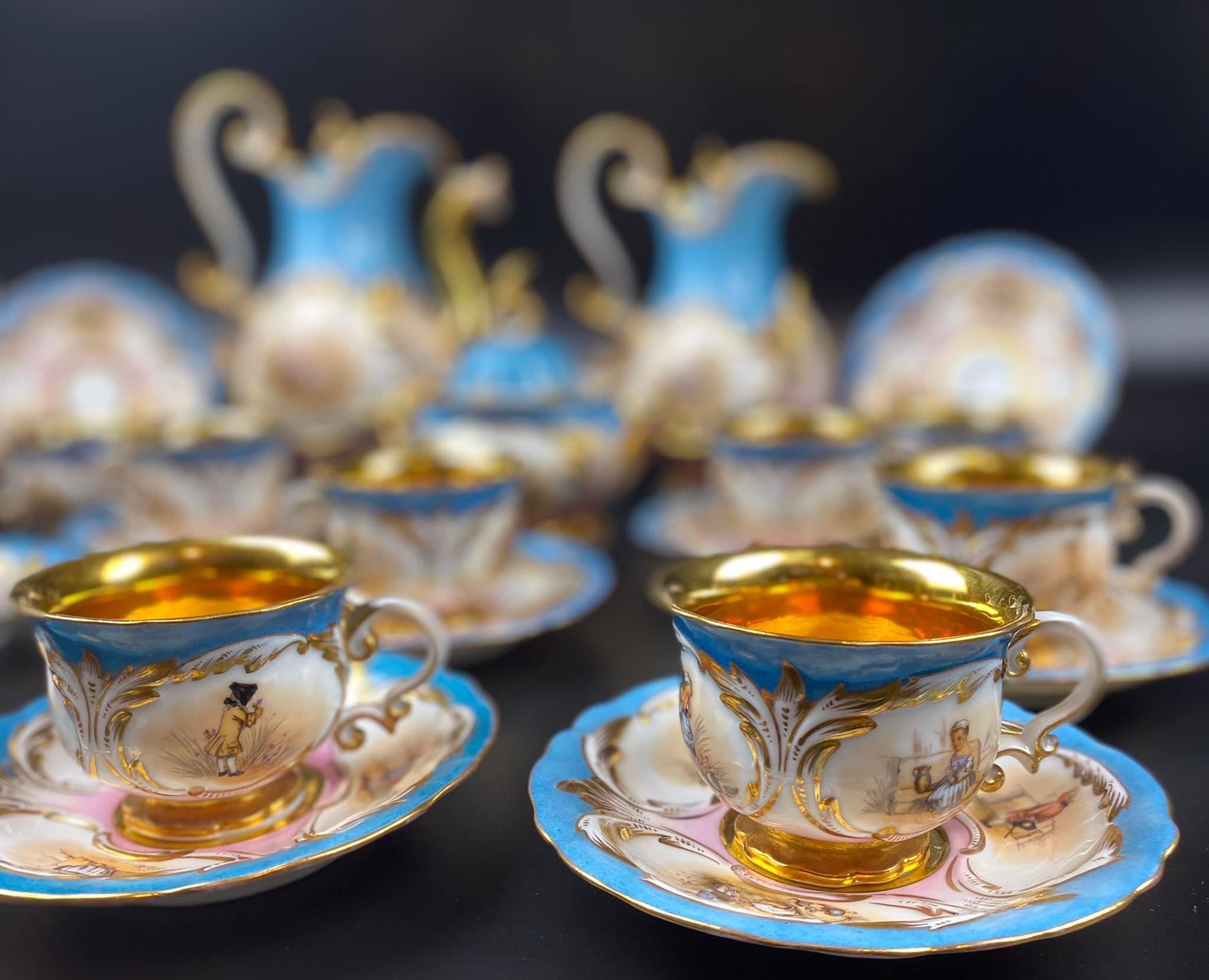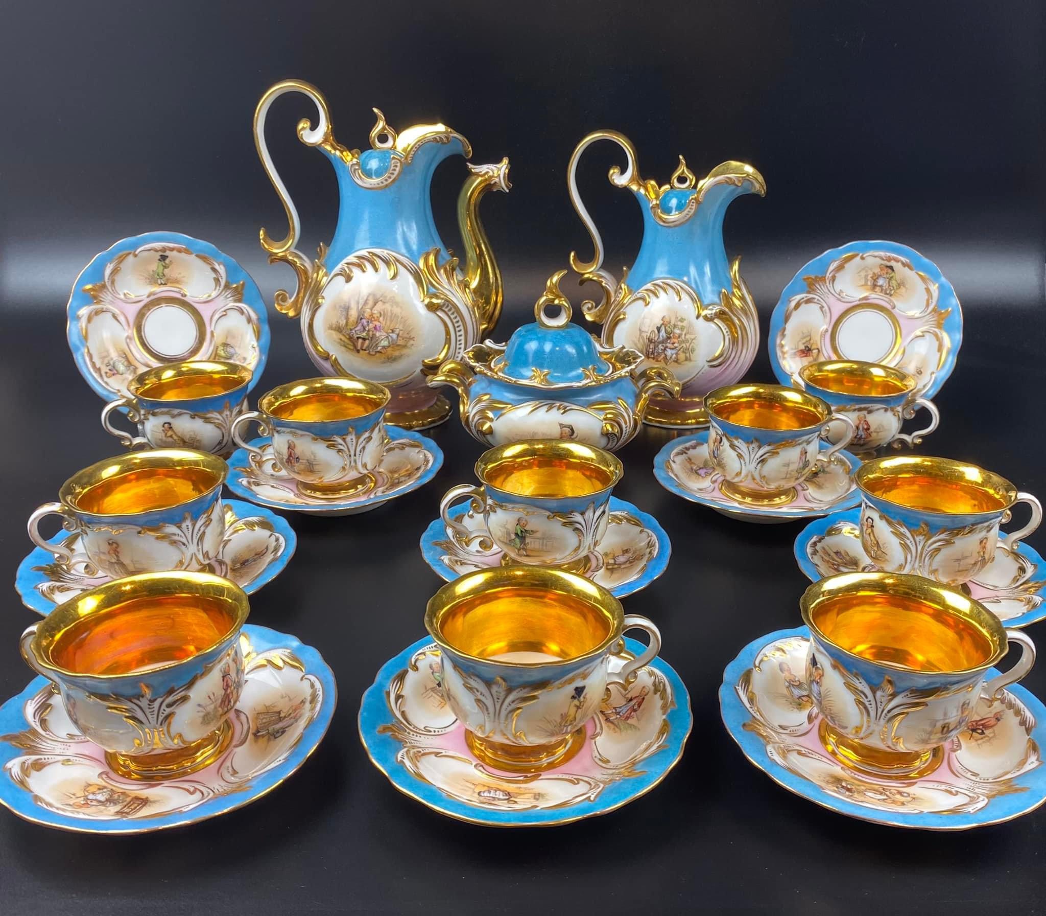 Bogato złocony, z minimalnymi wytarciami złoceń. Załączyłam dużo zdjęć, na nich widać stan serwisu.
