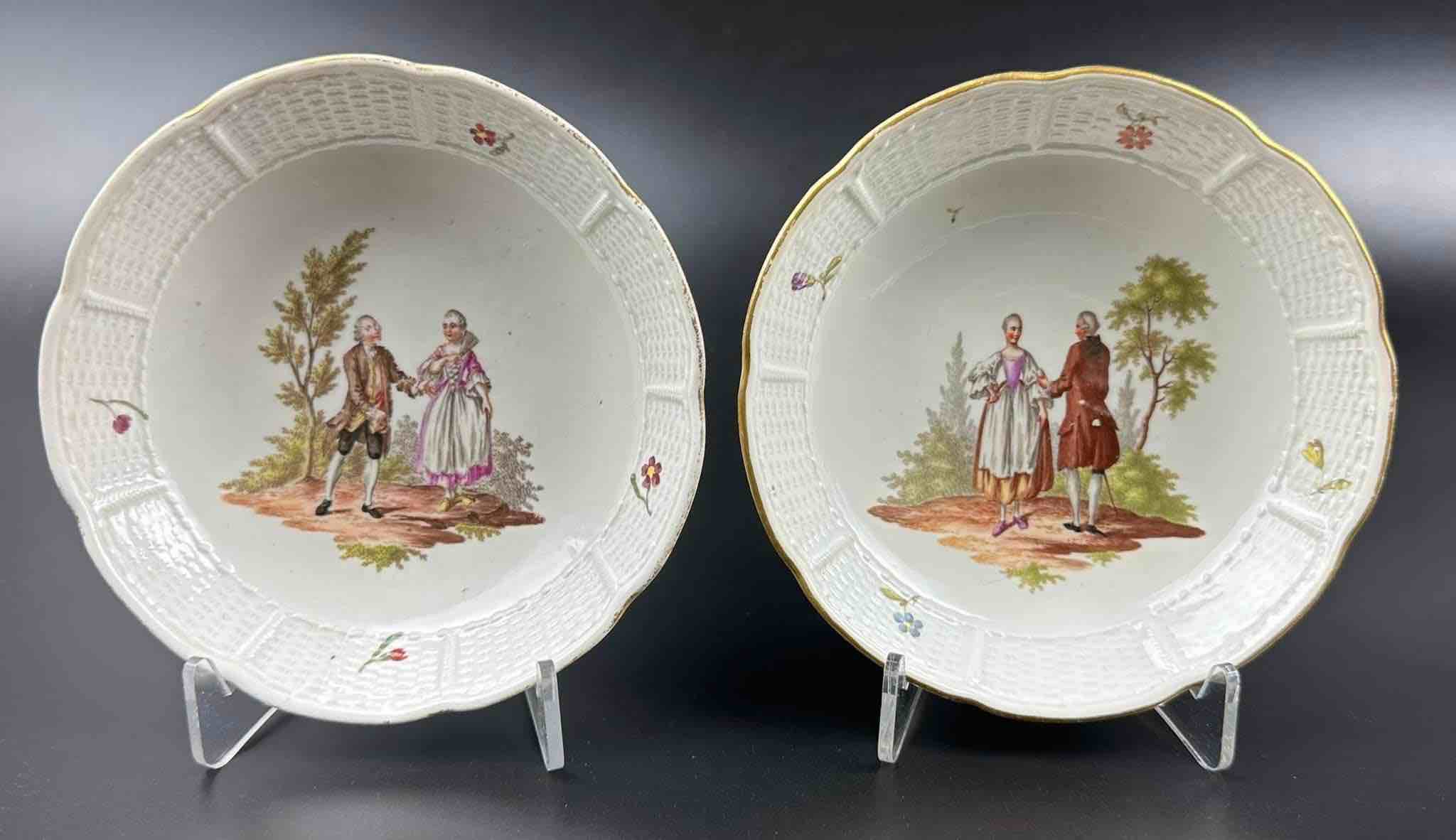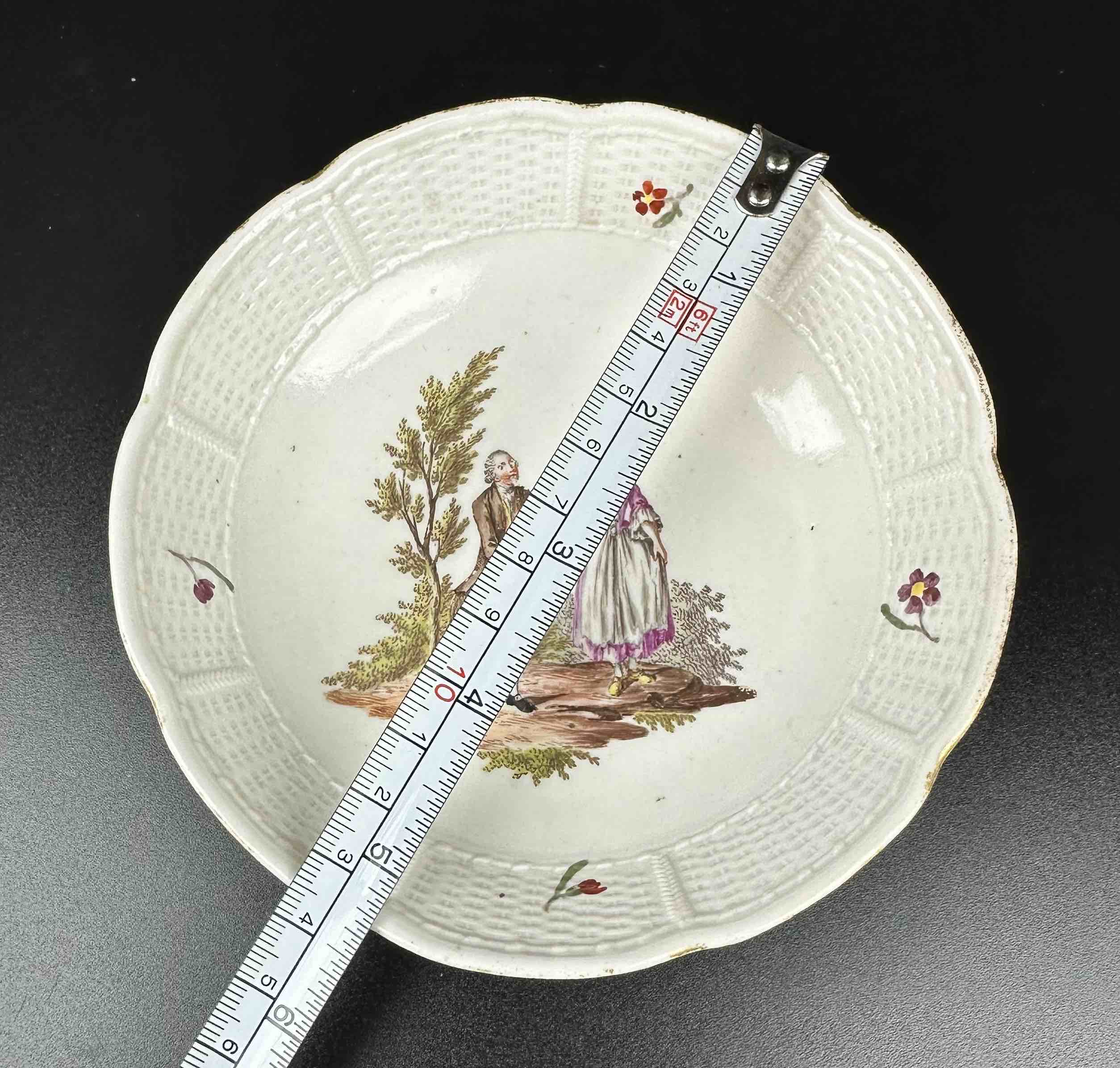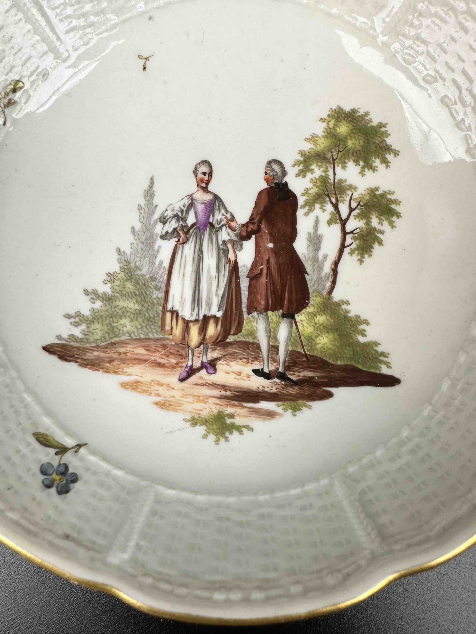 Spodeczki posiadają unikatowe zdobienie reliefem wzorowanym na wiklinowych gałązkach i ręcznie malowany motyw scenek dworskich w stylu Watteau. Malatura wykonana jest z dużą precyzją i dbałością o detale.