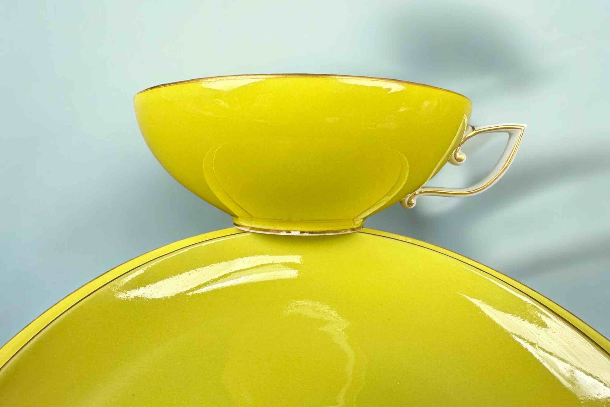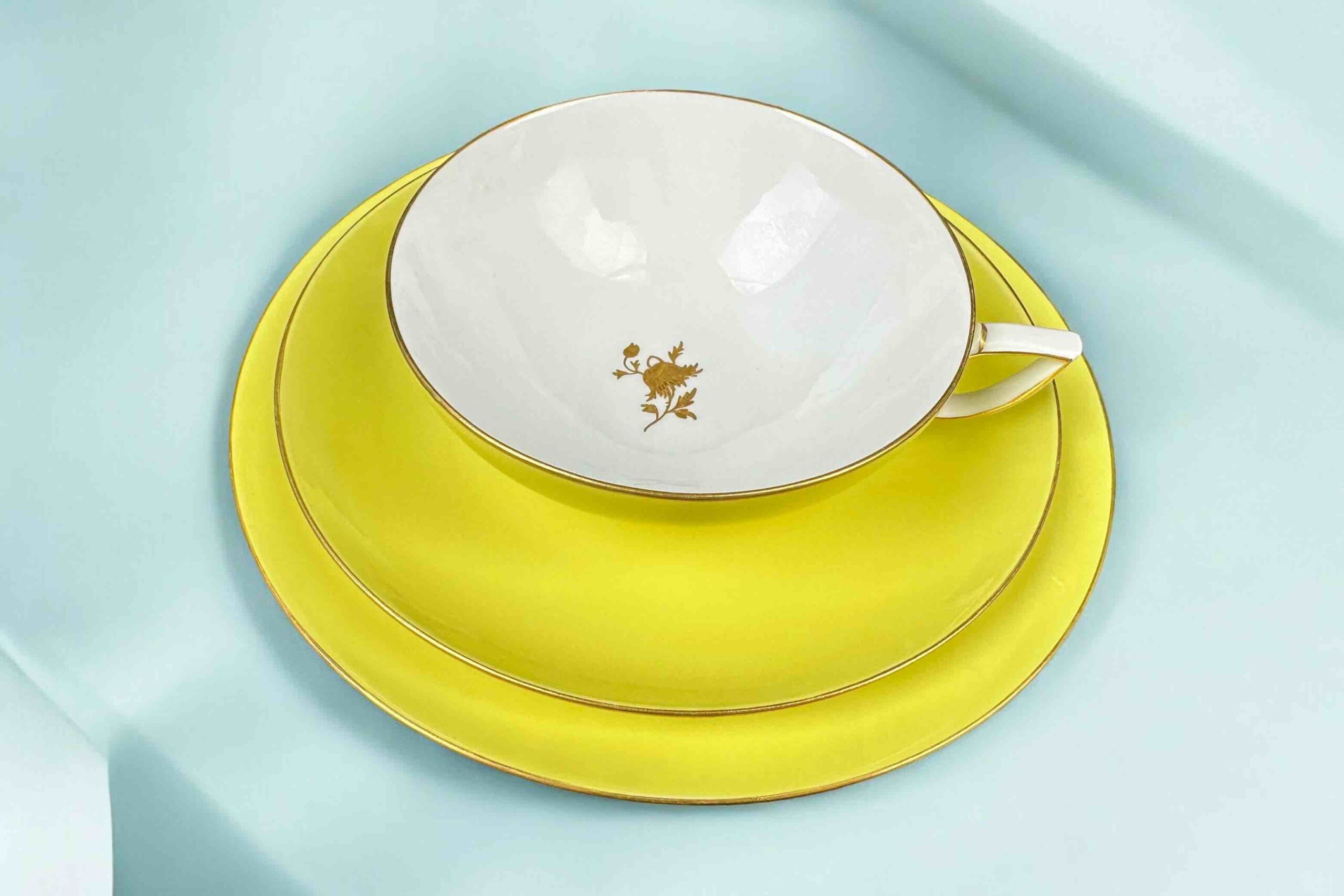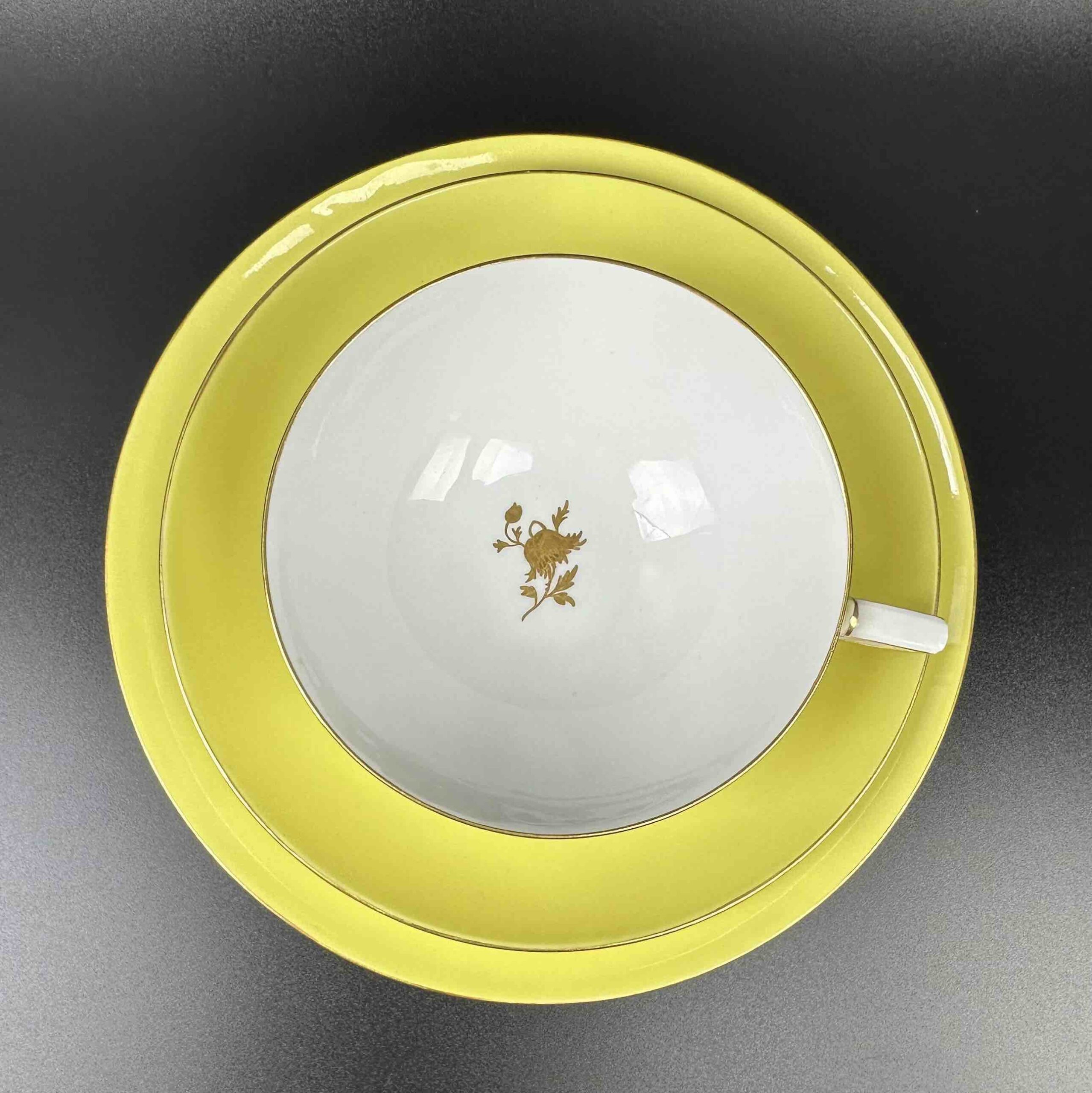 Delikatny złoty kwiat zdobi wnętrze filiżanki i lustro talerzyka śniadaniowego