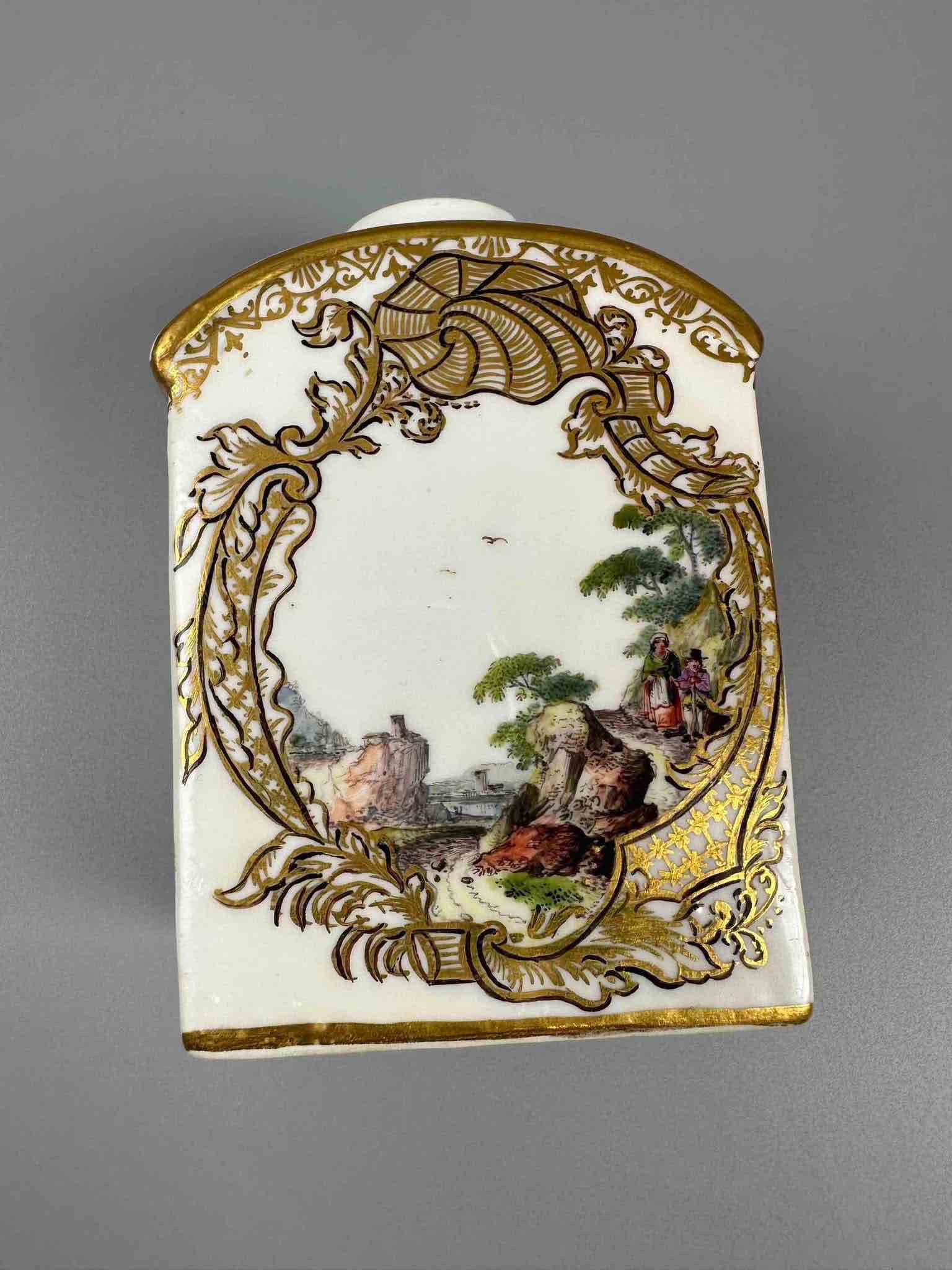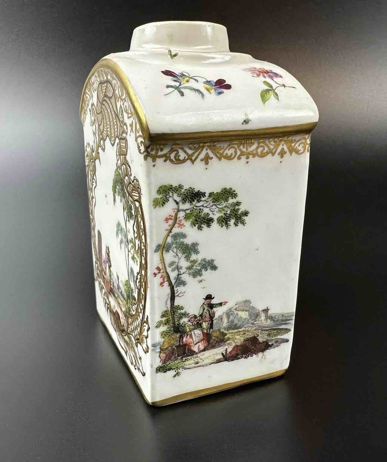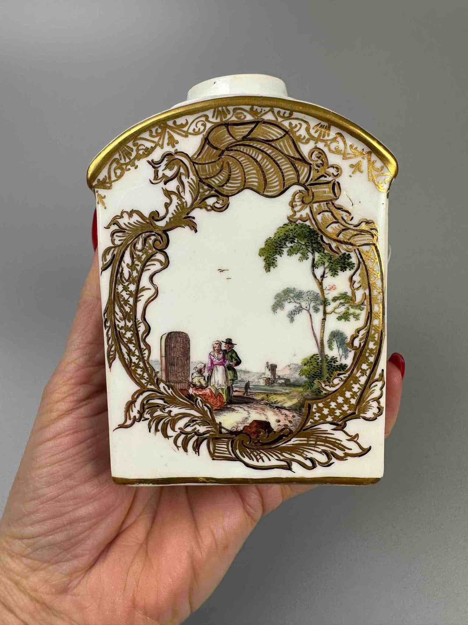 Herbatnica w formie prostopadłościanu z zaokrąglonym ramieniem. Dekoracja malarska na czterech ściankach naczynia. Scenki w stylu Ch.F. Herolda z dwóch stron otoczone grubo złoconymi kontuszami. Wokół stylizowane kwiaty.