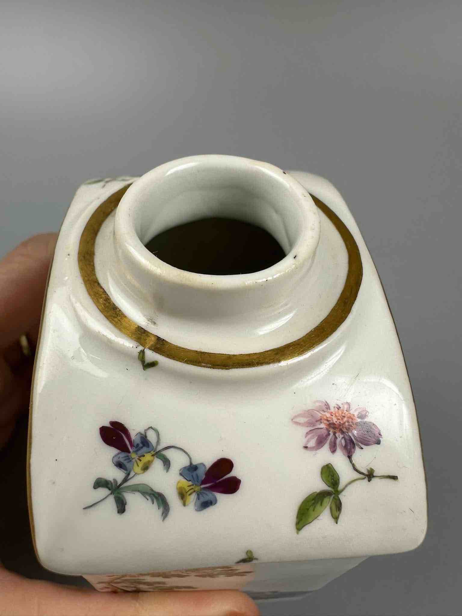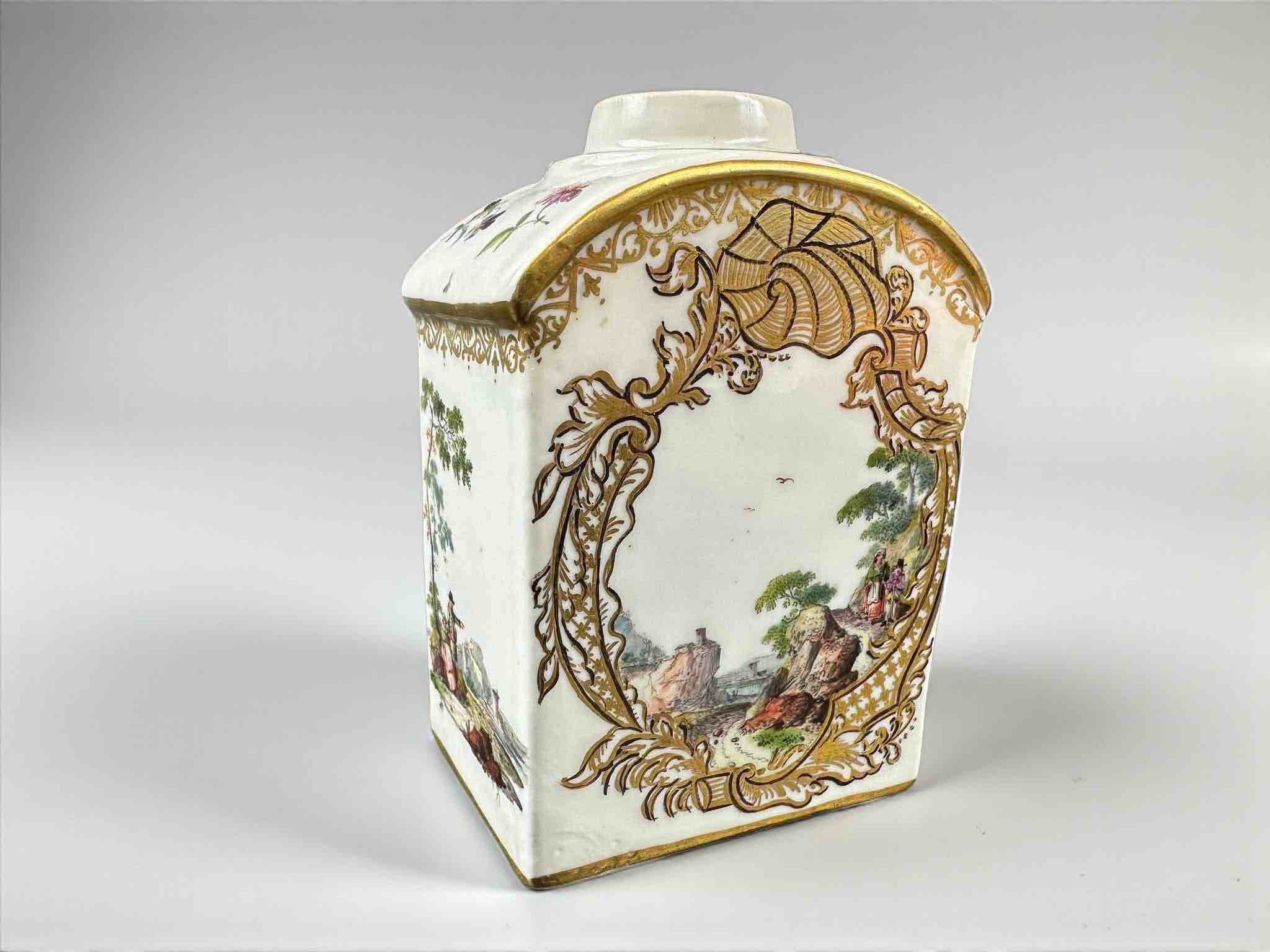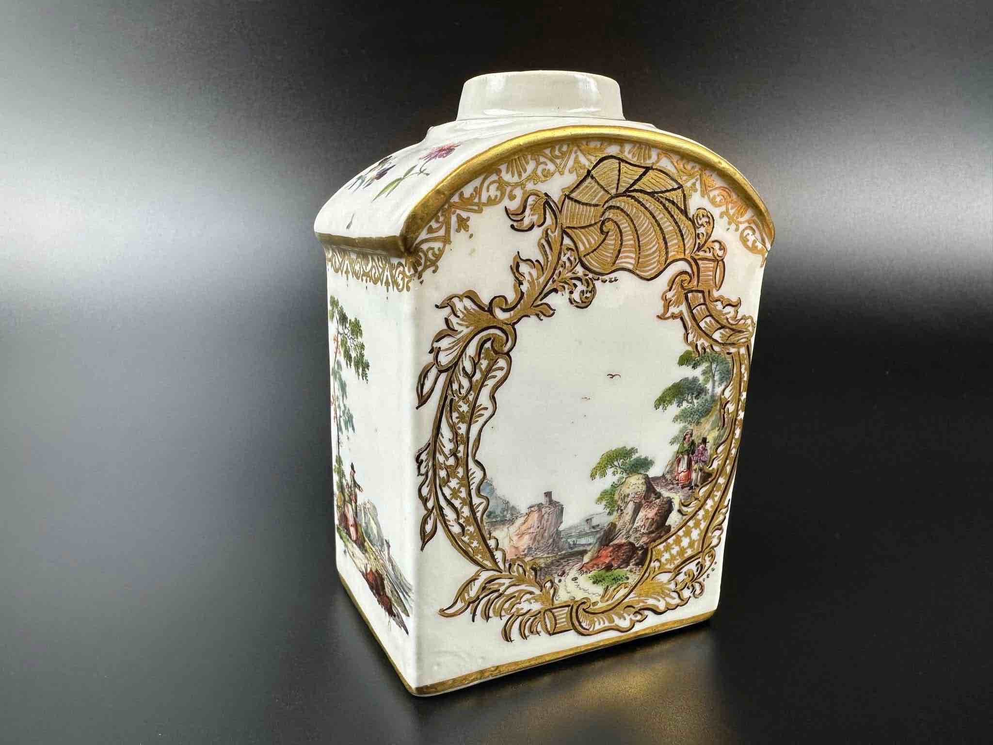 Herbatnica w formie prostopadłościanu z zaokrąglonym ramieniem. Dekoracja malarska na czterech ściankach naczynia. Scenki w stylu Ch.F. Herolda z dwóch stron otoczone grubo złoconymi kontuszami. Wokół stylizowane kwiaty.