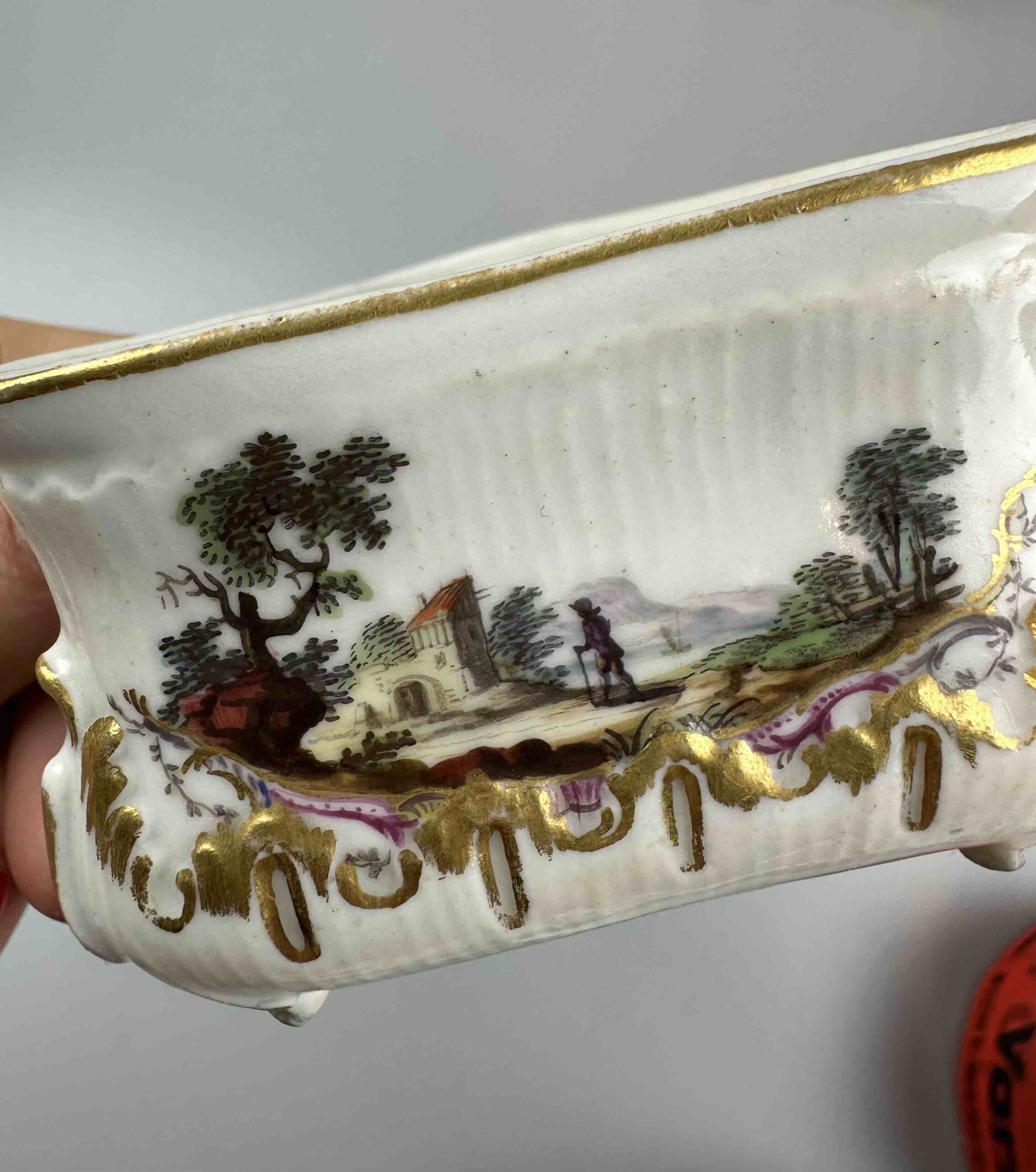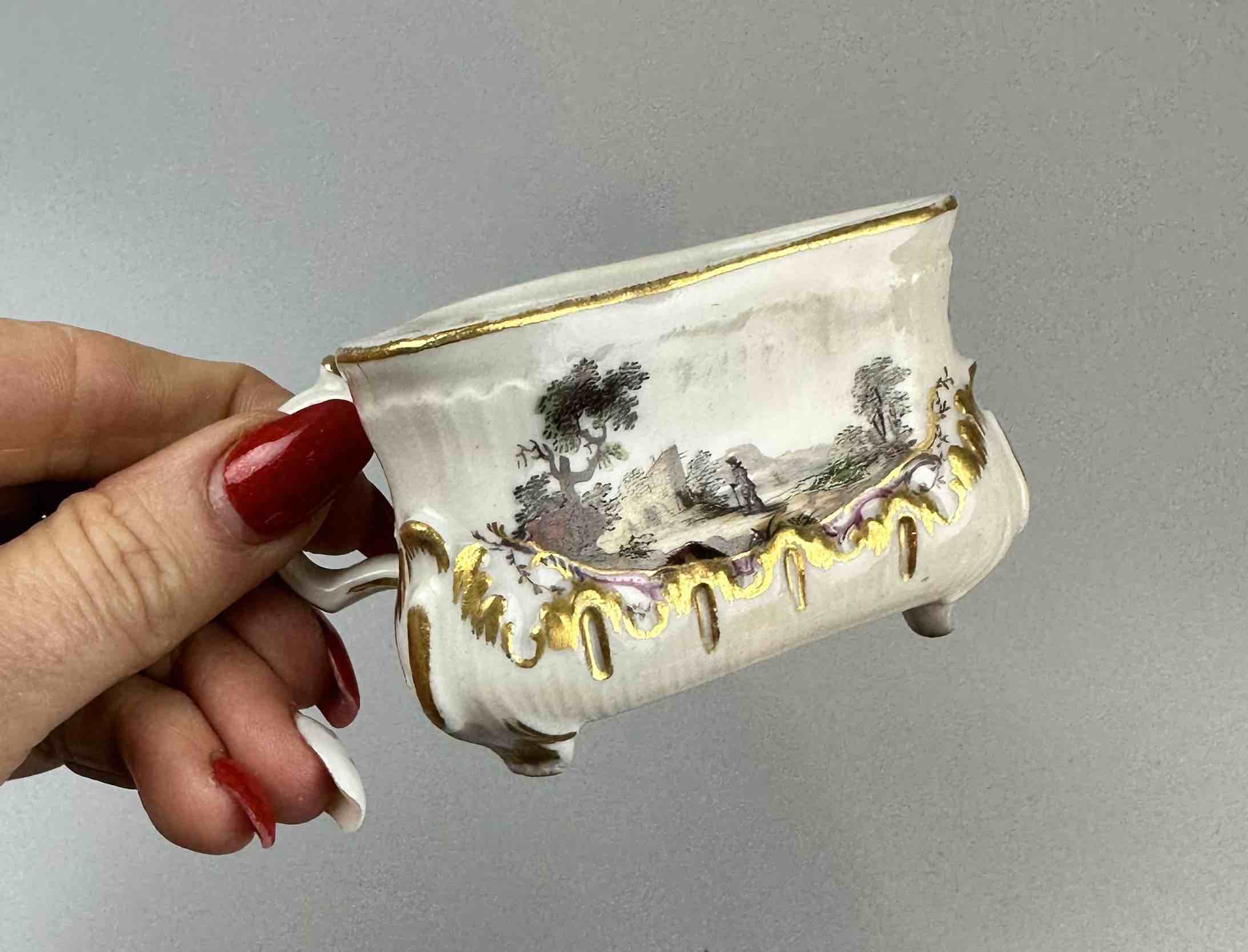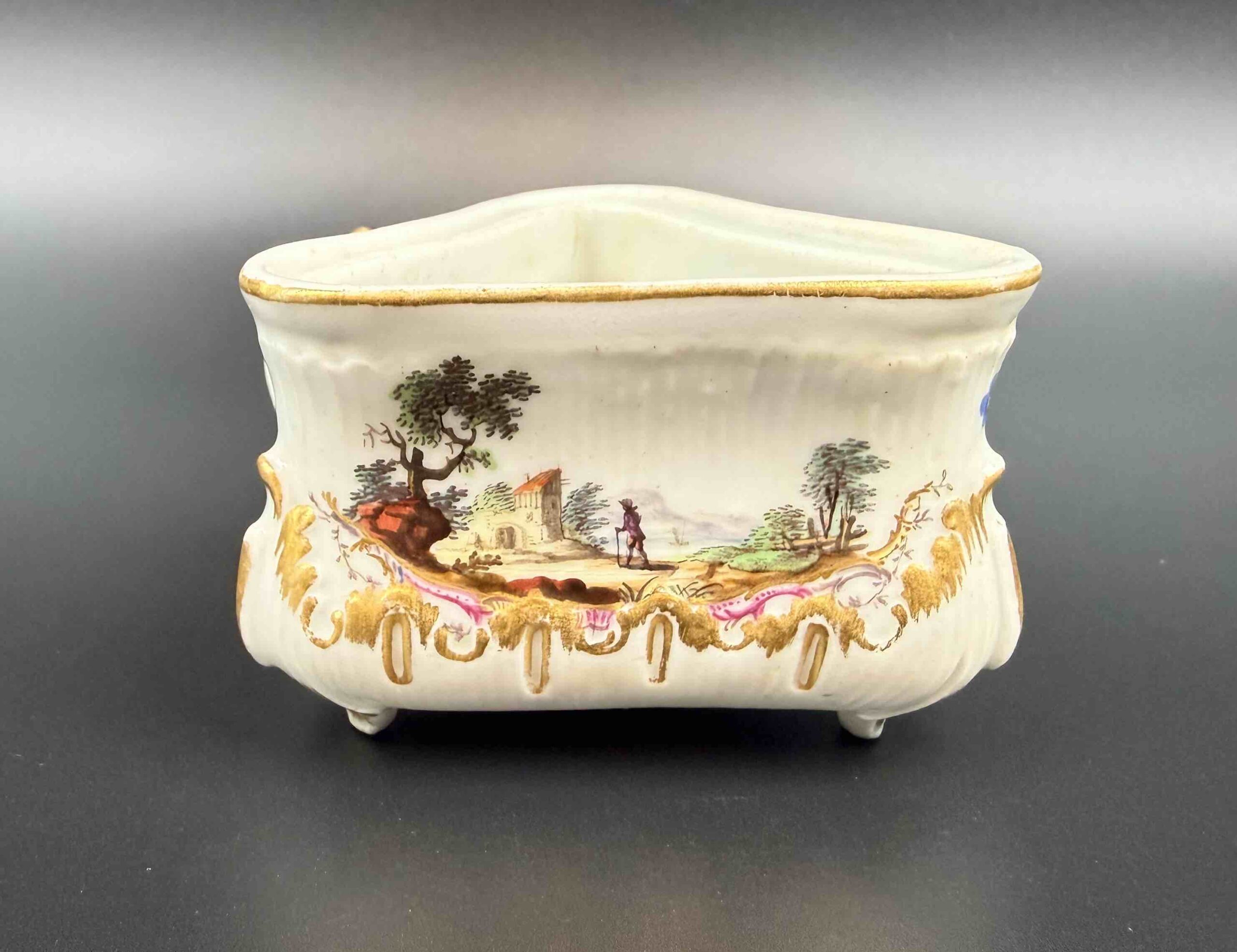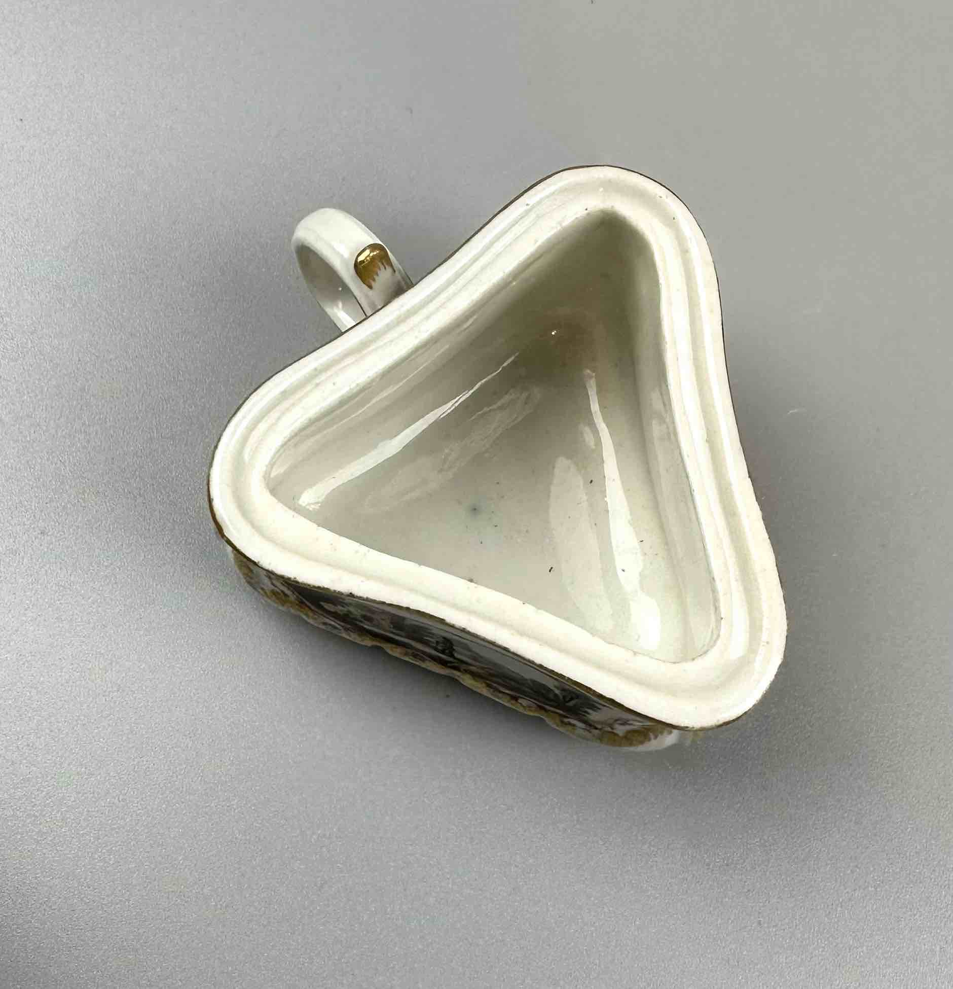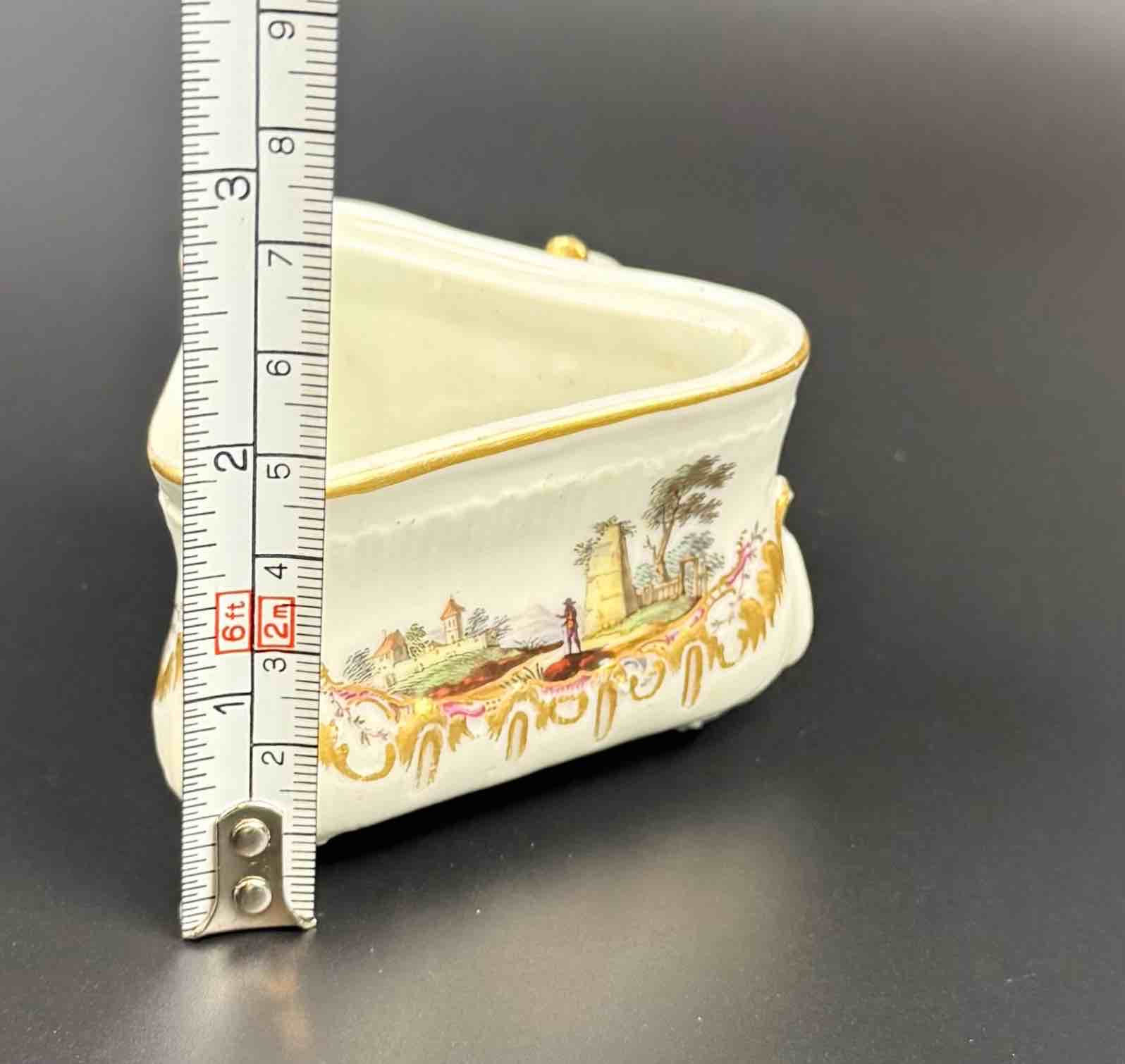 Kształt przypominający trójkąt, z żłobkowanym korpusem z reliefem rocaille na krótkich nóżkach. Bez pokrywki. Złocone ranty. Dwie strony naczynia pomalowane są na żywe kolory z linią brzegową, architekturą, łodziami i figurami. Porcelana z niebieskim znakiem CC pod szkliwem na podstawie.