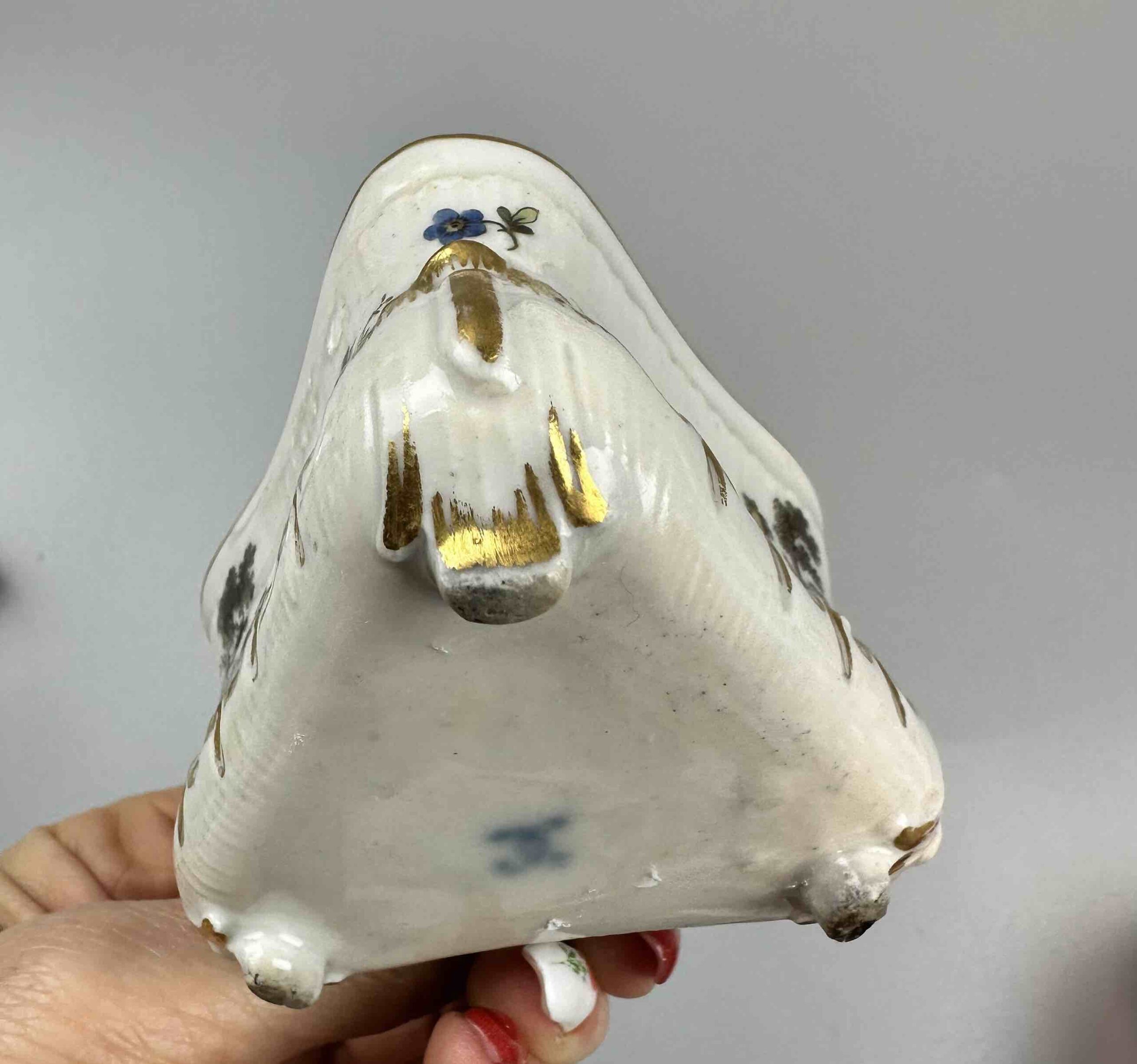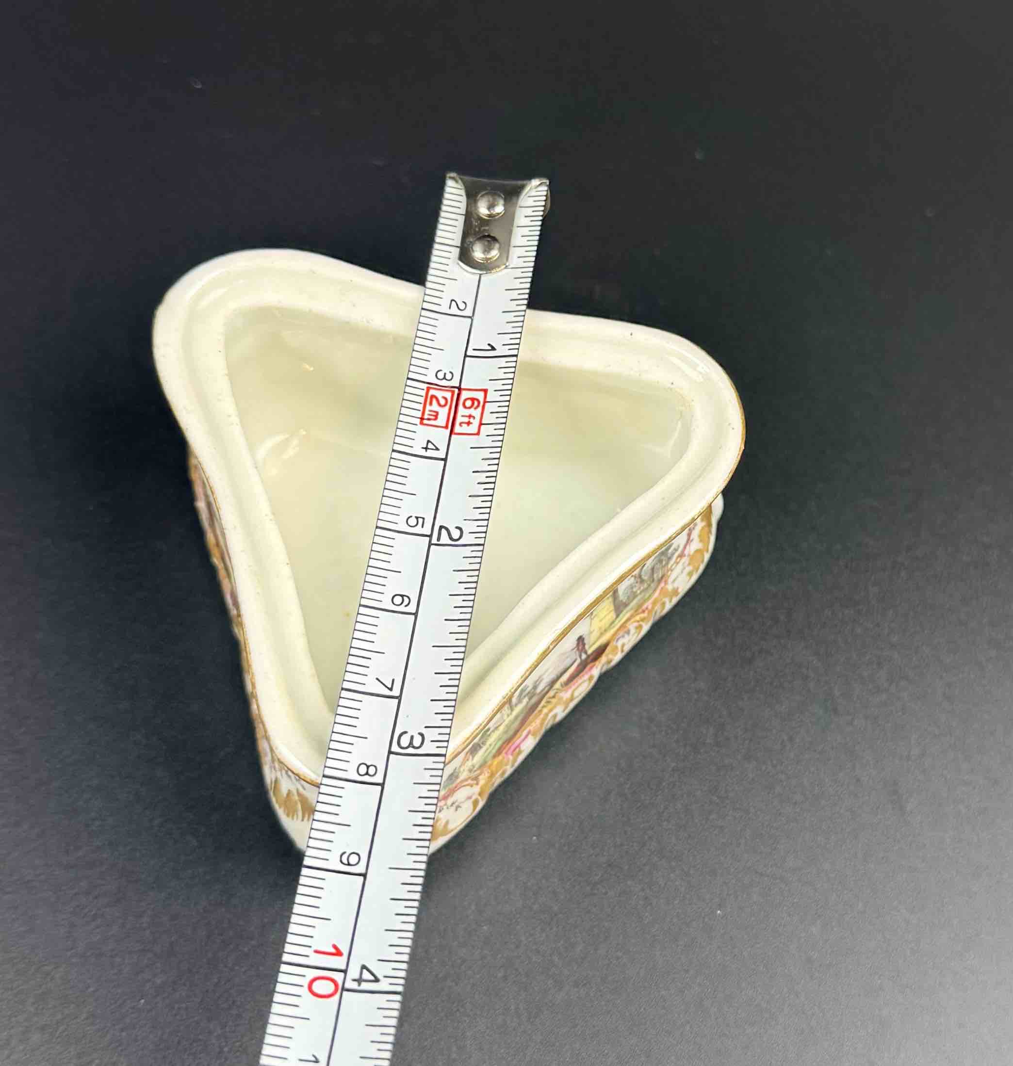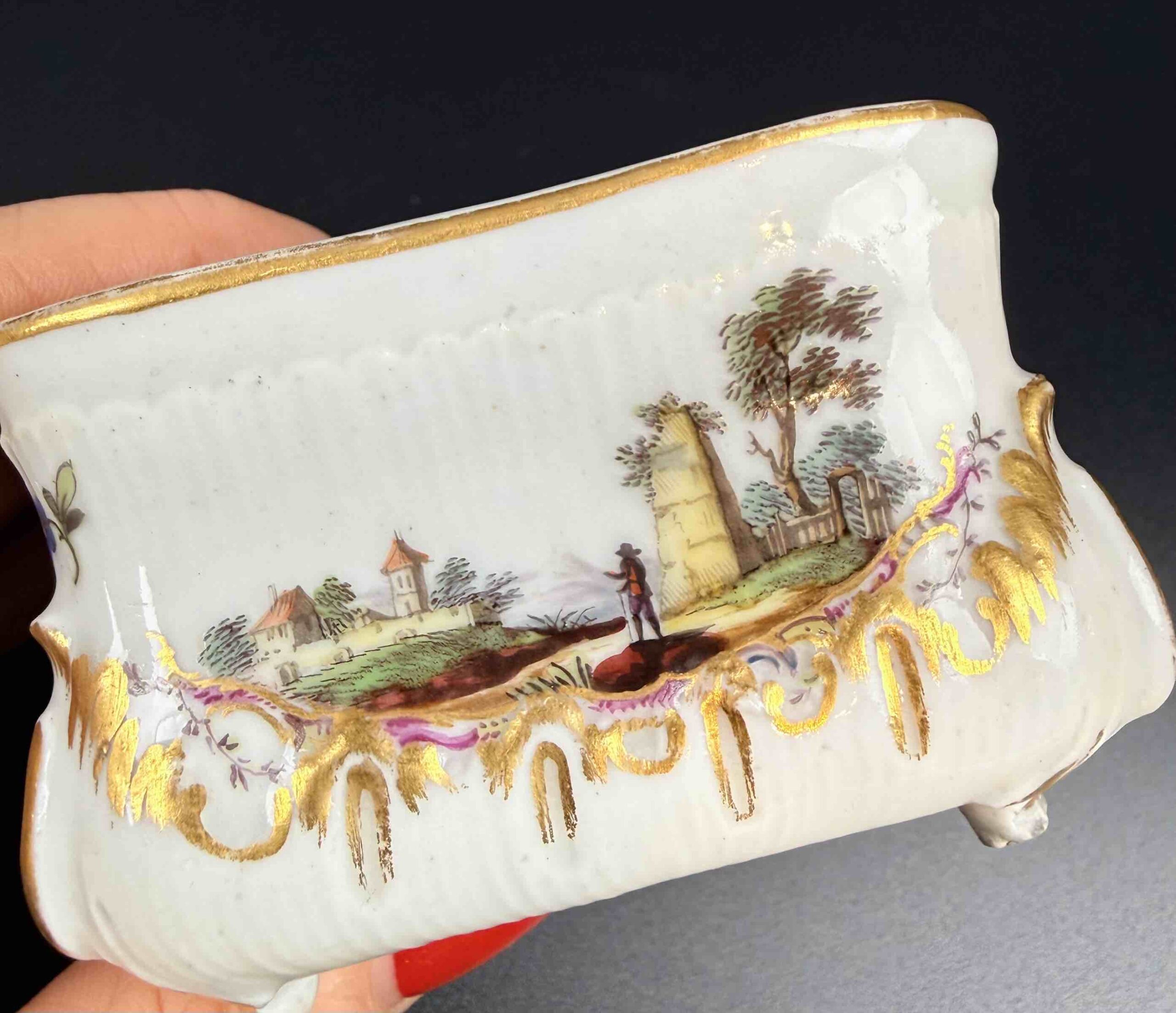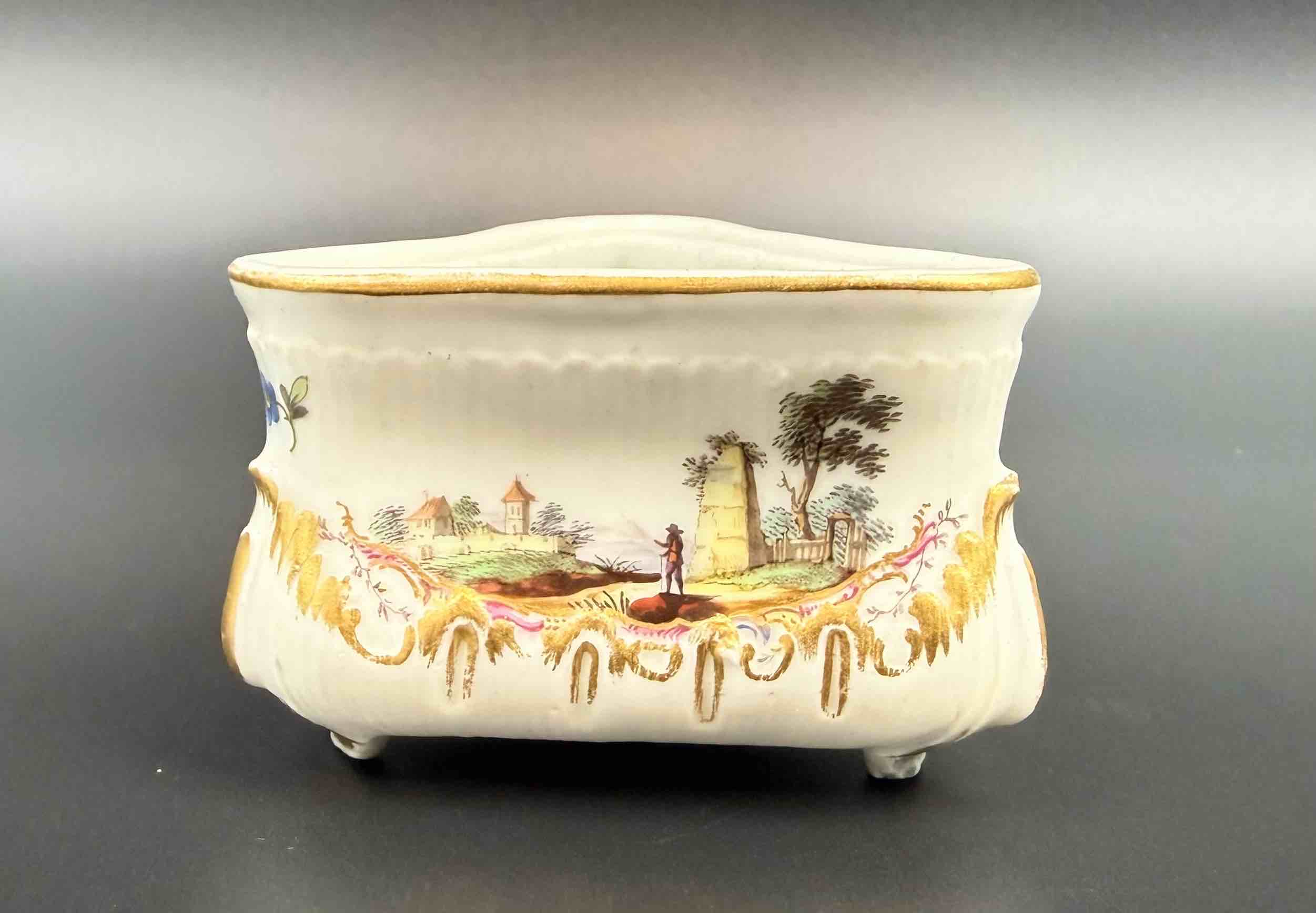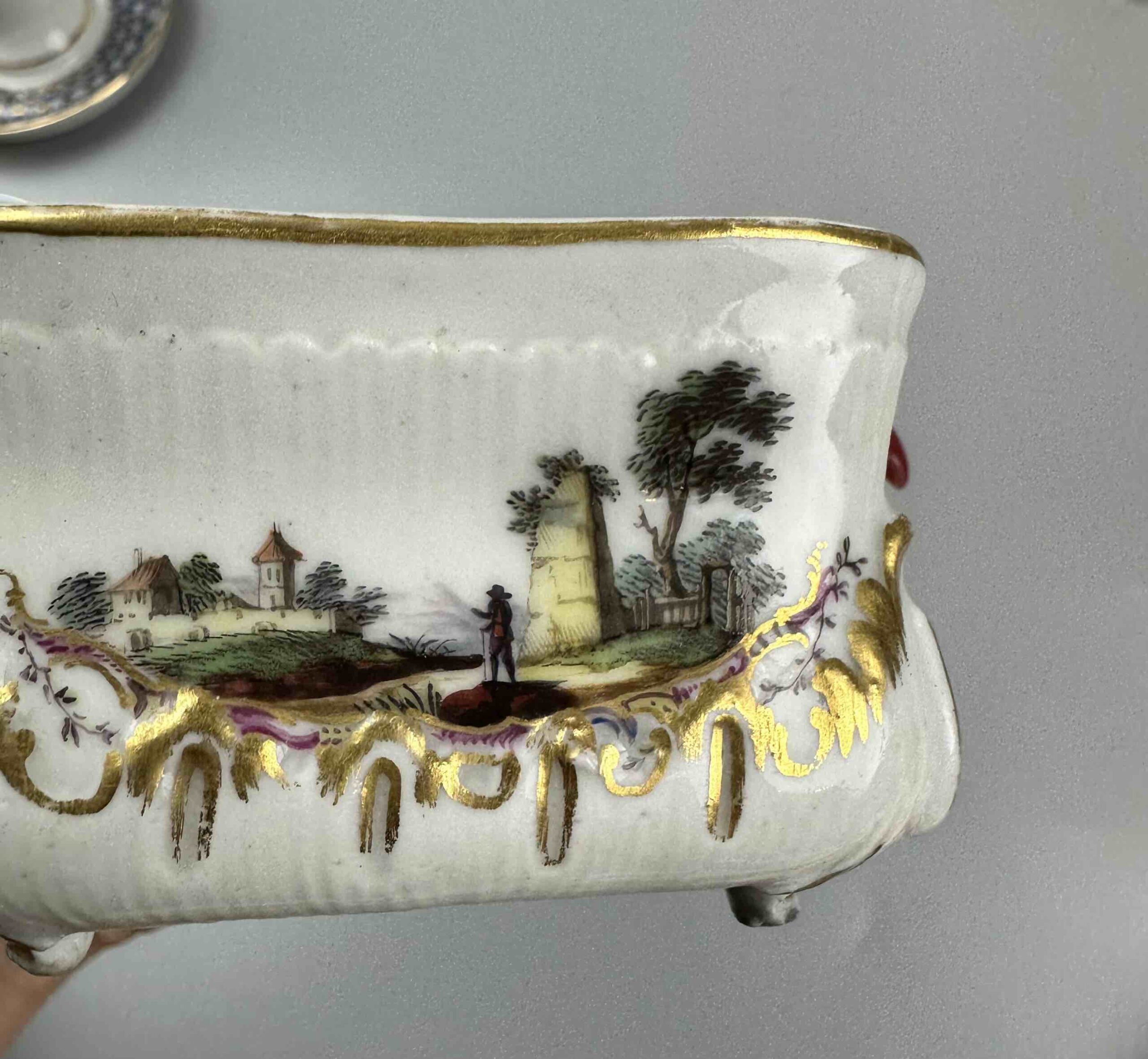 Kształt przypominający trójkąt, z żłobkowanym korpusem z reliefem rocaille na krótkich nóżkach. Bez pokrywki. Złocone ranty. Dwie strony naczynia pomalowane są na żywe kolory z linią brzegową, architekturą, łodziami i figurami. Porcelana z niebieskim znakiem CC pod szkliwem na podstawie.