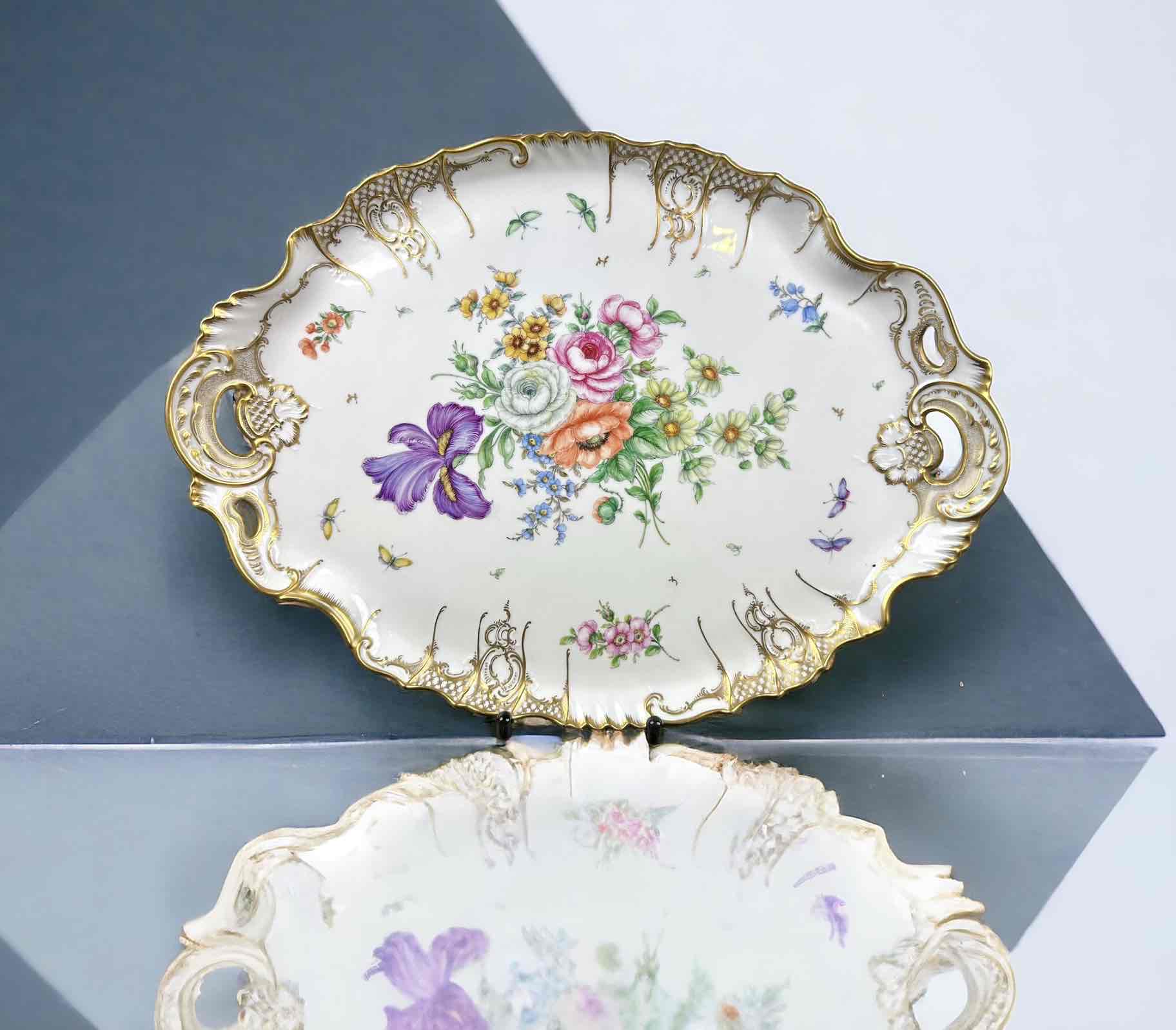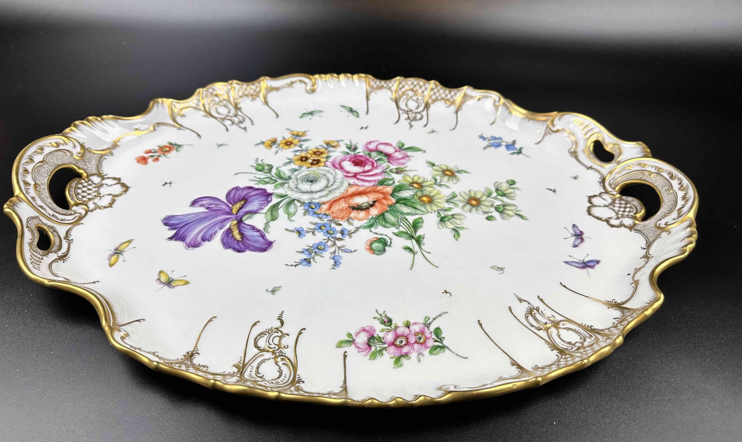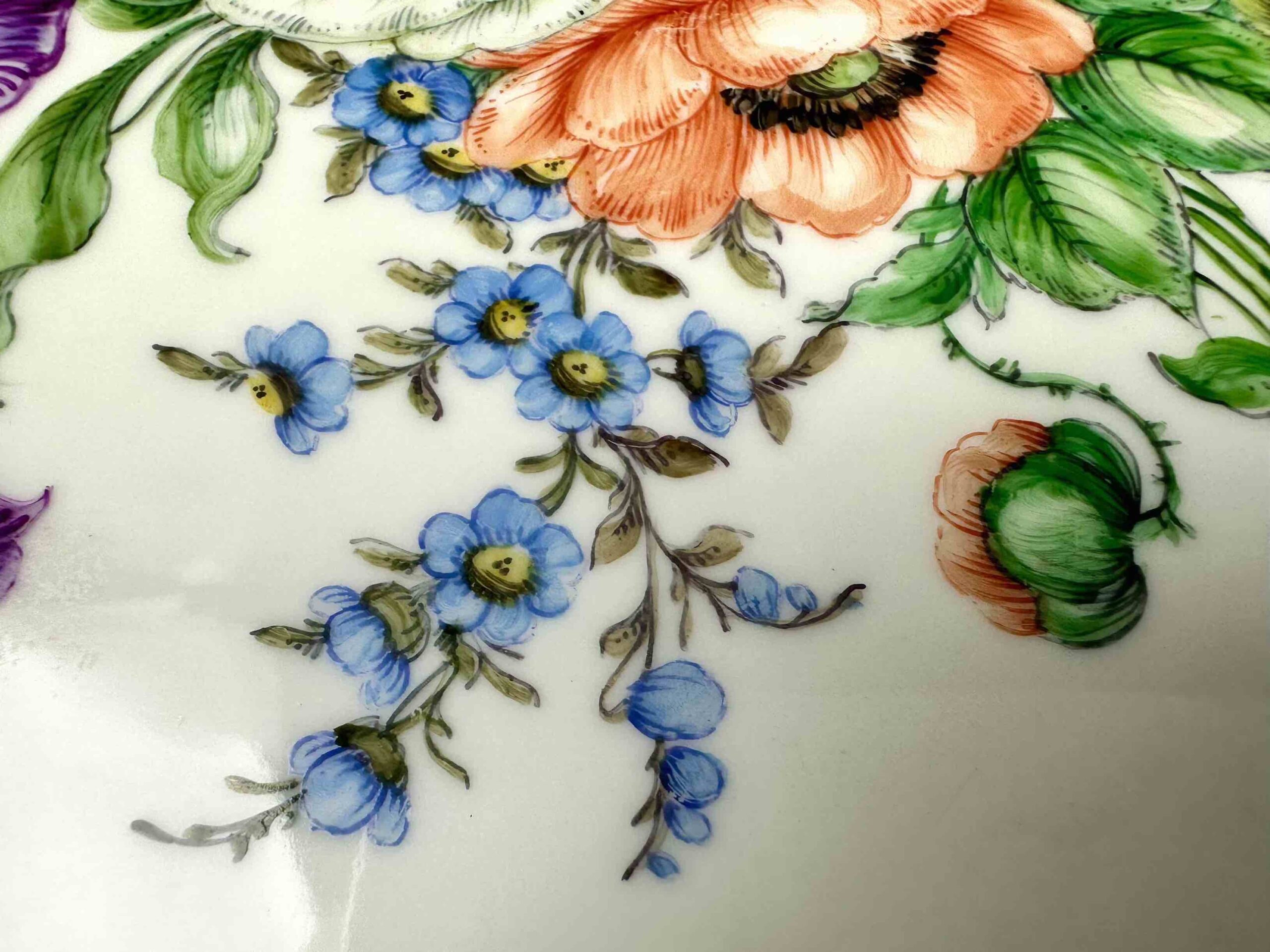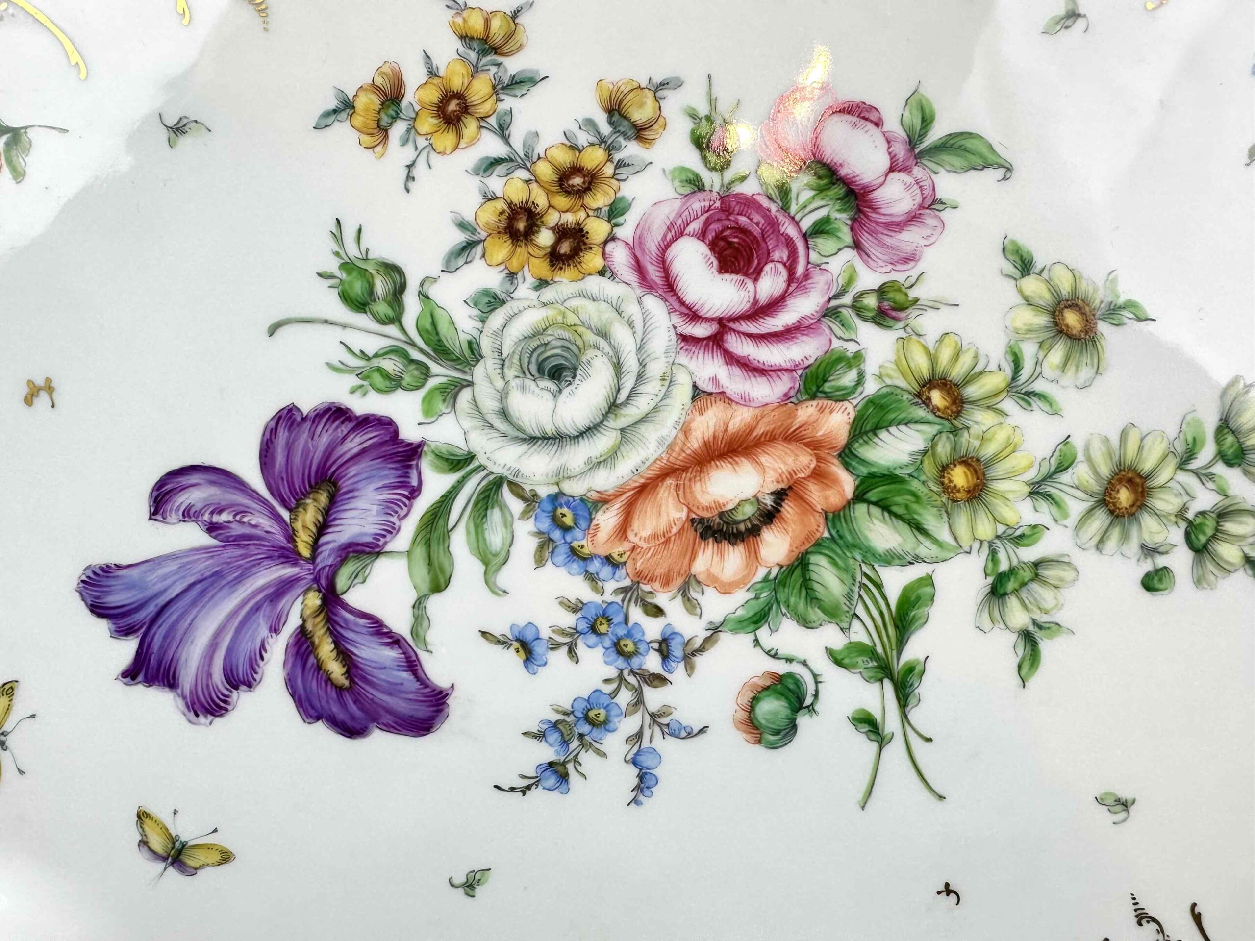 Dekoracja bogata w złocenia i motyw europejskich kwiatów ciętych w towarzystwie owadów. Stan zachowana – bez wad .