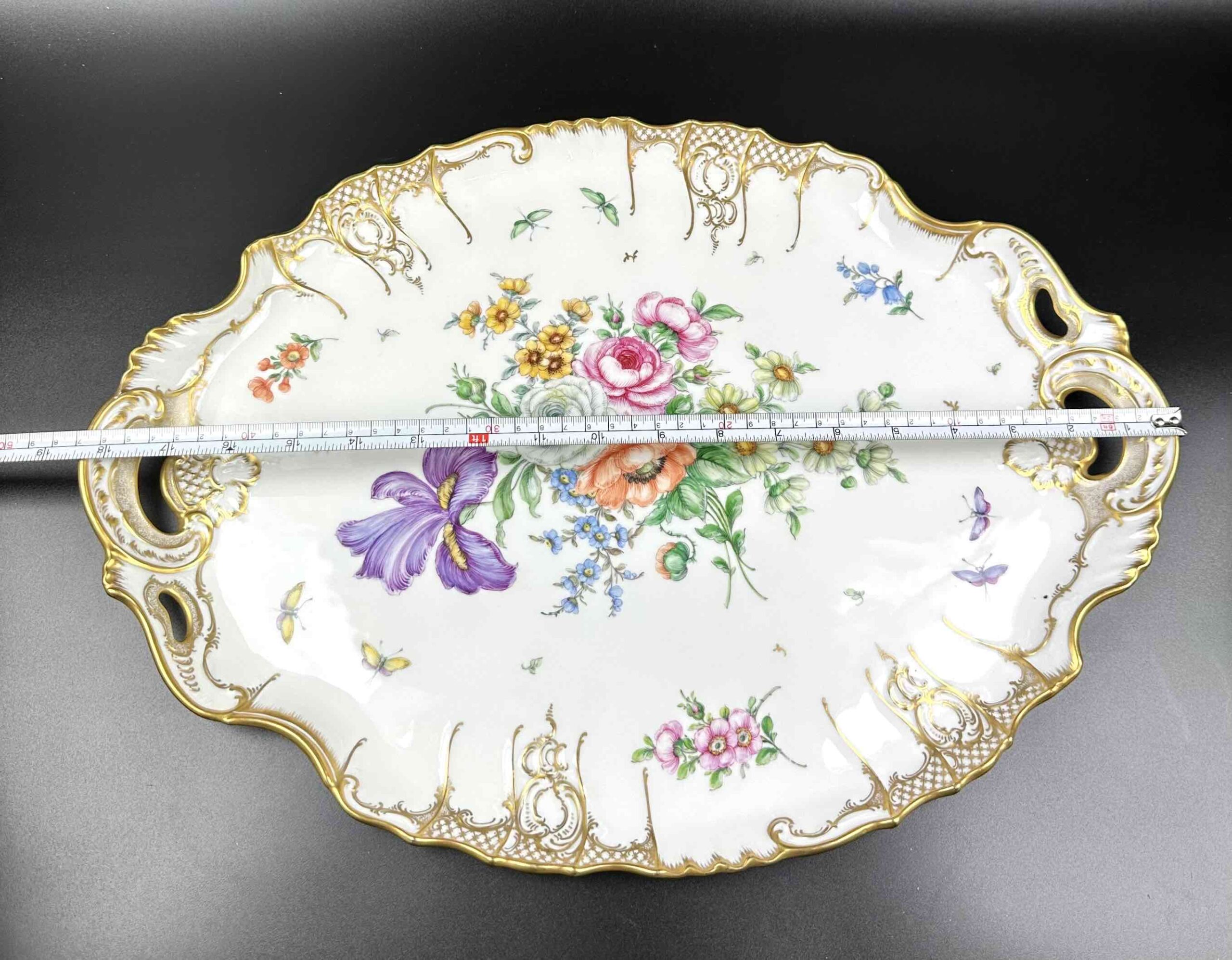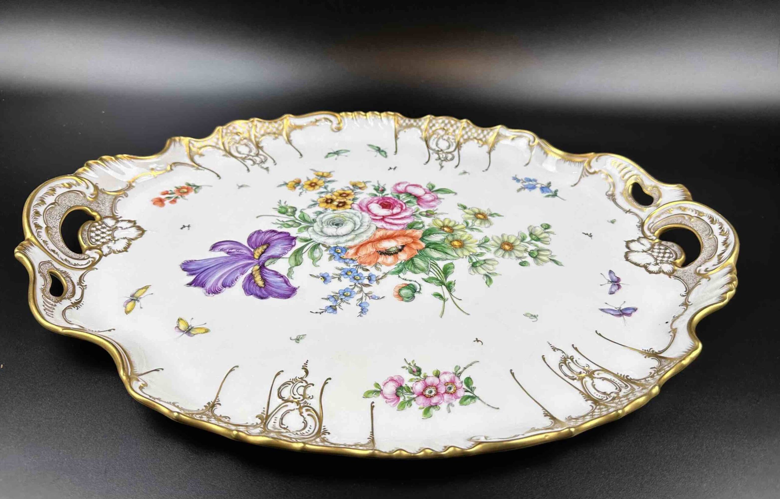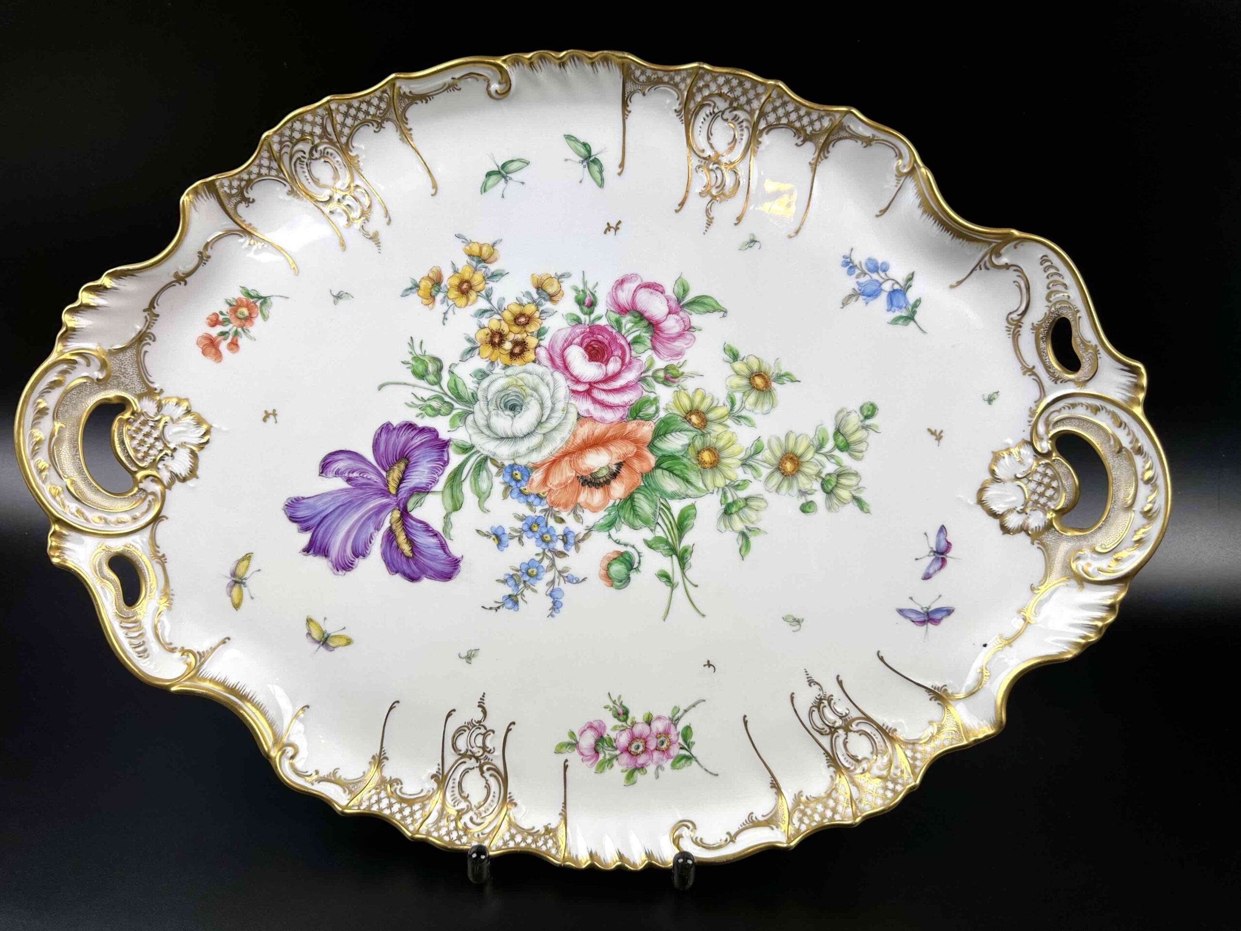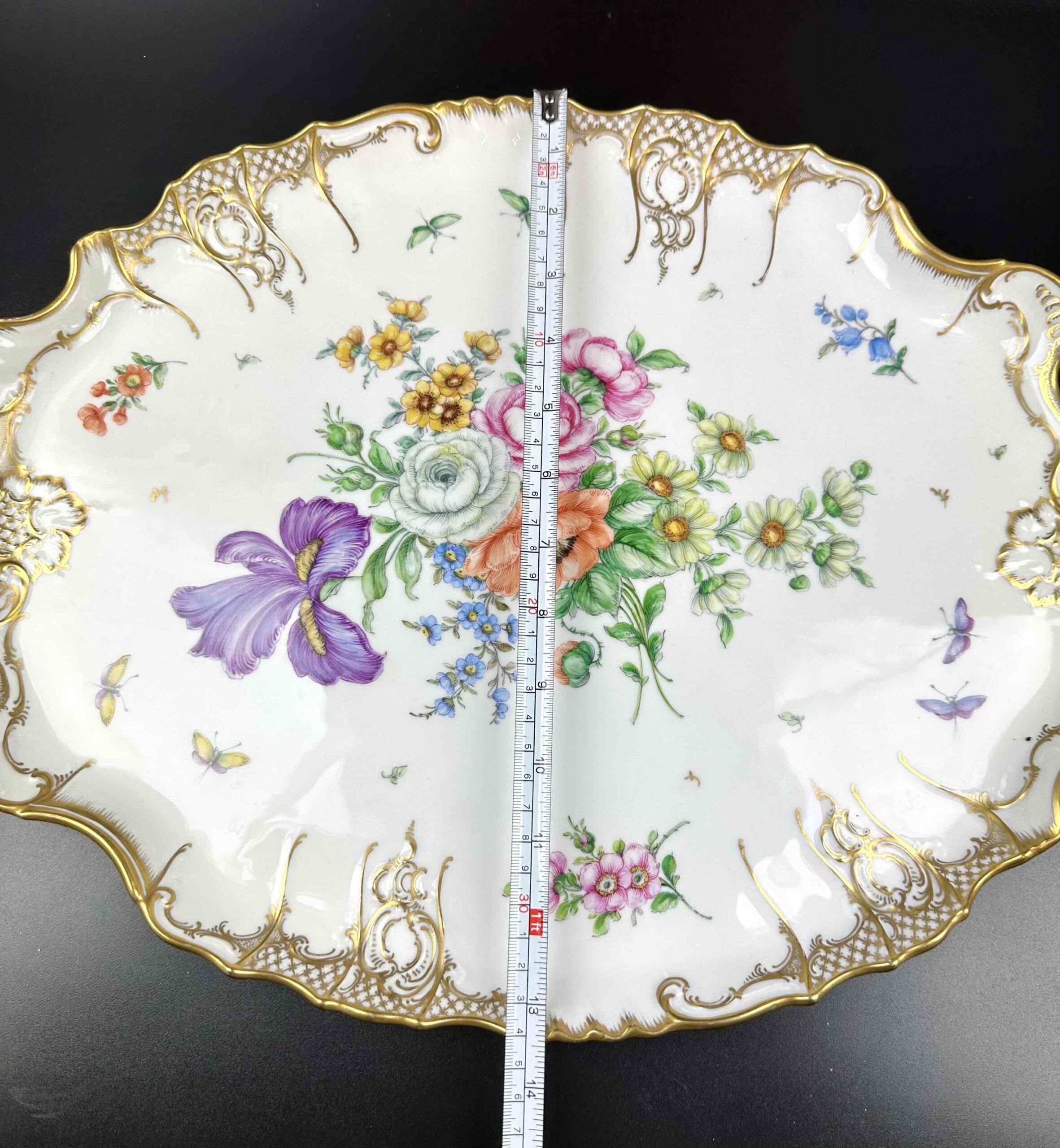 Dekoracja bogata w złocenia i motyw europejskich kwiatów ciętych w towarzystwie owadów. Stan zachowana – bez wad .