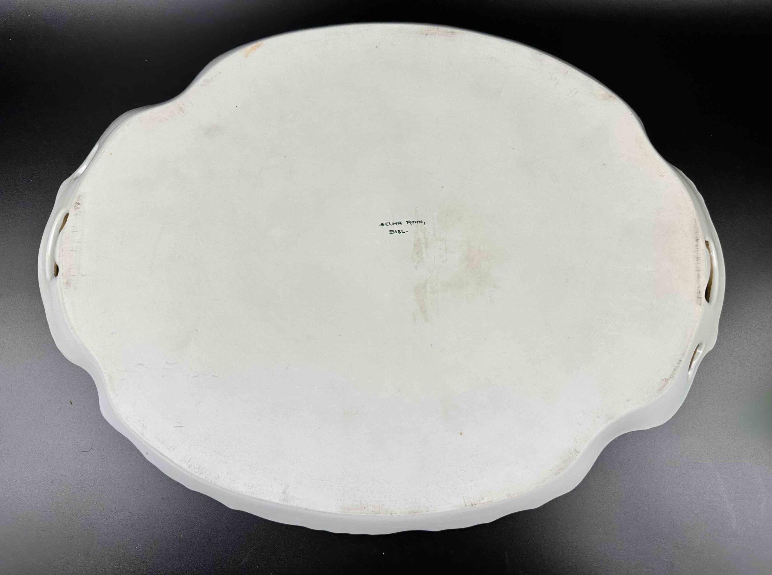 Taca posiada wycisk numeryczny oraz podpis artystki. Nie posiada sugnatury producenta porcelany, wskazówką może nyc to, ze artystka współpracowała z takimi manufakturami jak Thomas, Hutschenreuther czy Rosenthal.