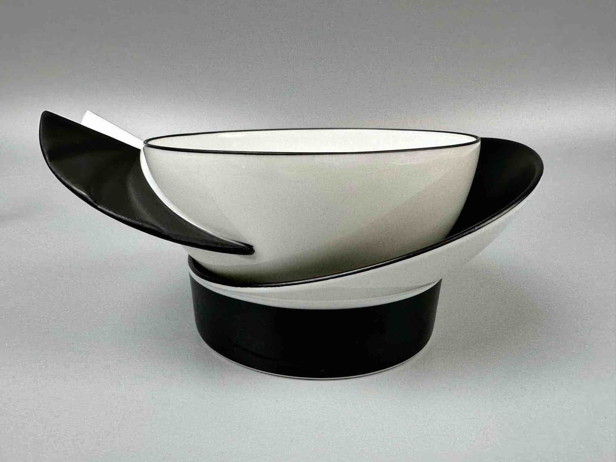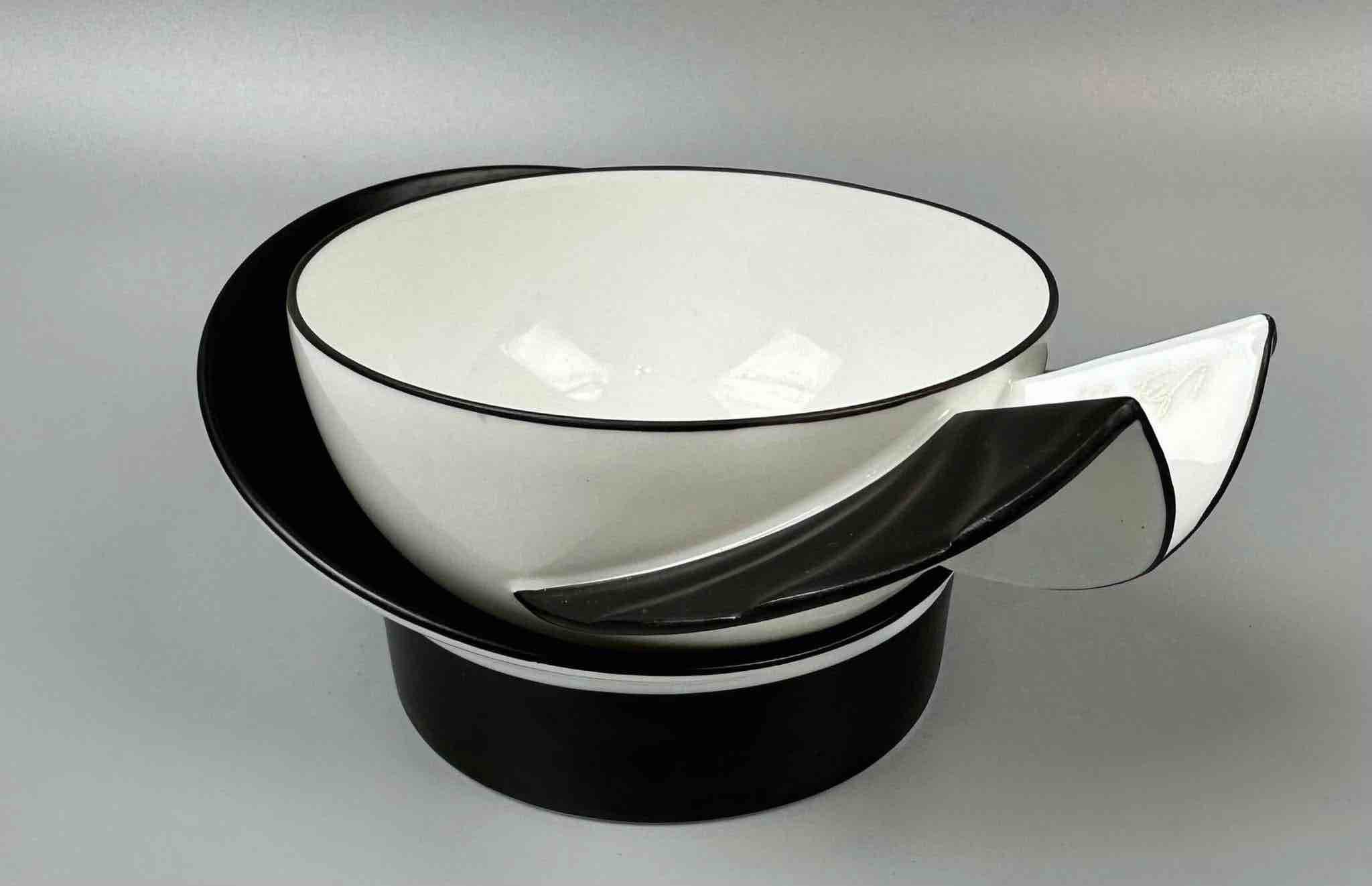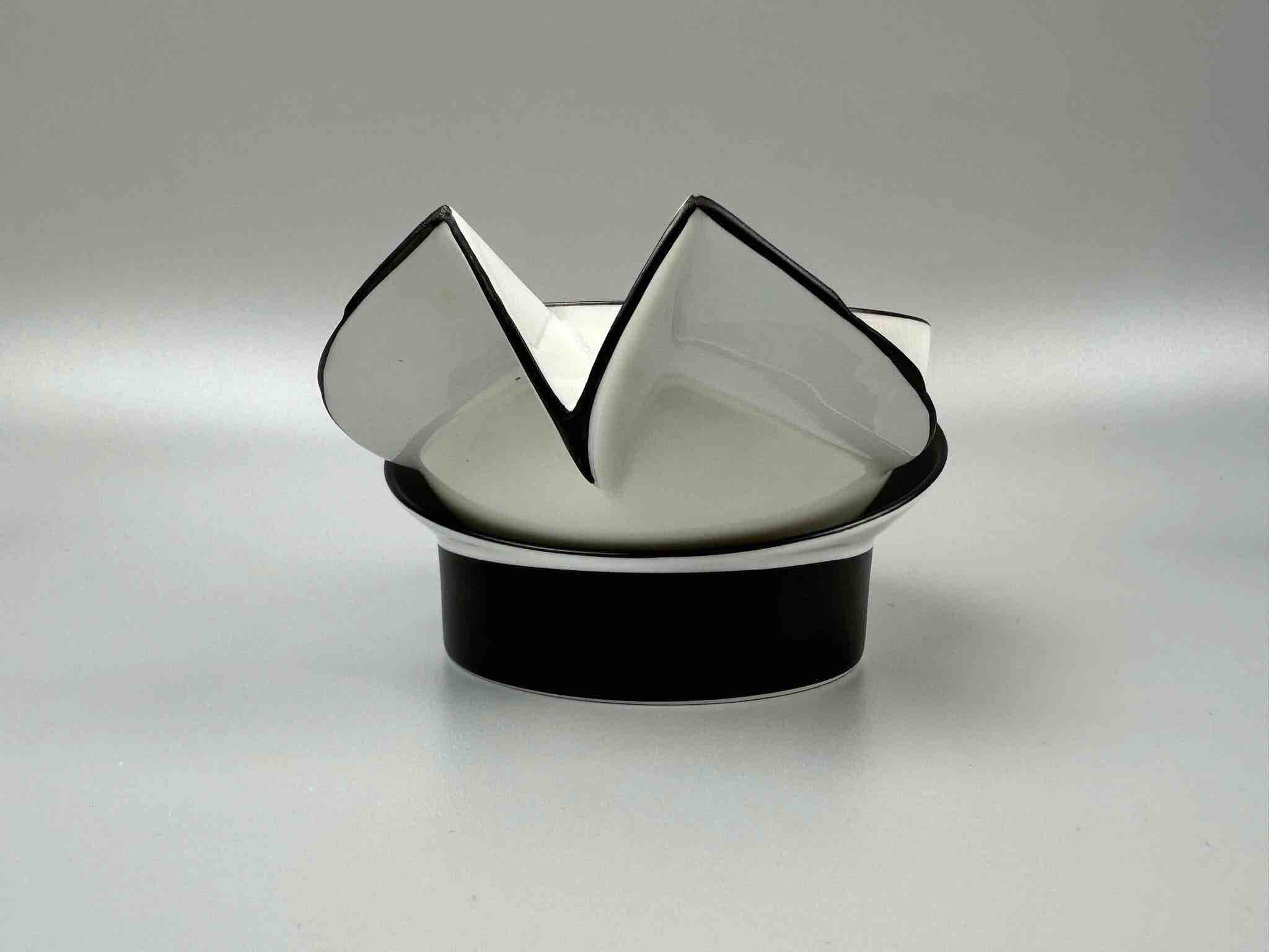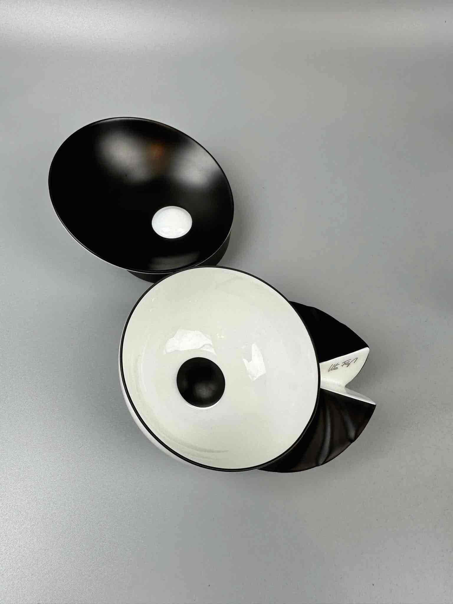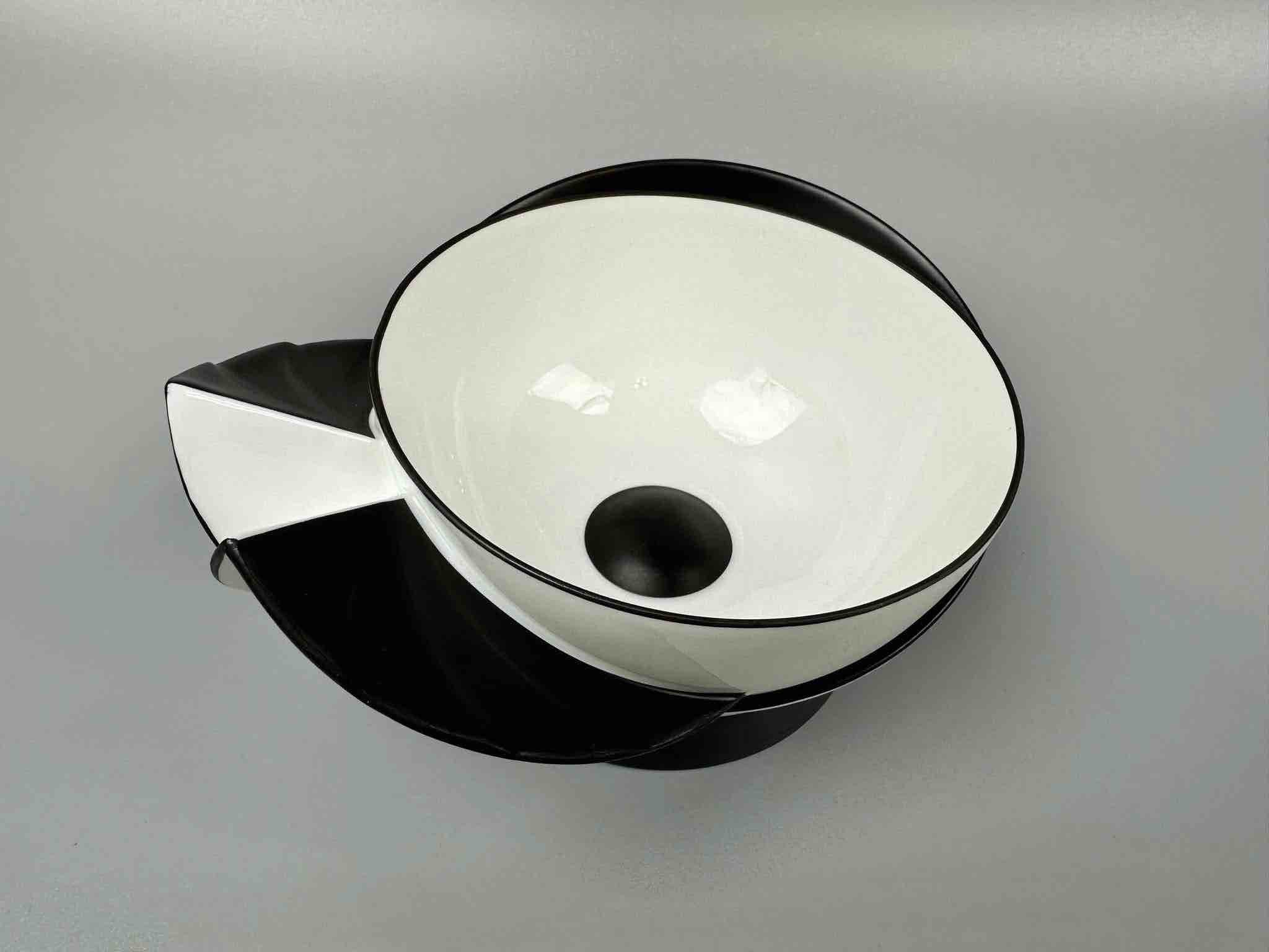 Ten kpl duo swym kształtem przypomina czarkę do herbaty osadzoną na asymetrycznym spodku, przy czym całość w swej asymetrii tworzy niezwykle zrównoważoną całość.. Filiżanka jest niska i szeroka, wykonana z delikatnej czarno-białej porcelany, czarny spodek rozłożysty, szeroki niczym wachlarz. Ciekawym zakończeniem tej intrygującej formy jest uszko w kształcie lekko rozłożonego wachlarza, nawiązując do stylu japońskiego.