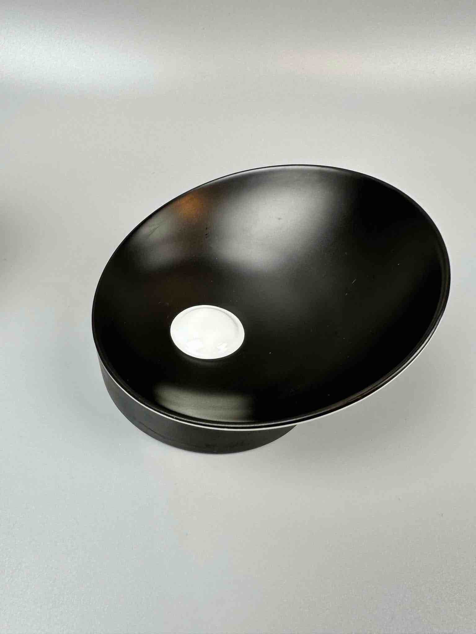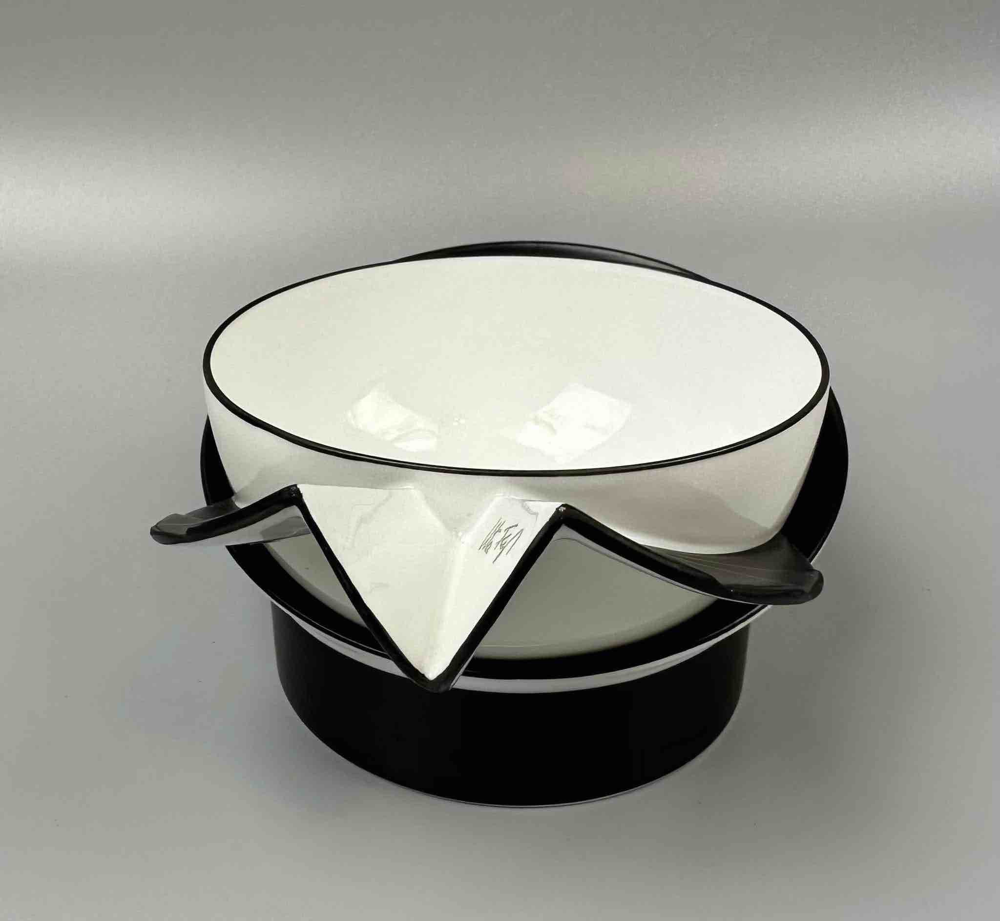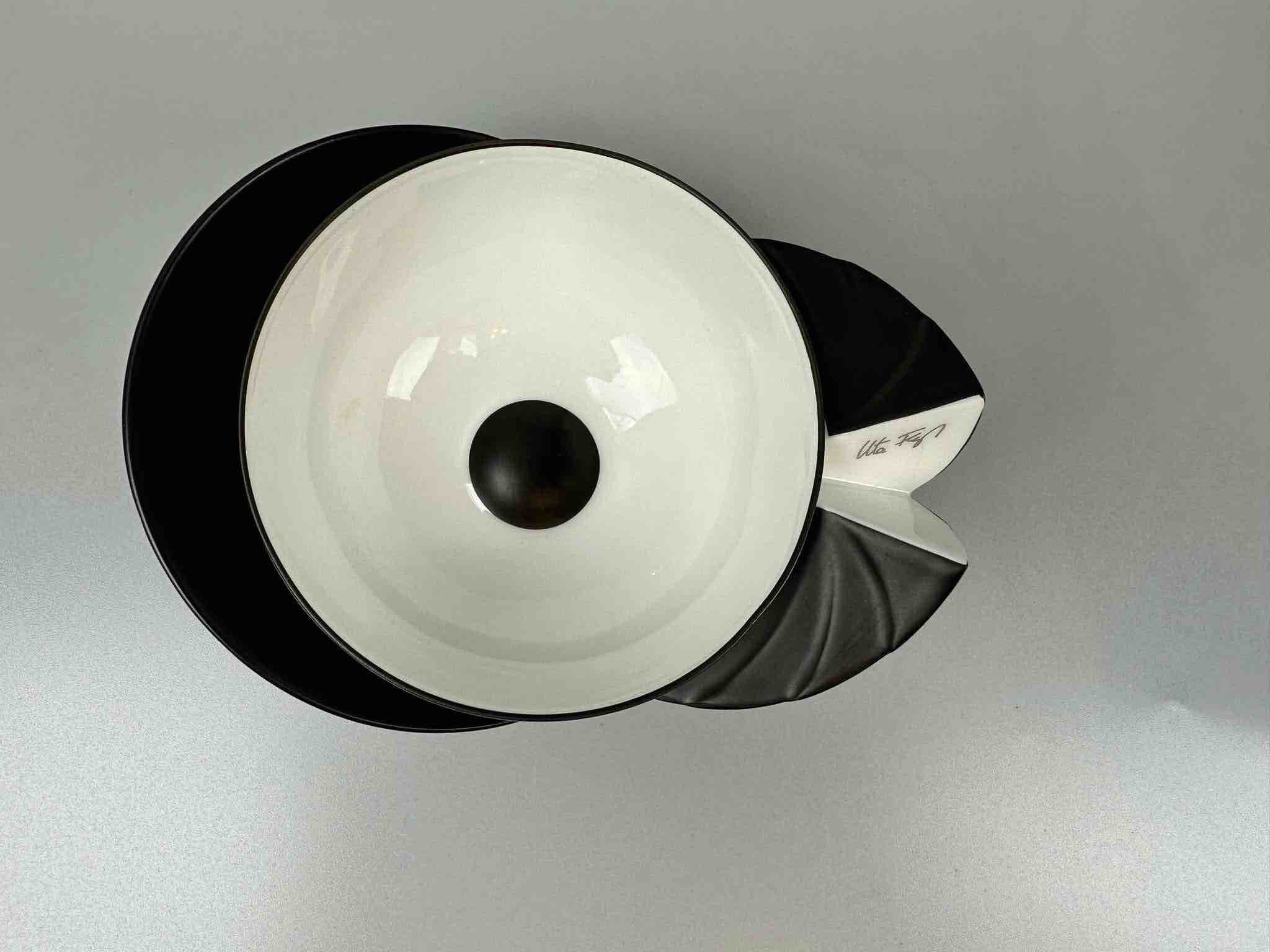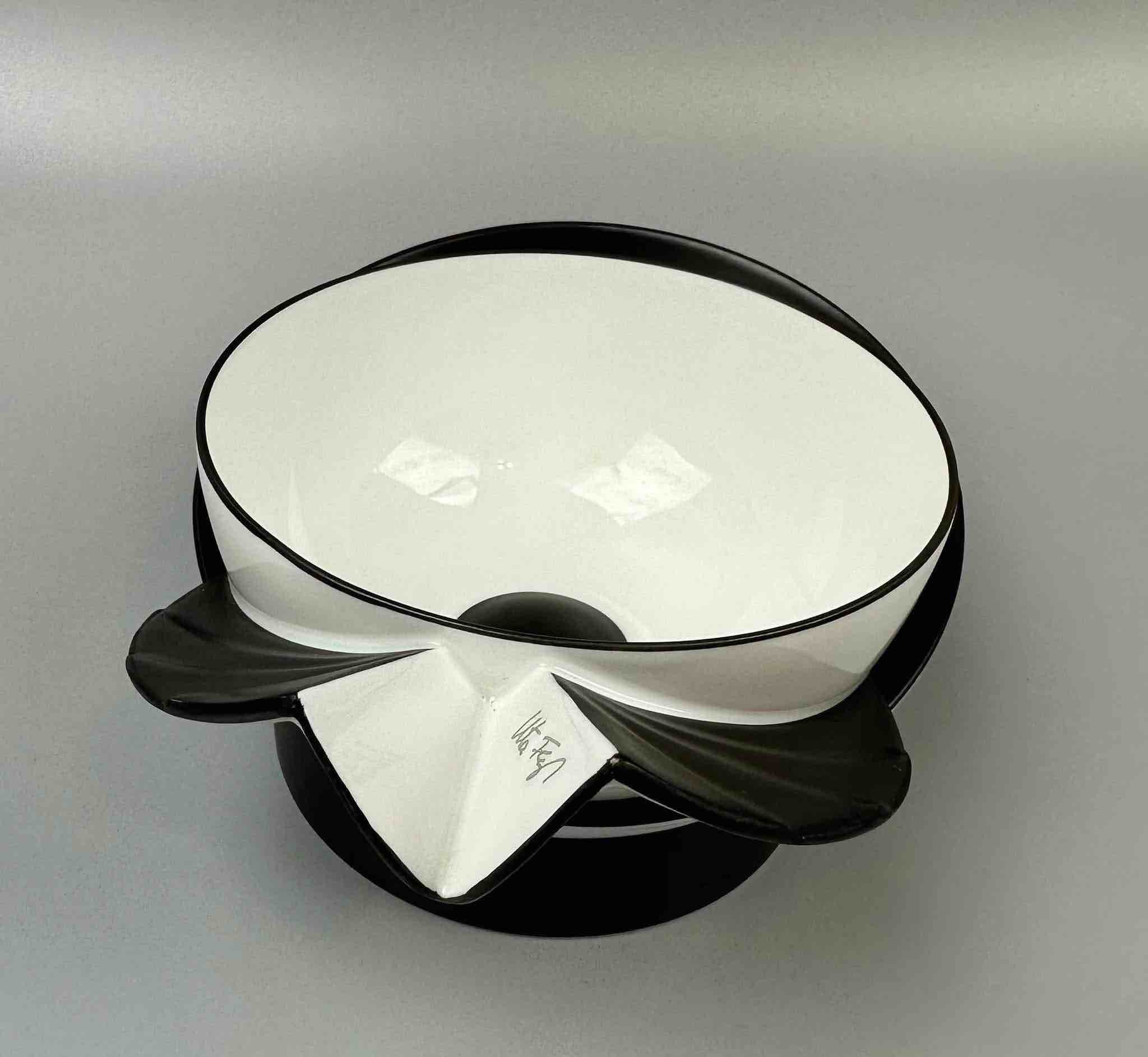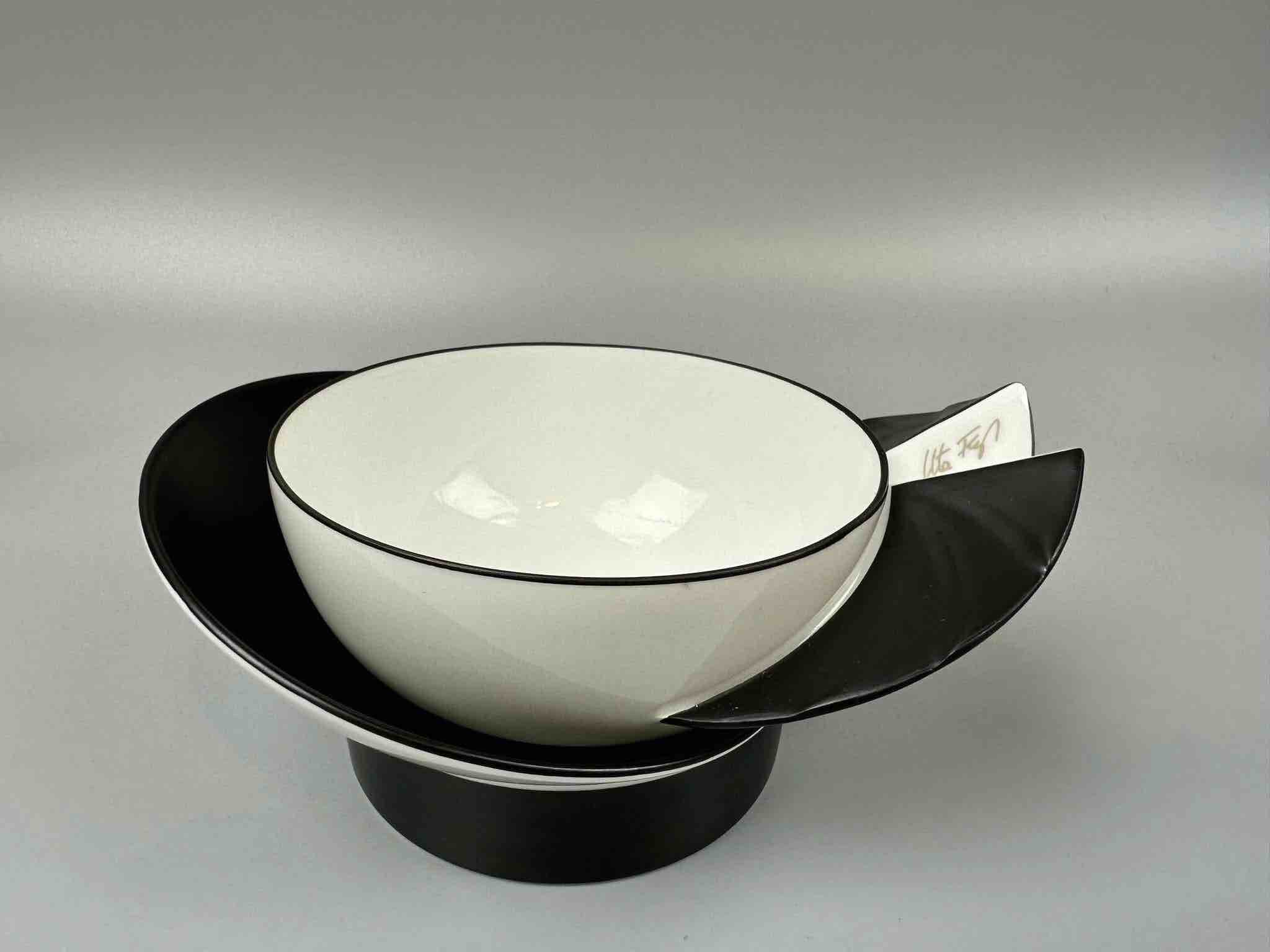 Ten kpl duo swym kształtem przypomina czarkę do herbaty osadzoną na asymetrycznym spodku, przy czym całość w swej asymetrii tworzy niezwykle zrównoważoną całość.. Filiżanka jest niska i szeroka, wykonana z delikatnej czarno-białej porcelany, czarny spodek rozłożysty, szeroki niczym wachlarz. Ciekawym zakończeniem tej intrygującej formy jest uszko w kształcie lekko rozłożonego wachlarza, nawiązując do stylu japońskiego.