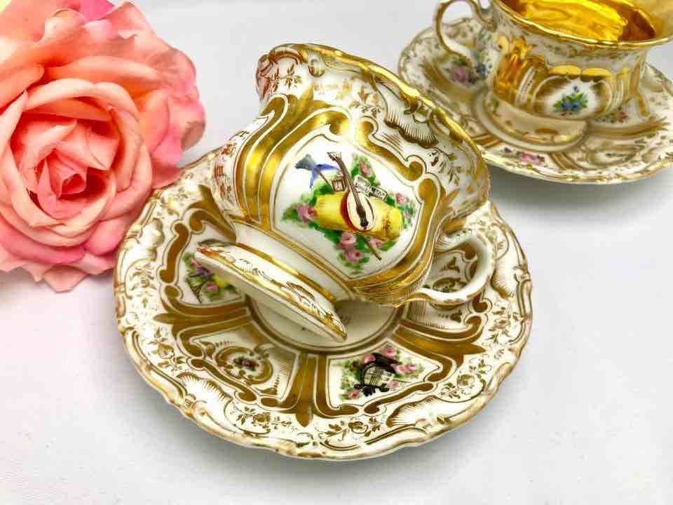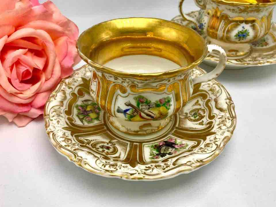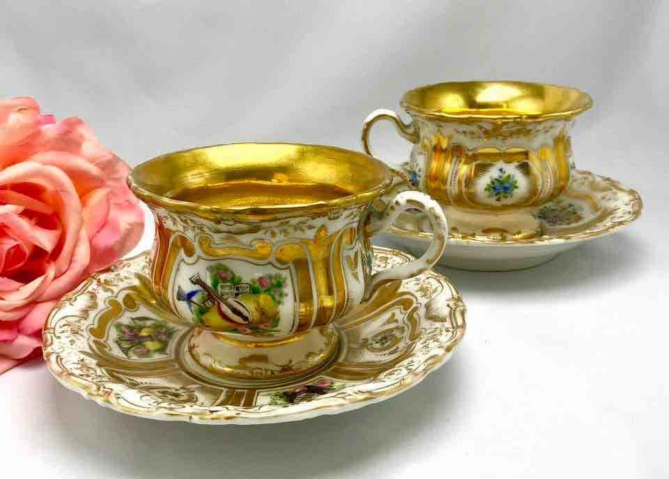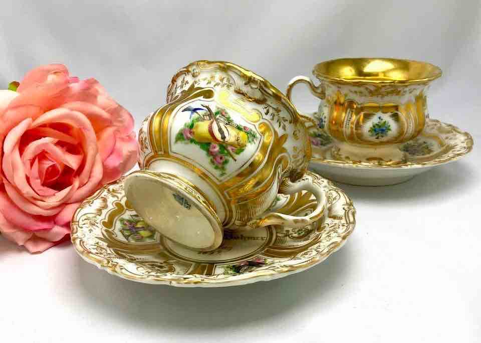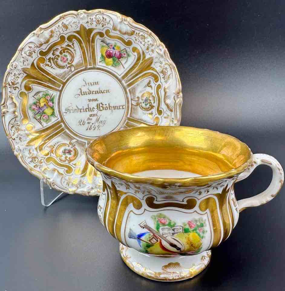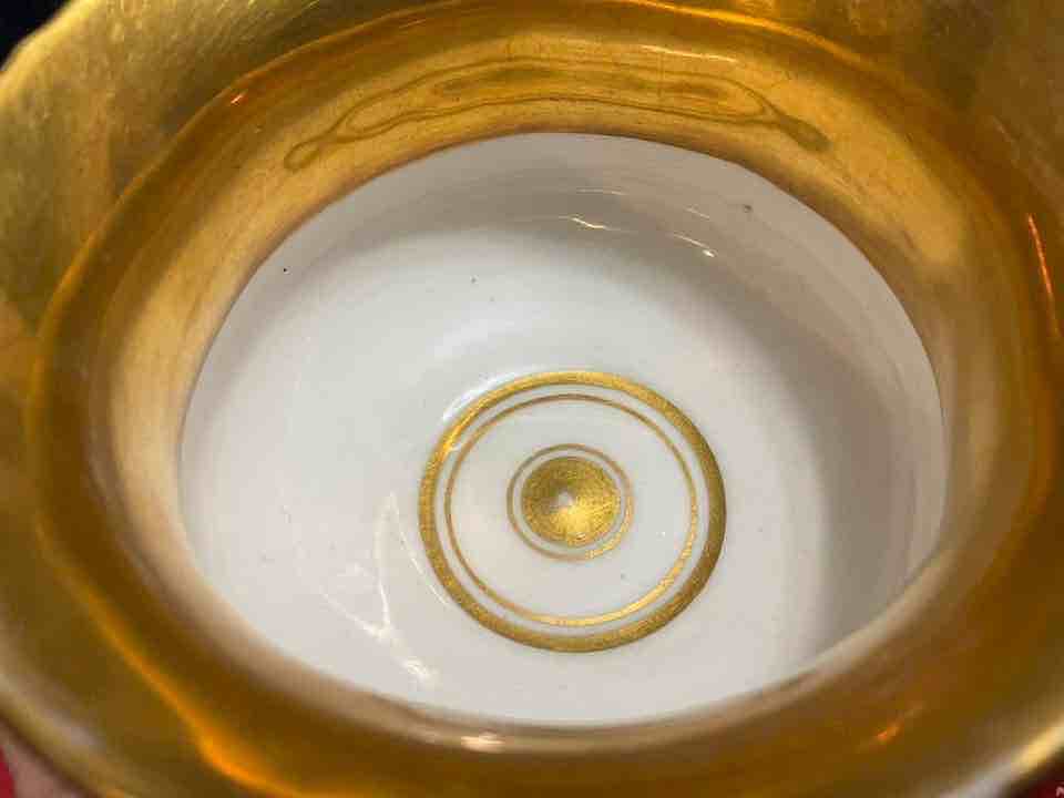 Filiżanka nie posiada pęknięć jedynie delikatne wytarcia złoceń, jej stan oceniam na bdb –