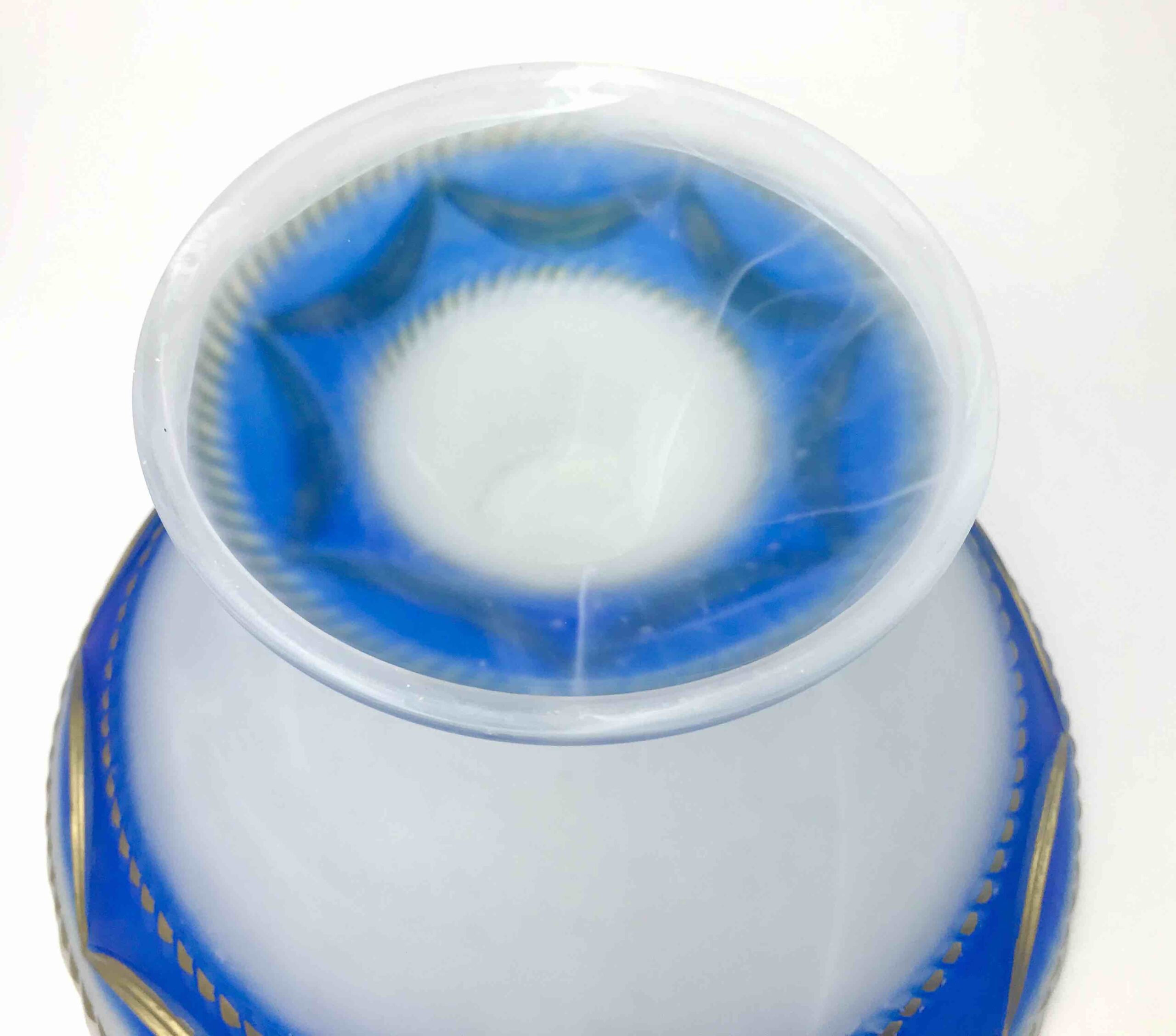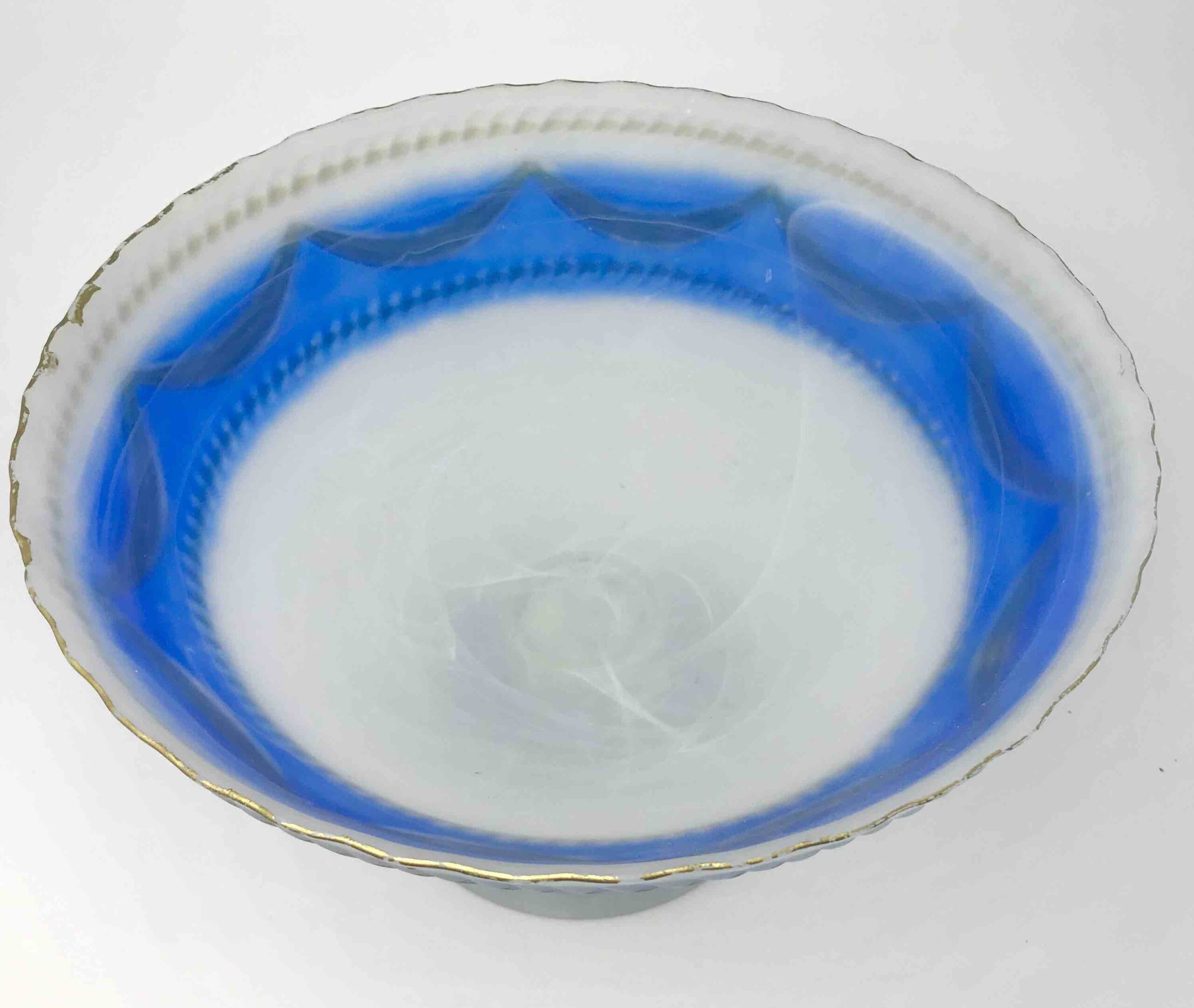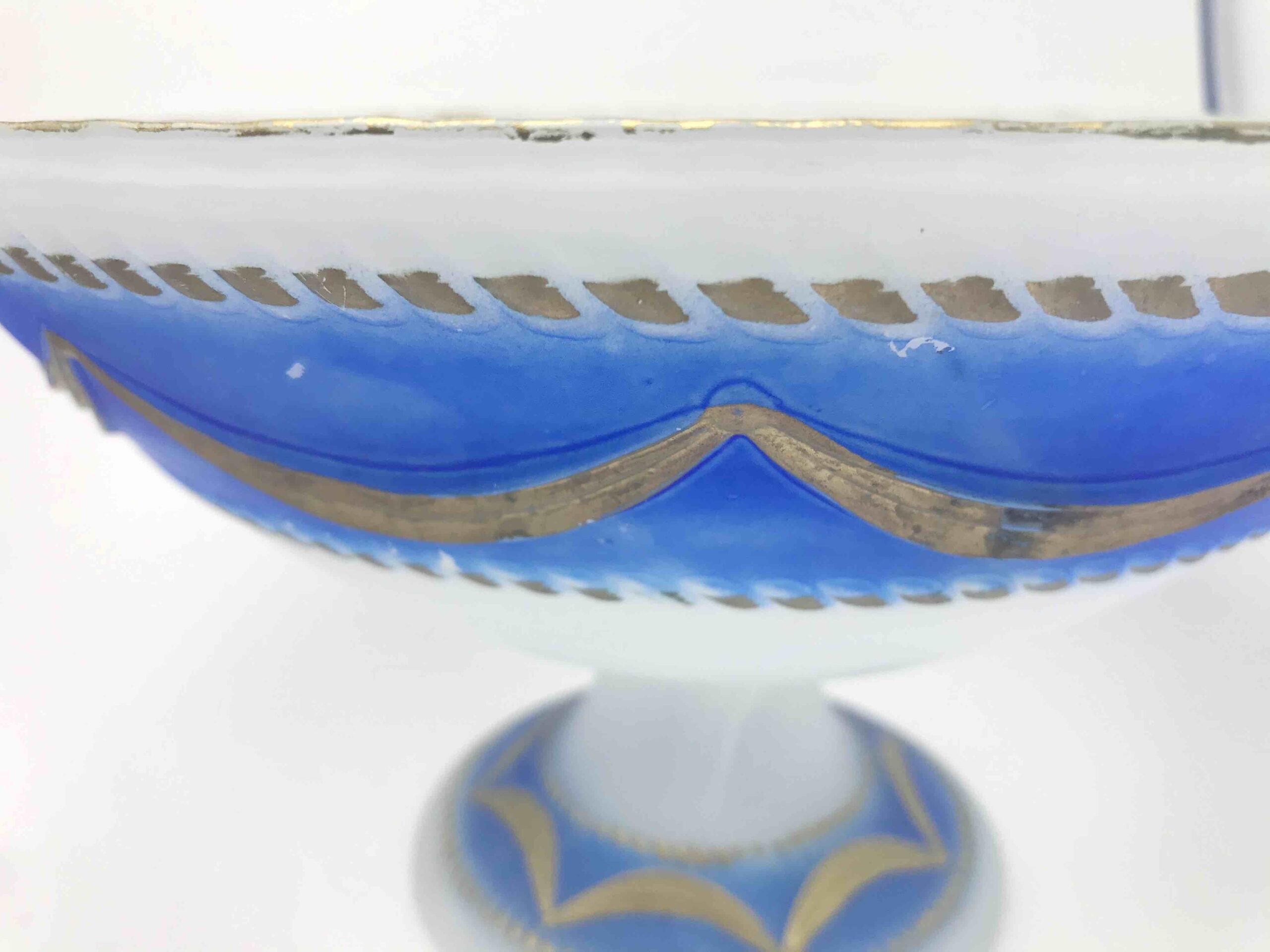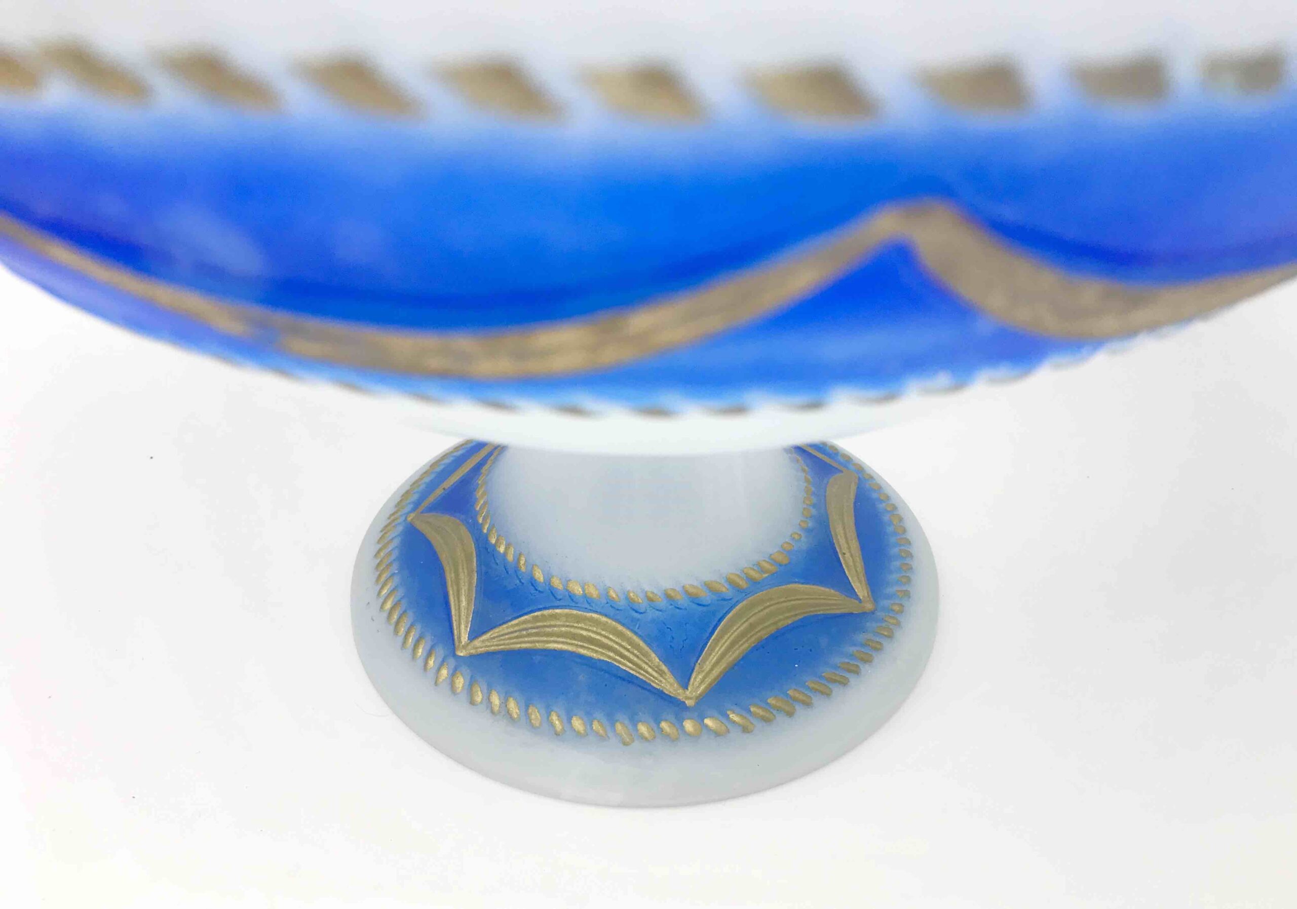 Elegancka, dekoracyjna patera wykonana z wysokiej jakości szkła opalinowego, w klasycznym stylu XIX-wiecznej produkcji środkowoeuropejskiej (Bohemia). Szkło o półtransparentnej, mlecznej strukturze z efektownym przejściem barwy (gradient) w odcieniach kobaltu / różu, zdobione ręcznie nanoszonym złoceniem.