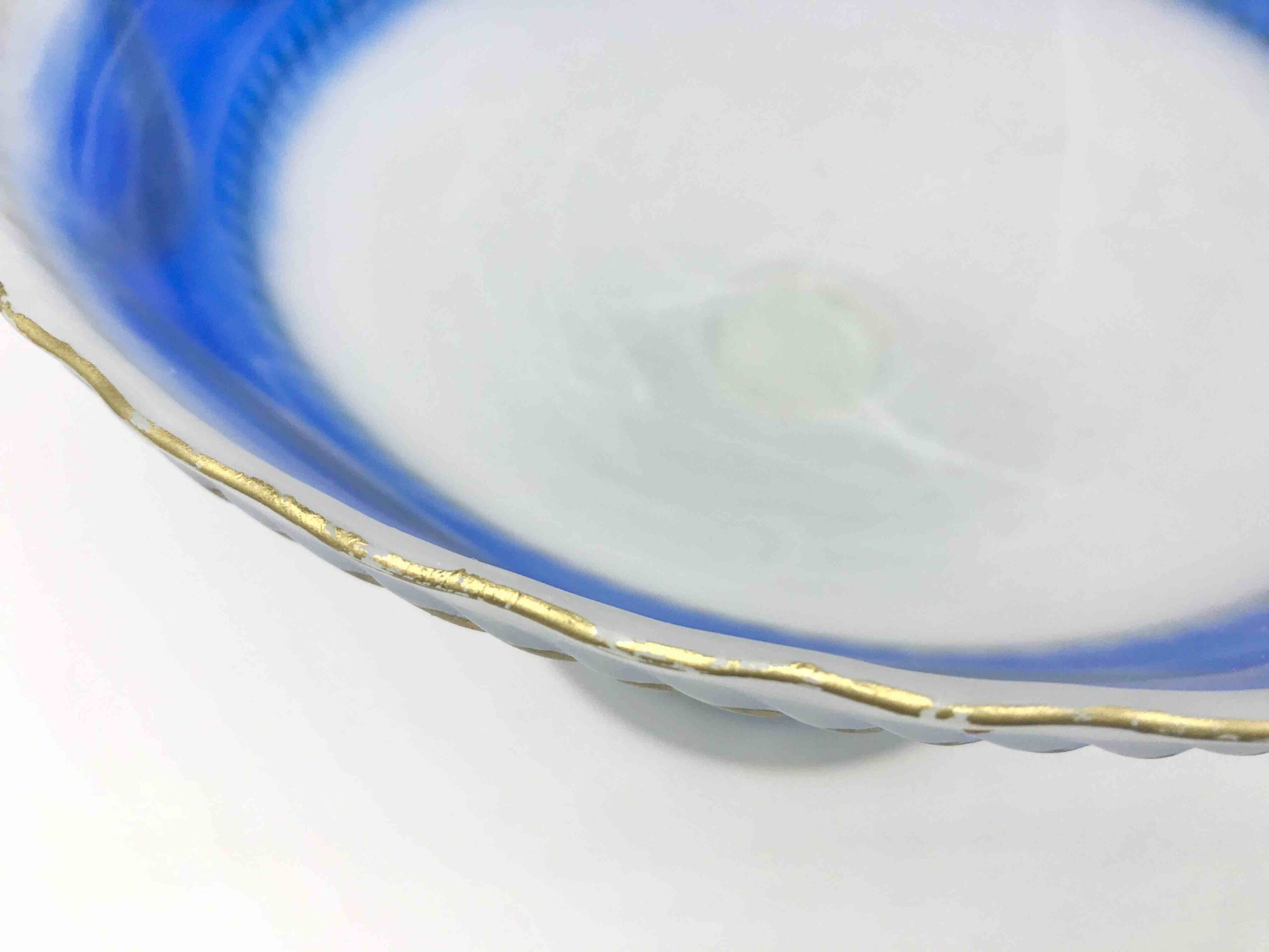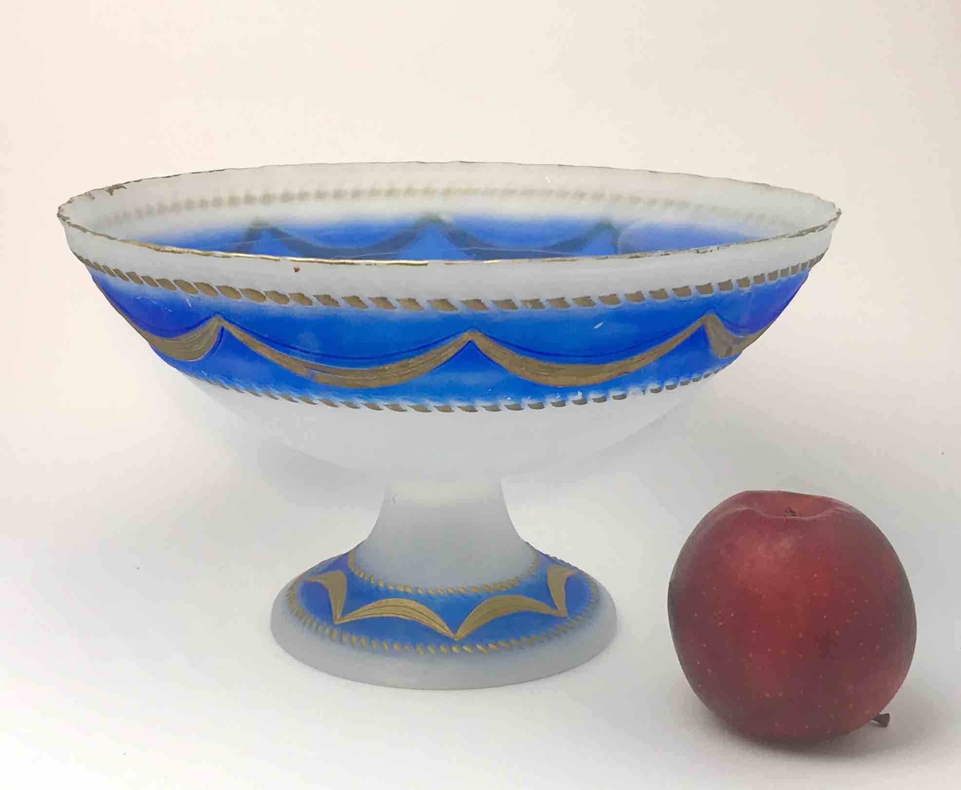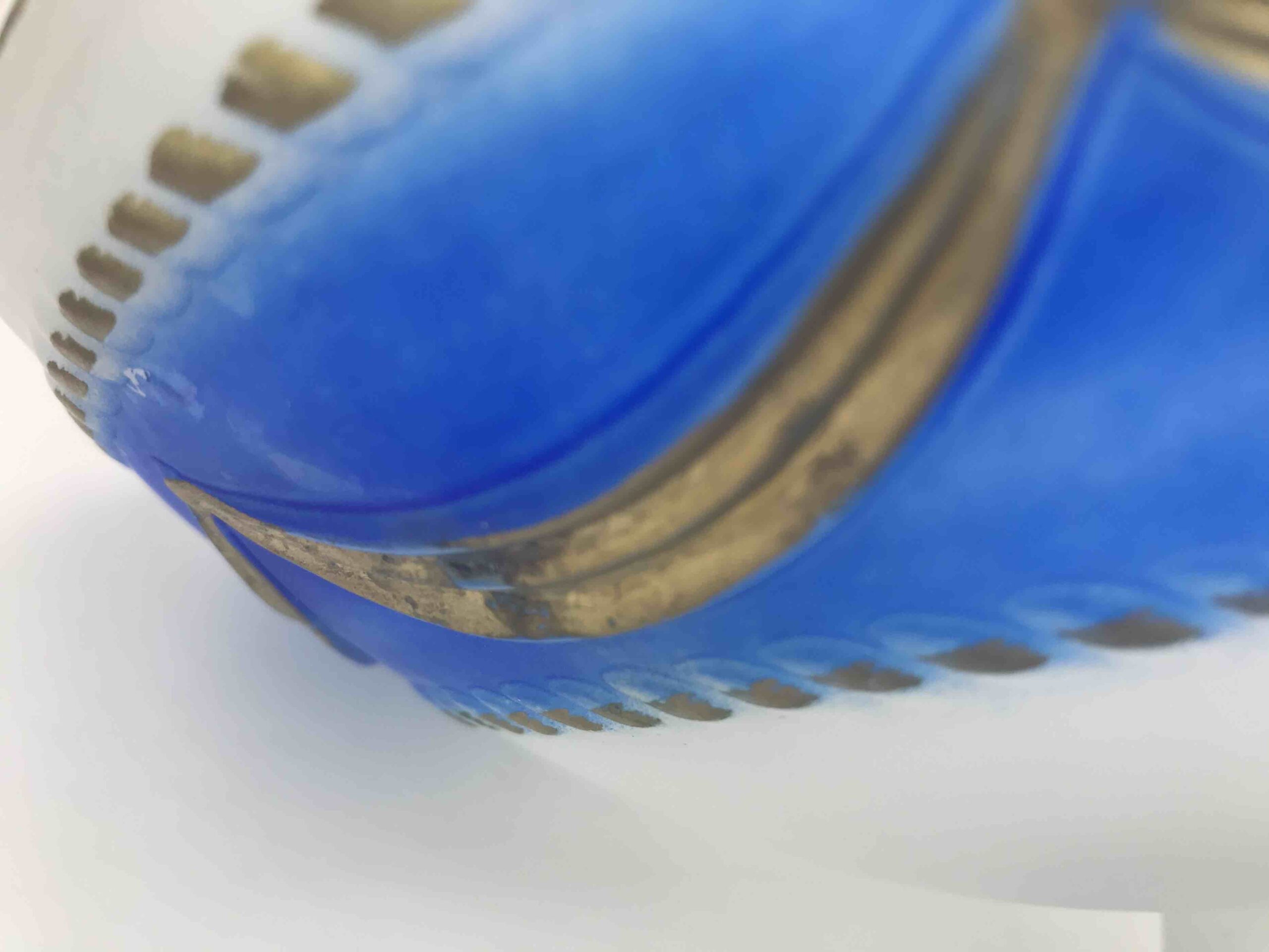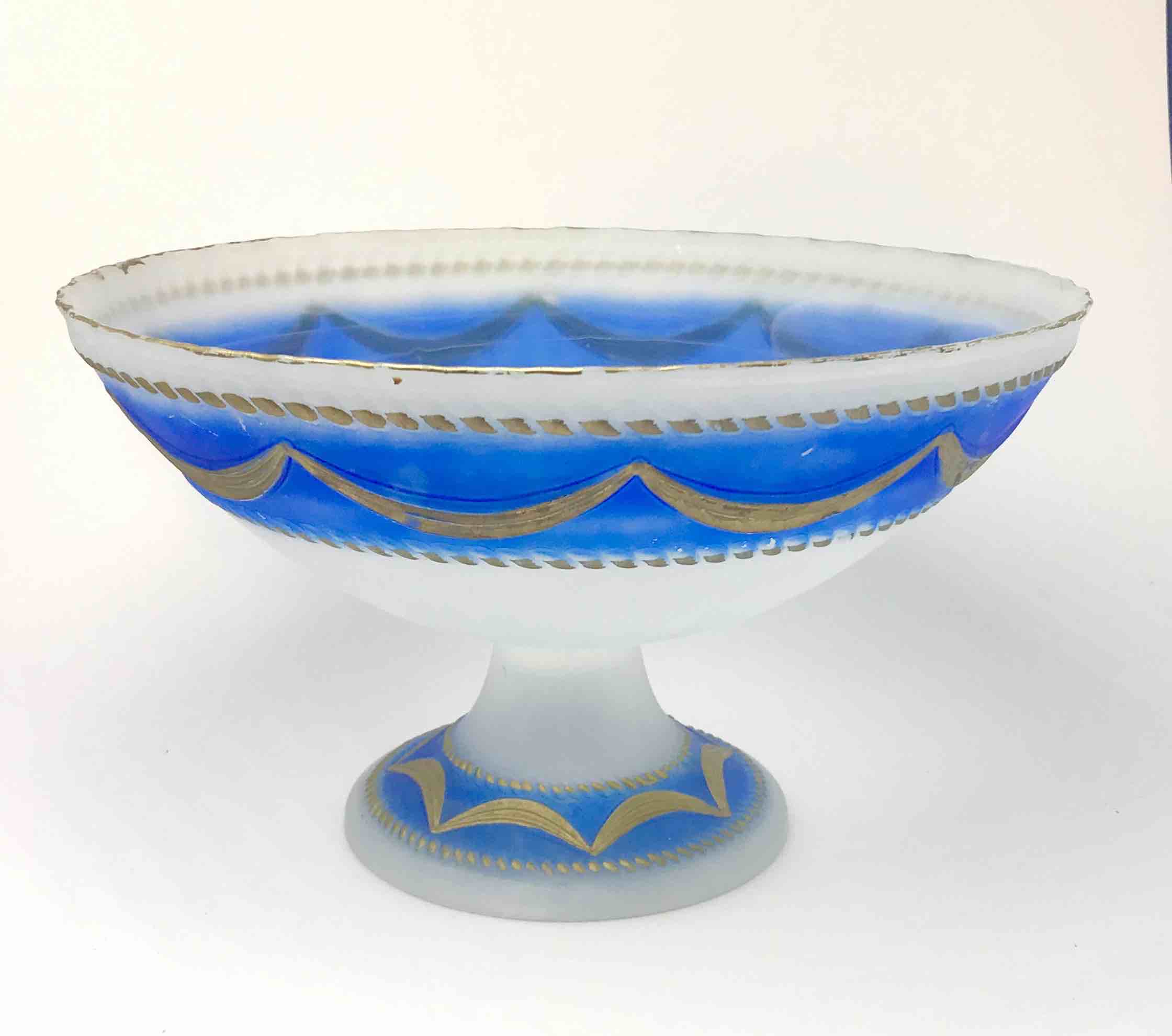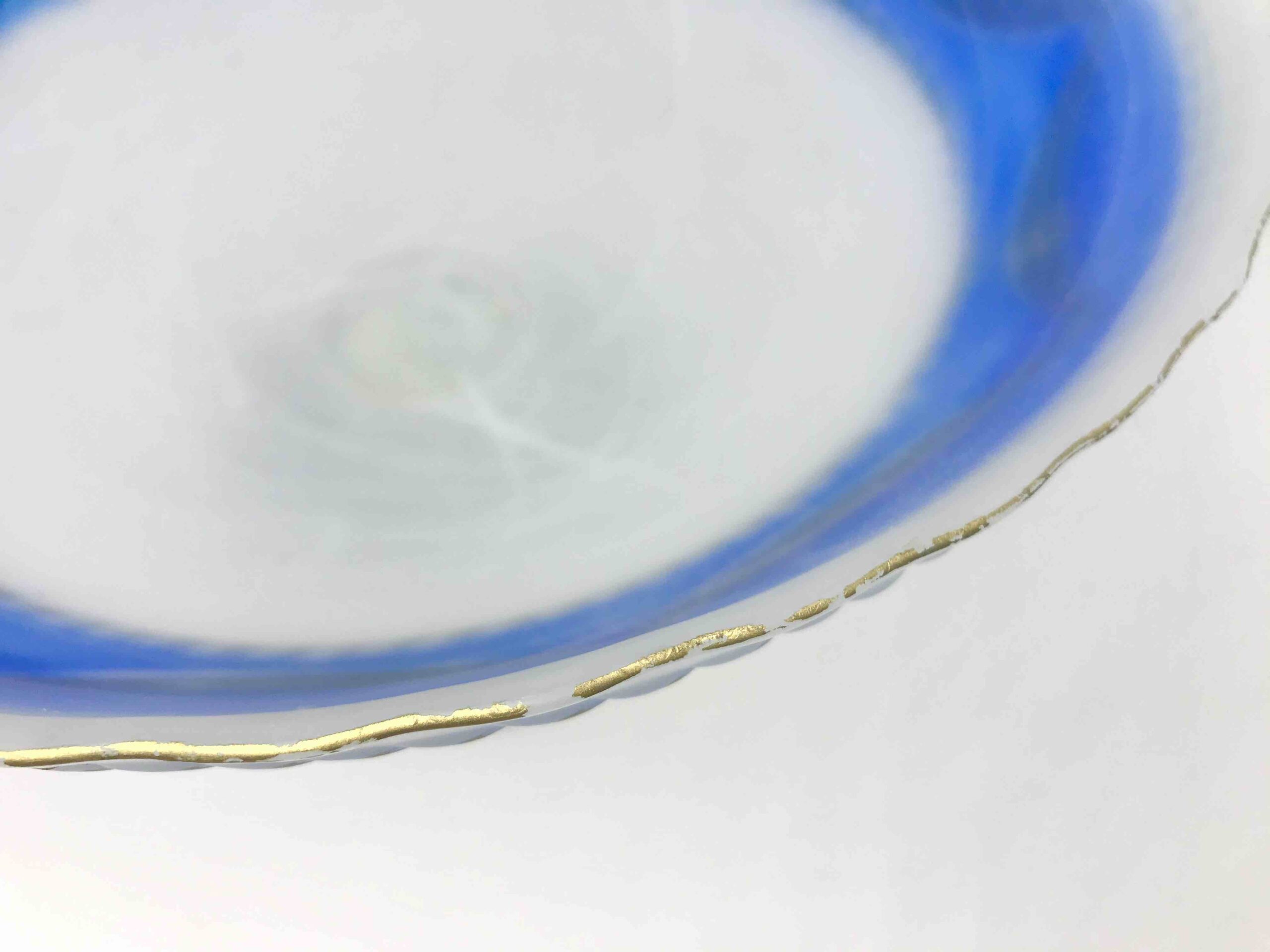 Elegancka, dekoracyjna patera wykonana z wysokiej jakości szkła opalinowego, w klasycznym stylu XIX-wiecznej produkcji środkowoeuropejskiej (Bohemia). Szkło o półtransparentnej, mlecznej strukturze z efektownym przejściem barwy (gradient) w odcieniach kobaltu / różu, zdobione ręcznie nanoszonym złoceniem.