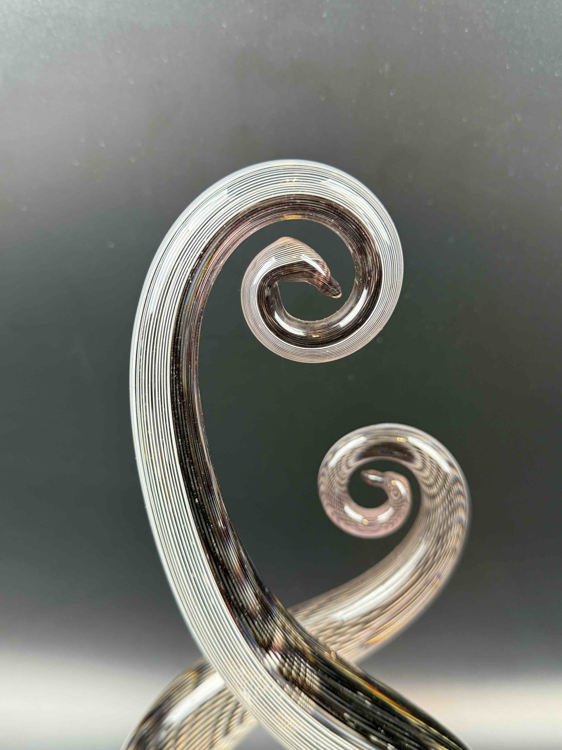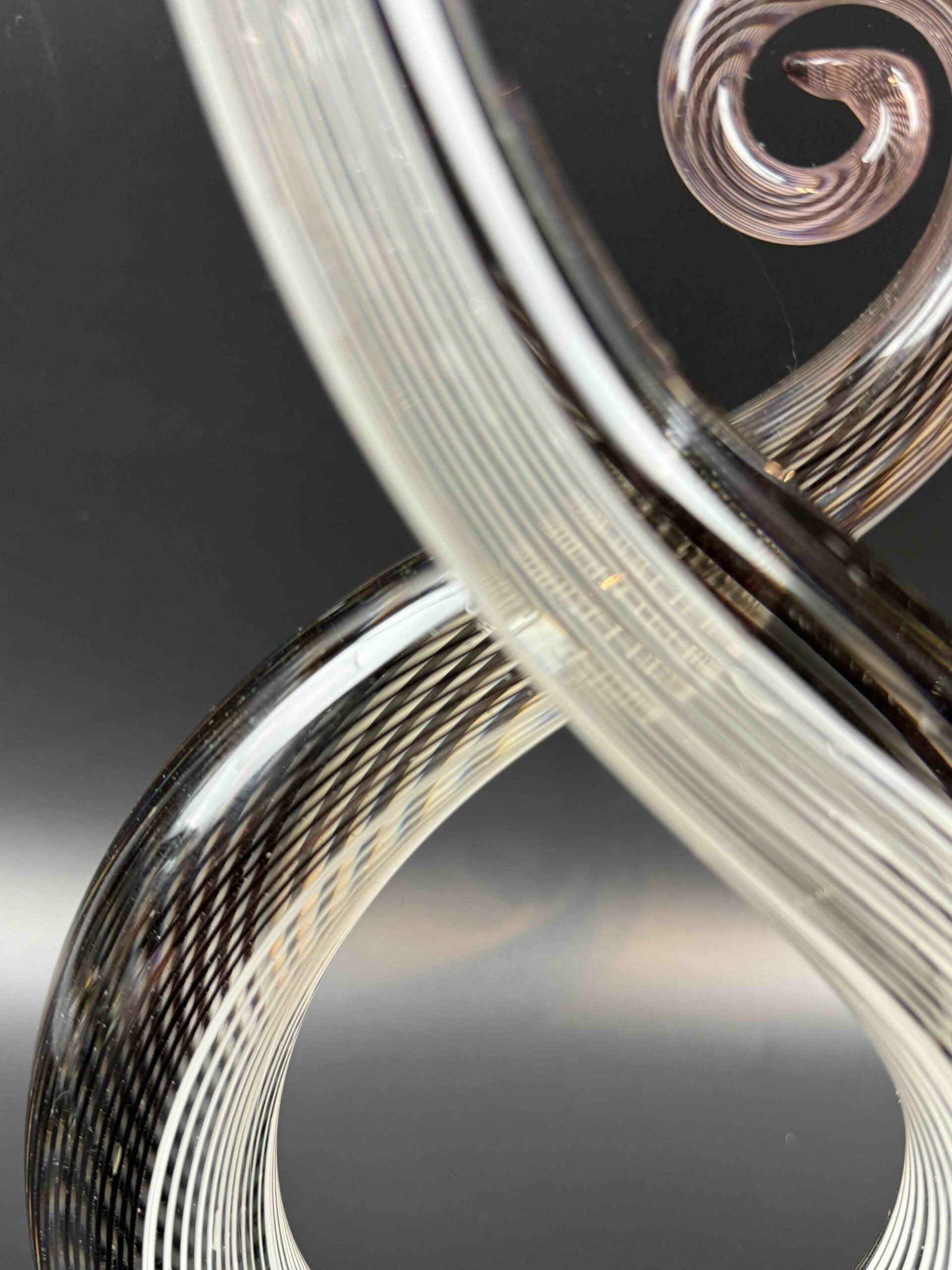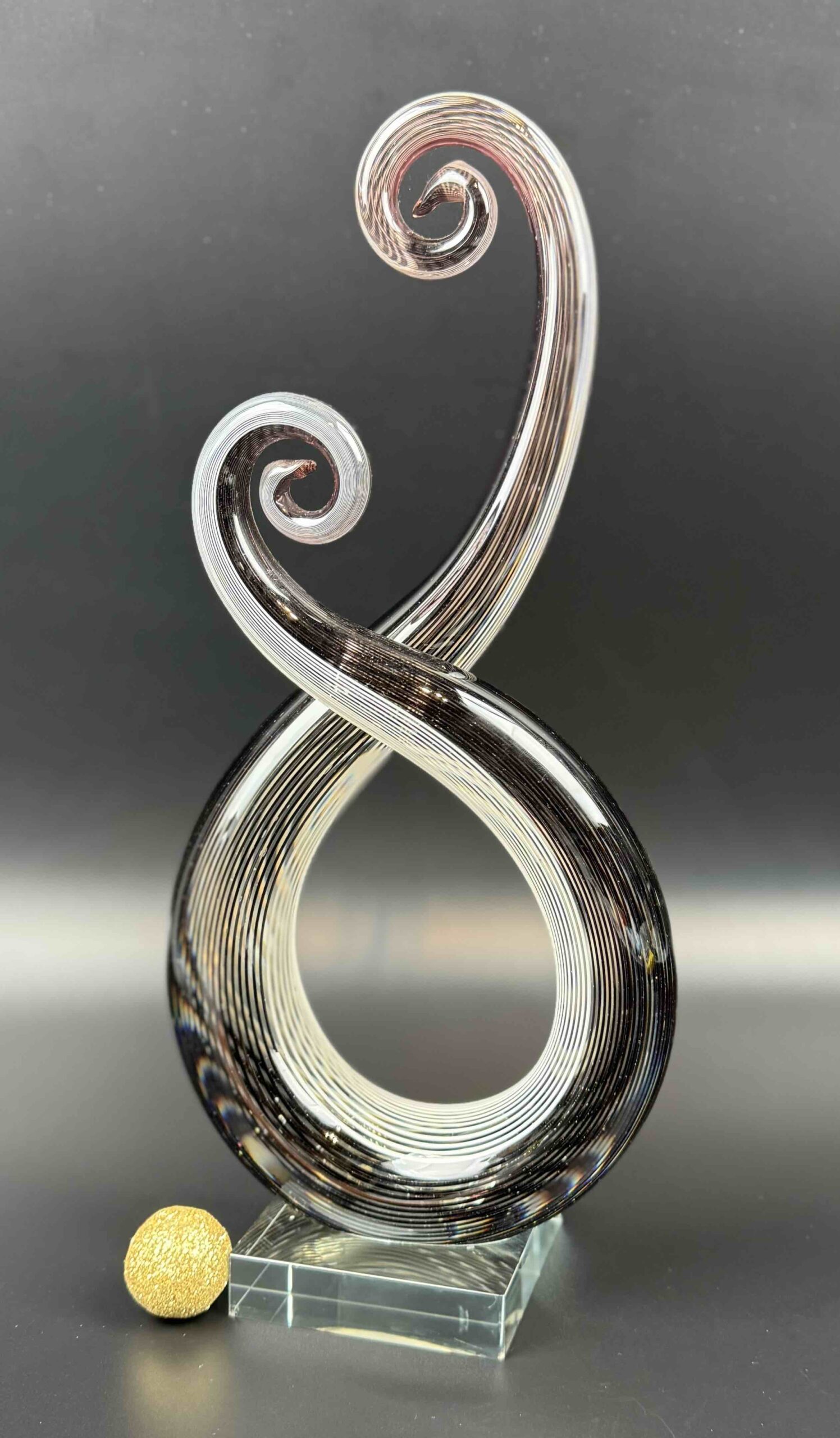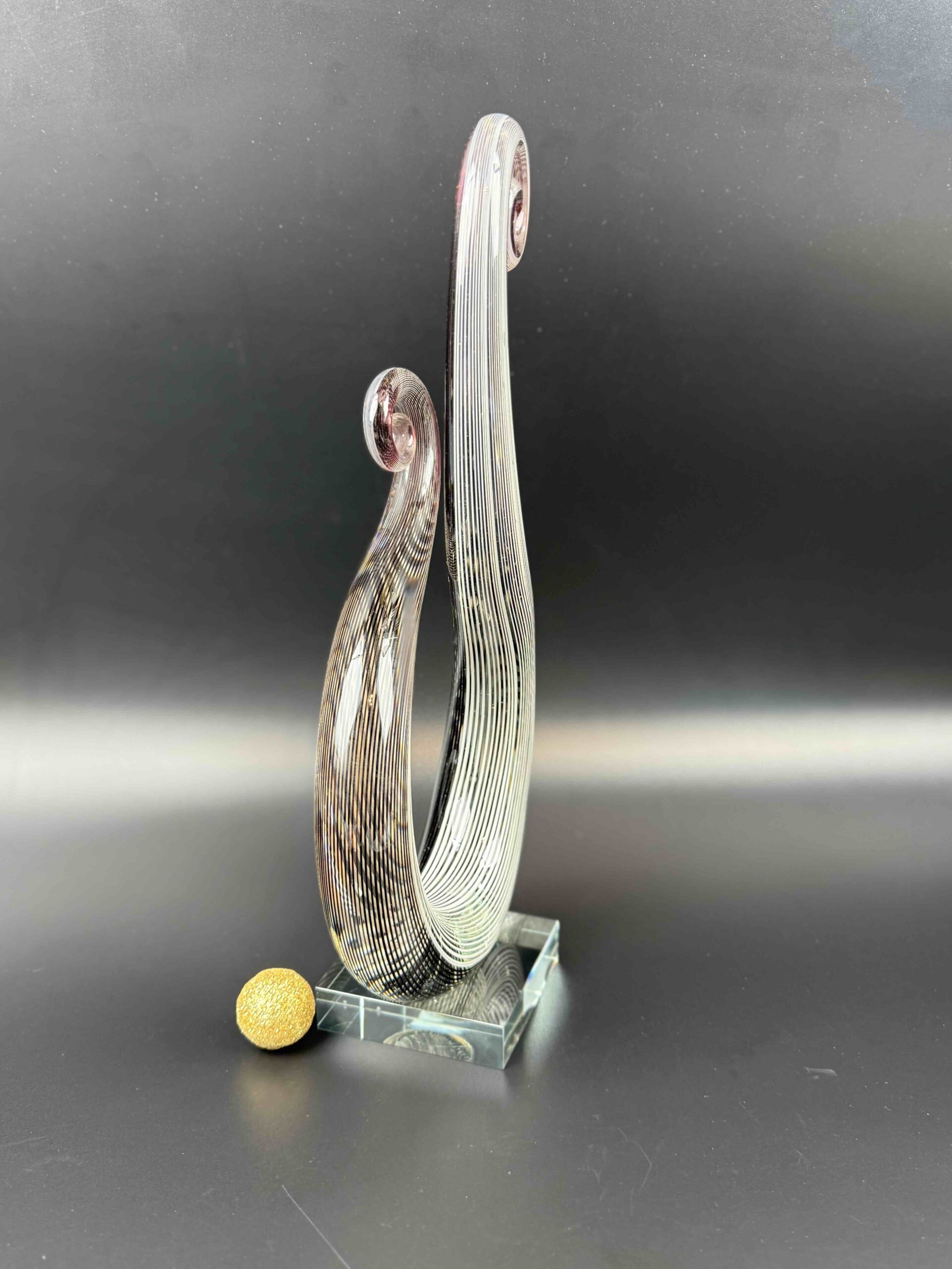To rzeźba dekoracyjna ze szkła artystycznego, o eleganckiej, abstrakcyjnej formie – w stylu Murano