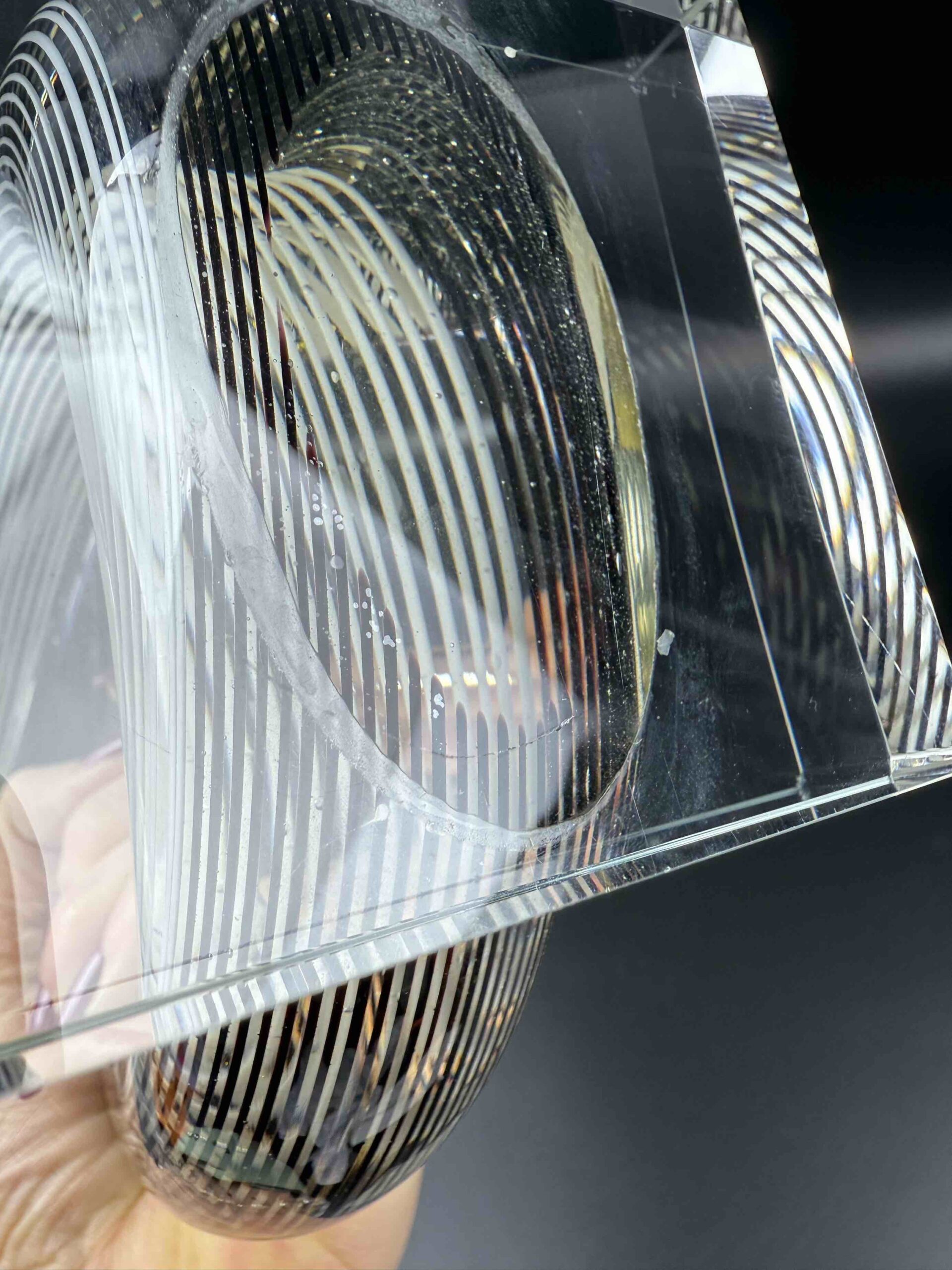 Szkło przeźroczyste z zatopionymi białymi i czarnymi liniami.