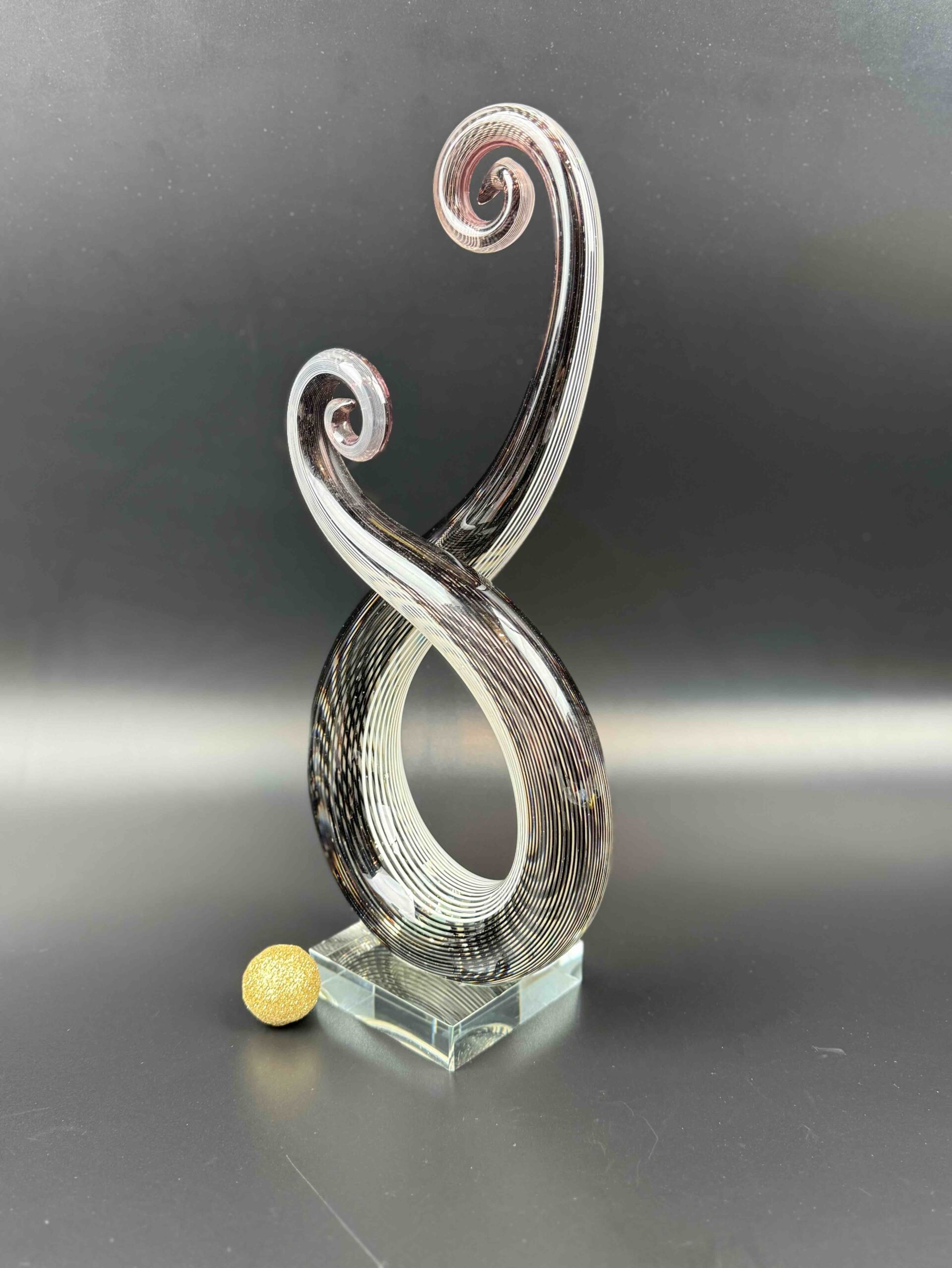 Bryła jest wysmukła, płynna, dwuzwojowa, przypominająca znak nieskończoności lub stylizowane fale. Dwie pętle szkła krzyżują się, tworząc harmonijną, dynamiczną kompozycję.