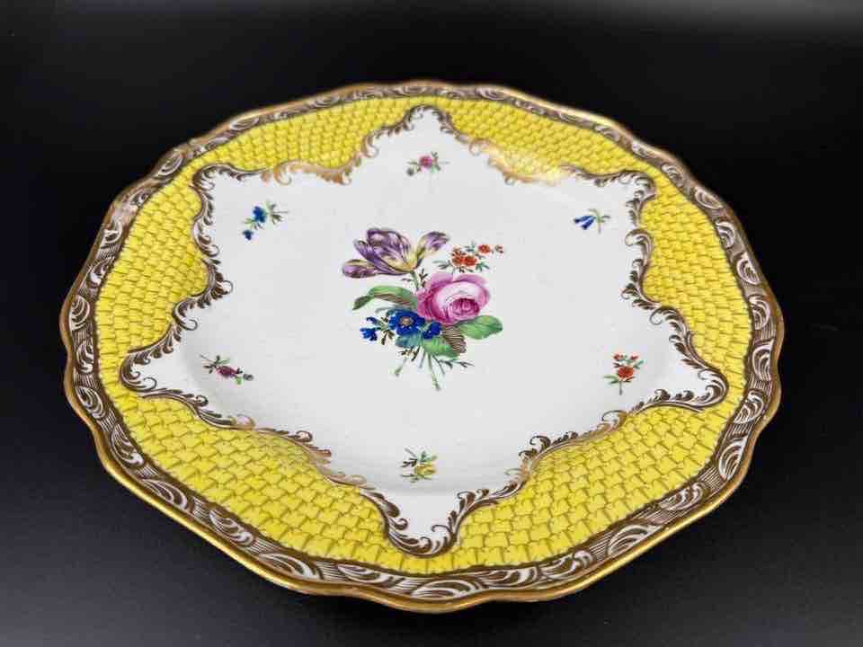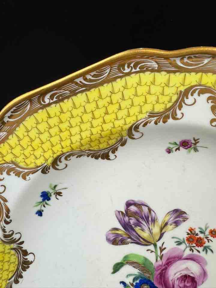 Najbardziej wyróżniającym elementem jest szeroki rant w intensywnym, żółtym odcieniu. Faktura przypomina misterny deseń łusek. Brzeg talerza wykończony jest falistą linią, podkreśloną złotą obwódką. Złote ornamenty pojawiają się też wewnątrz, w formie ozdobnych zawijasów harmonijnie przechodzących w biały środek naczynia. Dodatkowe małe kwiatki, rozmieszczone symetrycznie przy granicy pola środkowego, subtelnie uzupełniają całość.