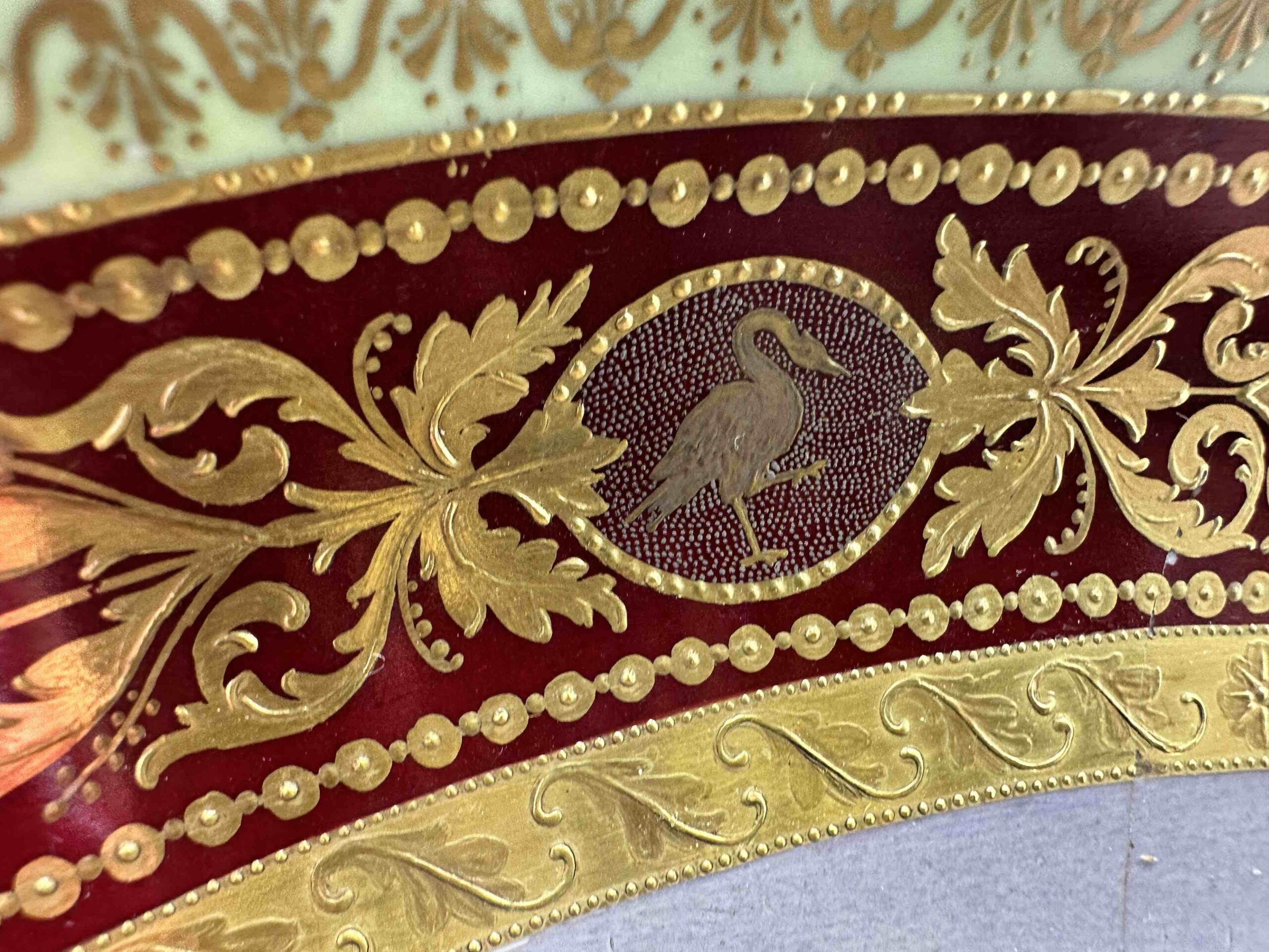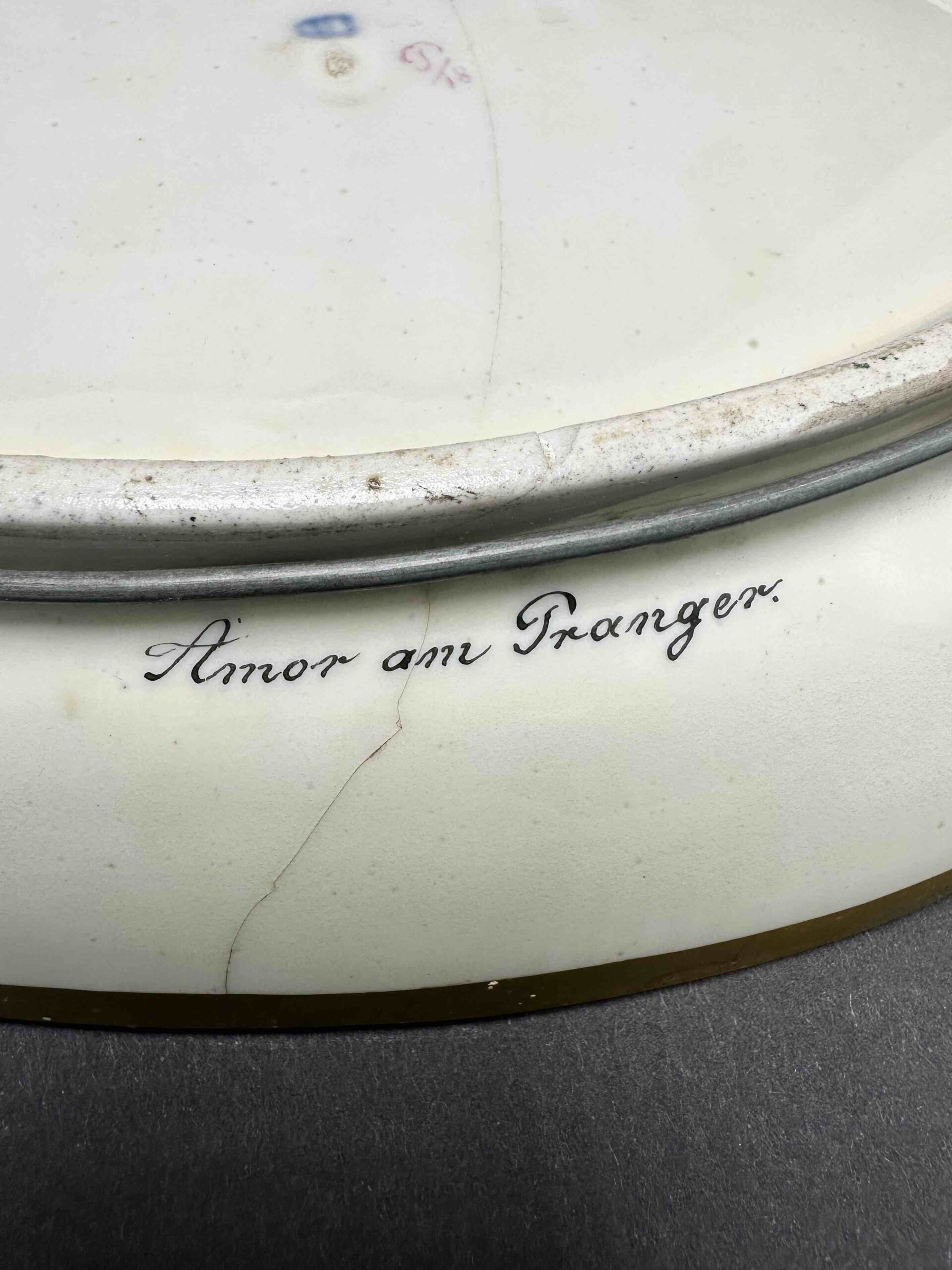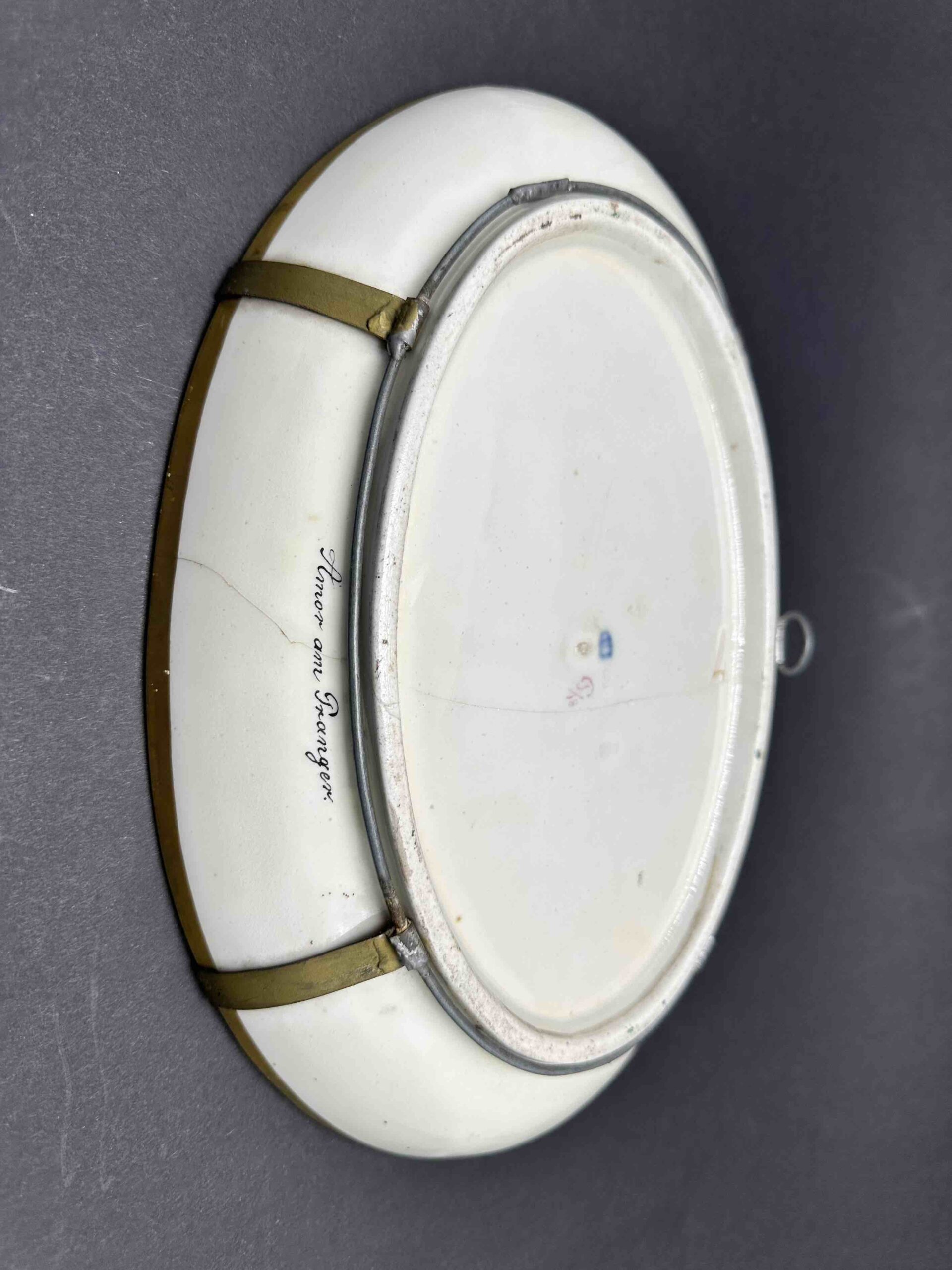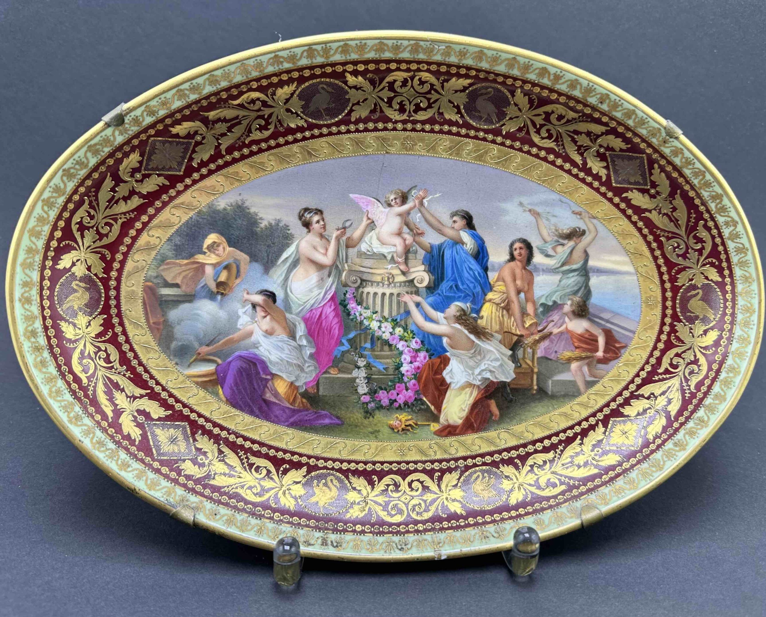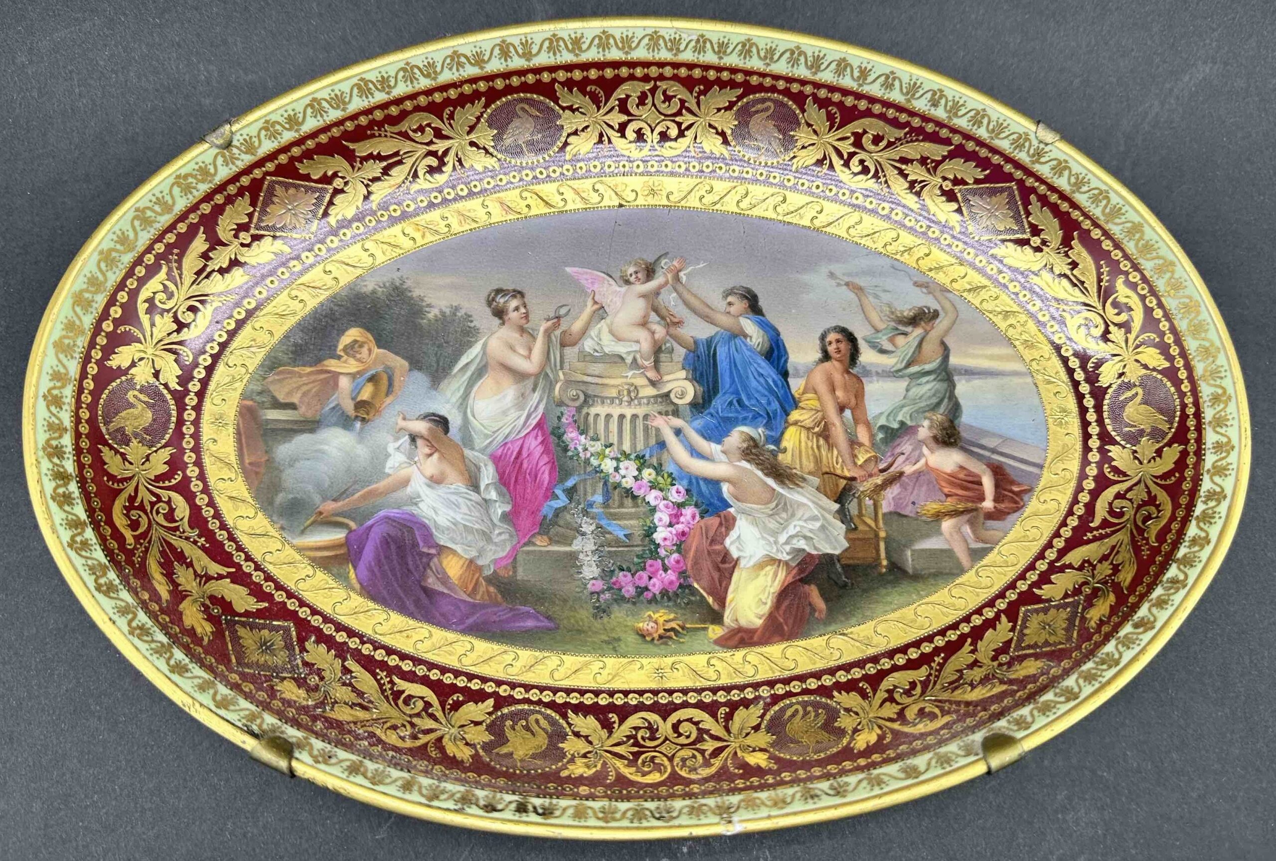 Sygnowany w sposób bardzo podobny do oznaczeń Cesarskiej manufaktury wiedeńskiej wraz z podpisem artysty, autora dekoracji.